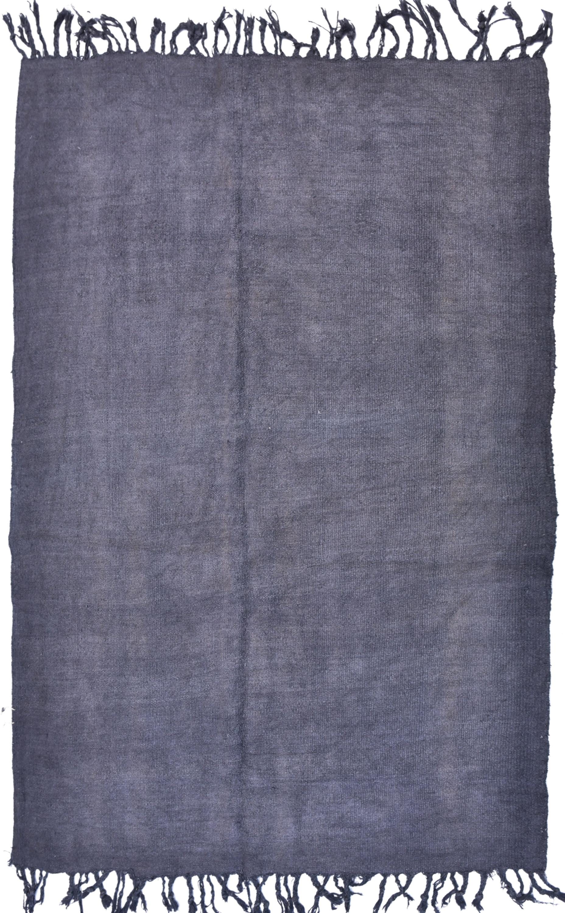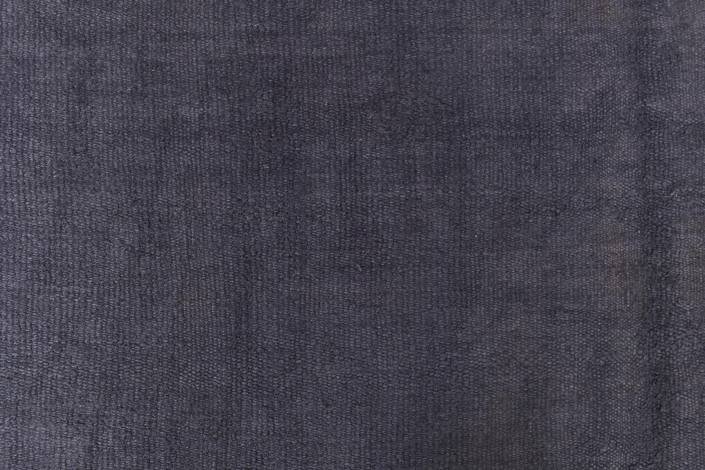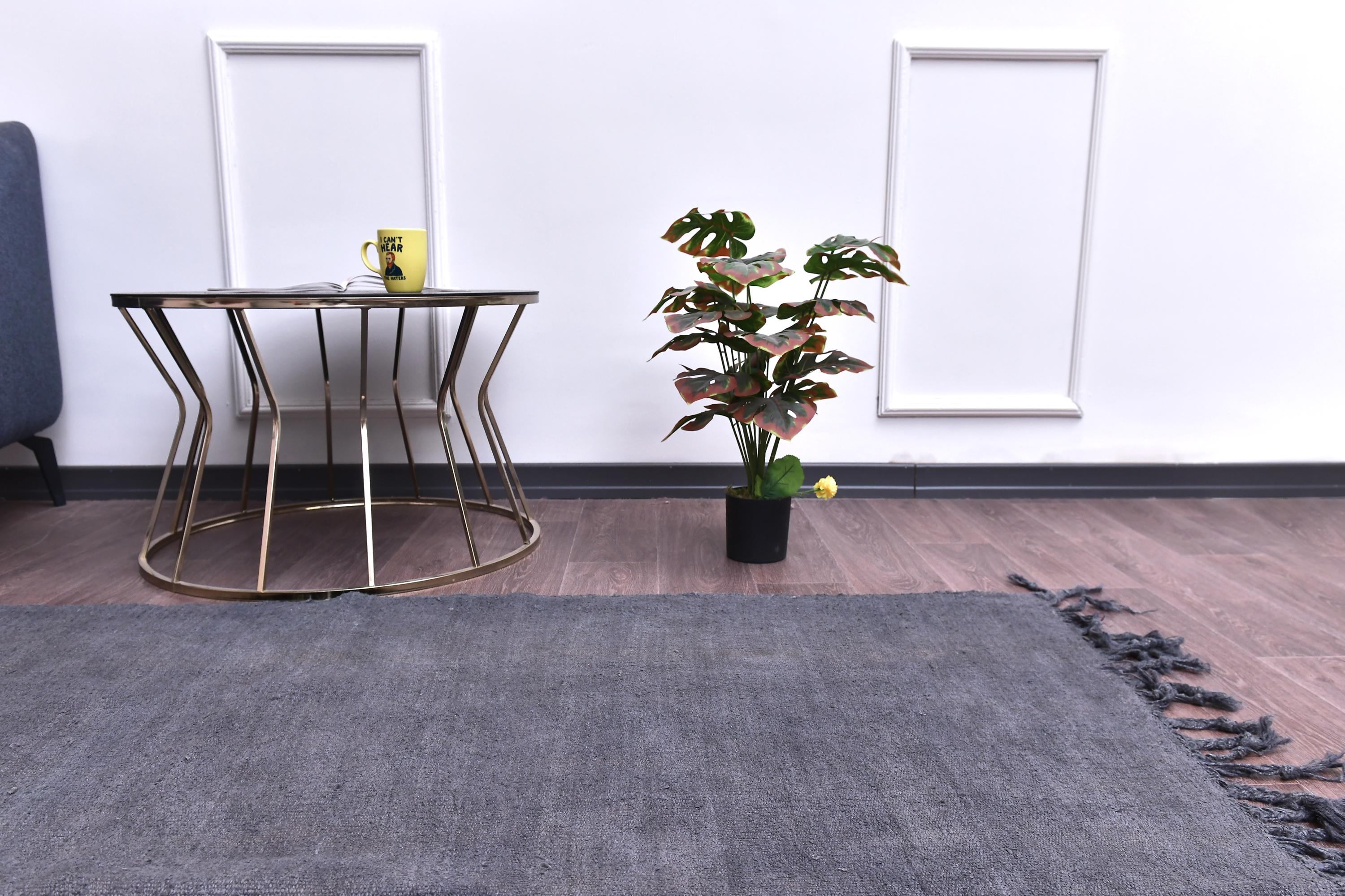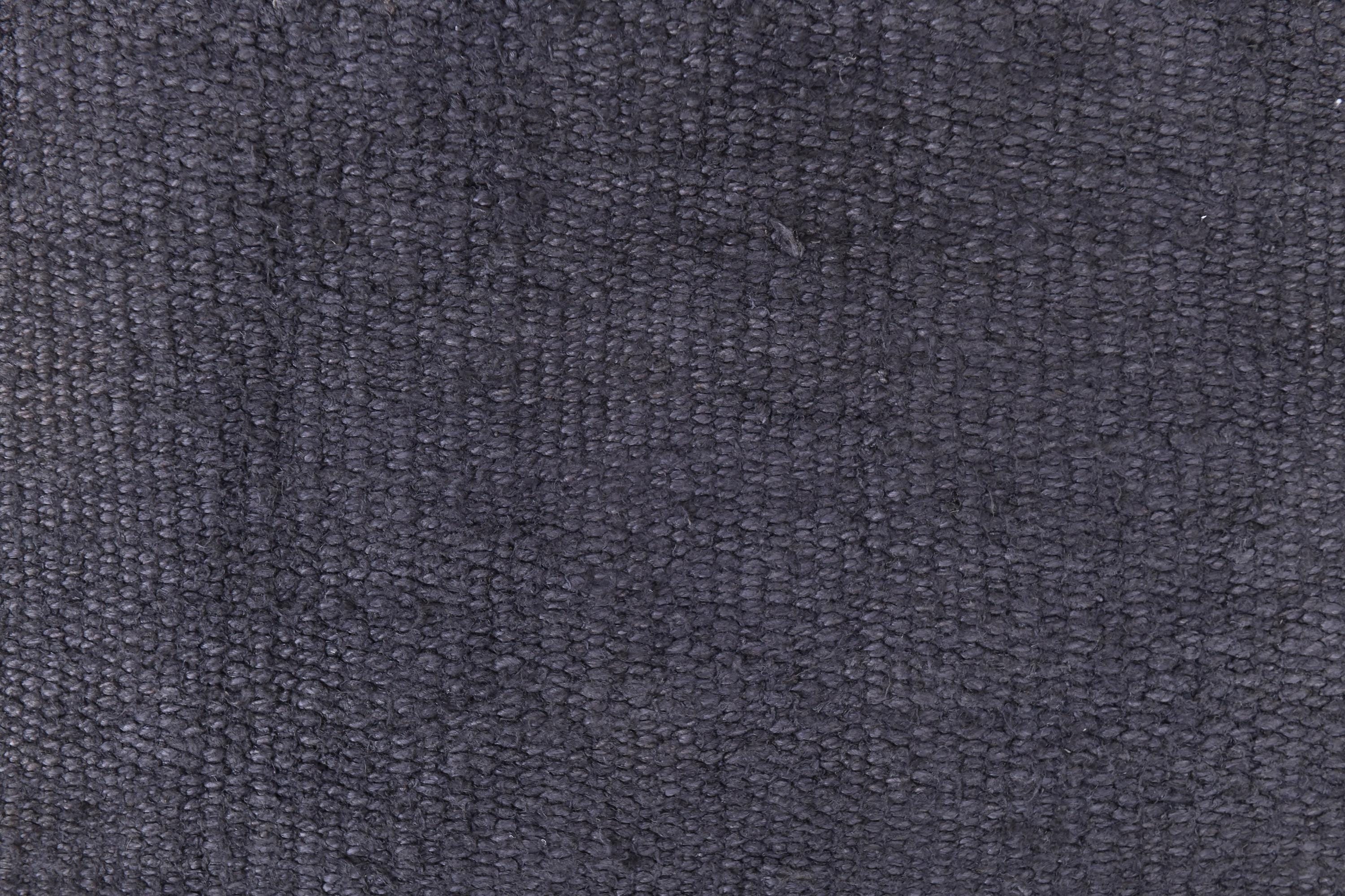 📜📌 Handwoven charcoal gray wool kilim rug with decorative knotted fringes on both ends, flat-weave texture, two-panel construction, displayed on hardwood floor