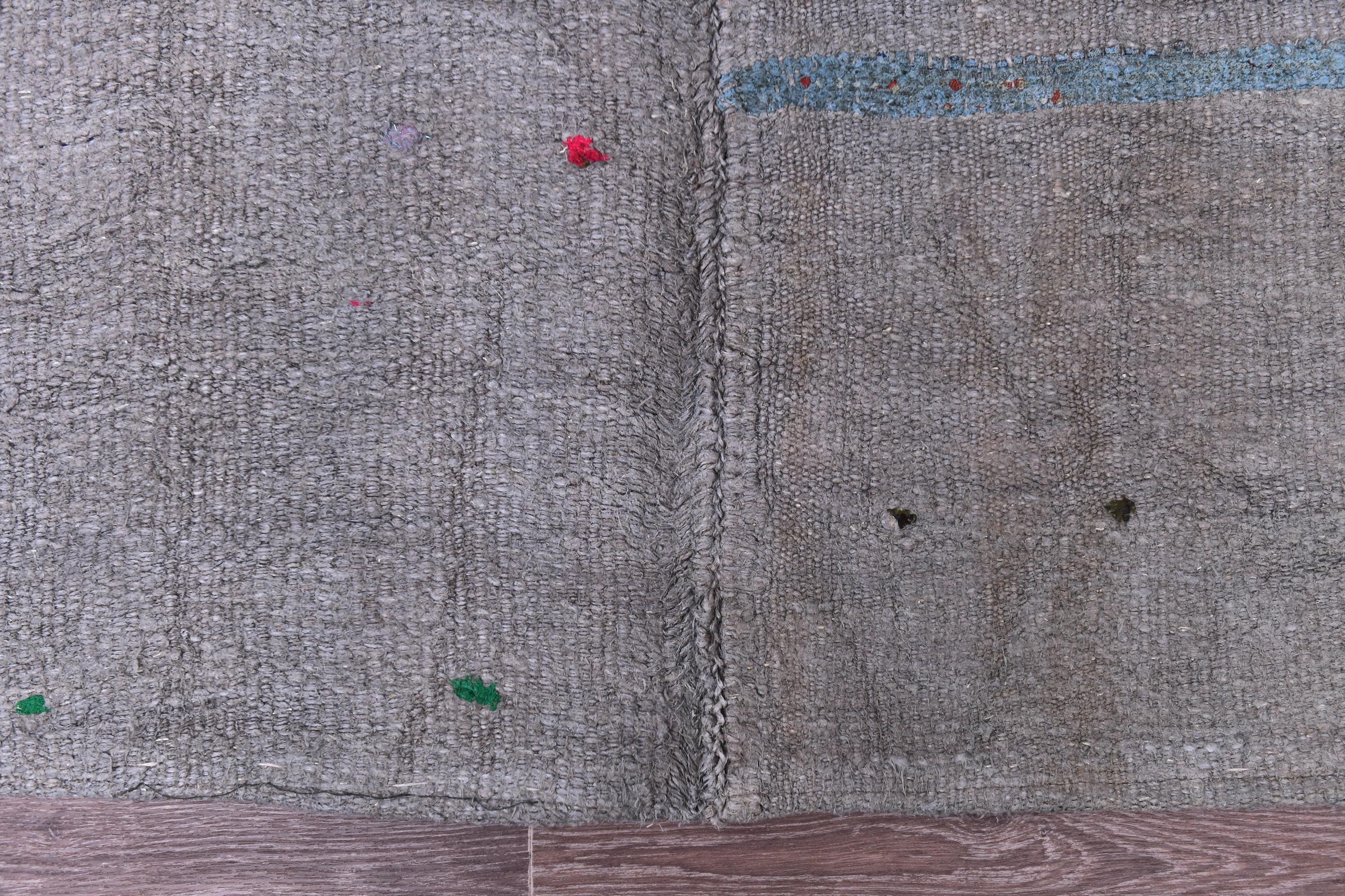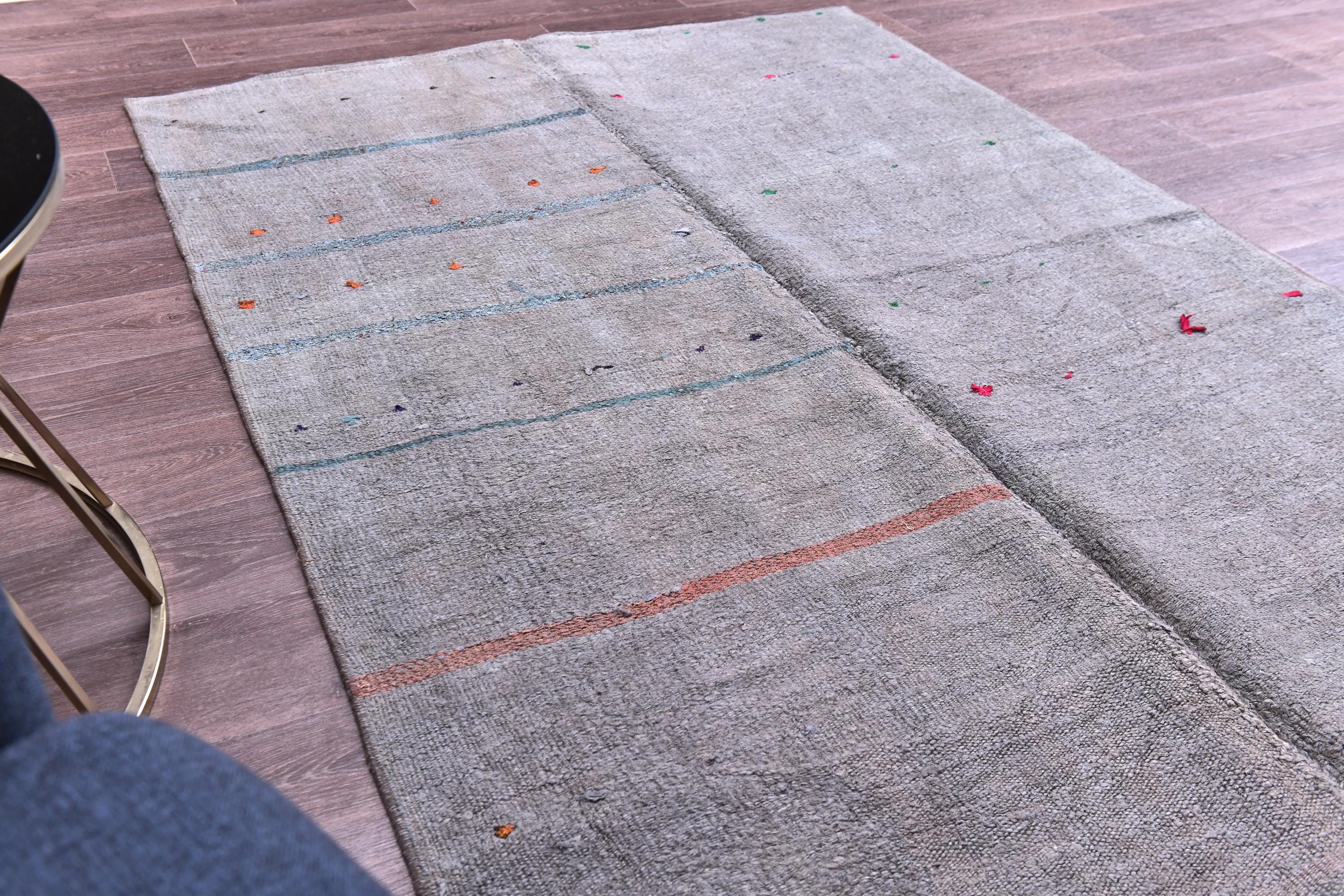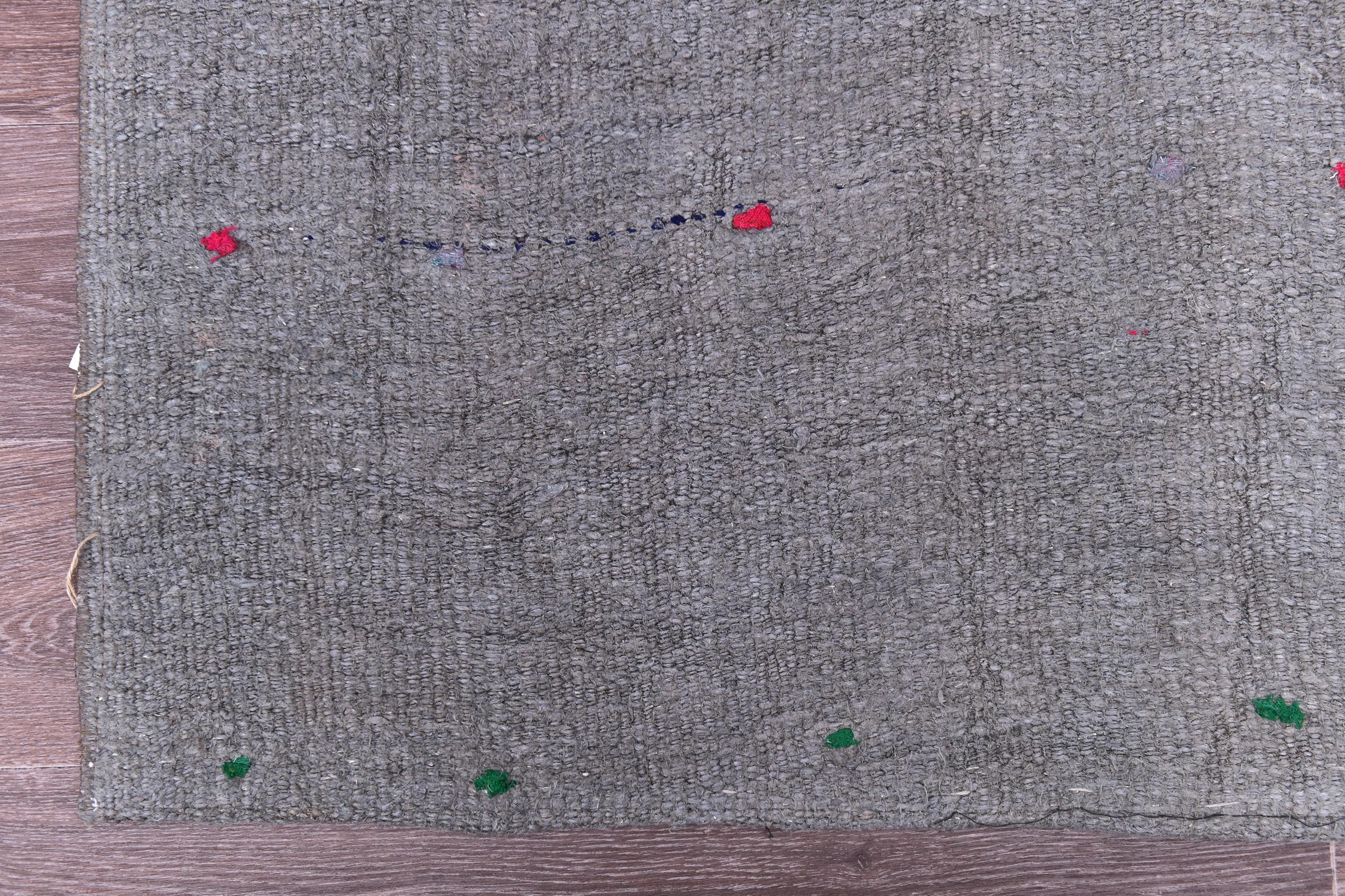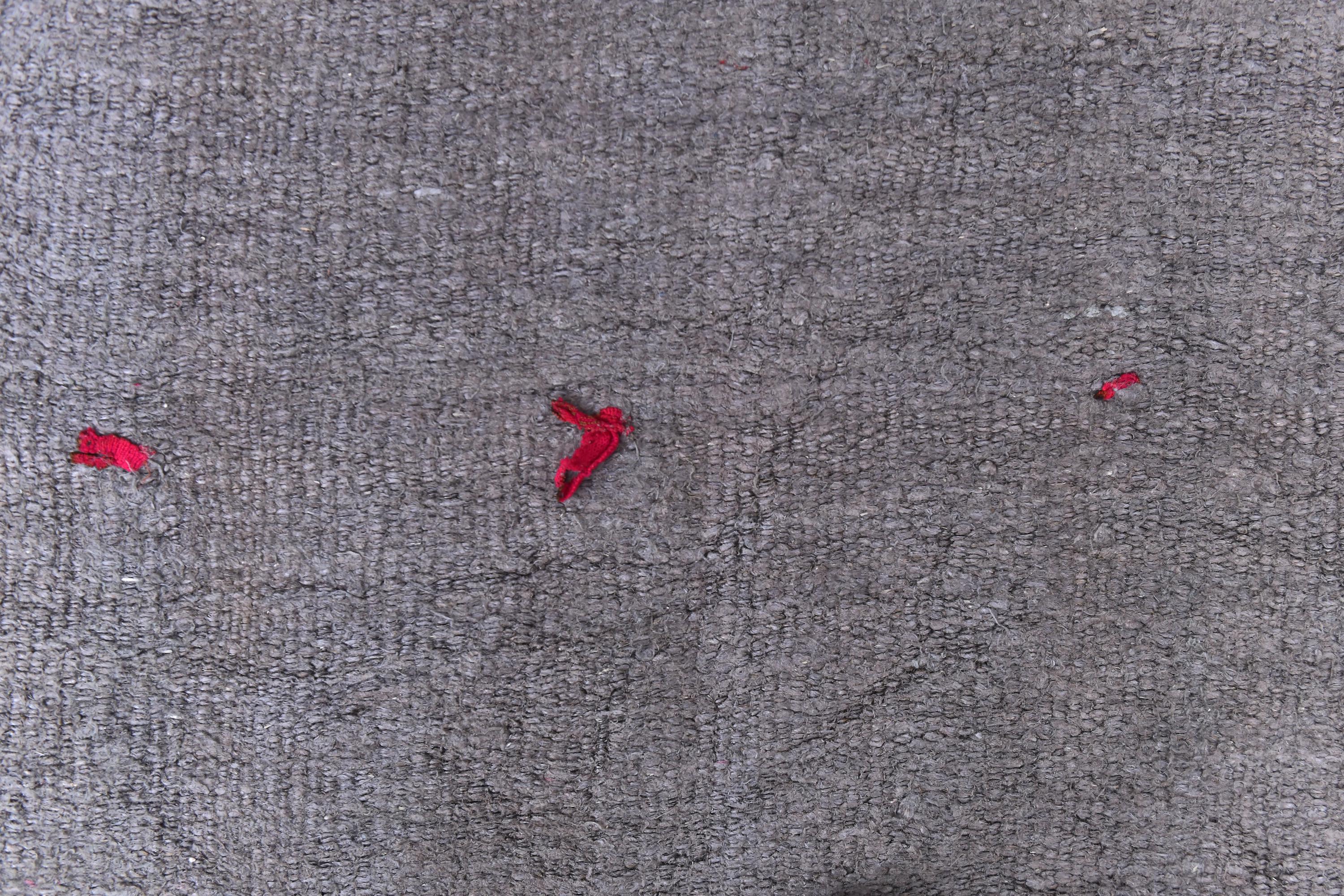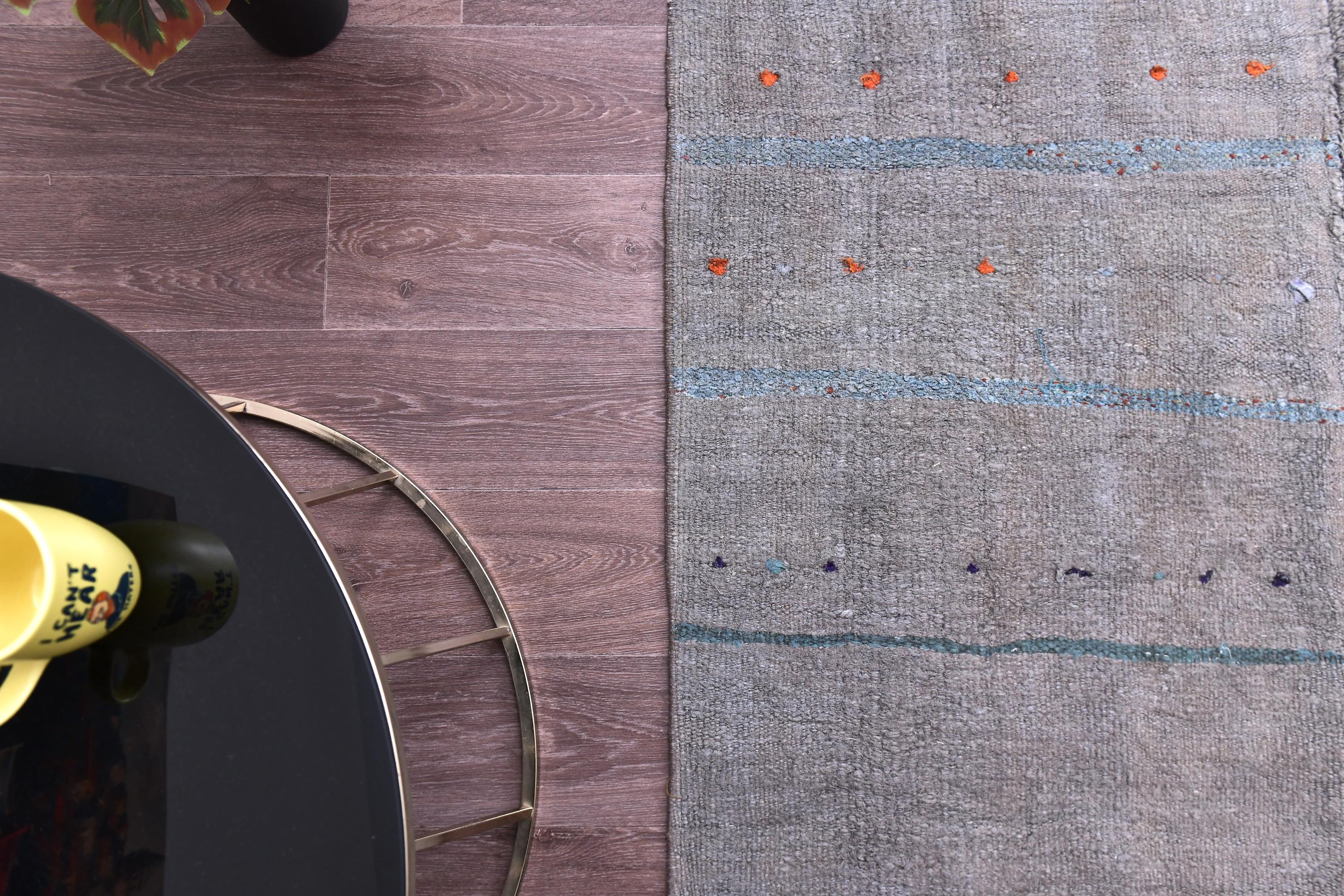 📜📌 Handwoven charcoal gray wool kilim rug with decorative knotted fringes on both ends, flat-weave texture, two-panel construction, displayed on hardwood floor