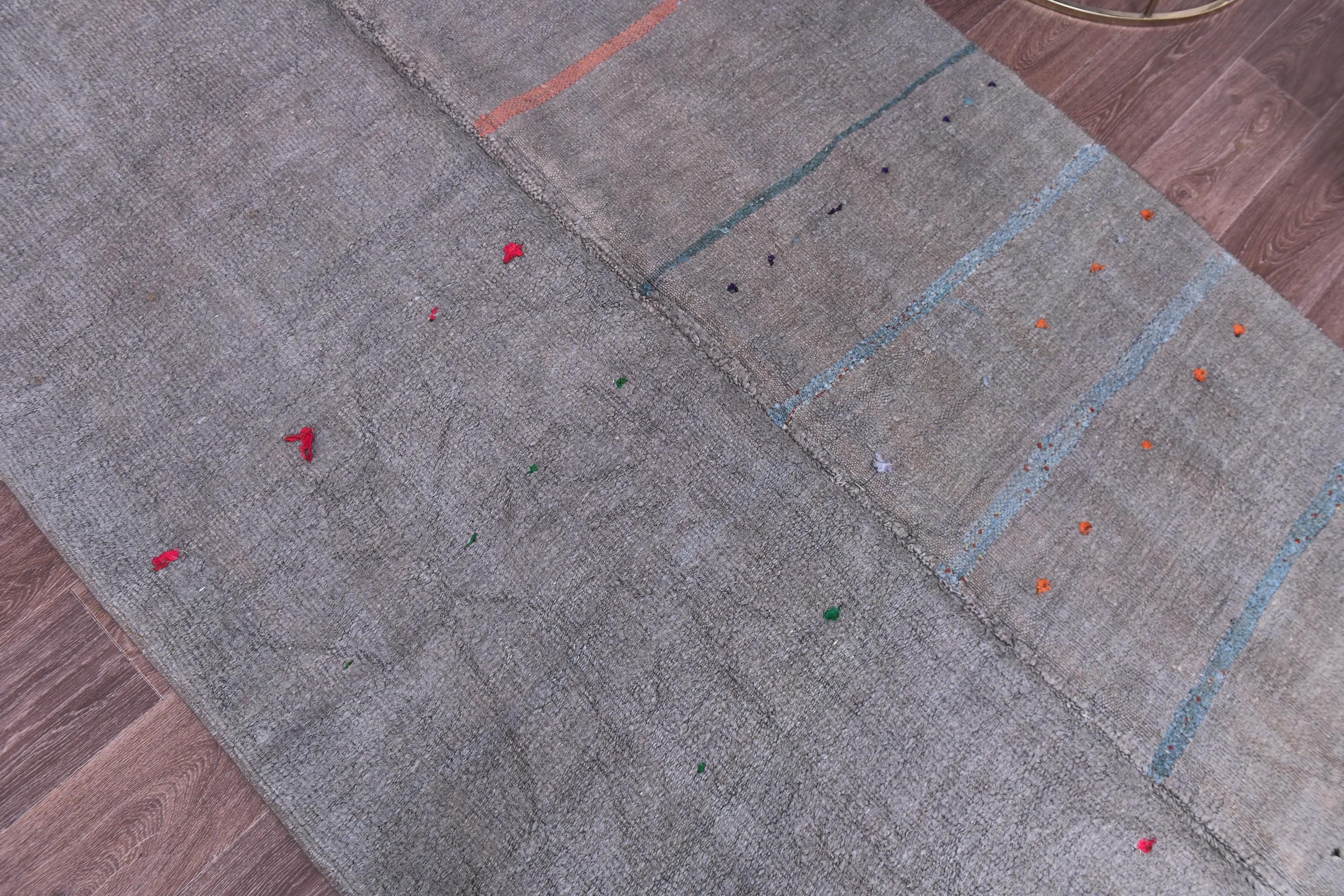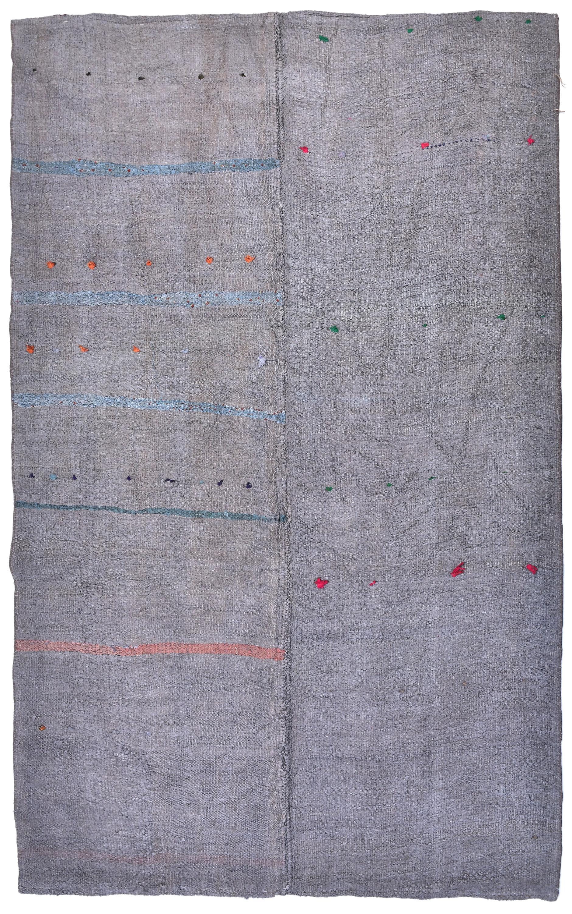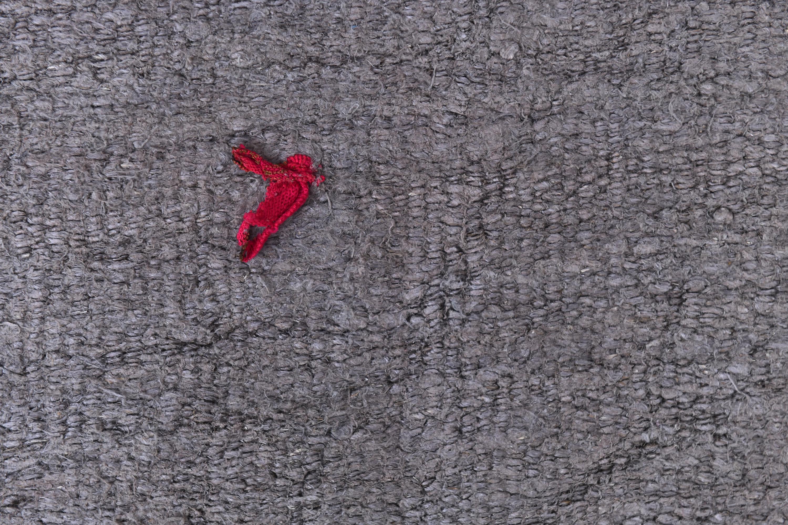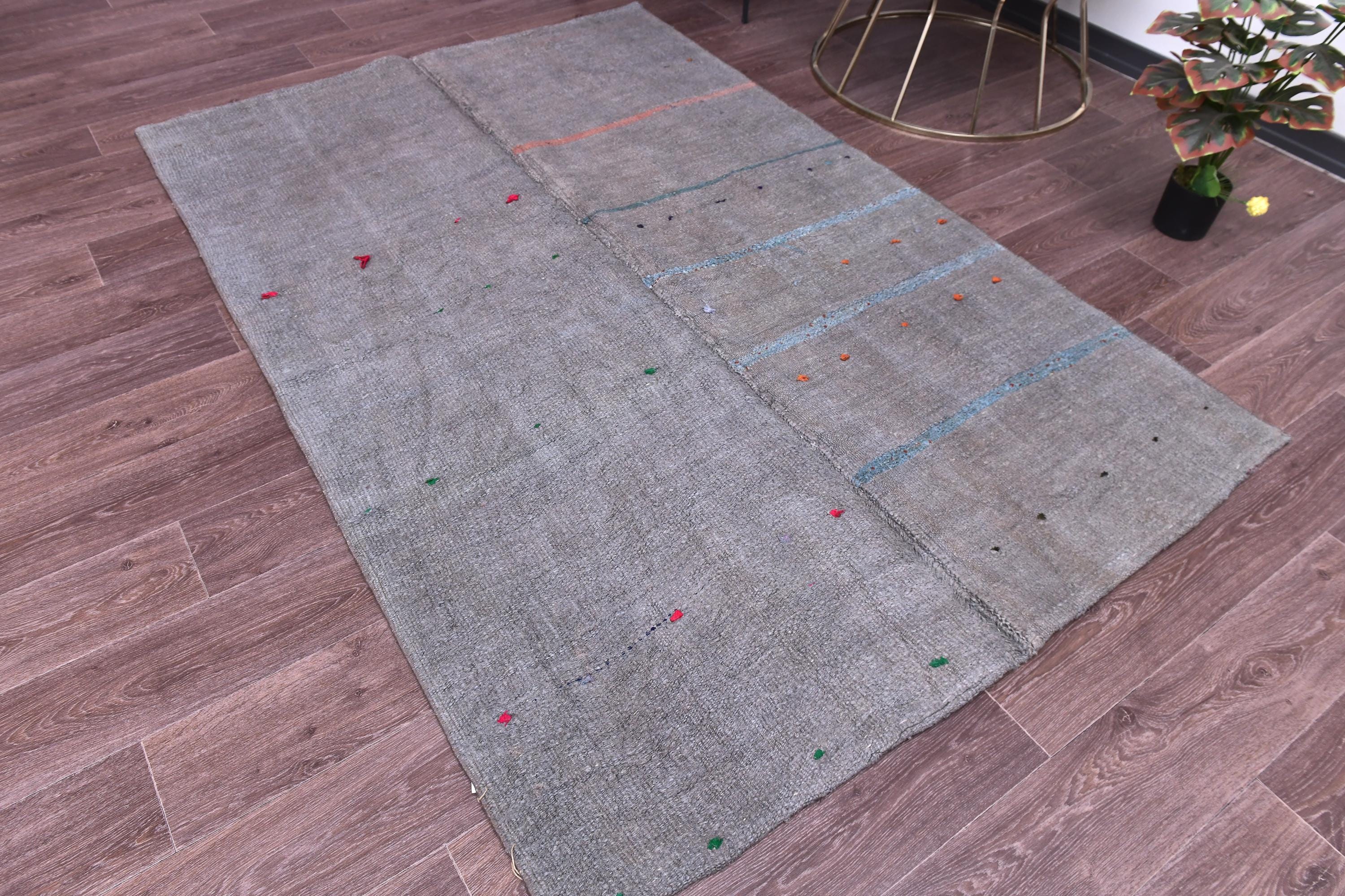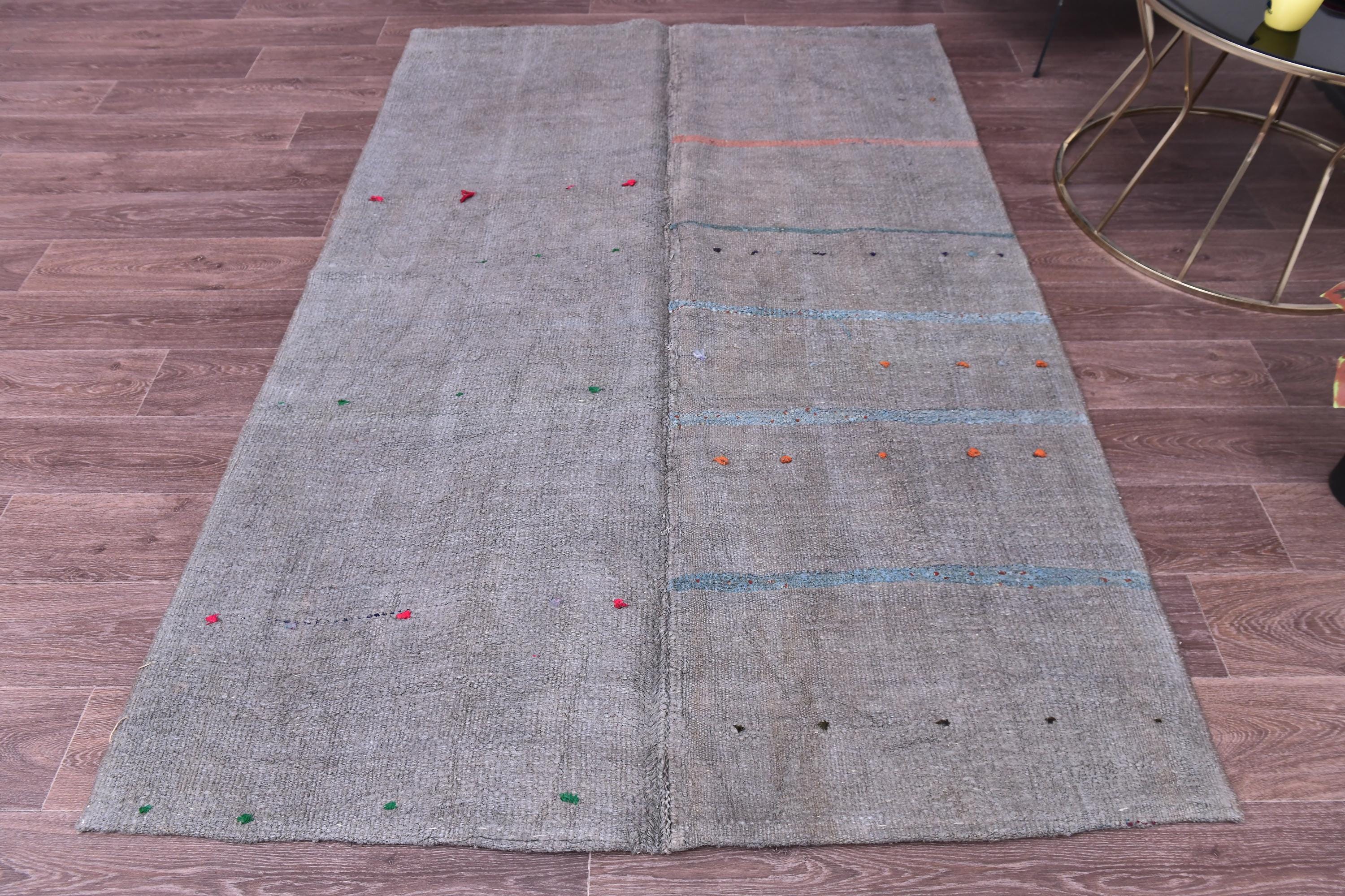 📜📌 Handwoven charcoal gray wool kilim rug with decorative knotted fringes on both ends, flat-weave texture, two-panel construction, displayed on hardwood floor