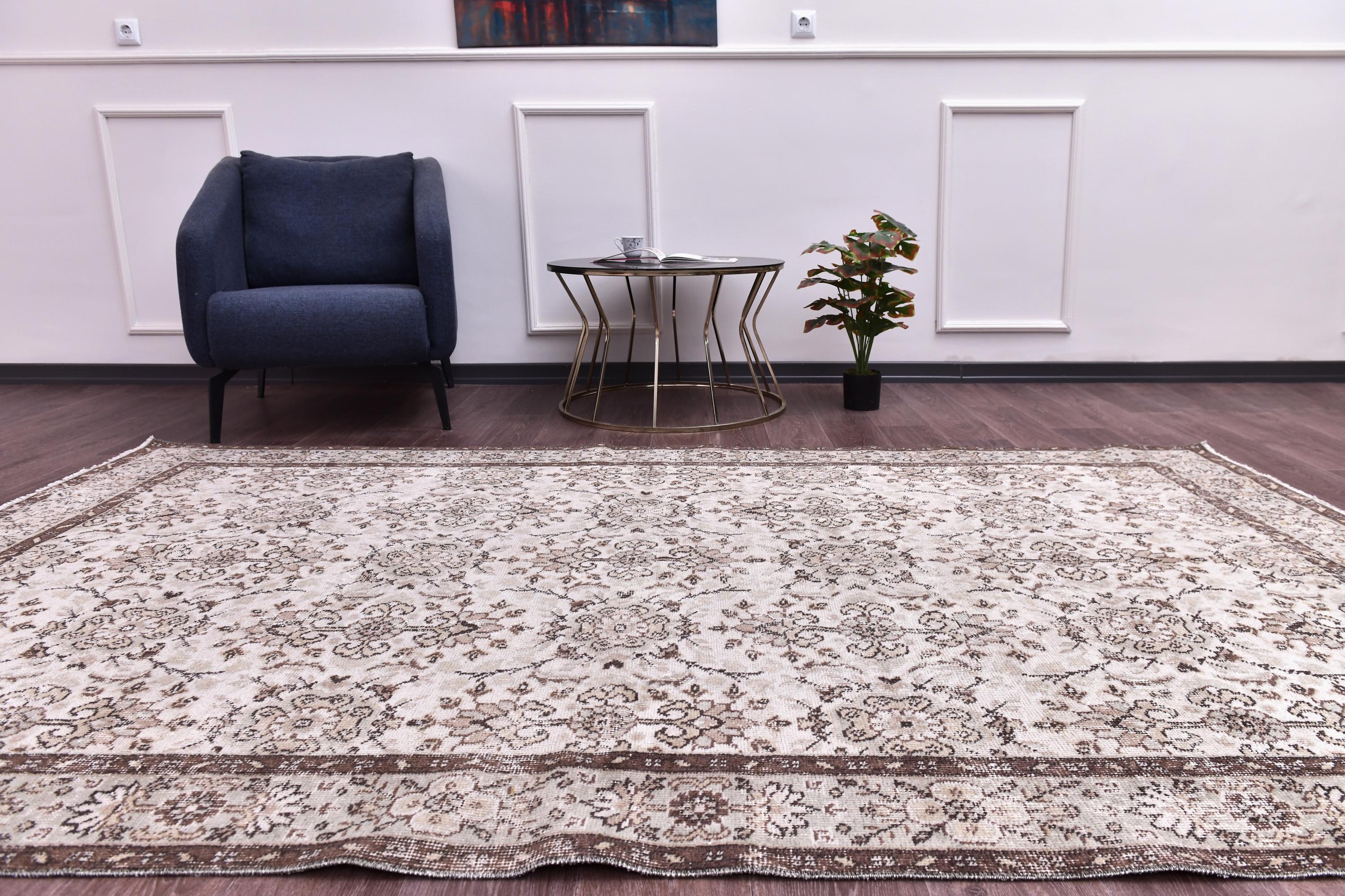 📜📌Antique Anatolian wool carpet displaying dense floral scrollwork design in soft neutral colorway of ivory cream with brown gray undertones, traditional bordered layout with continuous vine and flower patterns throughout field, authentically worn texture showing vintage character and overdyed treatment, ideal versatile foundation piece for living rooms, dining areas and bedrooms seeking understated elegance