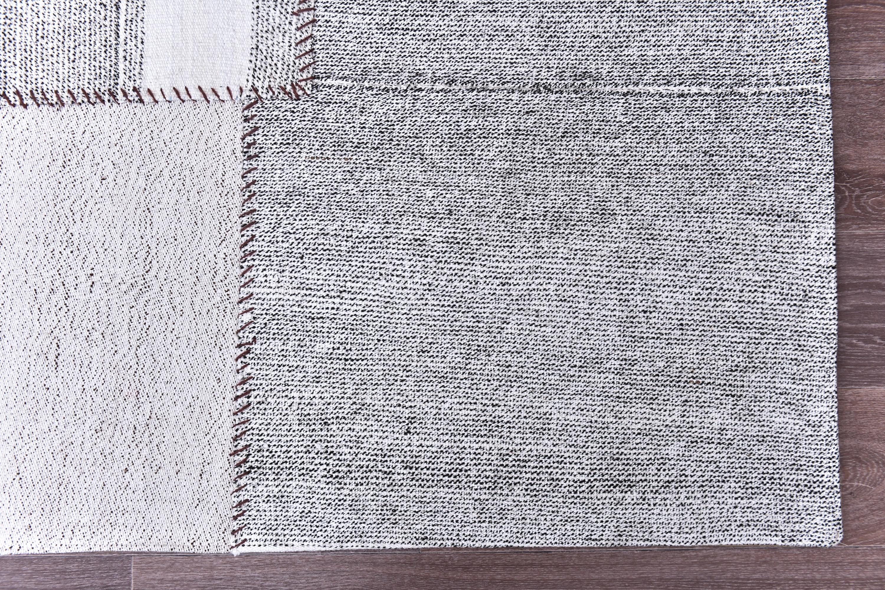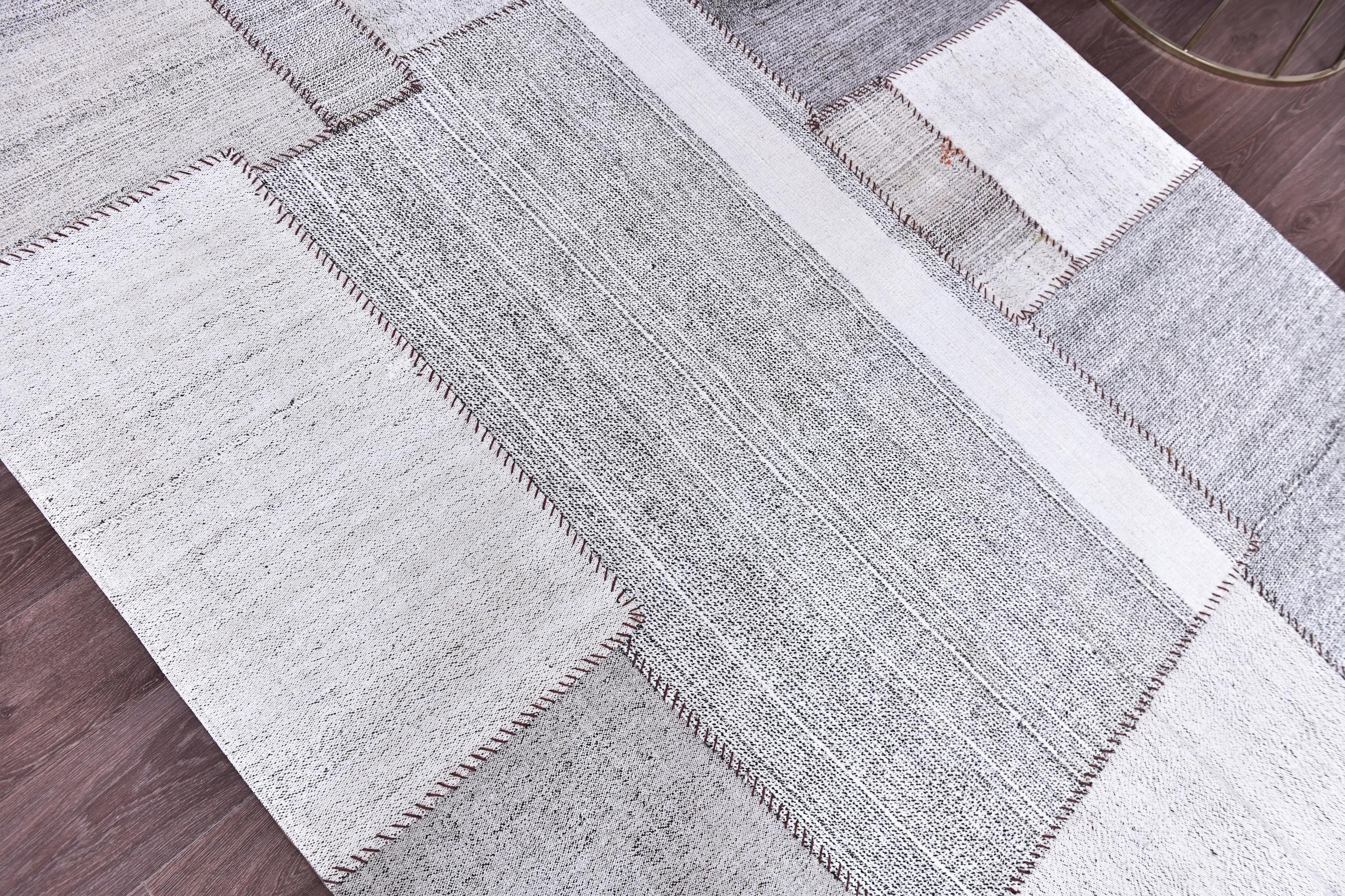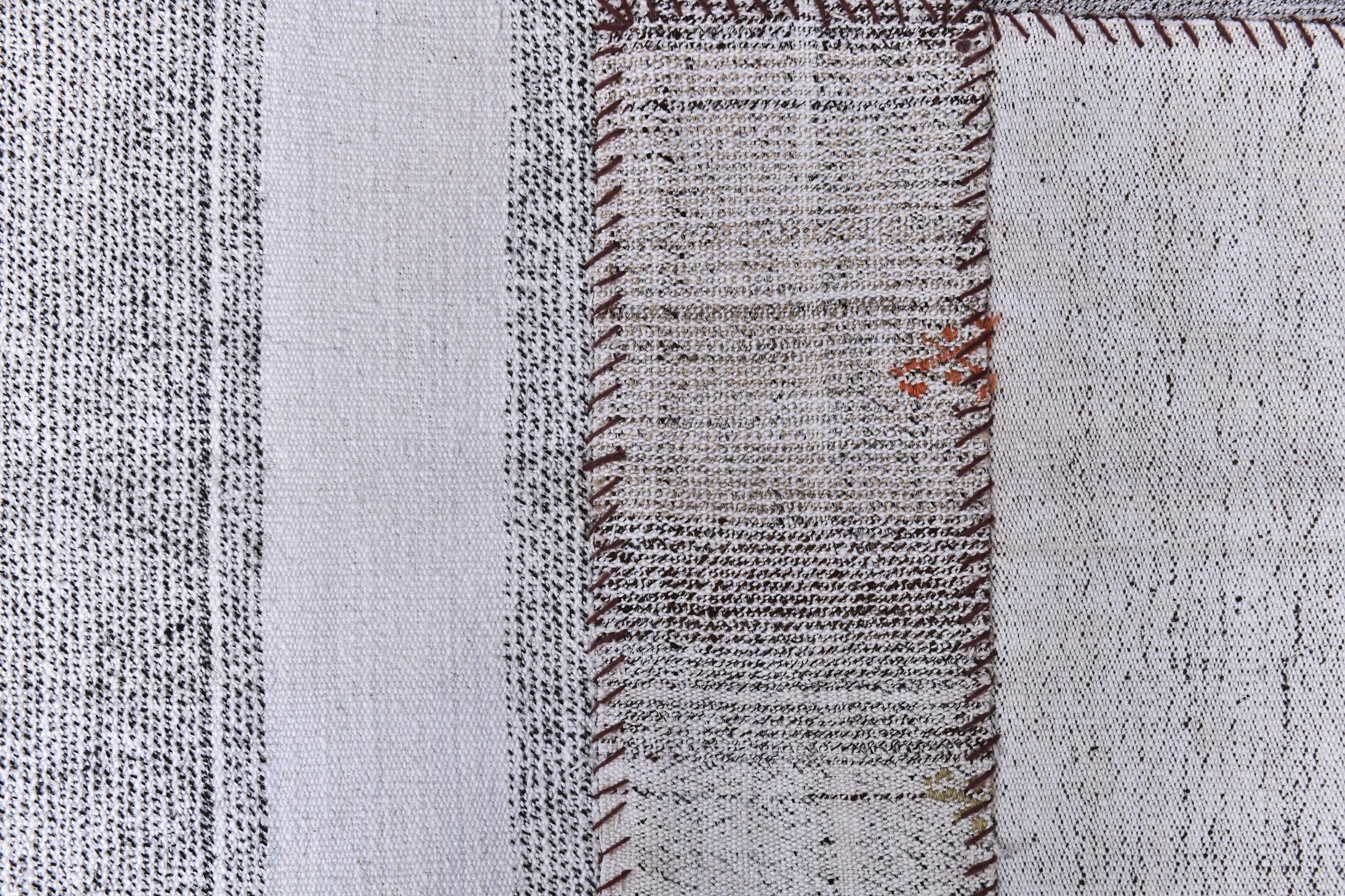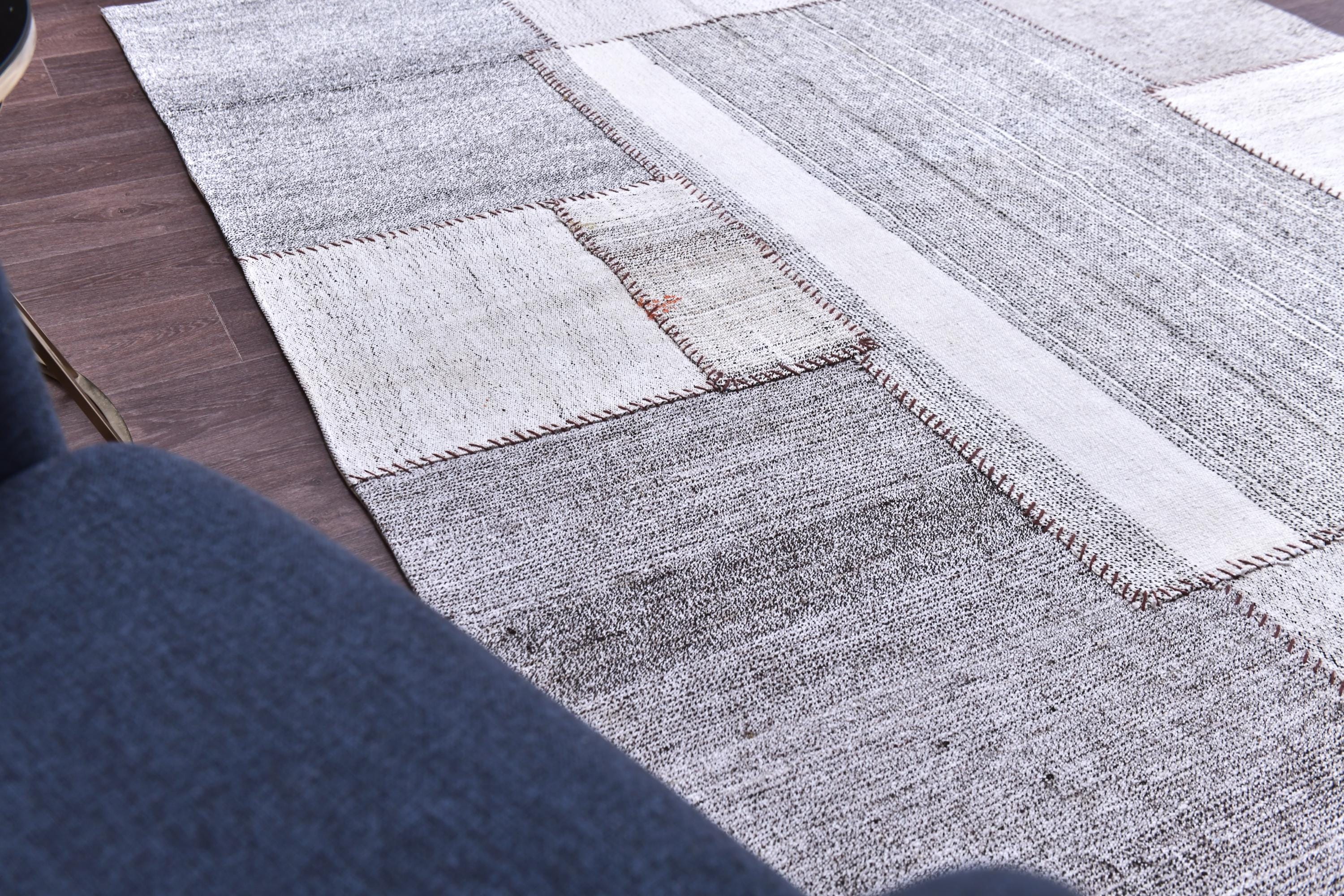 📜📌 Hand-stitched Turkish patchwork kilim rug in shades of gray, ivory, and white with geometric block panels joined by visible dark whip stitching, displayed on hardwood floor