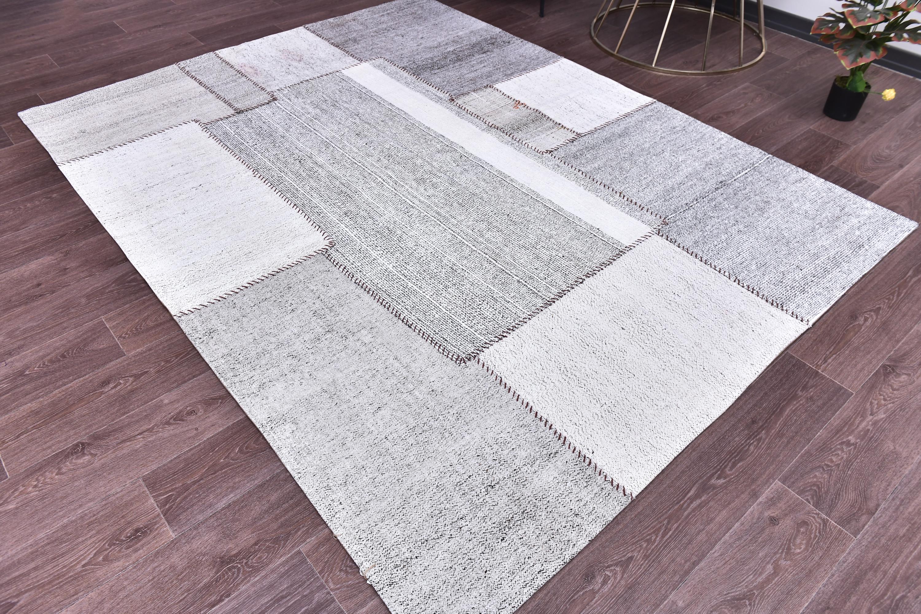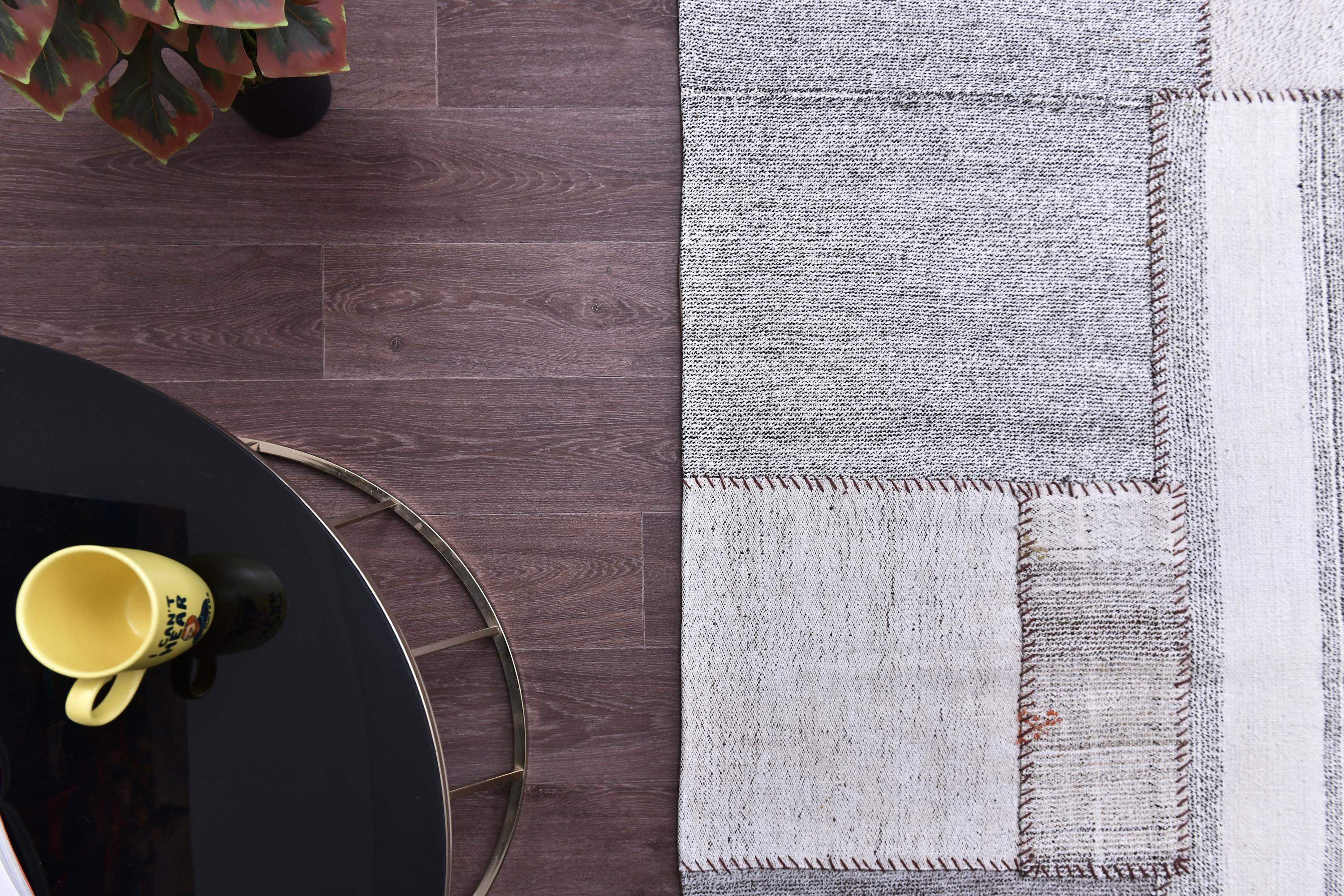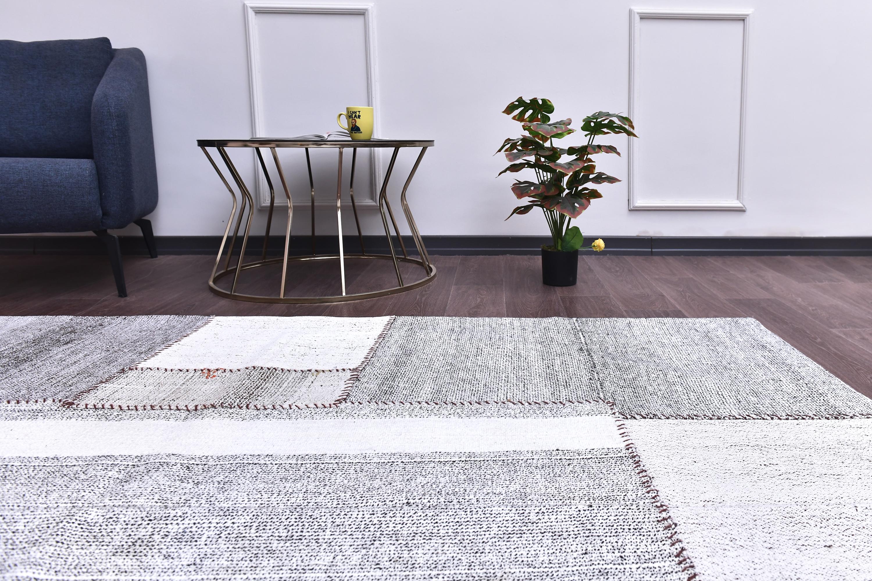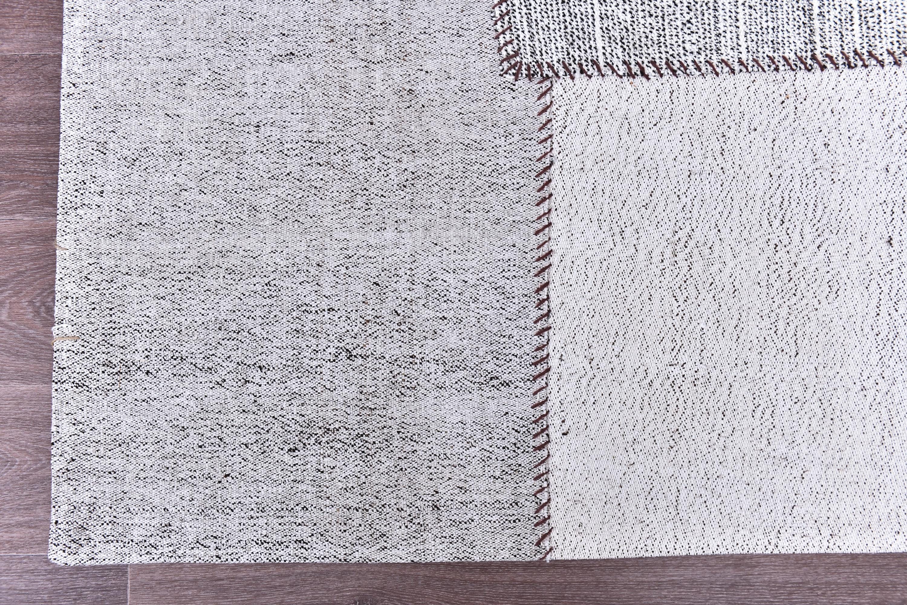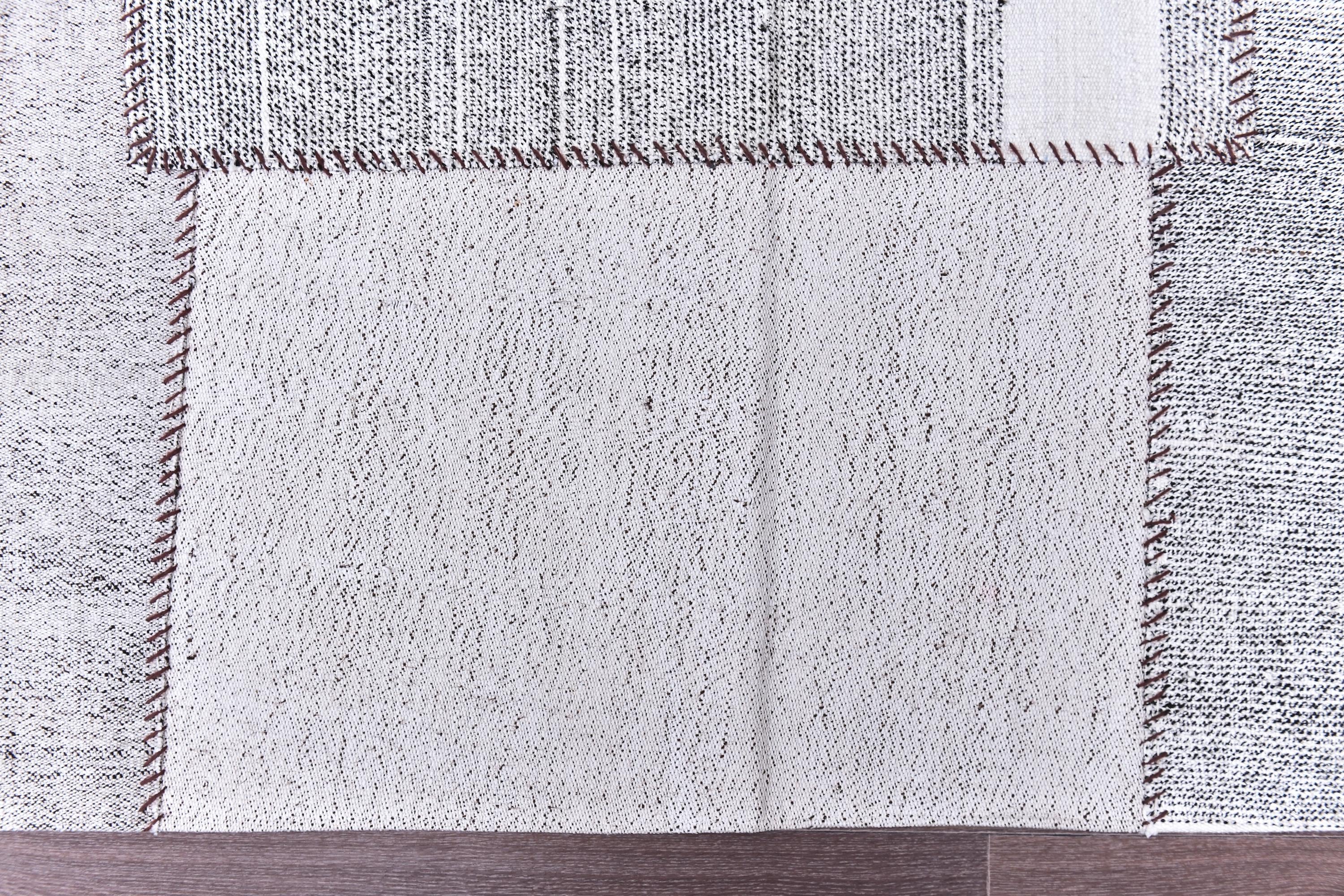 📜📌 Hand-stitched Turkish patchwork kilim rug in shades of gray, ivory, and white with geometric block panels joined by visible dark whip stitching, displayed on hardwood floor