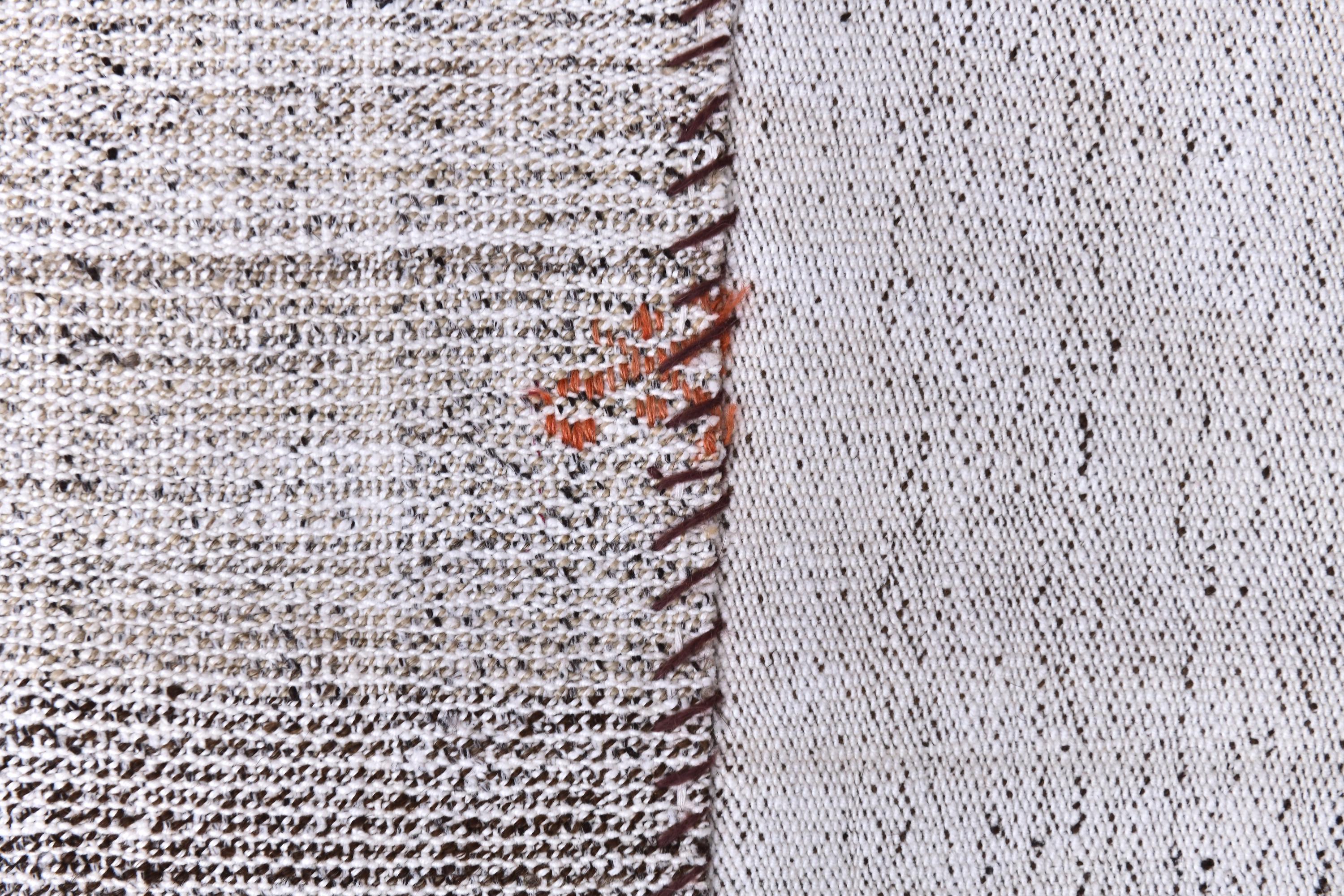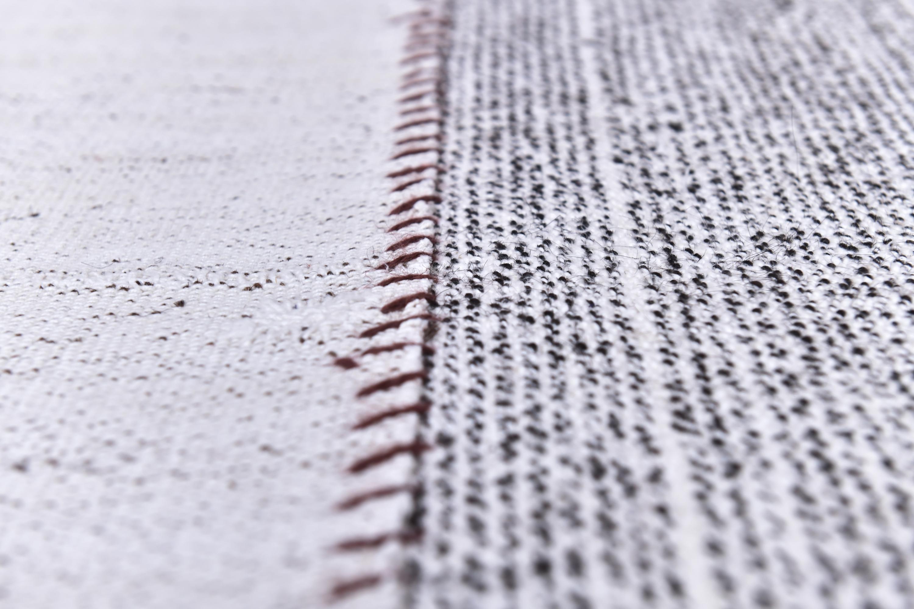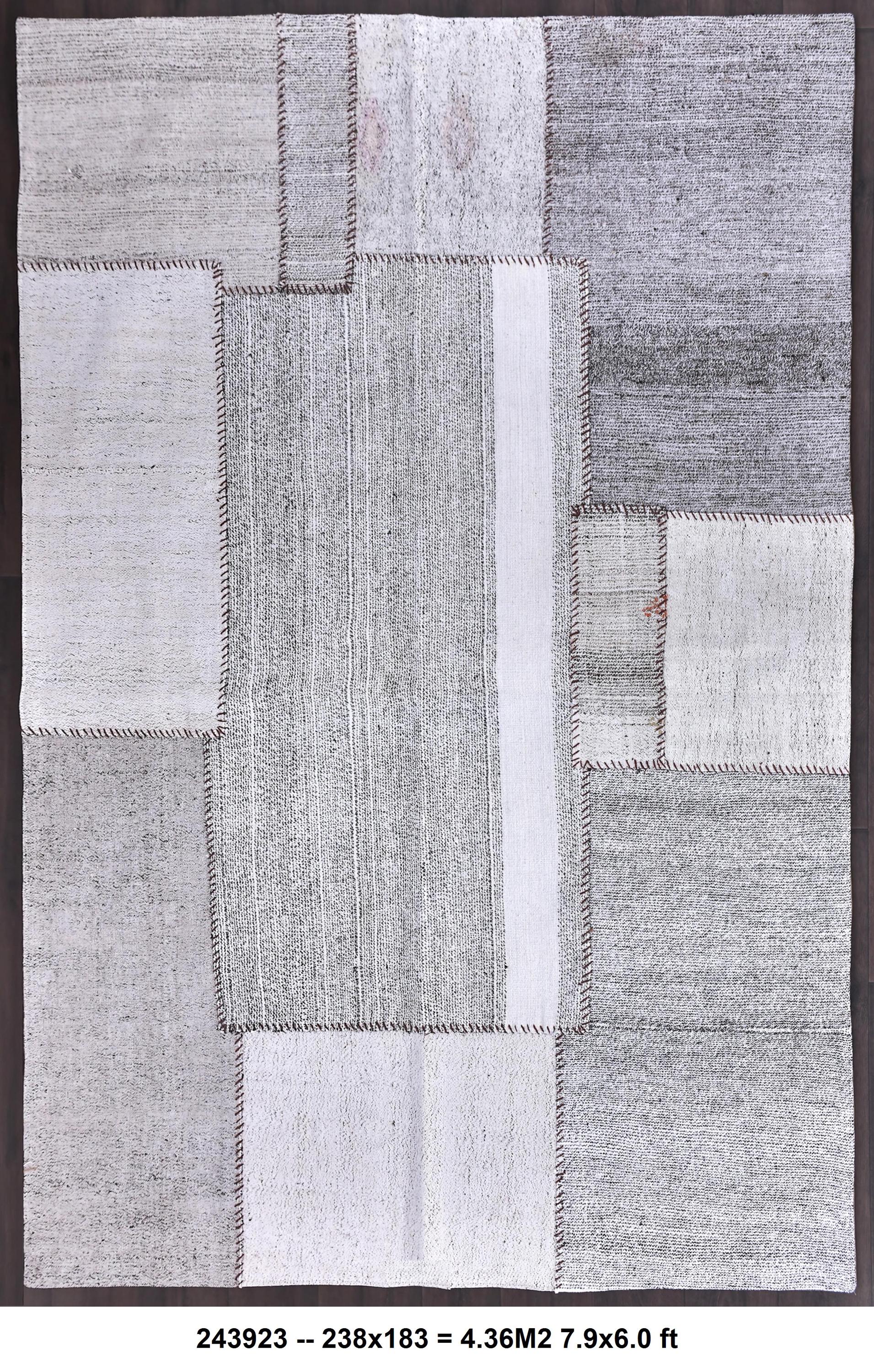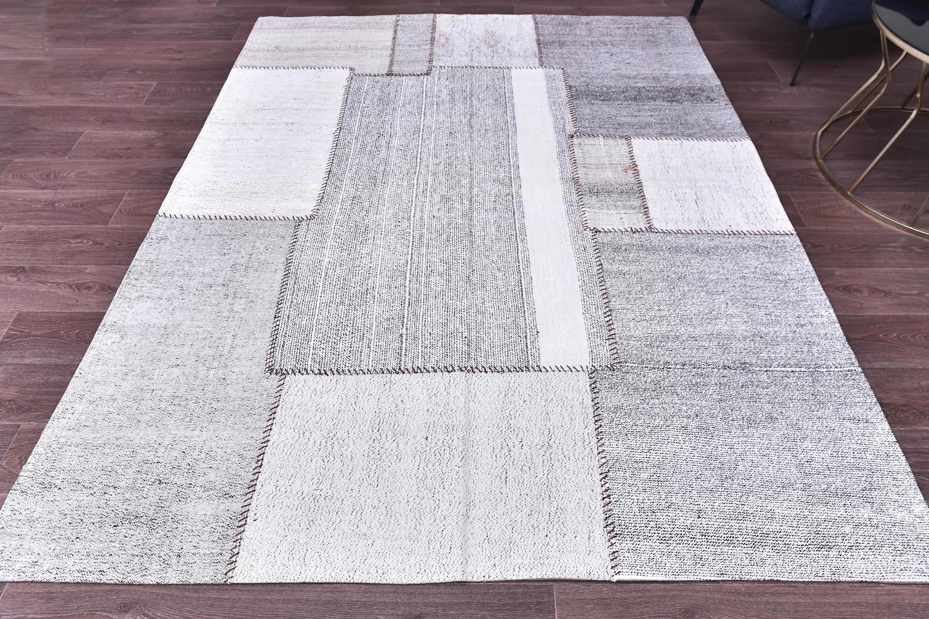 📜📌 Hand-stitched Turkish patchwork kilim rug in shades of gray, ivory, and white with geometric block panels joined by visible dark whip stitching, displayed on hardwood floor
