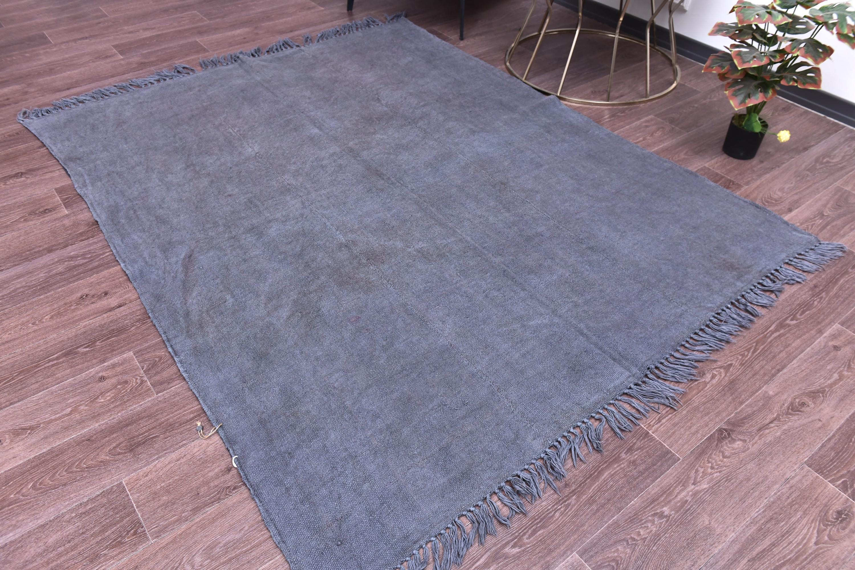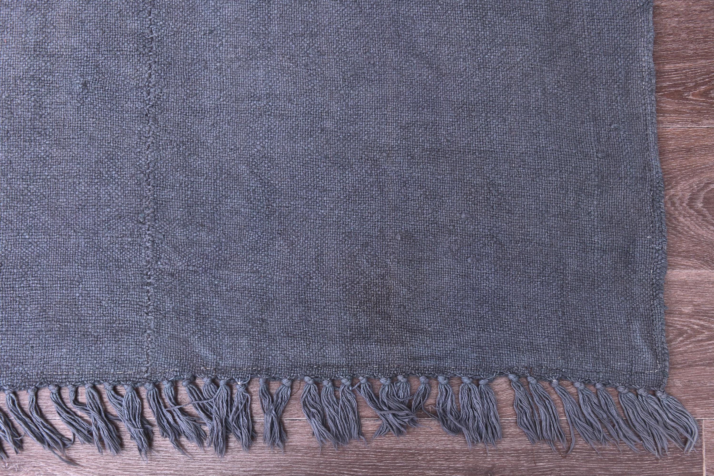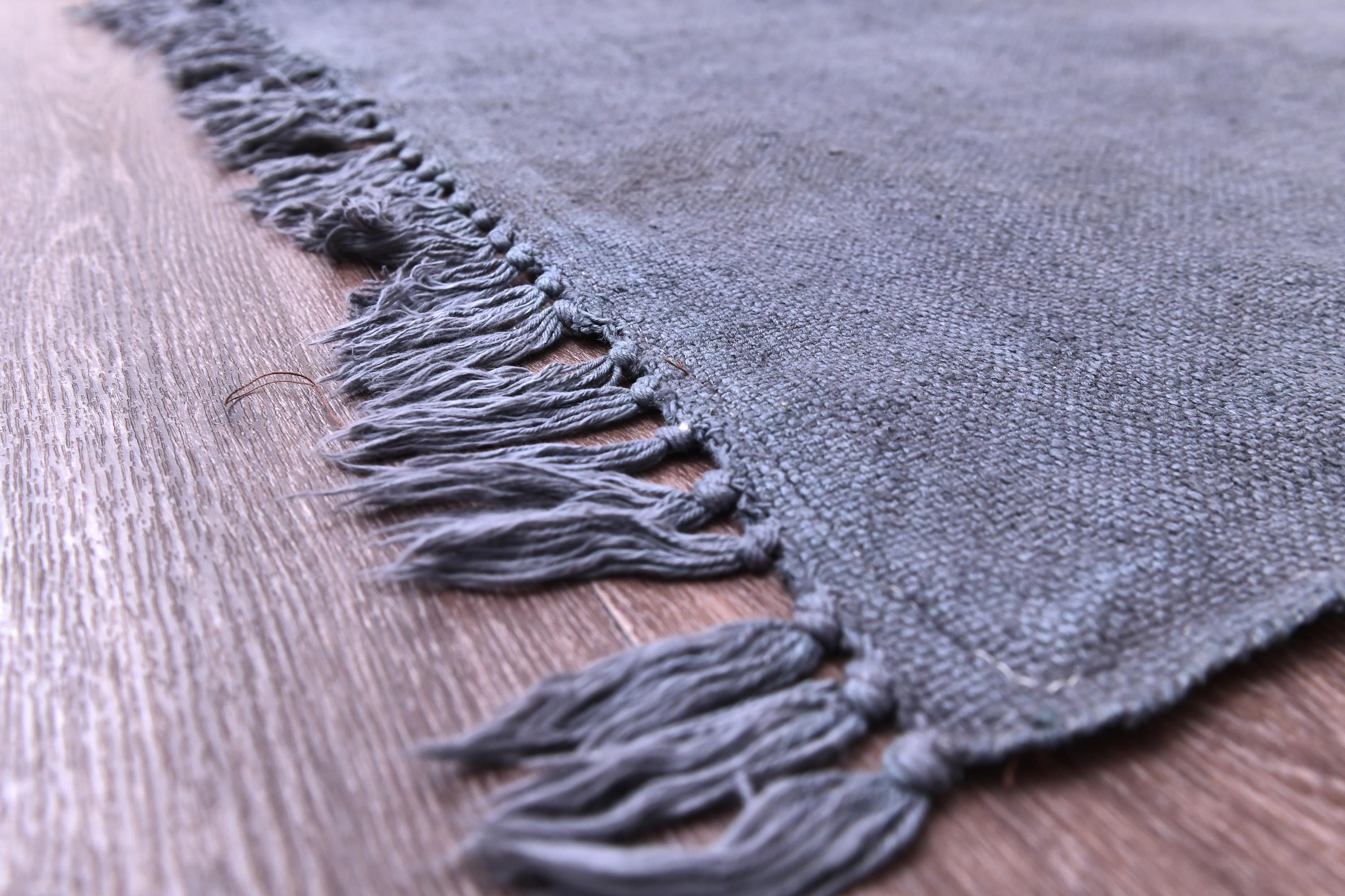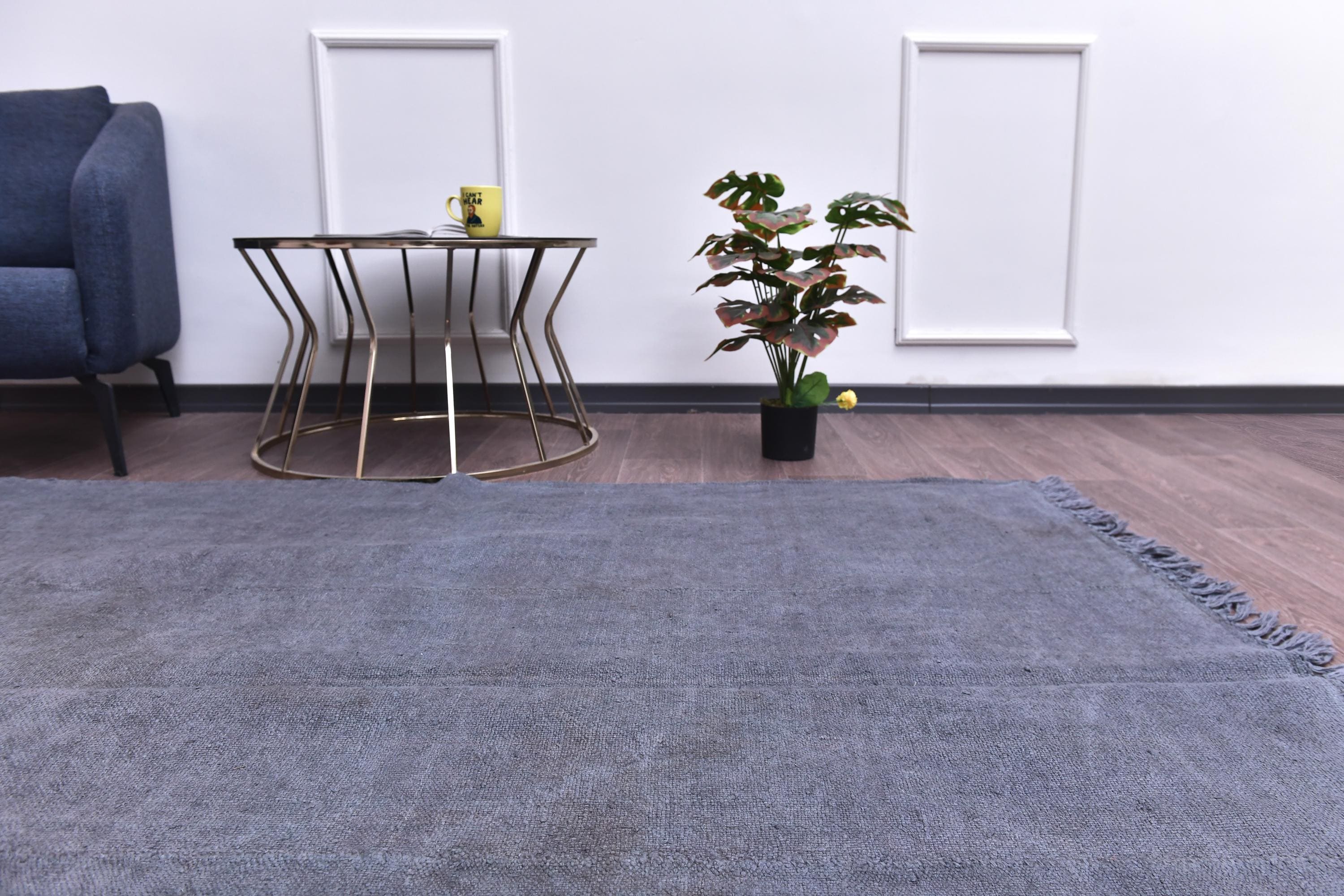 📜📌 Vintage hand-woven Turkish kilim rug in solid slate gray with natural wool texture and knotted fringe edges, displayed on hardwood floor in a modern room