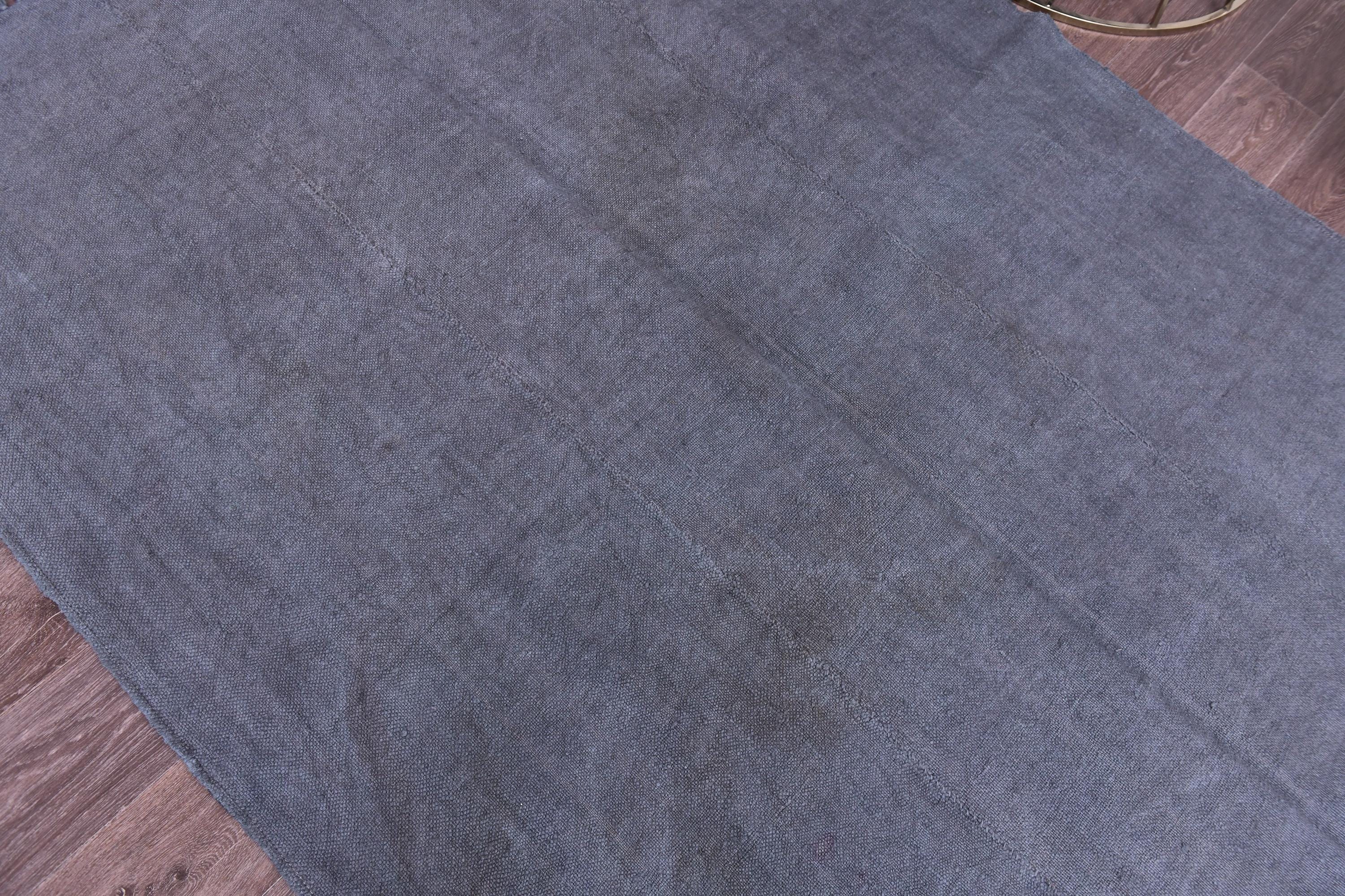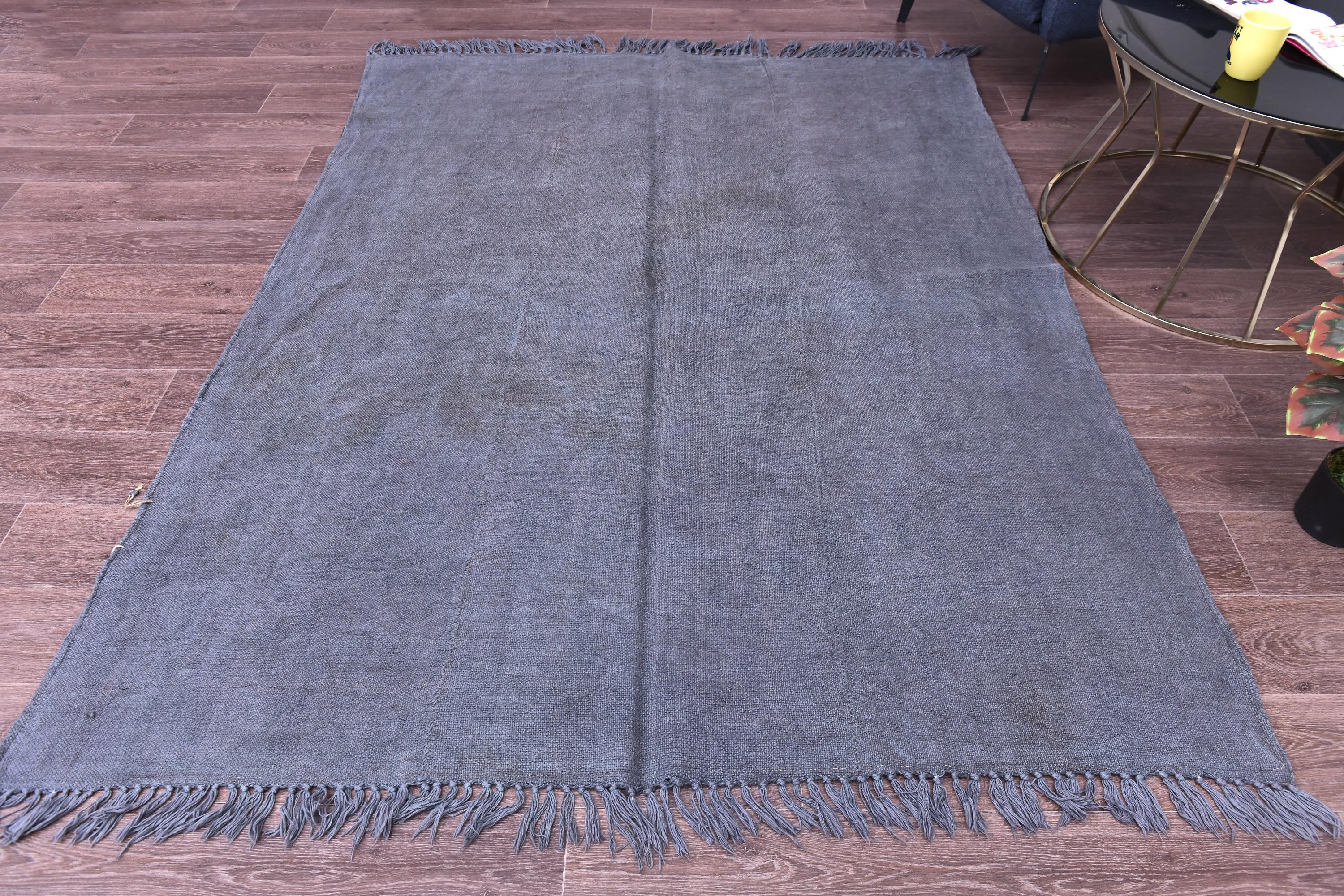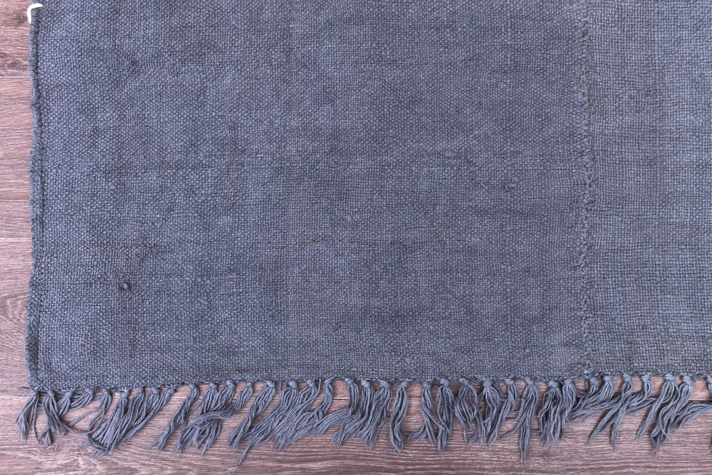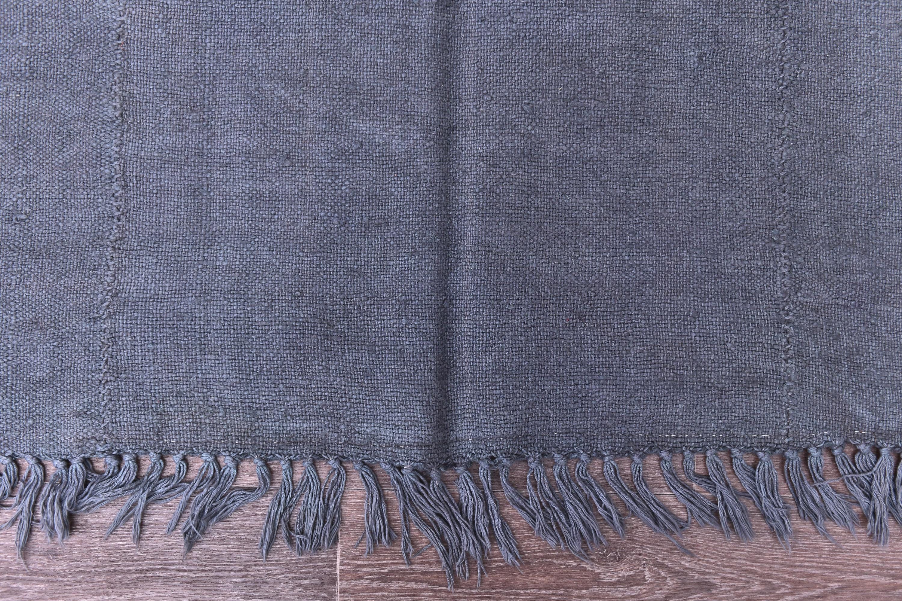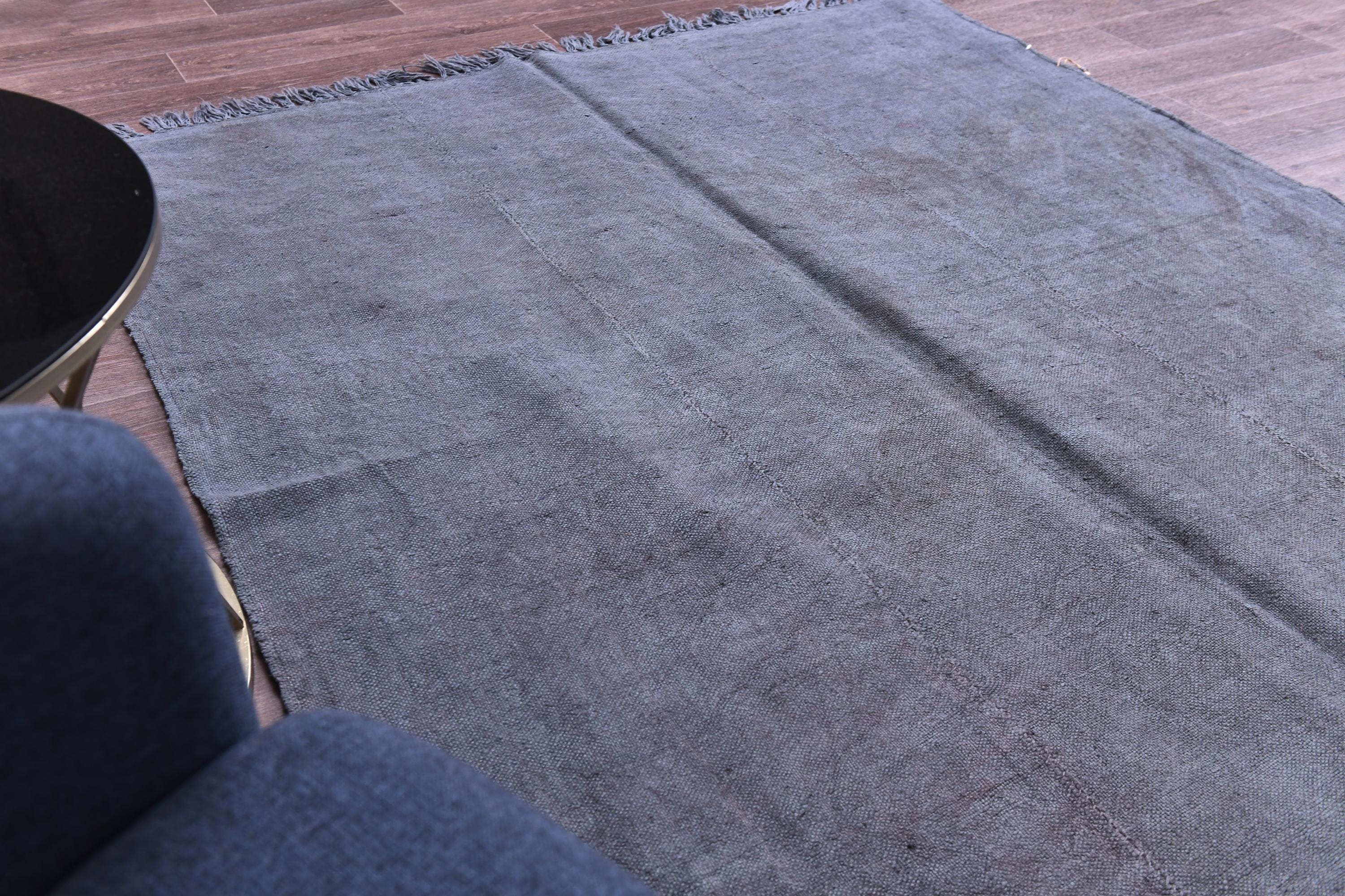 📜📌 Vintage hand-woven Turkish kilim rug in solid slate gray with natural wool texture and knotted fringe edges, displayed on hardwood floor in a modern room