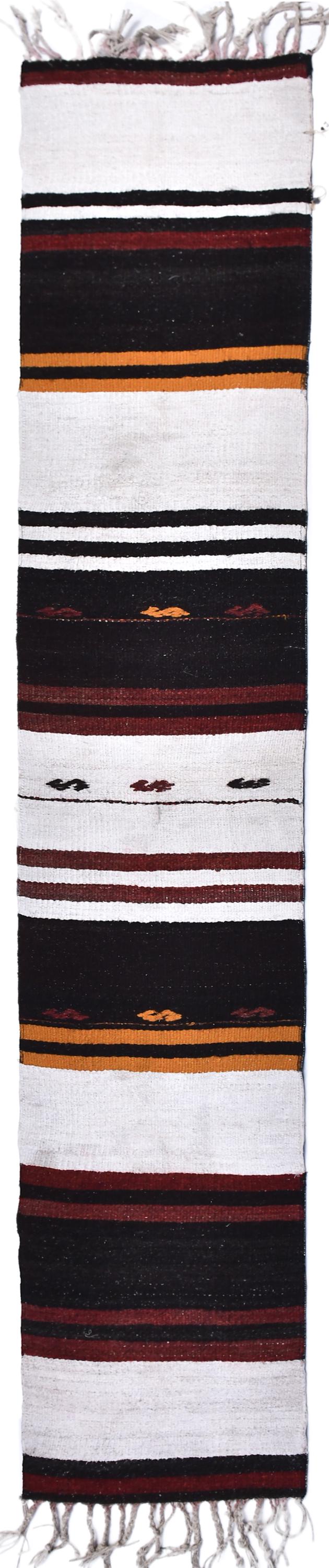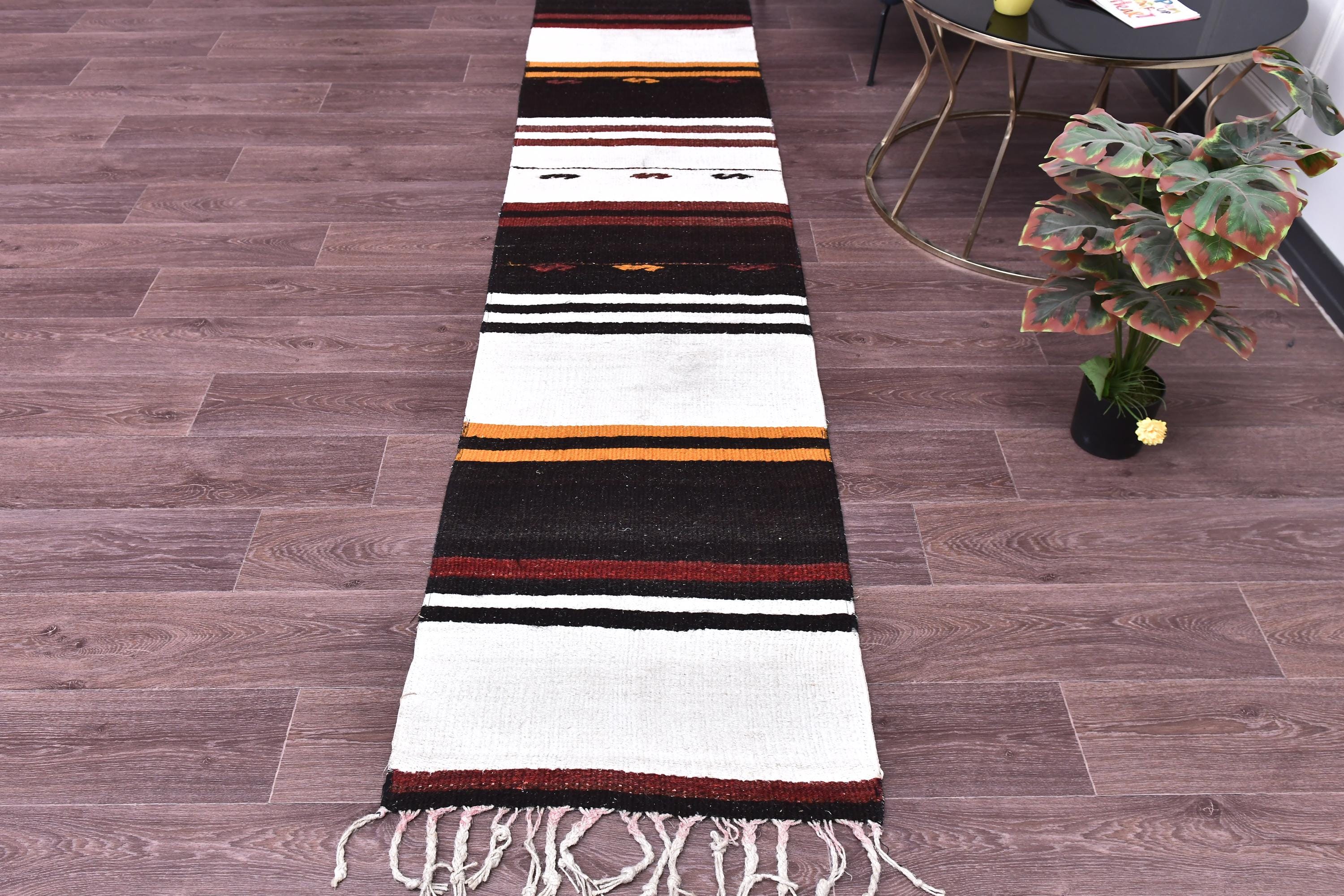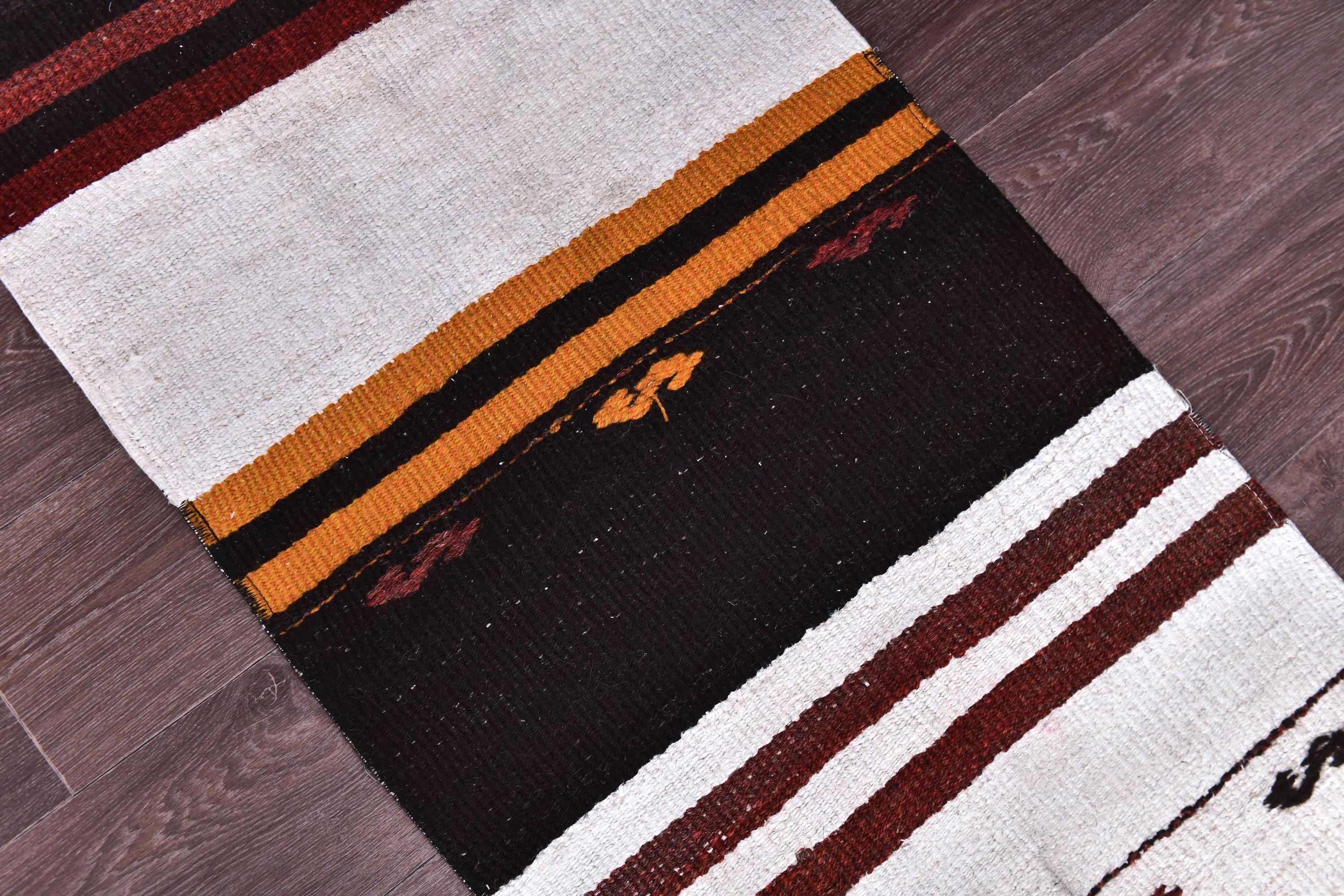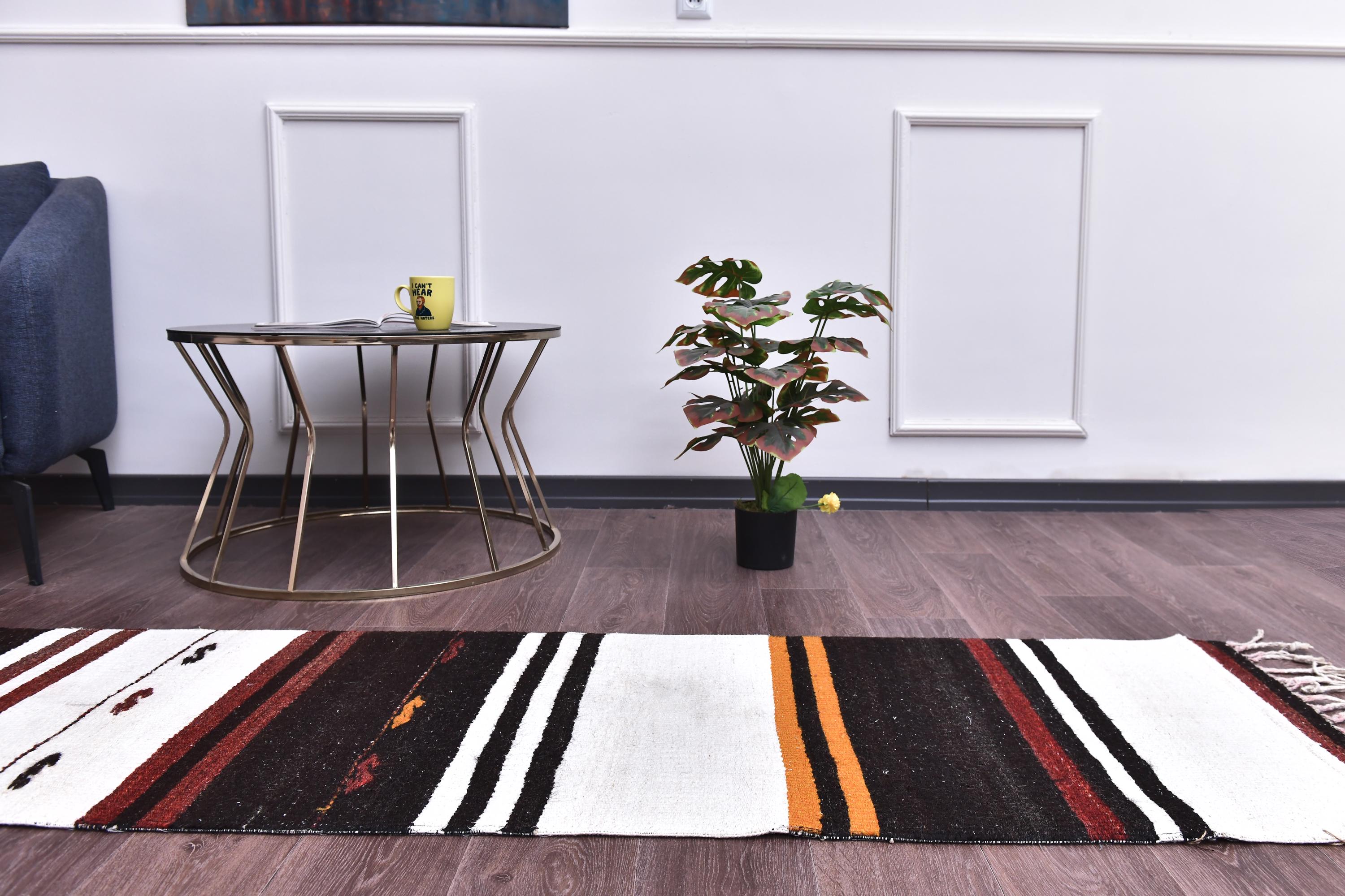 📜📌 Handmade Anatolian flatweave kilim runner with repeating horizontal stripe pattern in black, white, deep red and orange tones, small geometric tribal motifs woven throughout, natural wool with decorative fringe, bohemian style narrow floor runner.