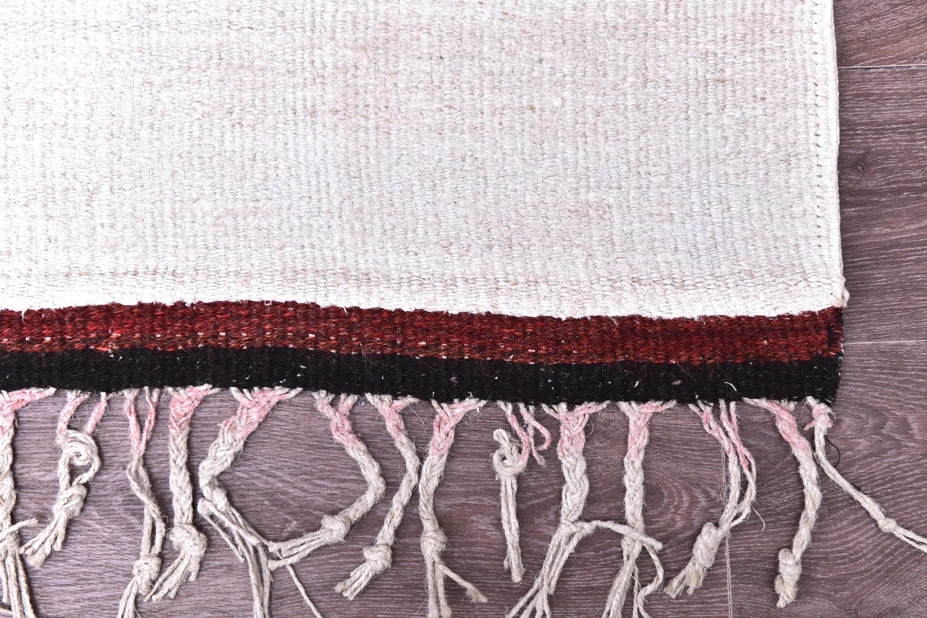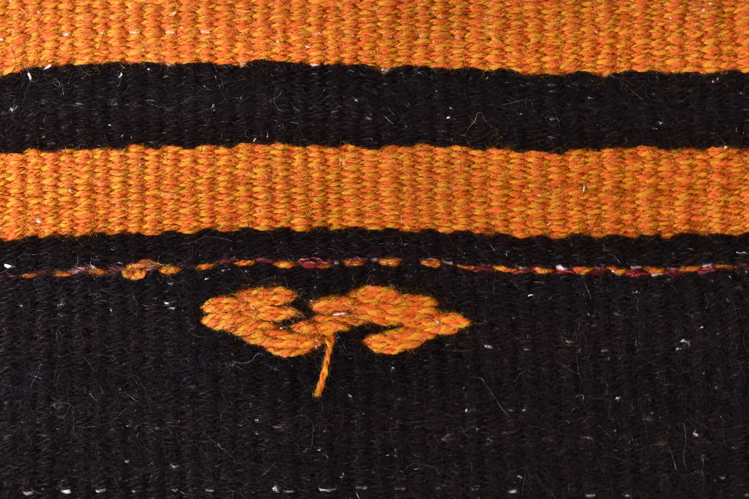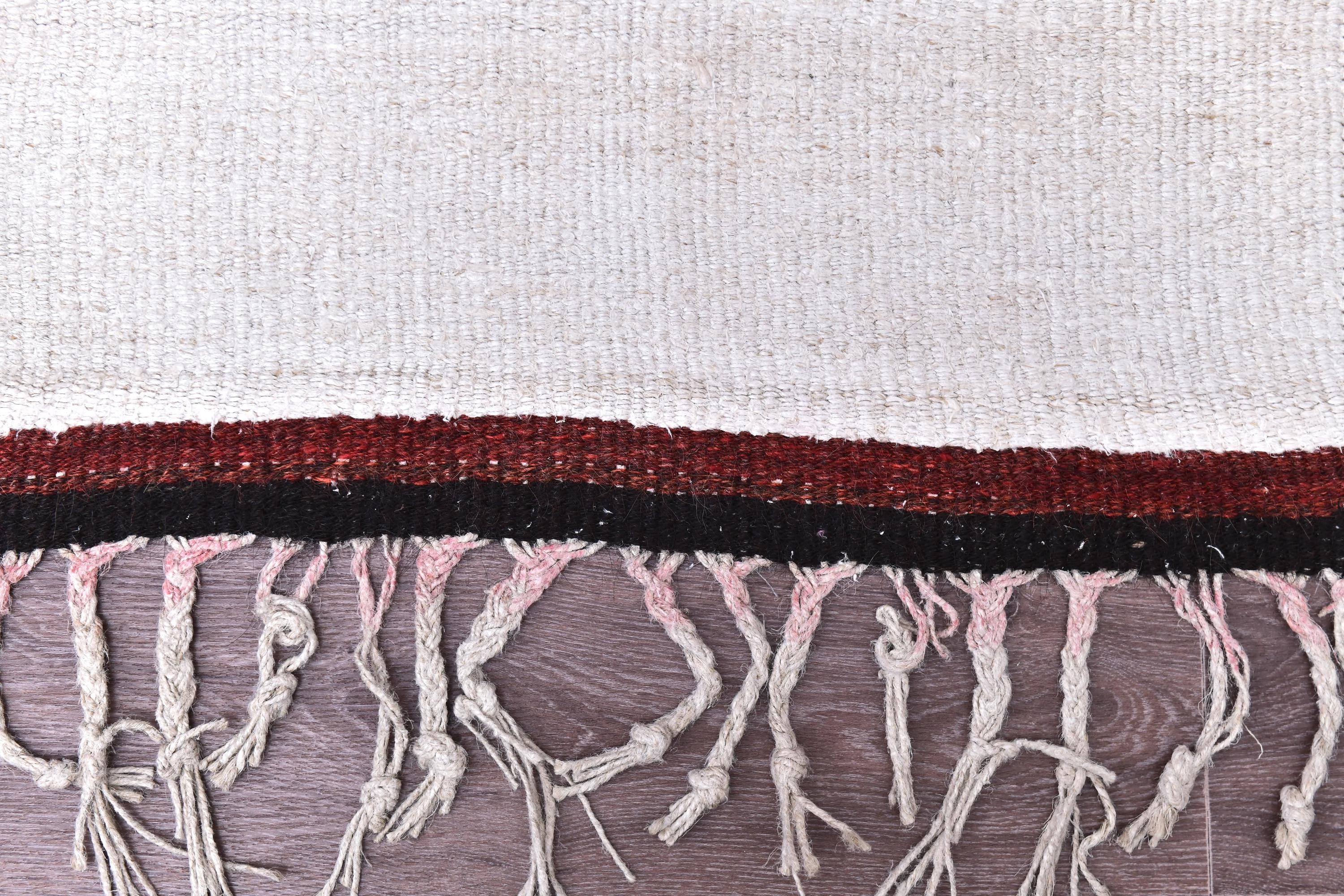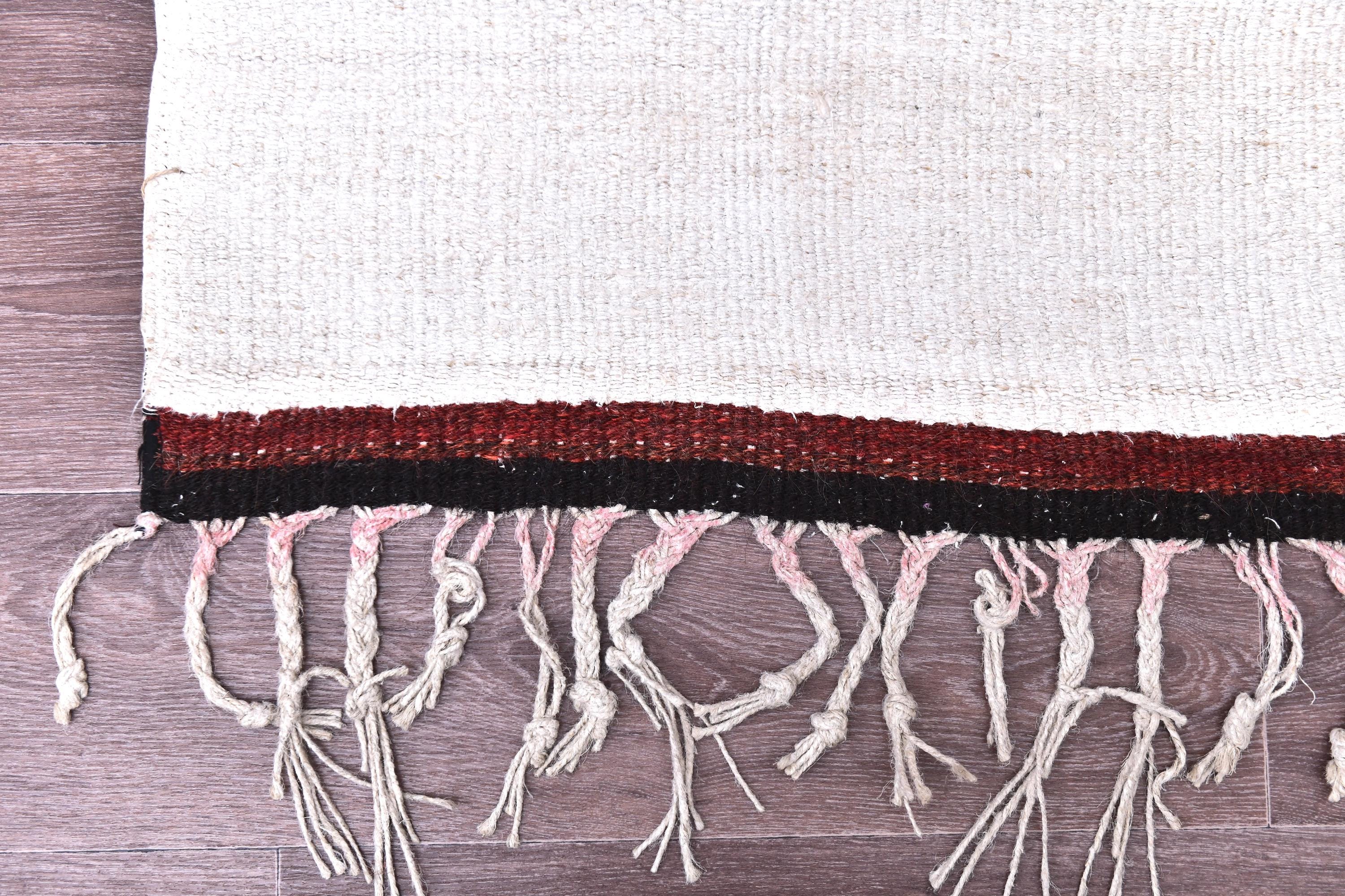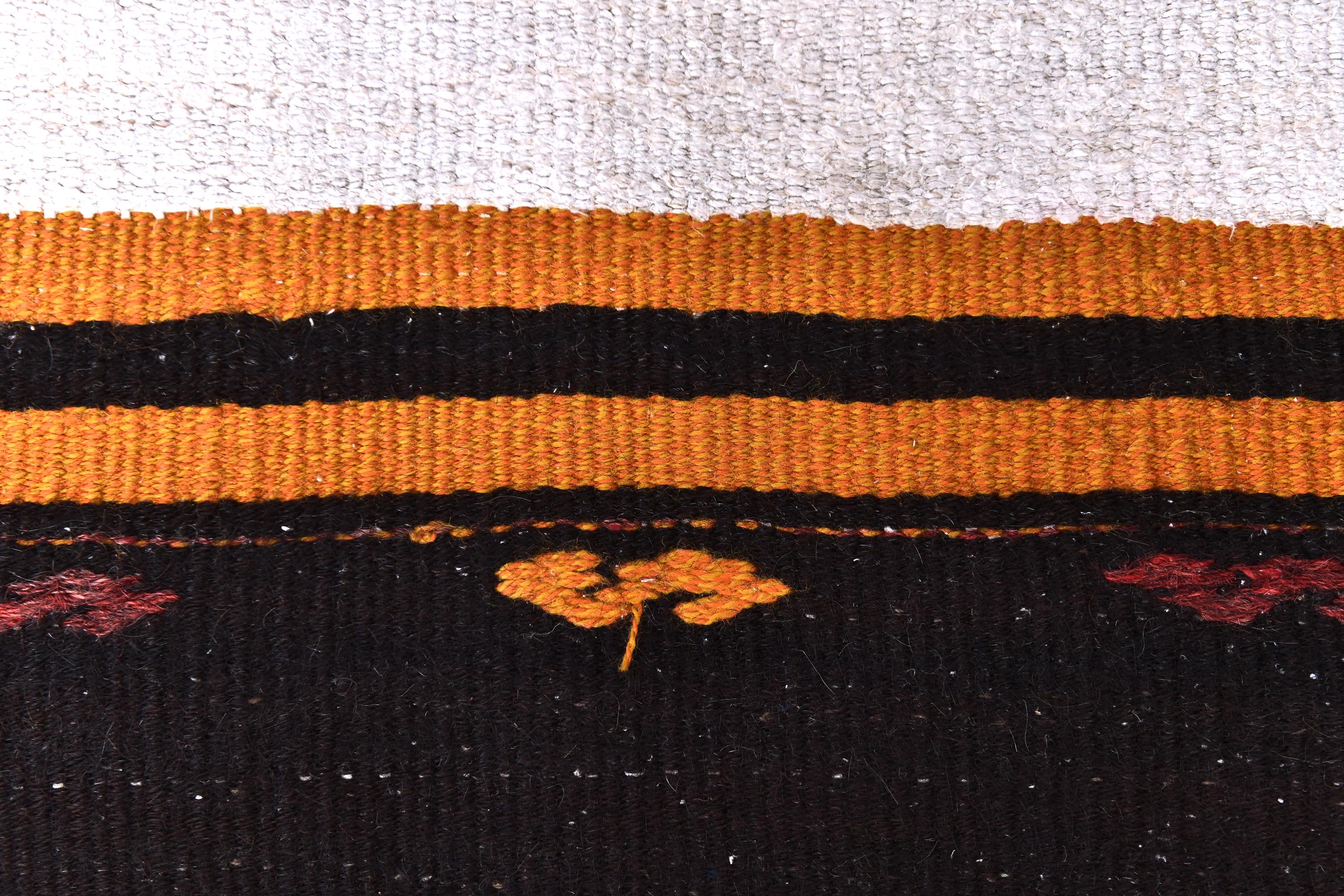 📜📌 Handmade Anatolian flatweave kilim runner with repeating horizontal stripe pattern in black, white, deep red and orange tones, small geometric tribal motifs woven throughout, natural wool with decorative fringe, bohemian style narrow floor runner.