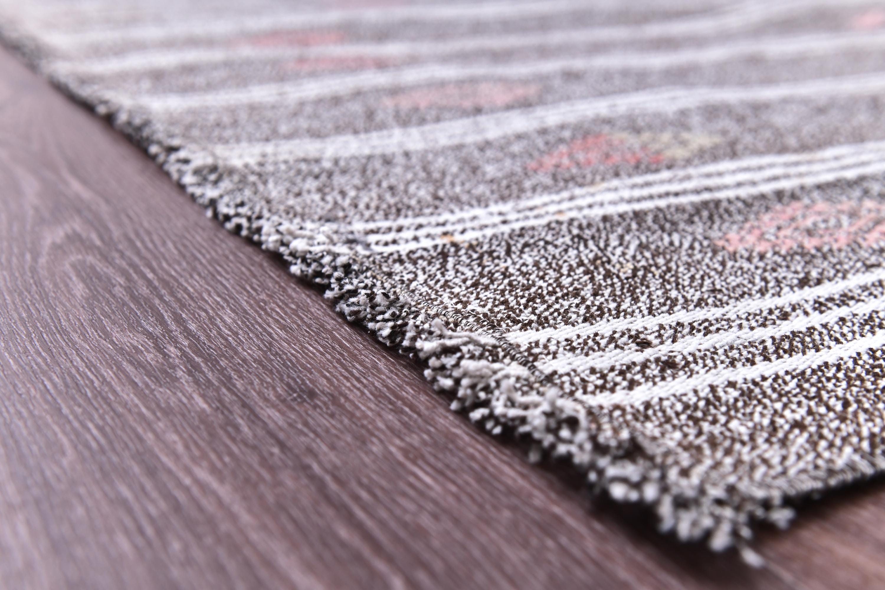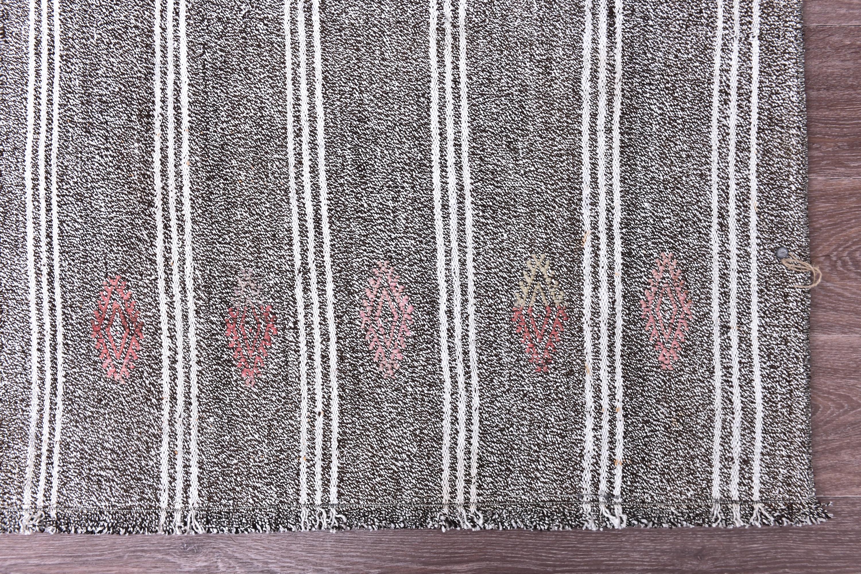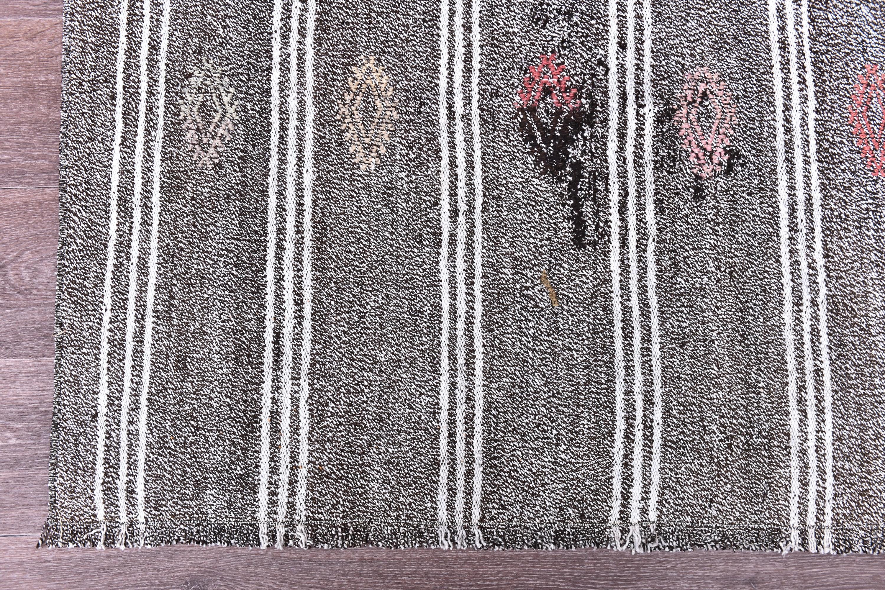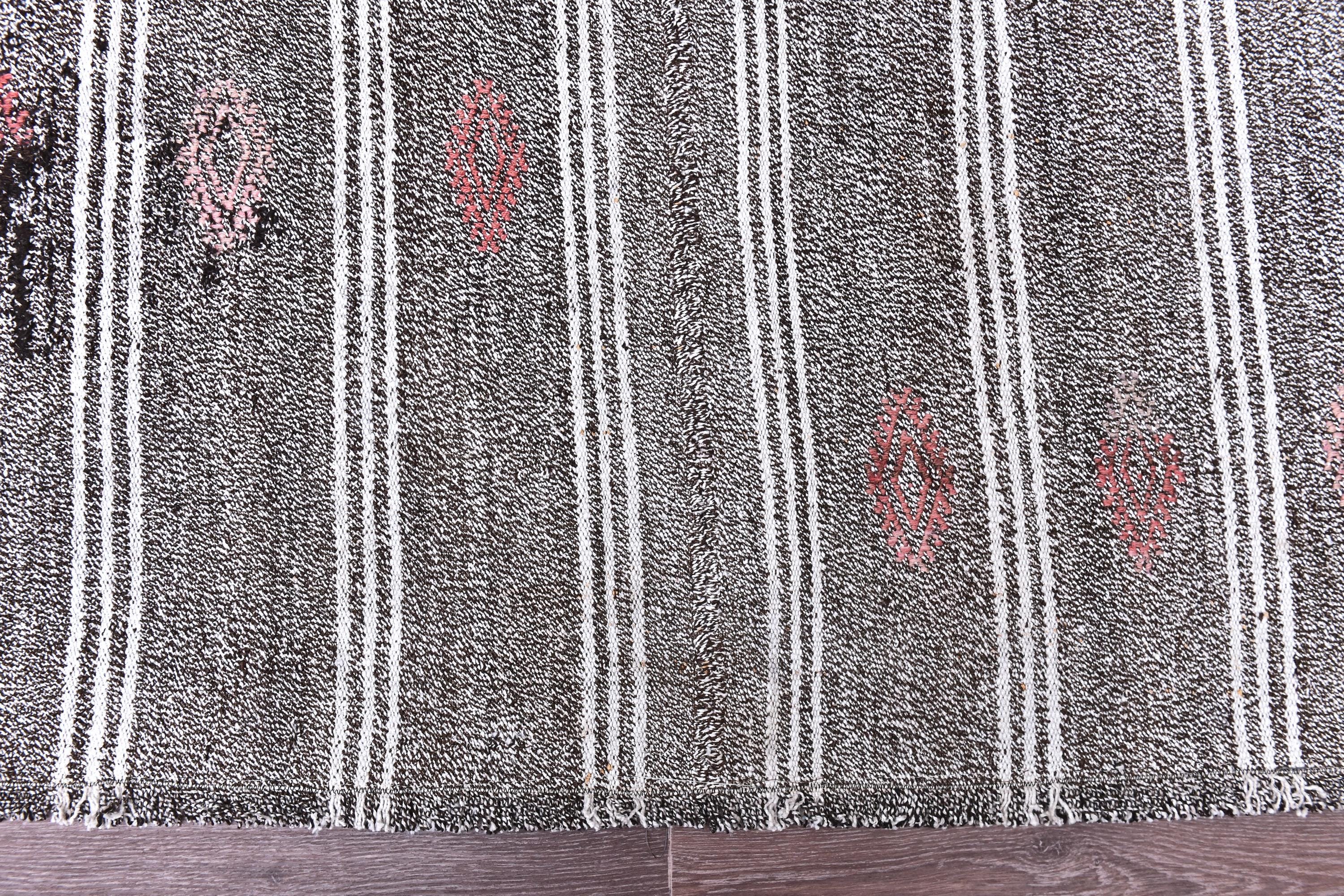 📜📌 Handwoven charcoal gray wool kilim rug with decorative knotted fringes on both ends, flat-weave texture, two-panel construction, displayed on hardwood floor