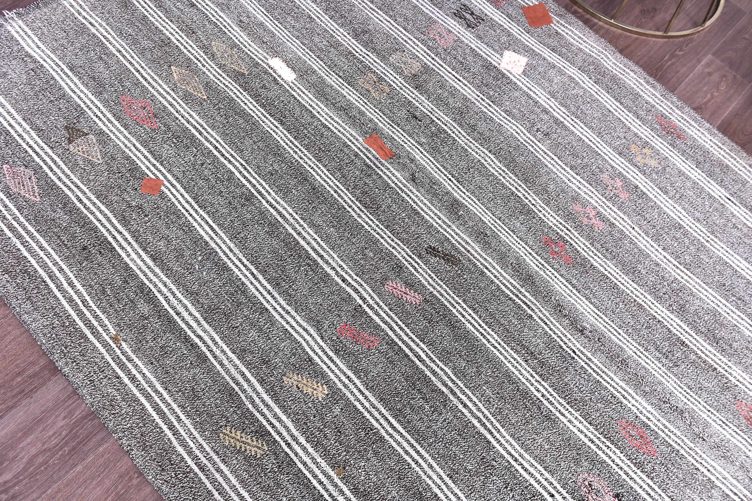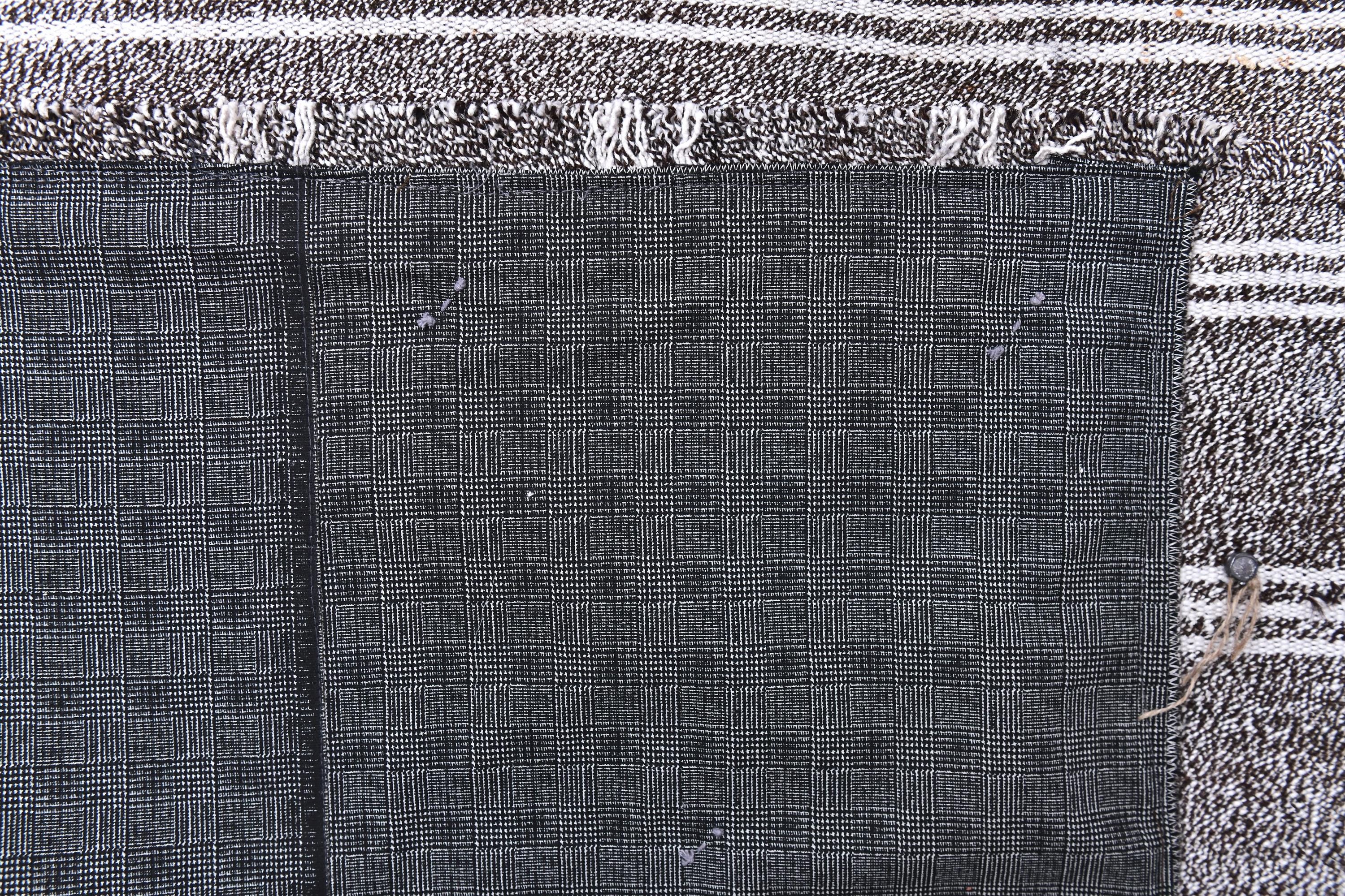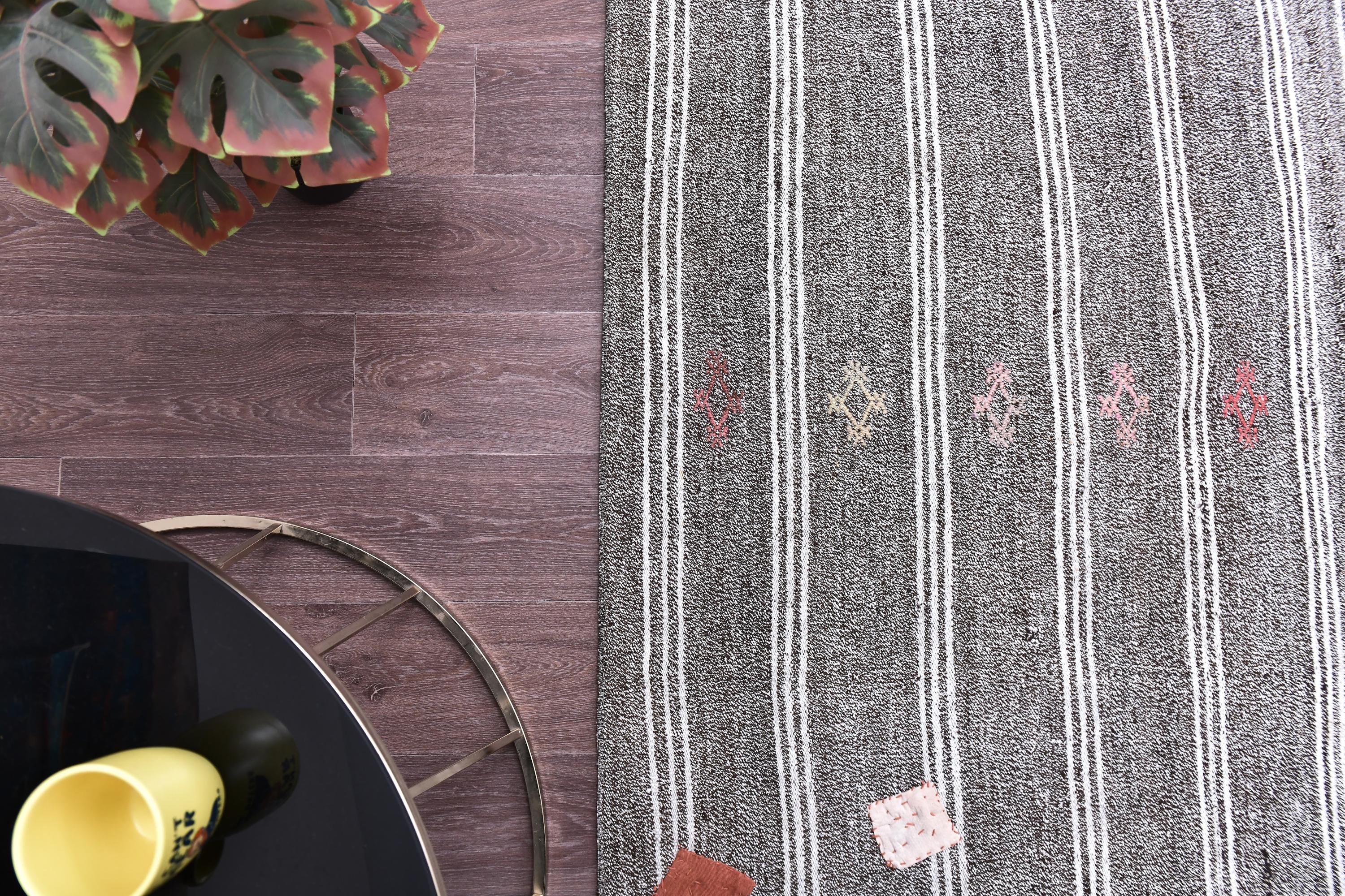 📜📌 Handwoven charcoal gray wool kilim rug with decorative knotted fringes on both ends, flat-weave texture, two-panel construction, displayed on hardwood floor