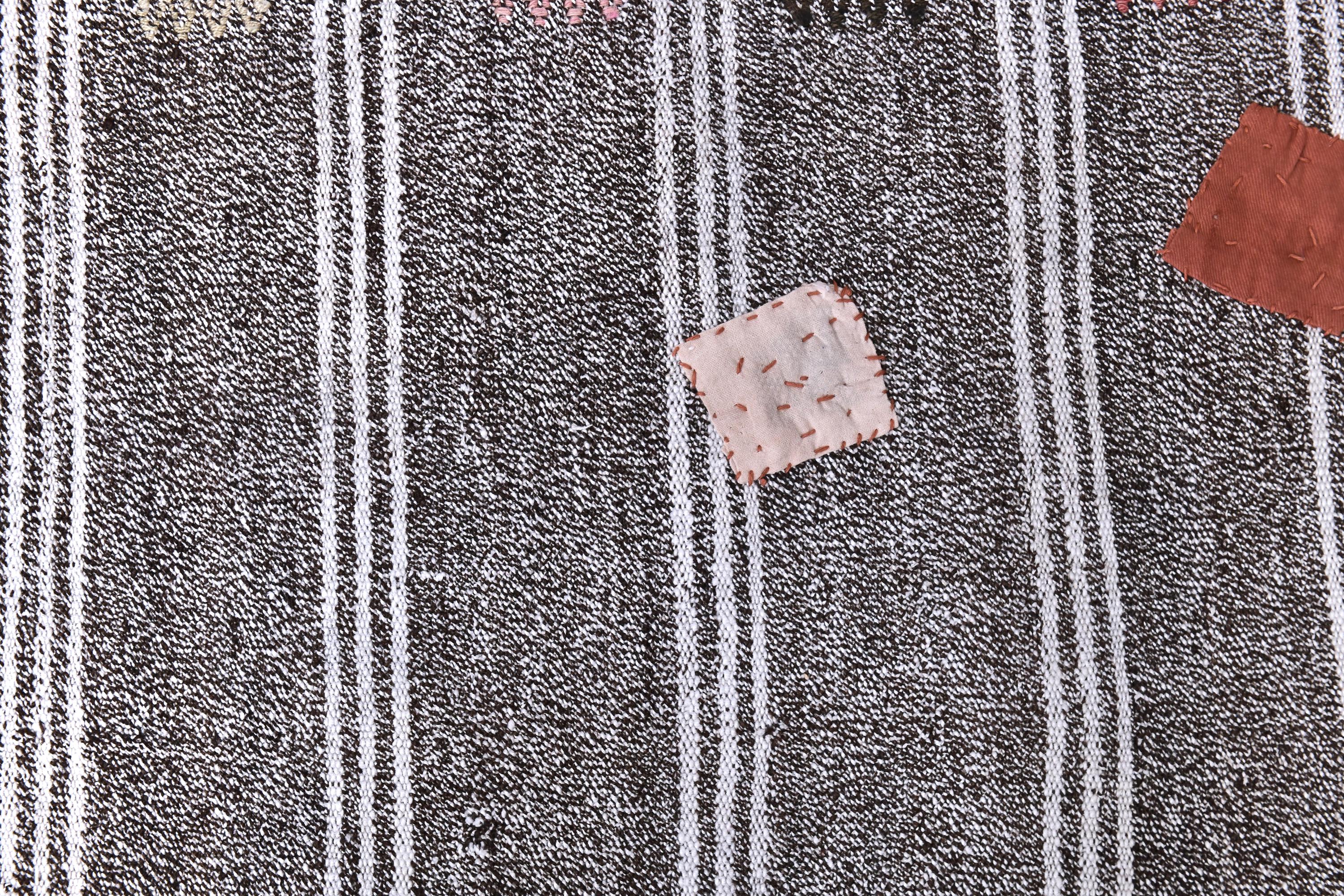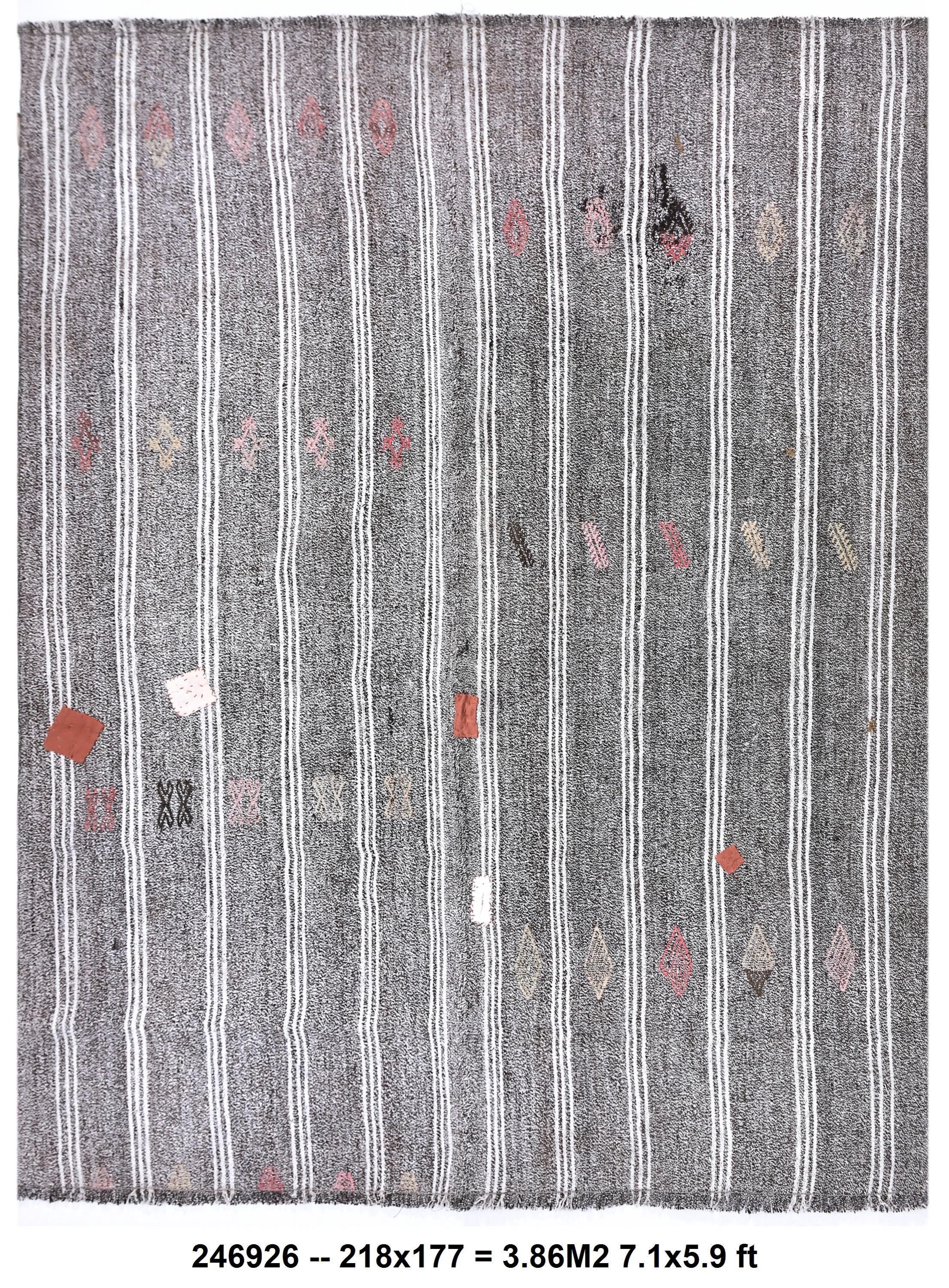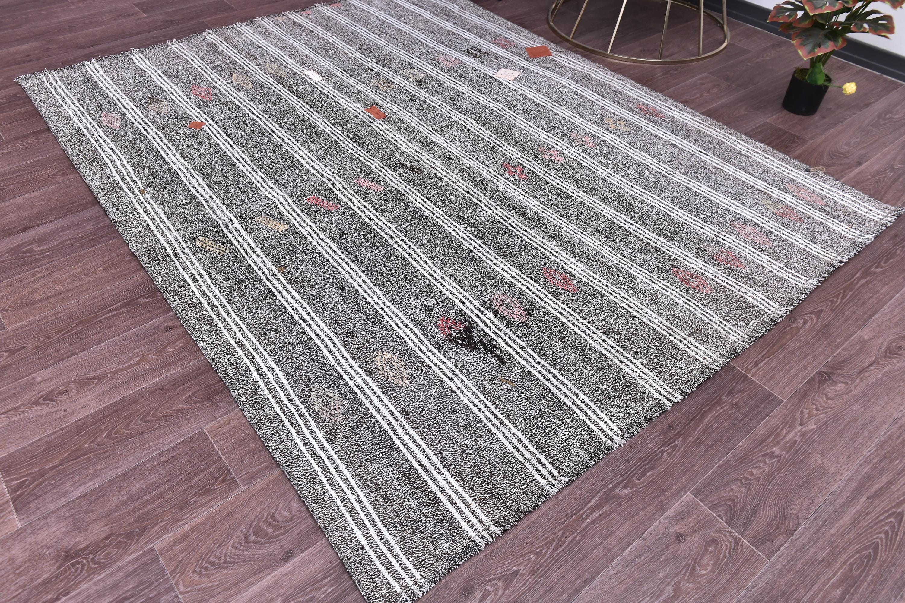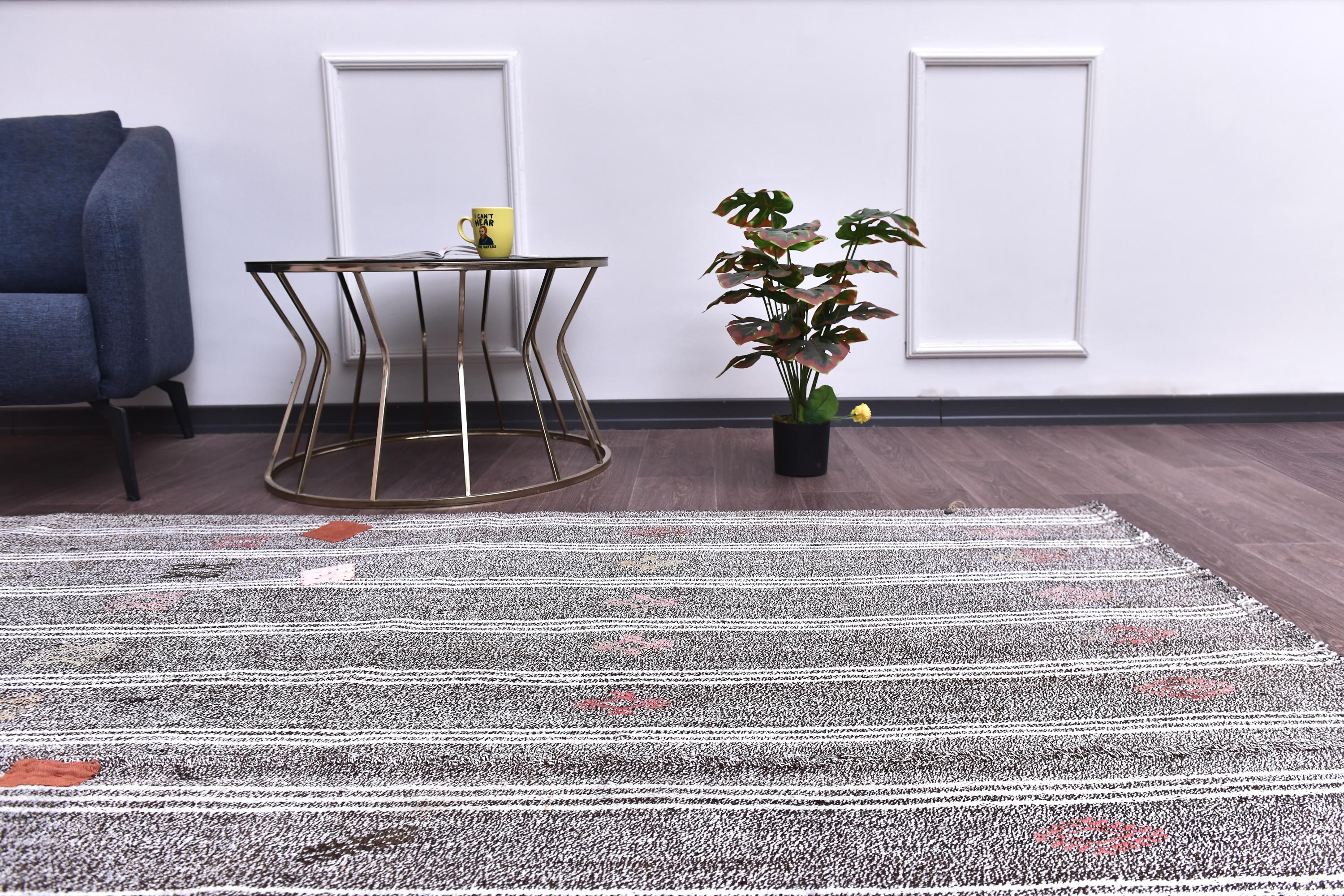 📜📌 Handwoven charcoal gray wool kilim rug with decorative knotted fringes on both ends, flat-weave texture, two-panel construction, displayed on hardwood floor