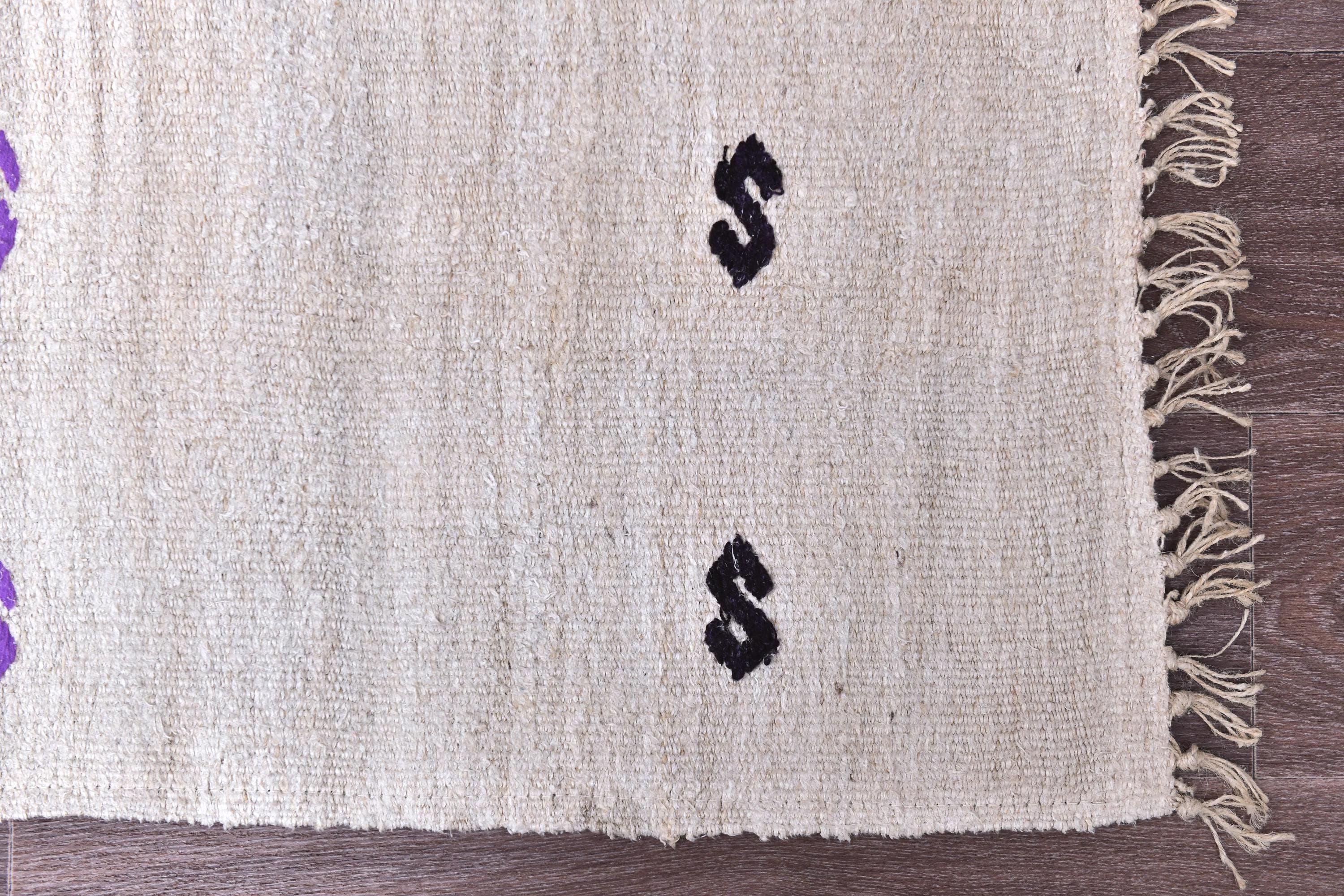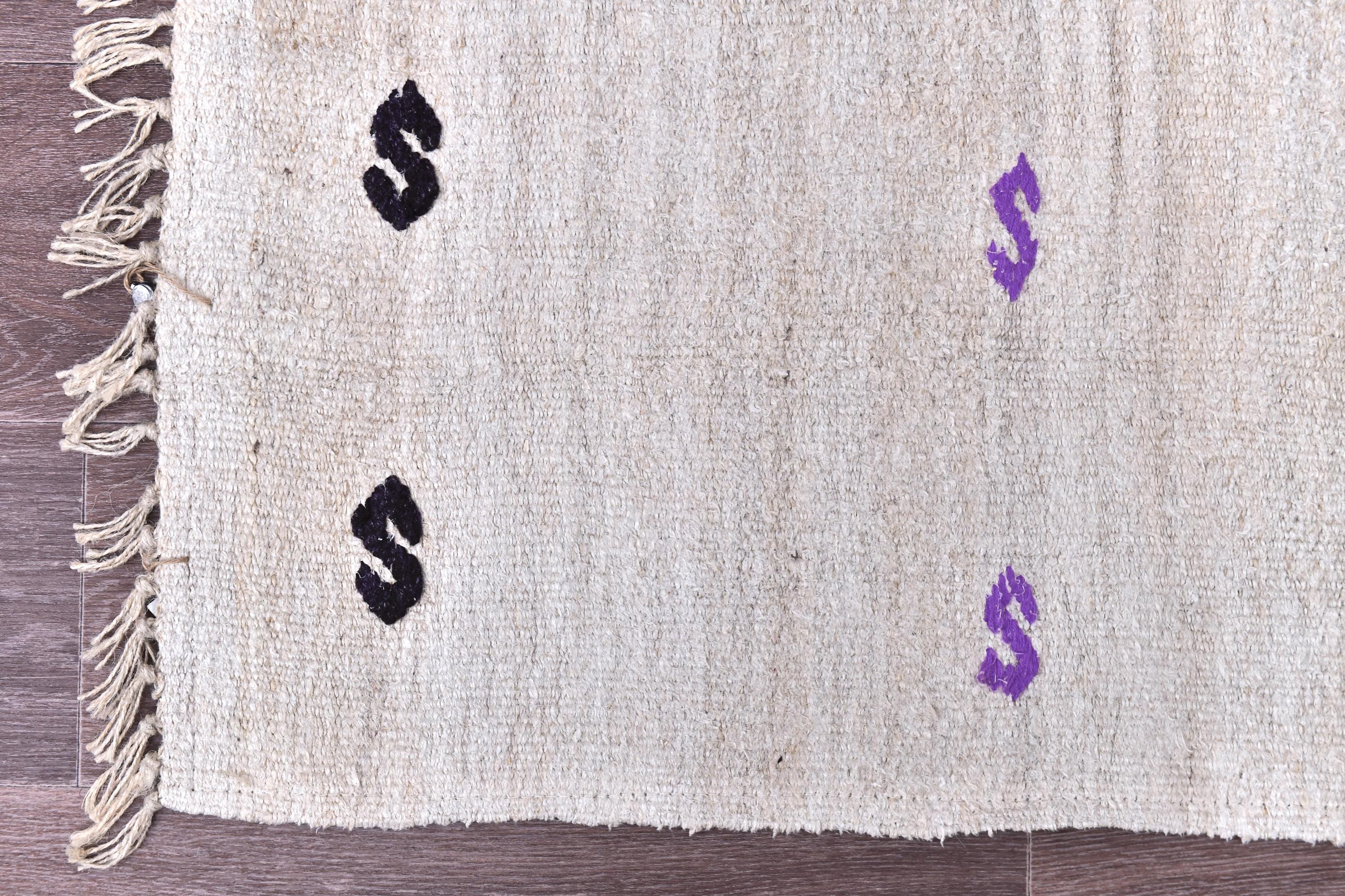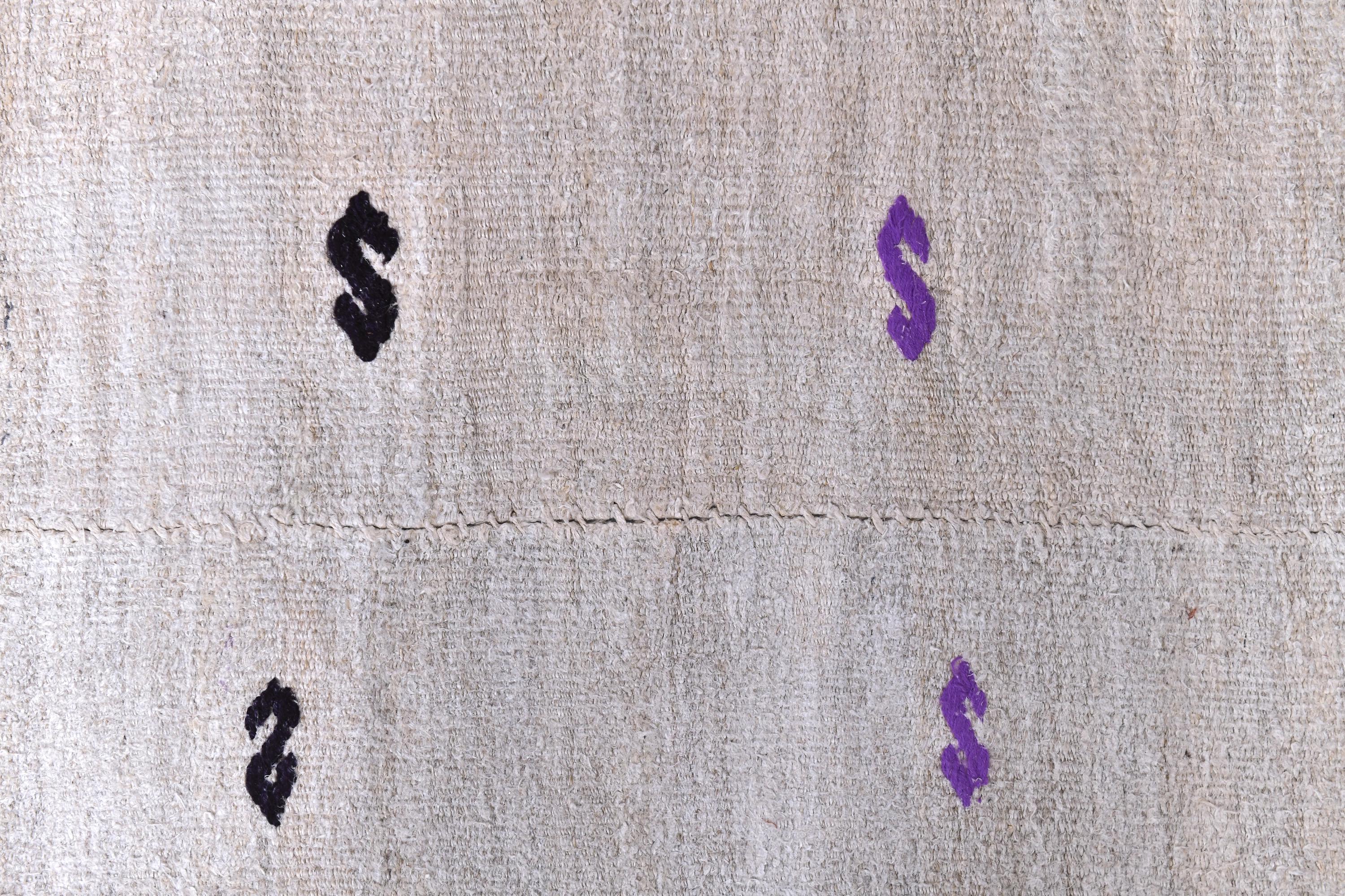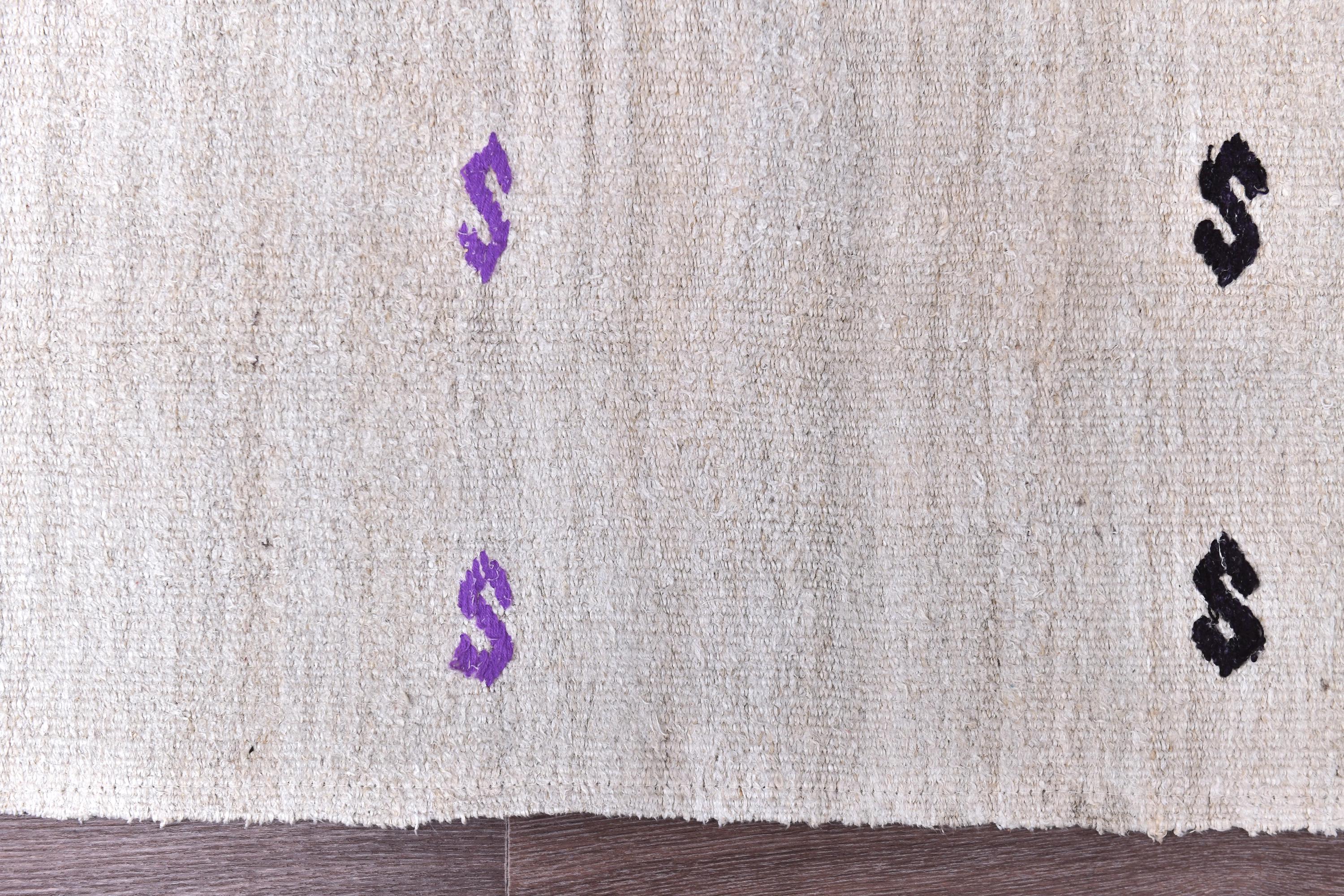 📜📌 Top-down view of a small vintage flatweave kilim rug in natural off-white wool, featuring rows of hand-embroidered S-curl symbols in deep black and violet purple arranged in a three-column grid pattern, rustic handwoven texture visible throughout, cream fringe border, bohemian accent rug