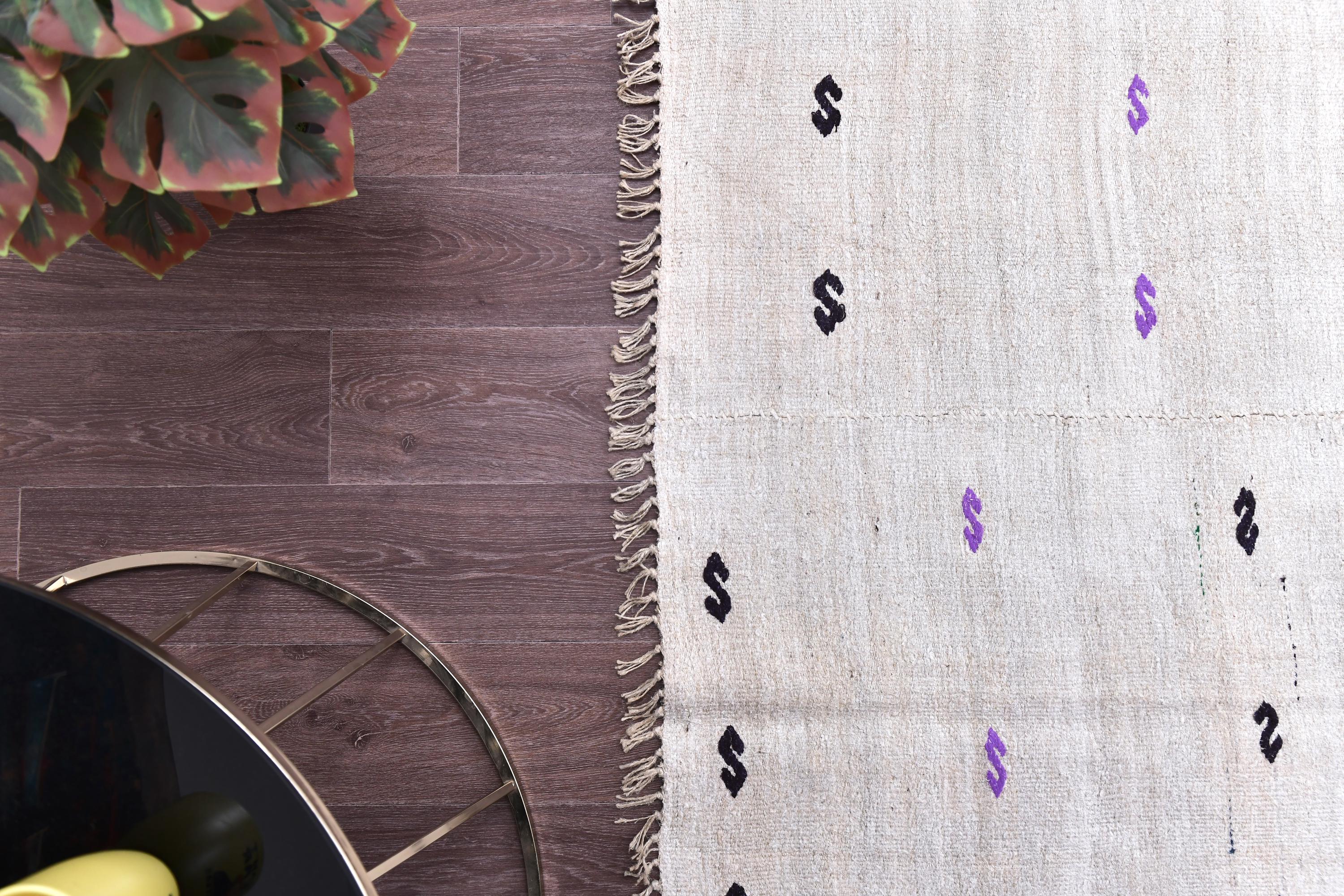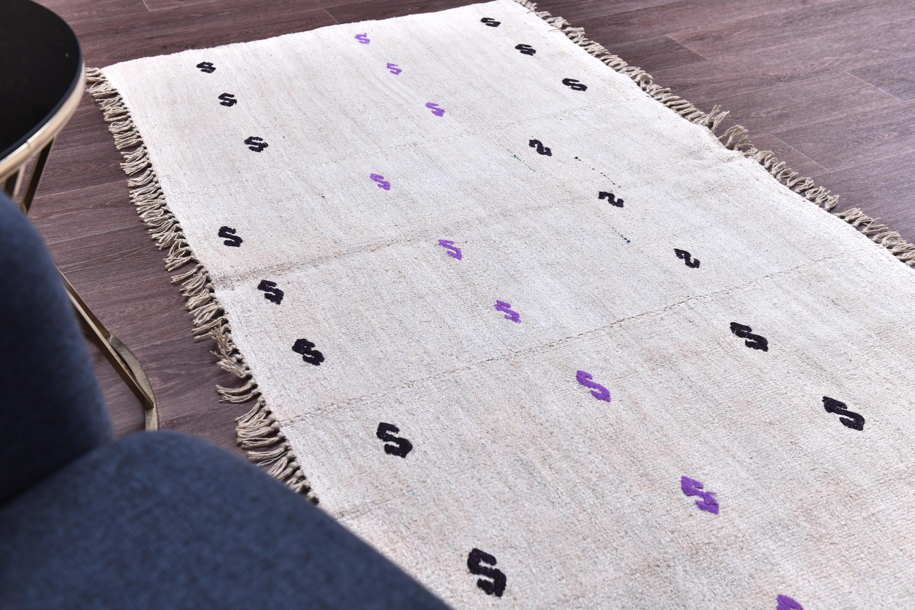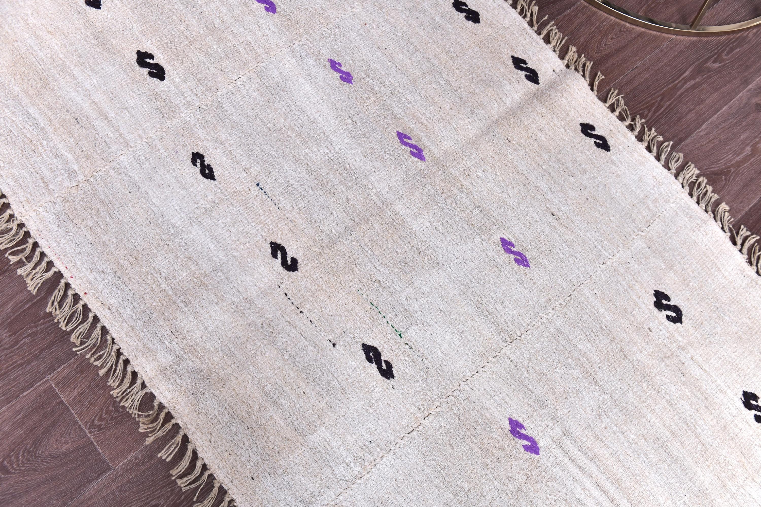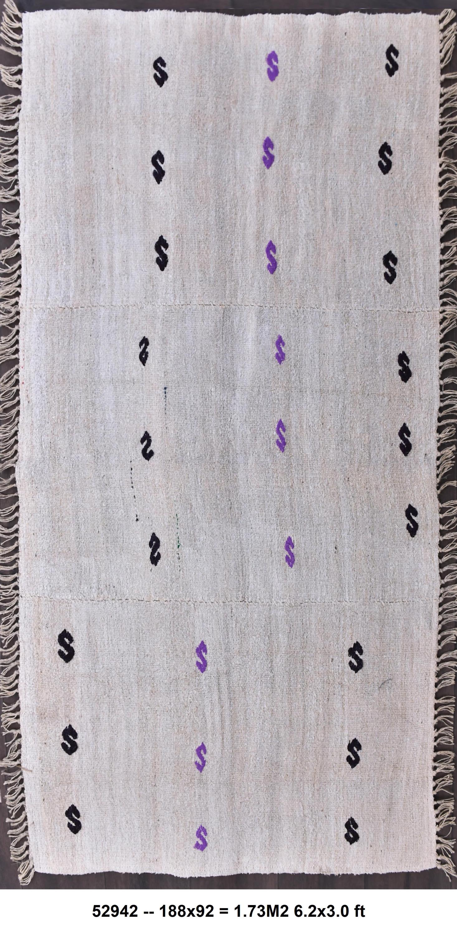 📜📌 Top-down view of a small vintage flatweave kilim rug in natural off-white wool, featuring rows of hand-embroidered S-curl symbols in deep black and violet purple arranged in a three-column grid pattern, rustic handwoven texture visible throughout, cream fringe border, bohemian accent rug