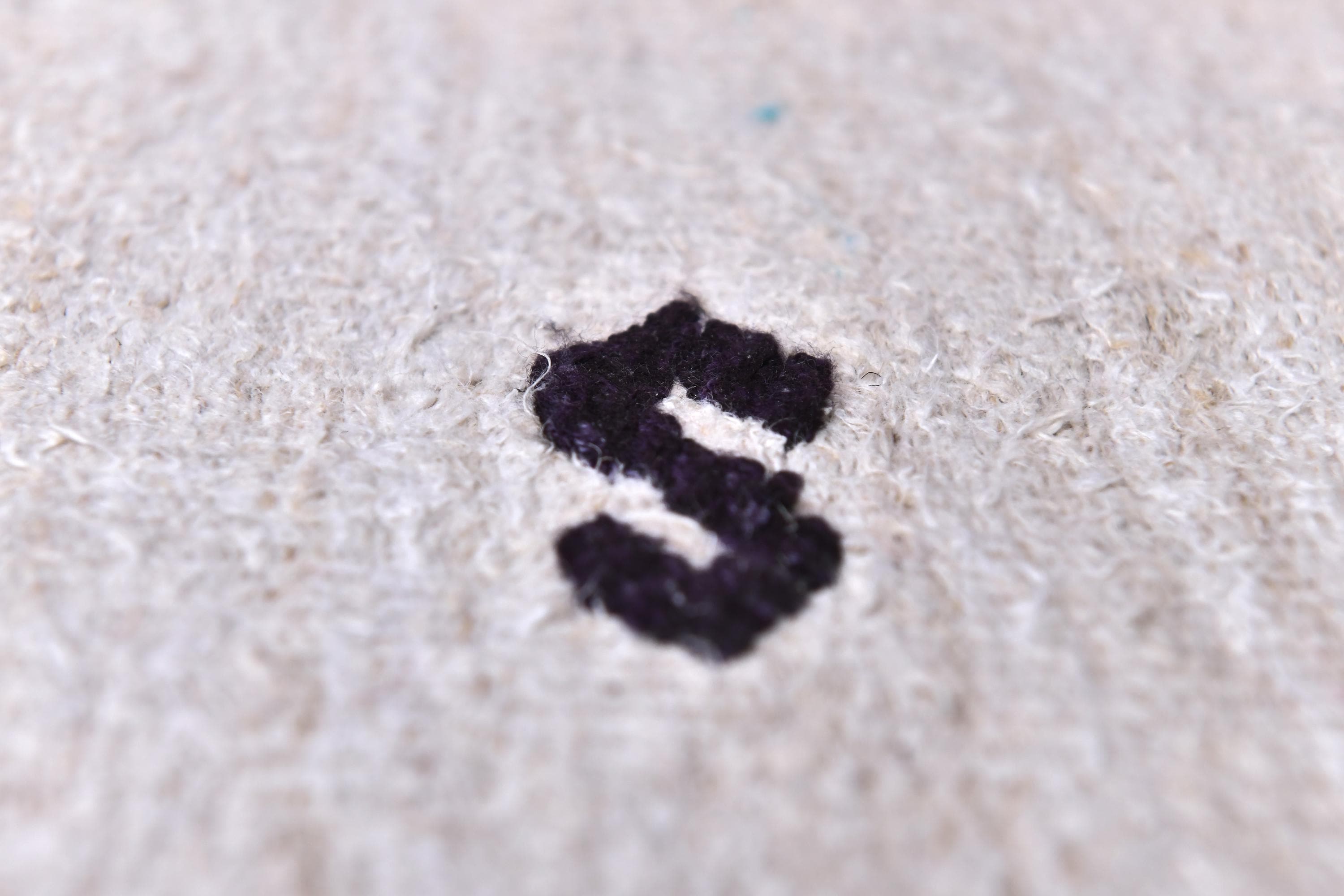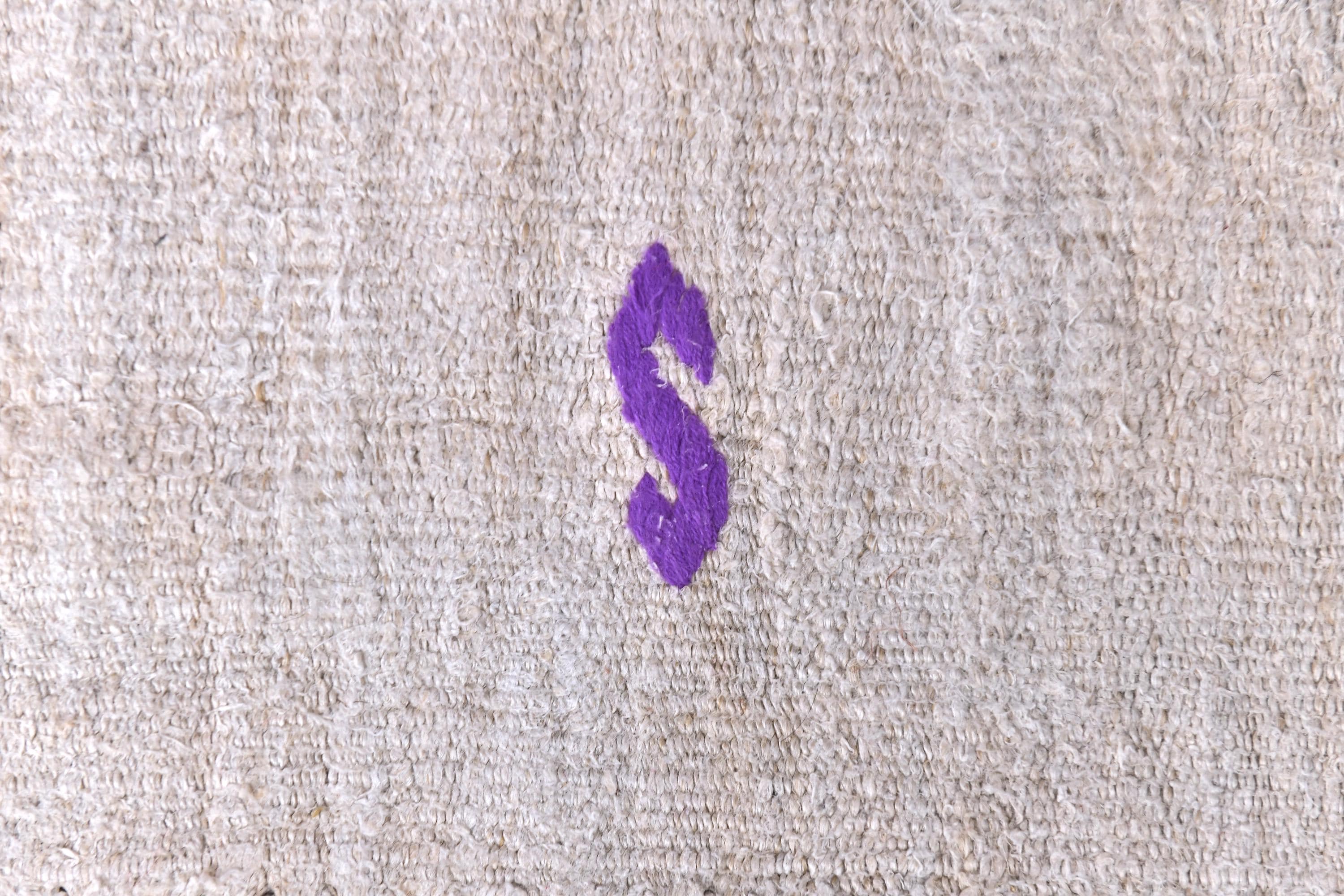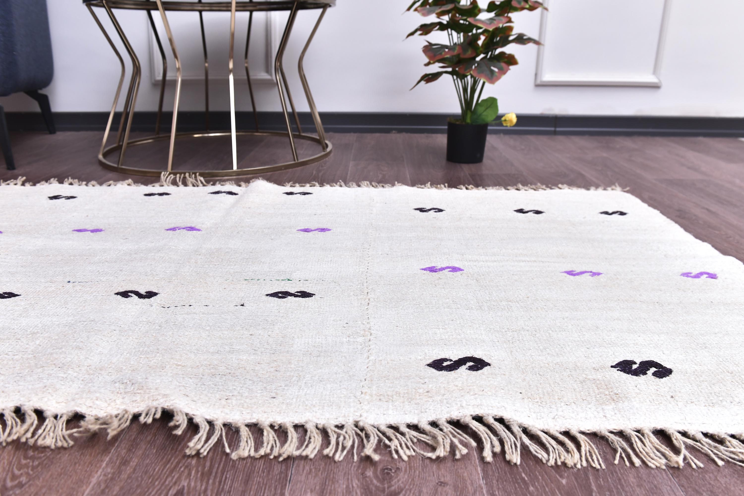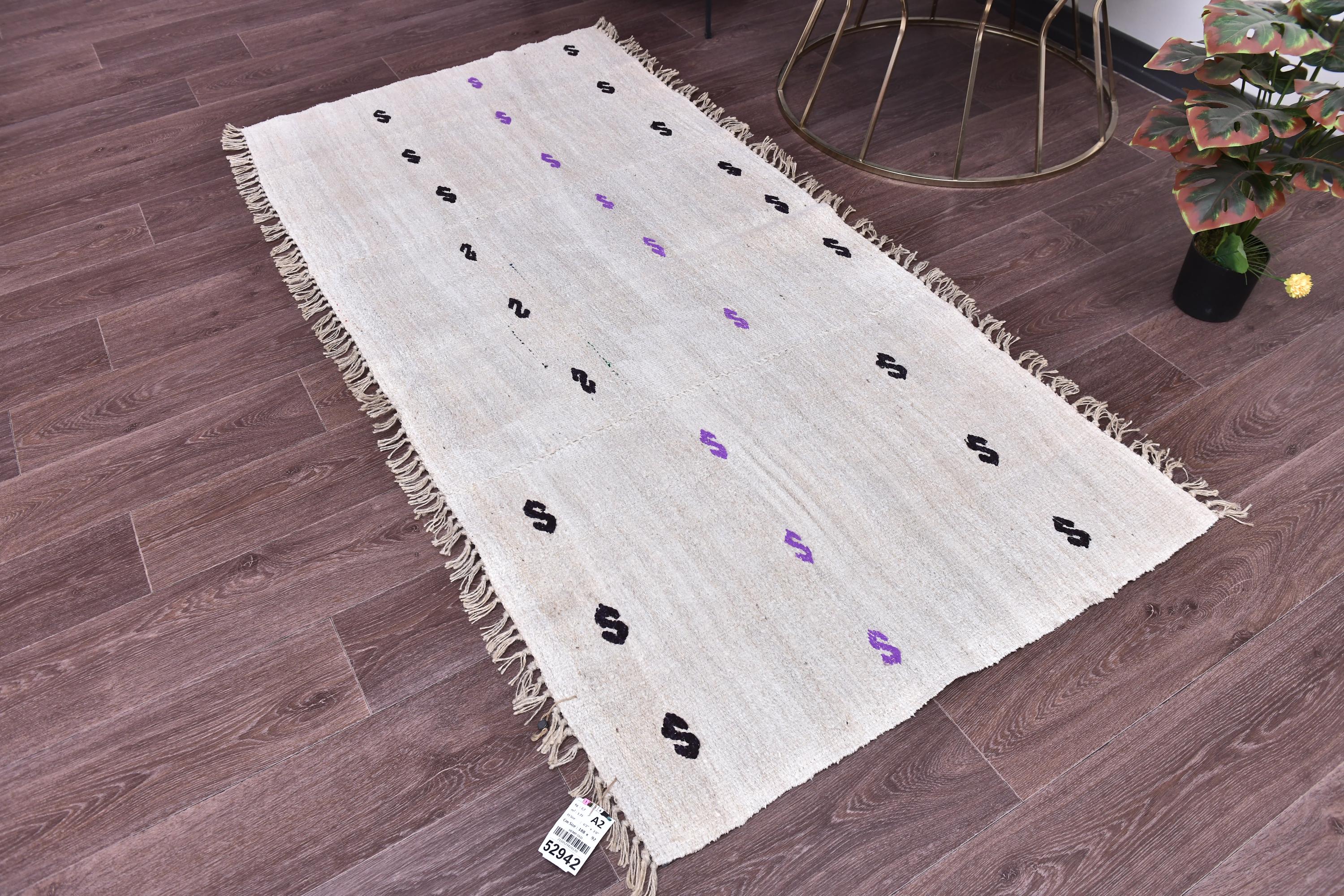 📜📌 Top-down view of a small vintage flatweave kilim rug in natural off-white wool, featuring rows of hand-embroidered S-curl symbols in deep black and violet purple arranged in a three-column grid pattern, rustic handwoven texture visible throughout, cream fringe border, bohemian accent rug