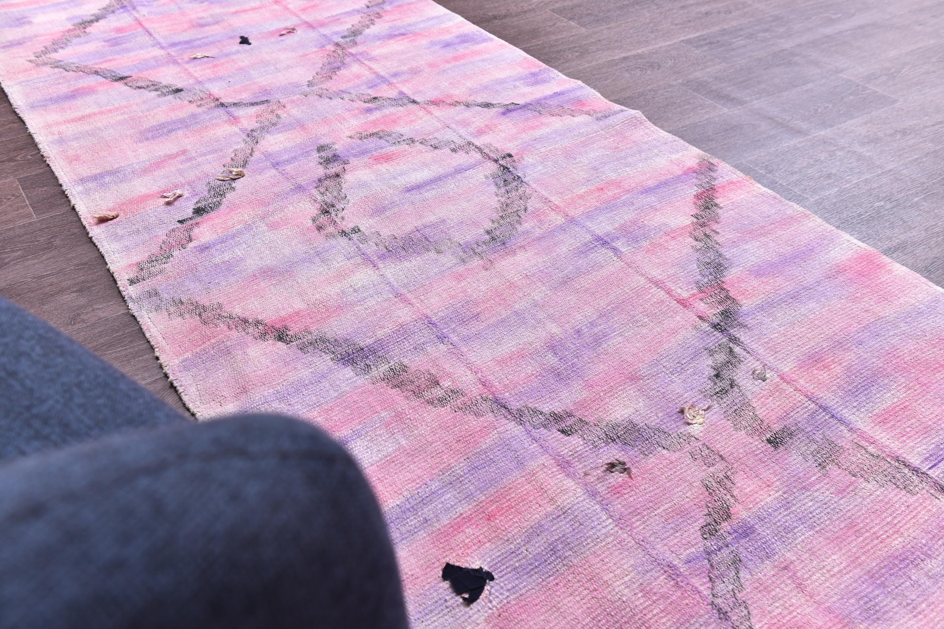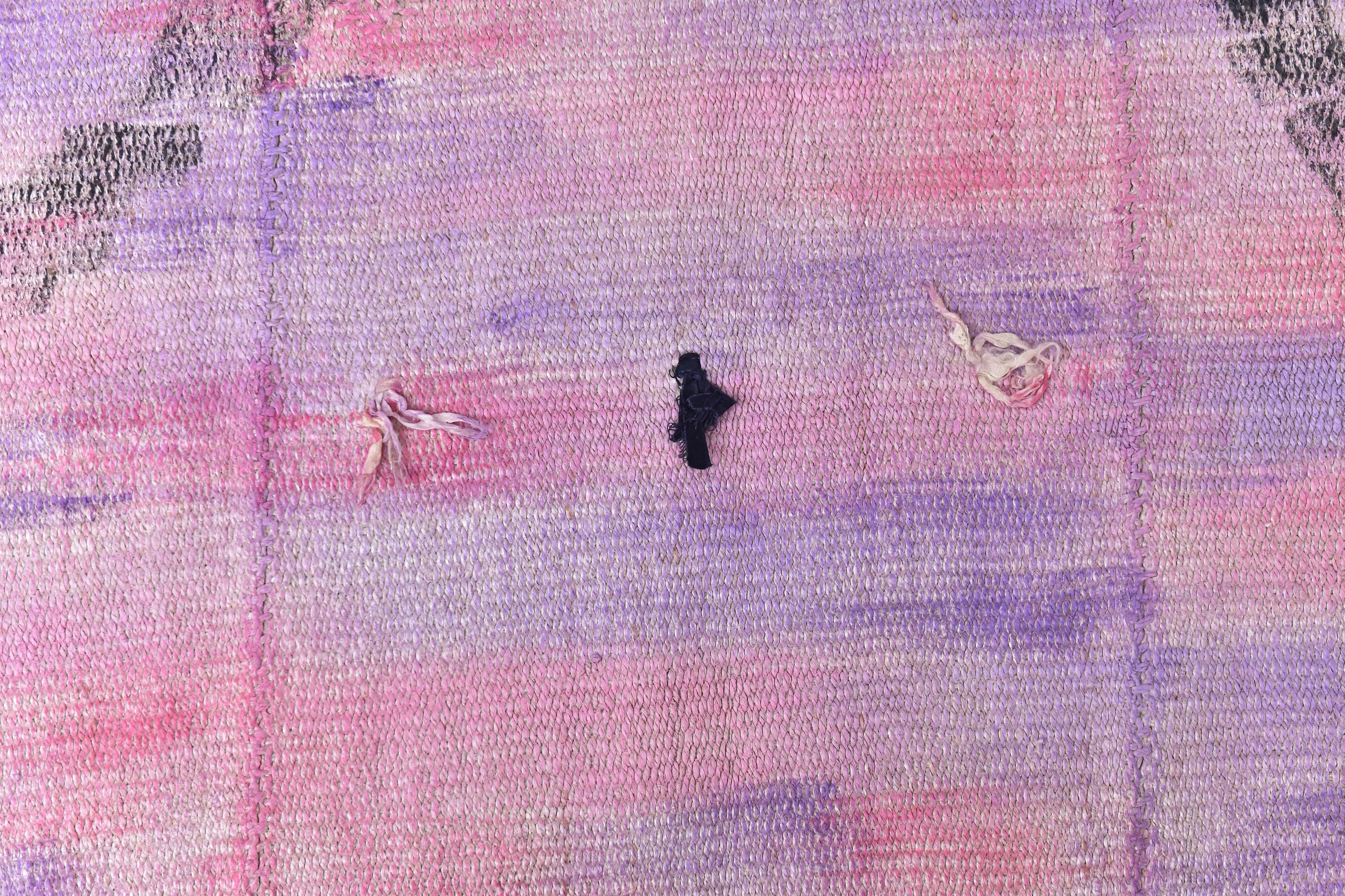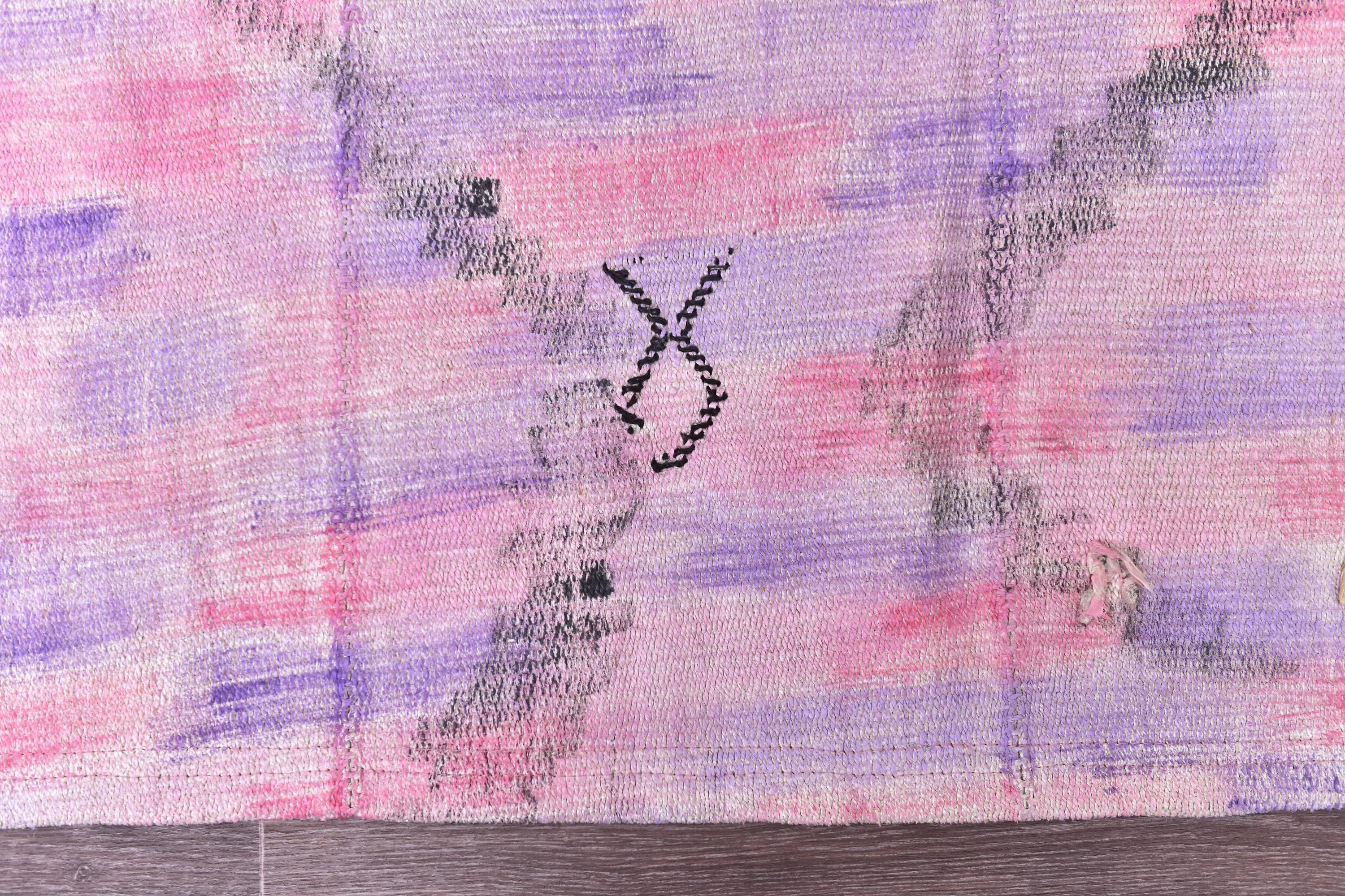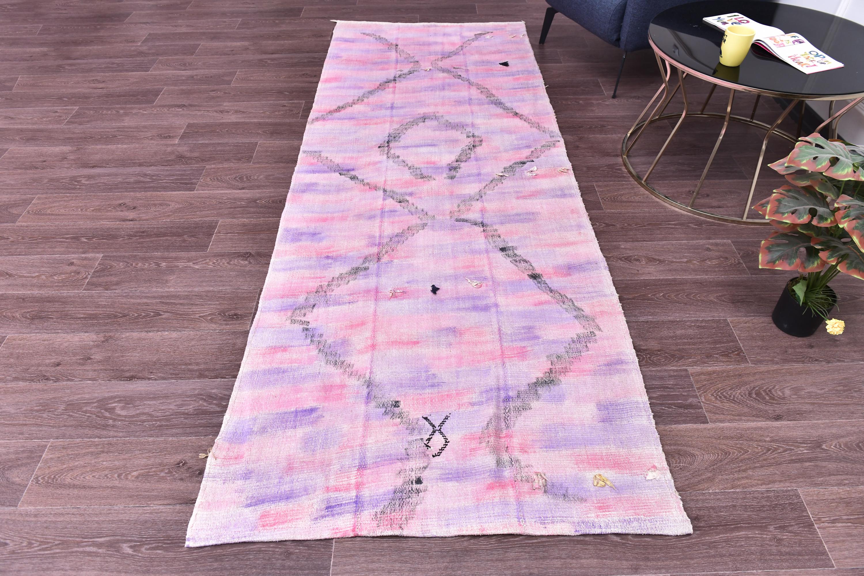 📜📌 Vintage pink purple Turkish hemp kilim runner rug with abstract diamond geometric pattern, handwoven flatweave, bohemian faded pastel tones, 3x9 ft