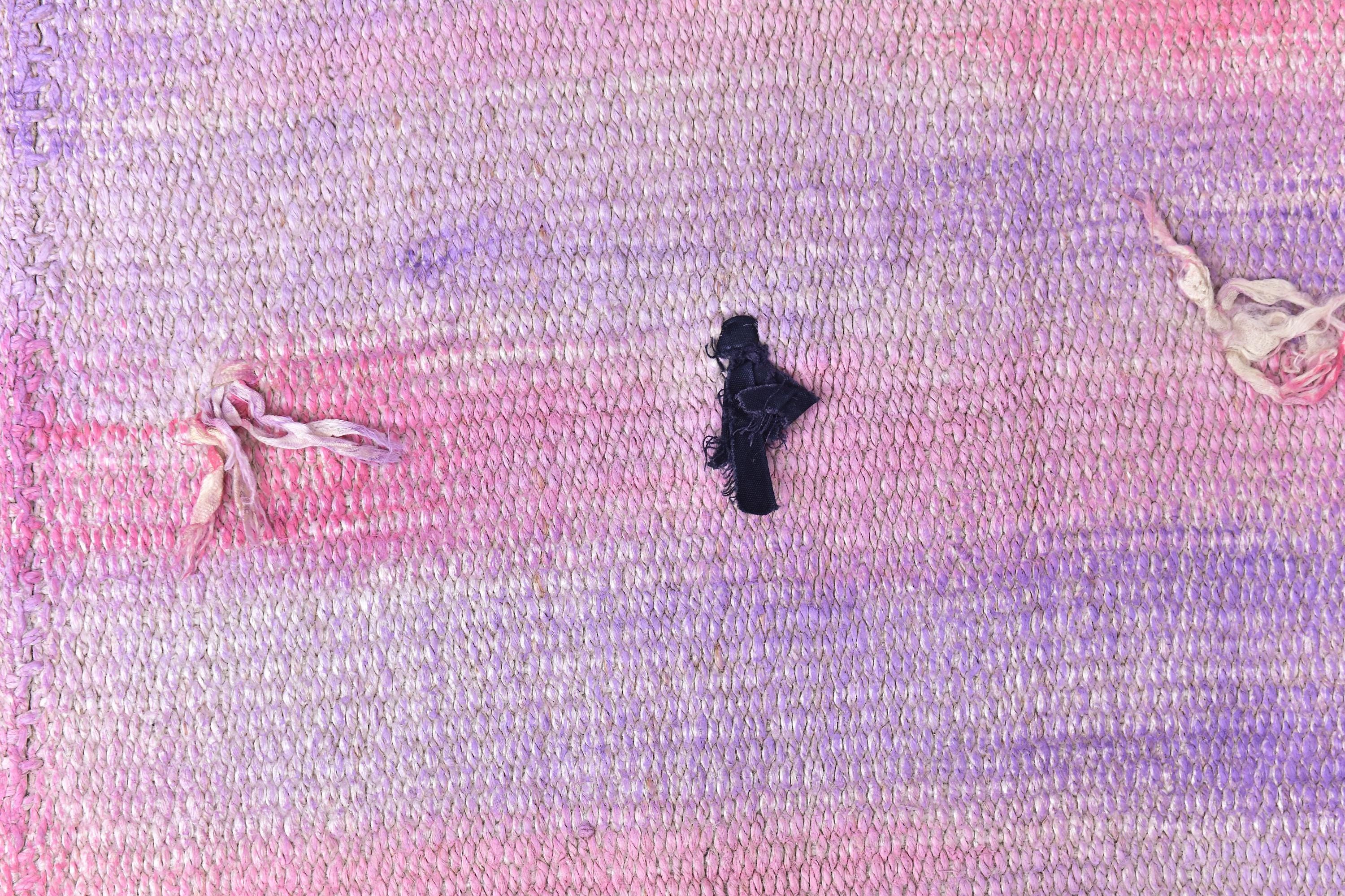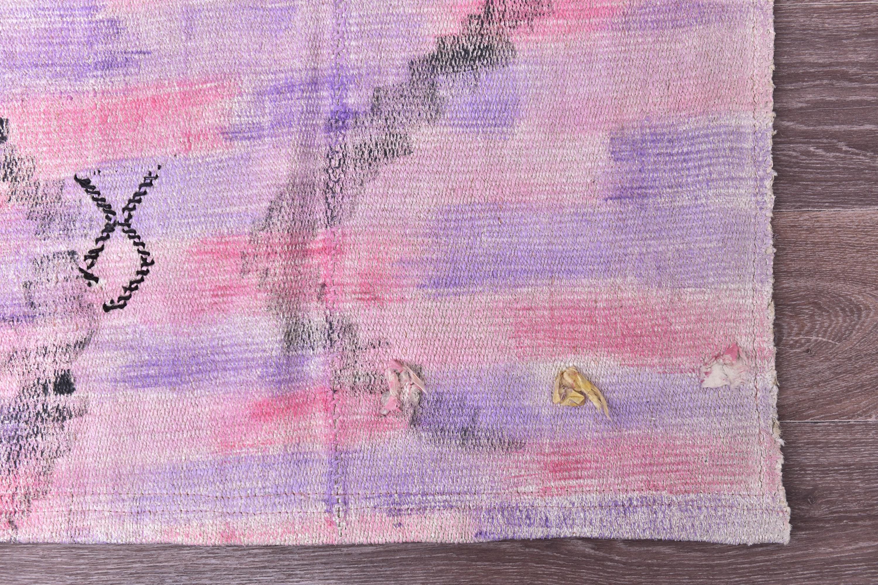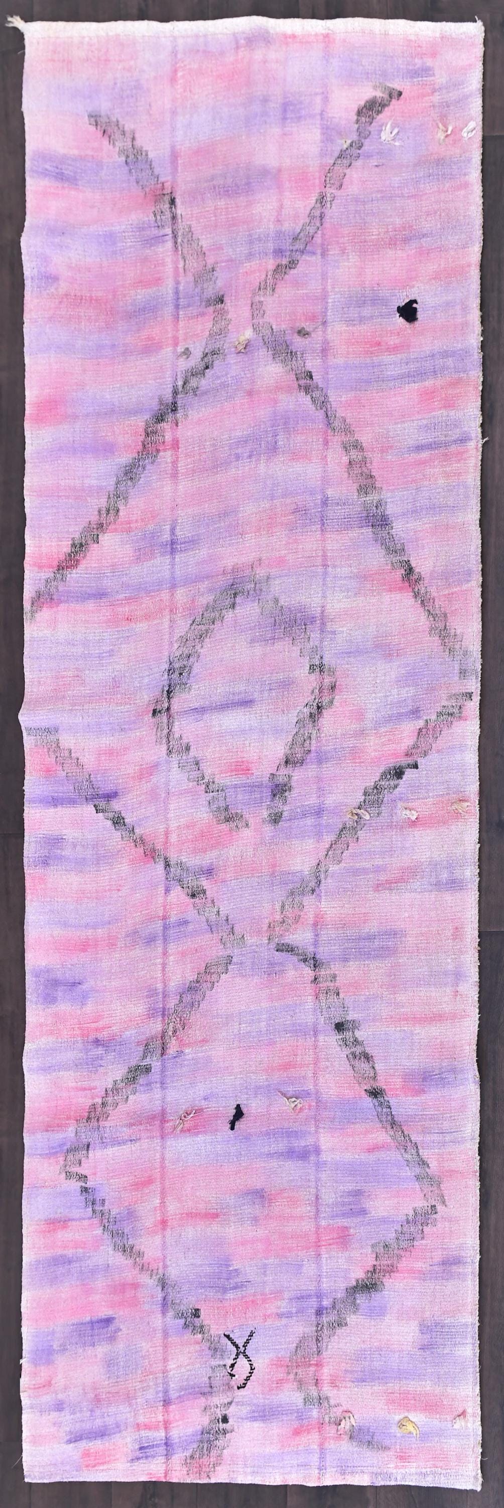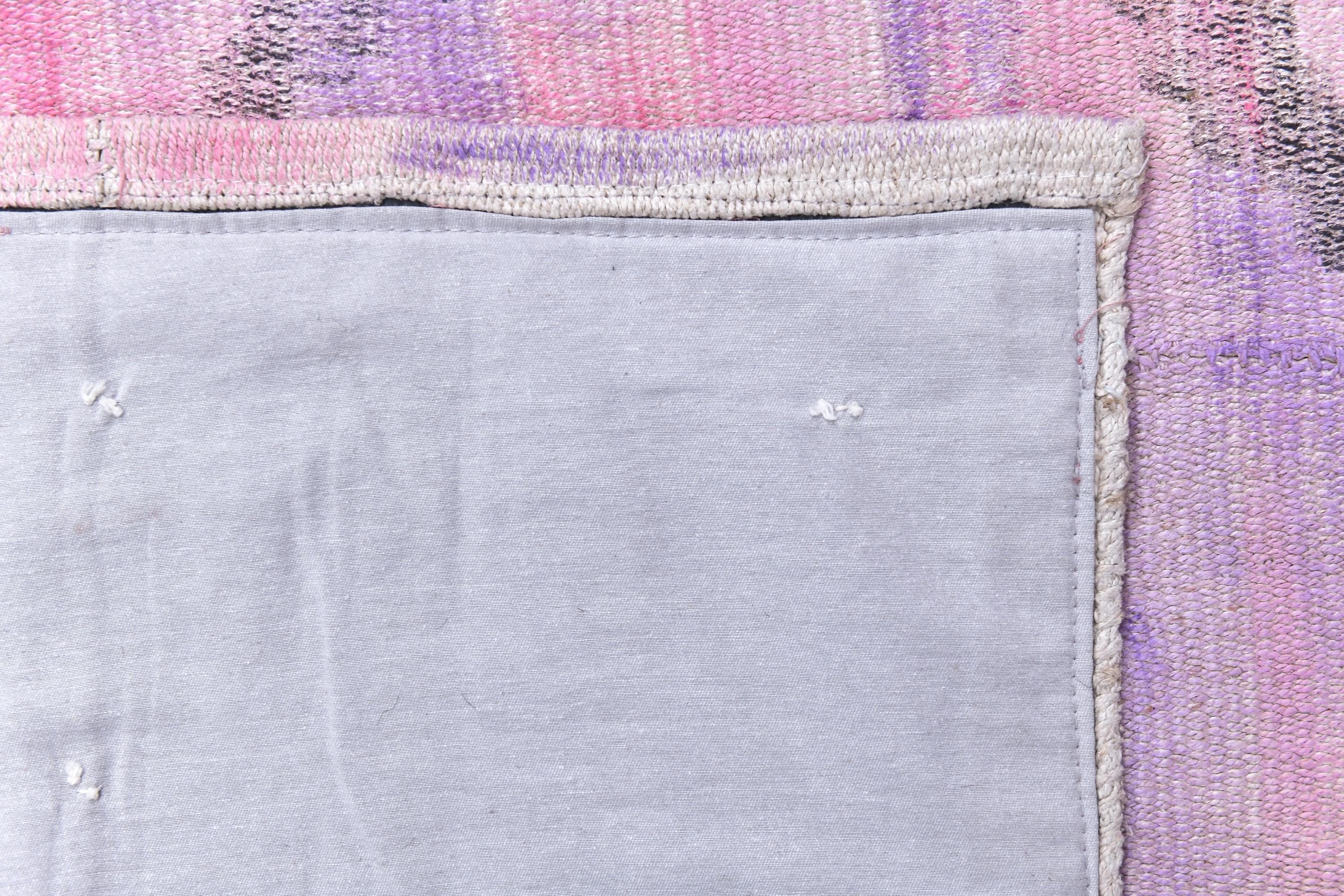 📜📌 Vintage pink purple Turkish hemp kilim runner rug with abstract diamond geometric pattern, handwoven flatweave, bohemian faded pastel tones, 3x9 ft