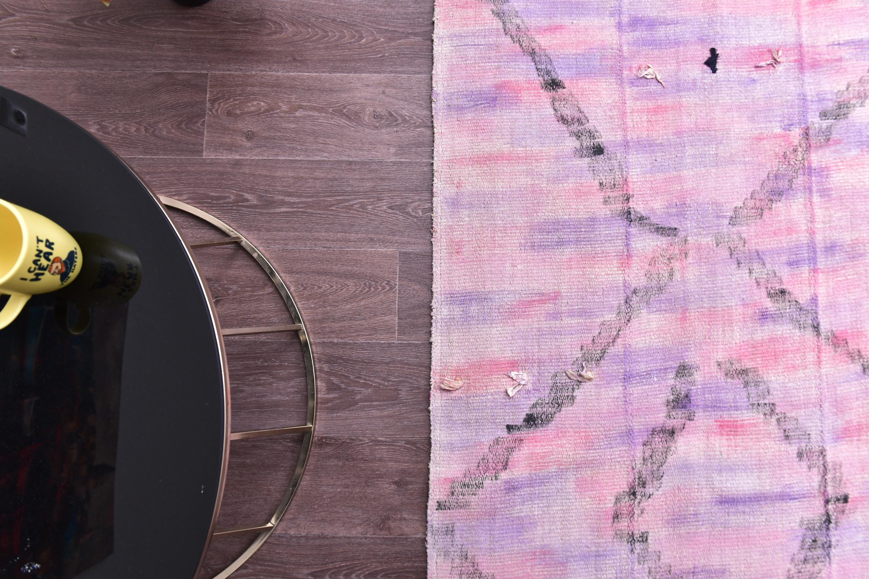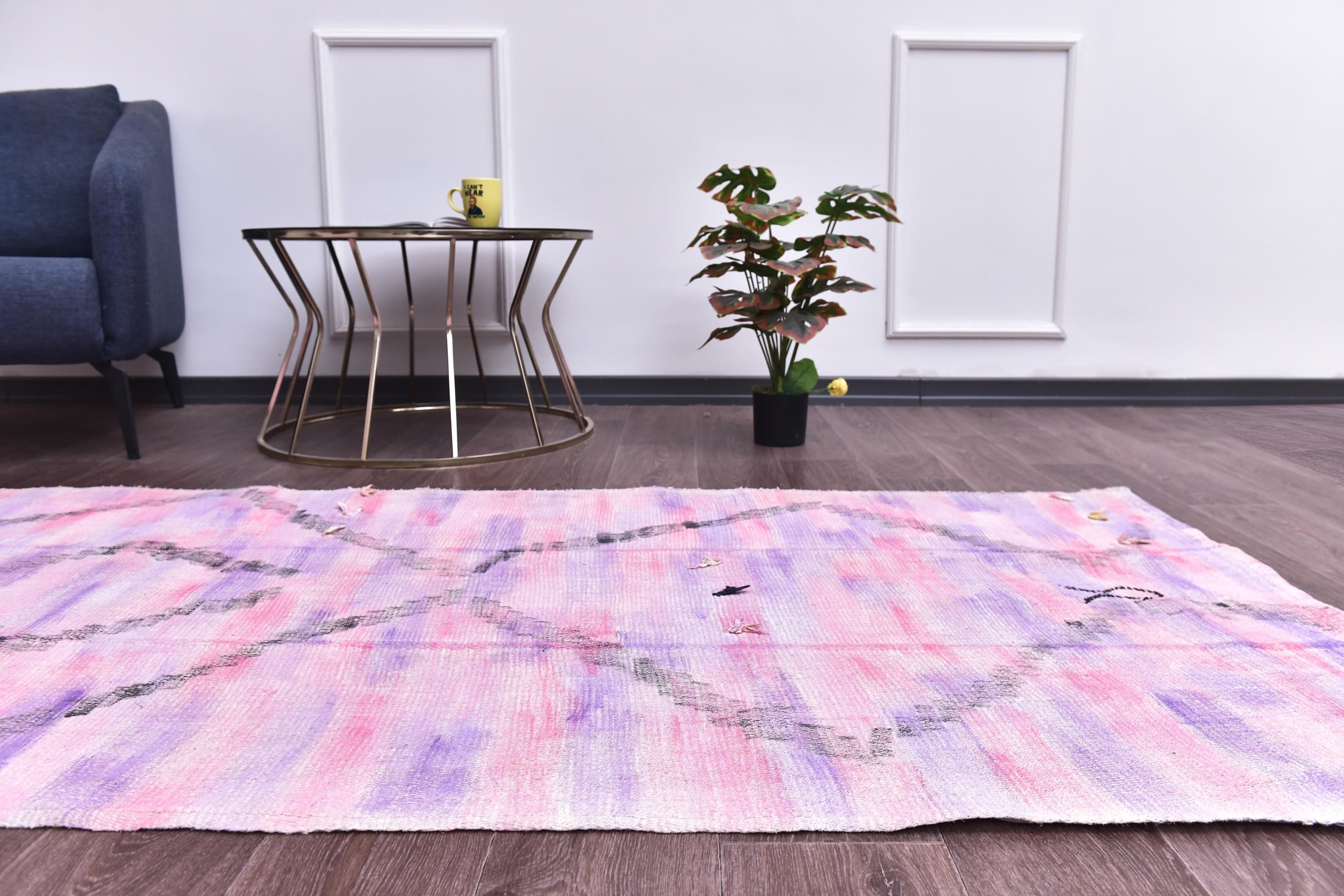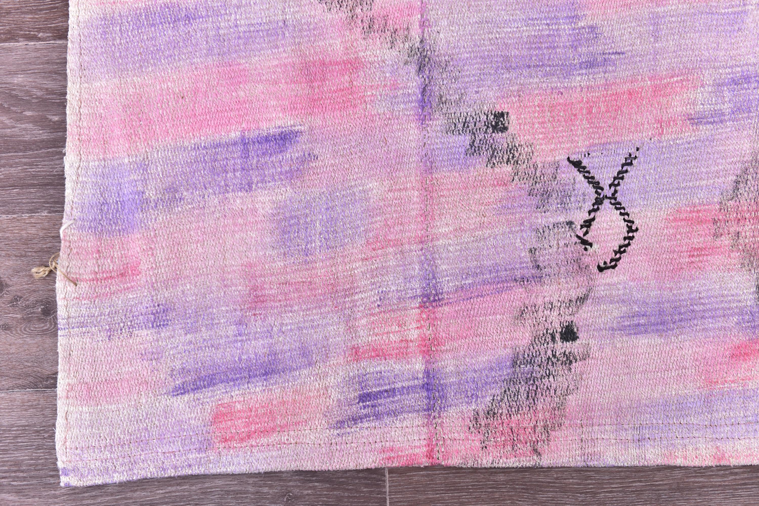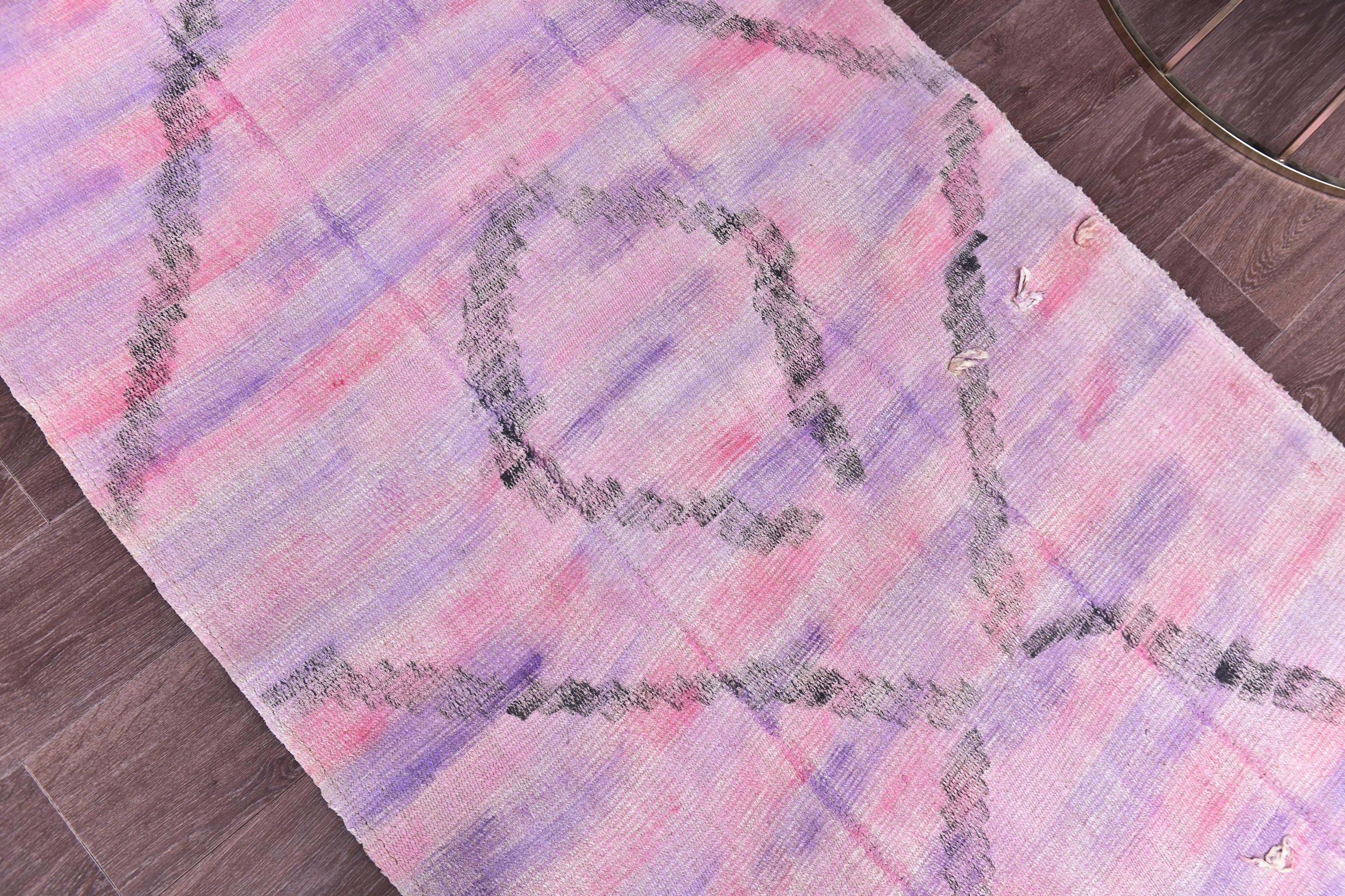 📜📌 Vintage pink purple Turkish hemp kilim runner rug with abstract diamond geometric pattern, handwoven flatweave, bohemian faded pastel tones, 3x9 ft