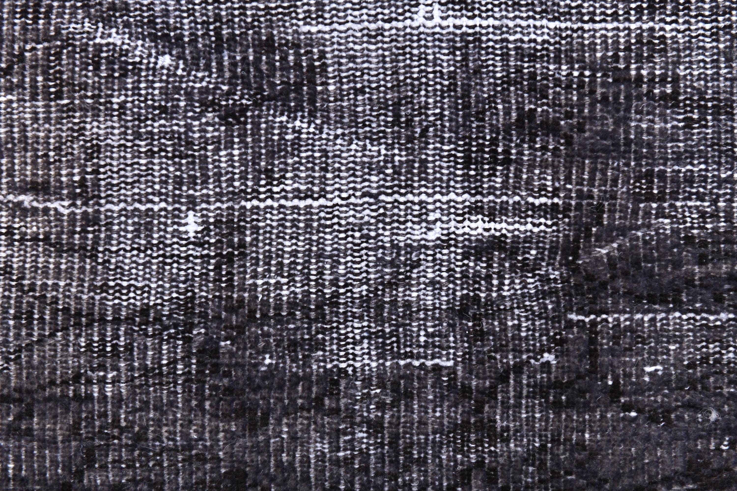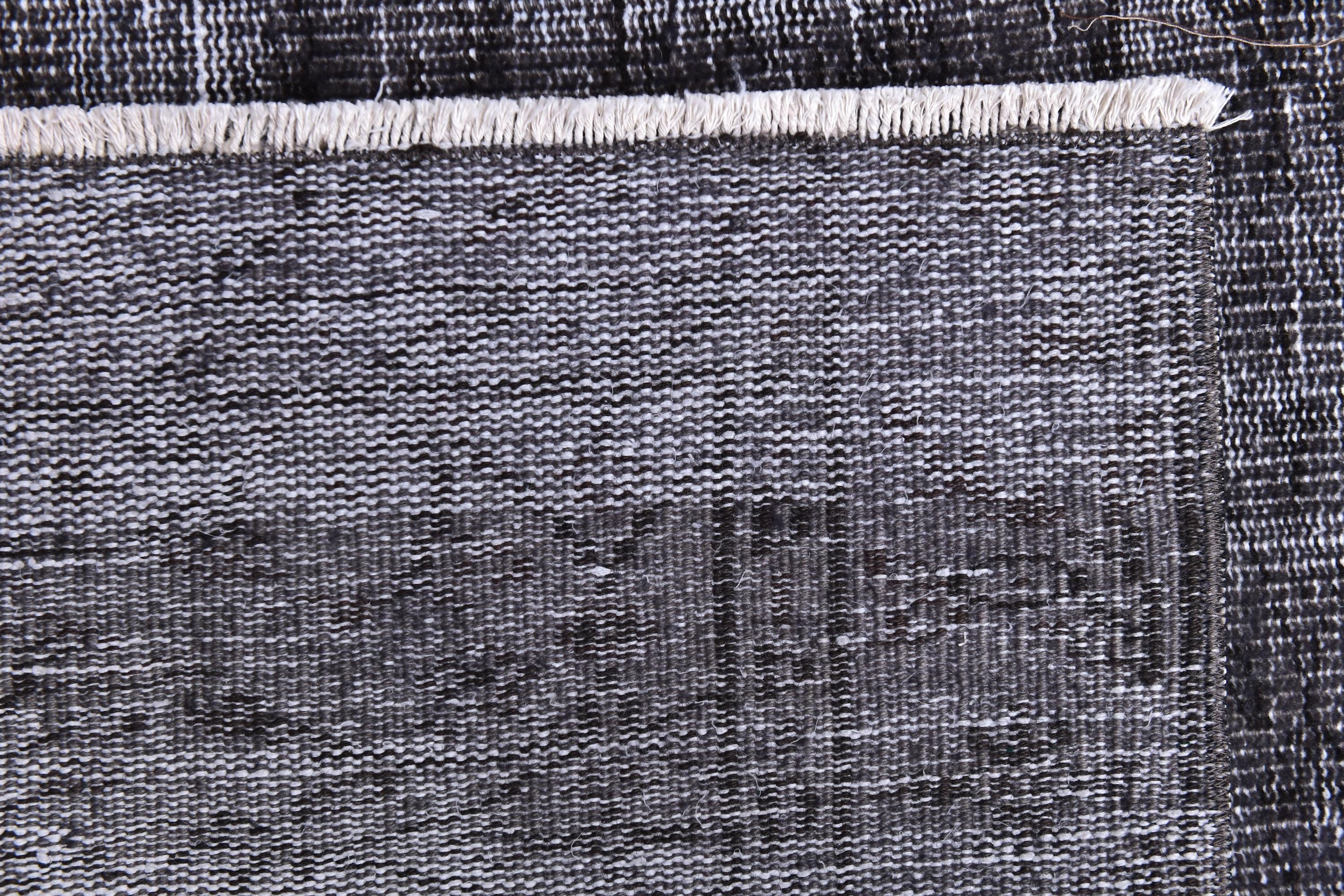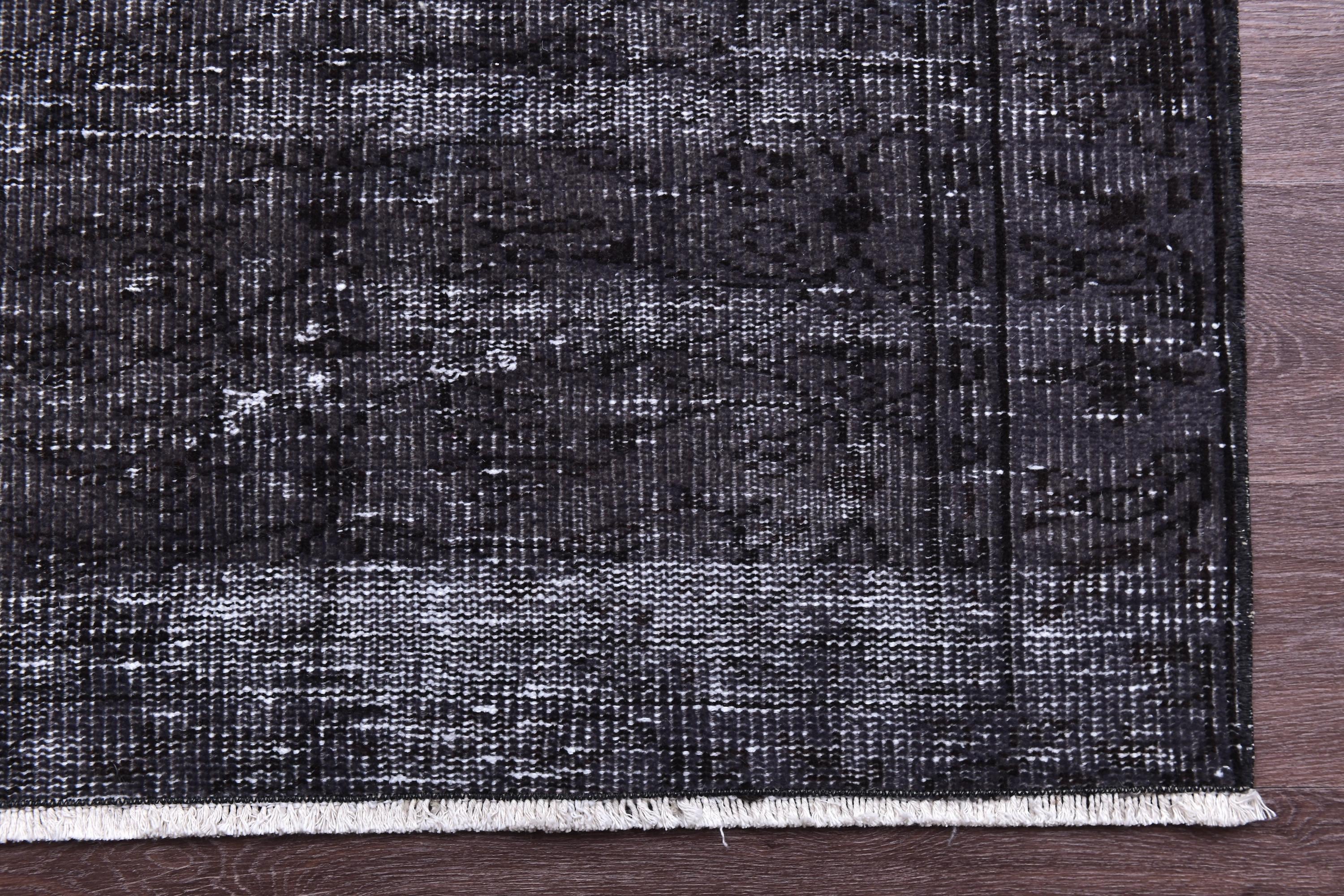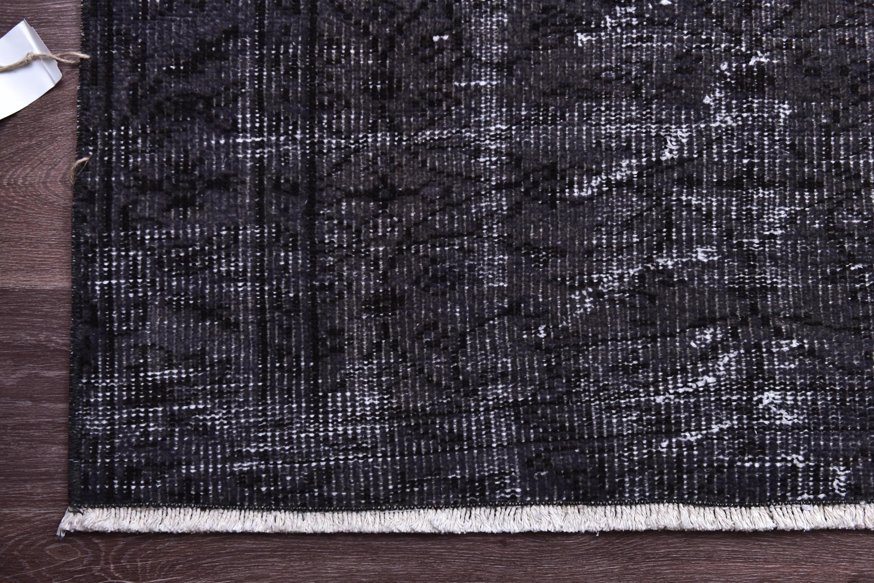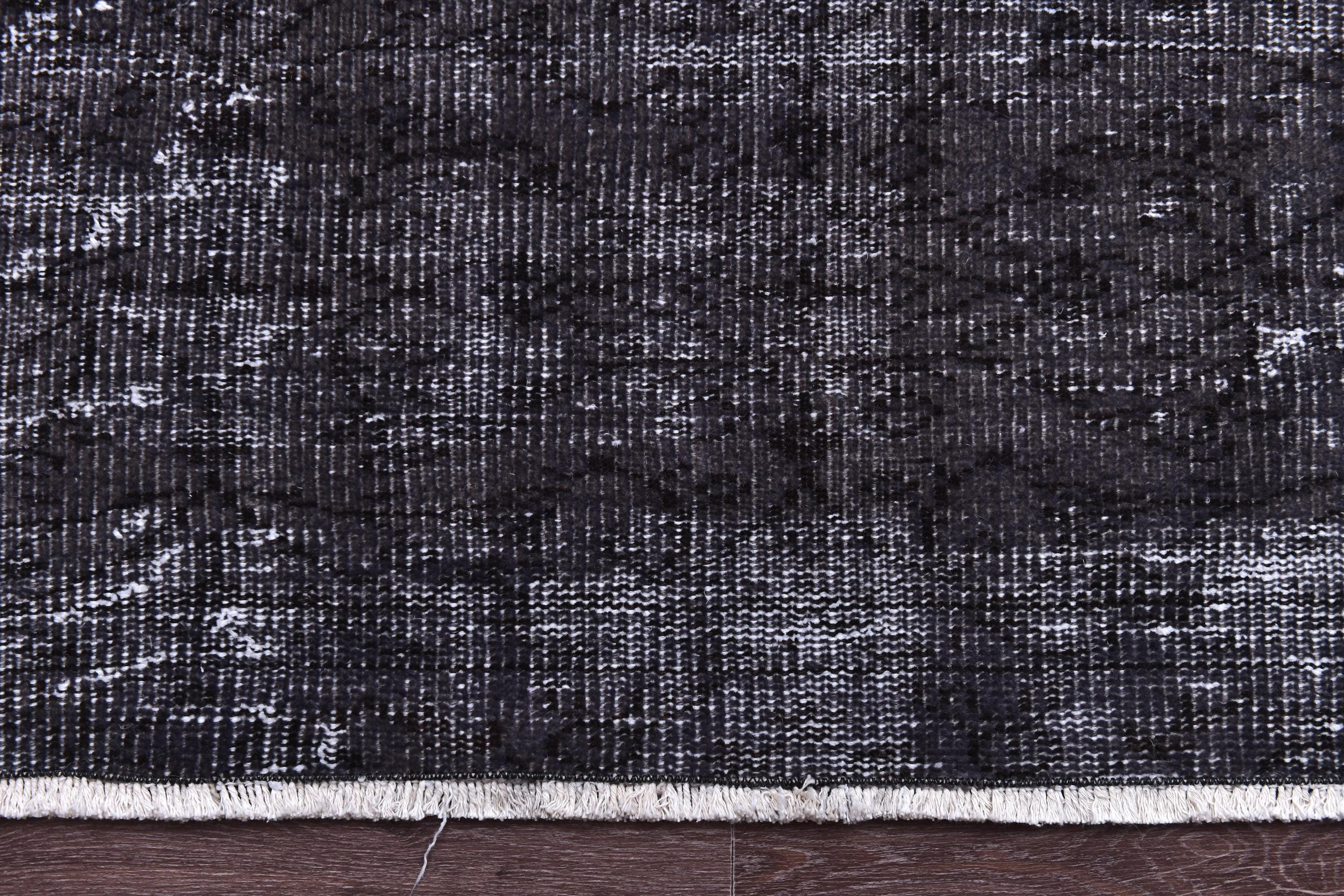 📜📌 A large handmade vintage Turkish overdyed area rug in deep black and charcoal tones with heavily distressed white and gray abrash texture across the surface, white knotted fringe edges, displayed on dark hardwood flooring.