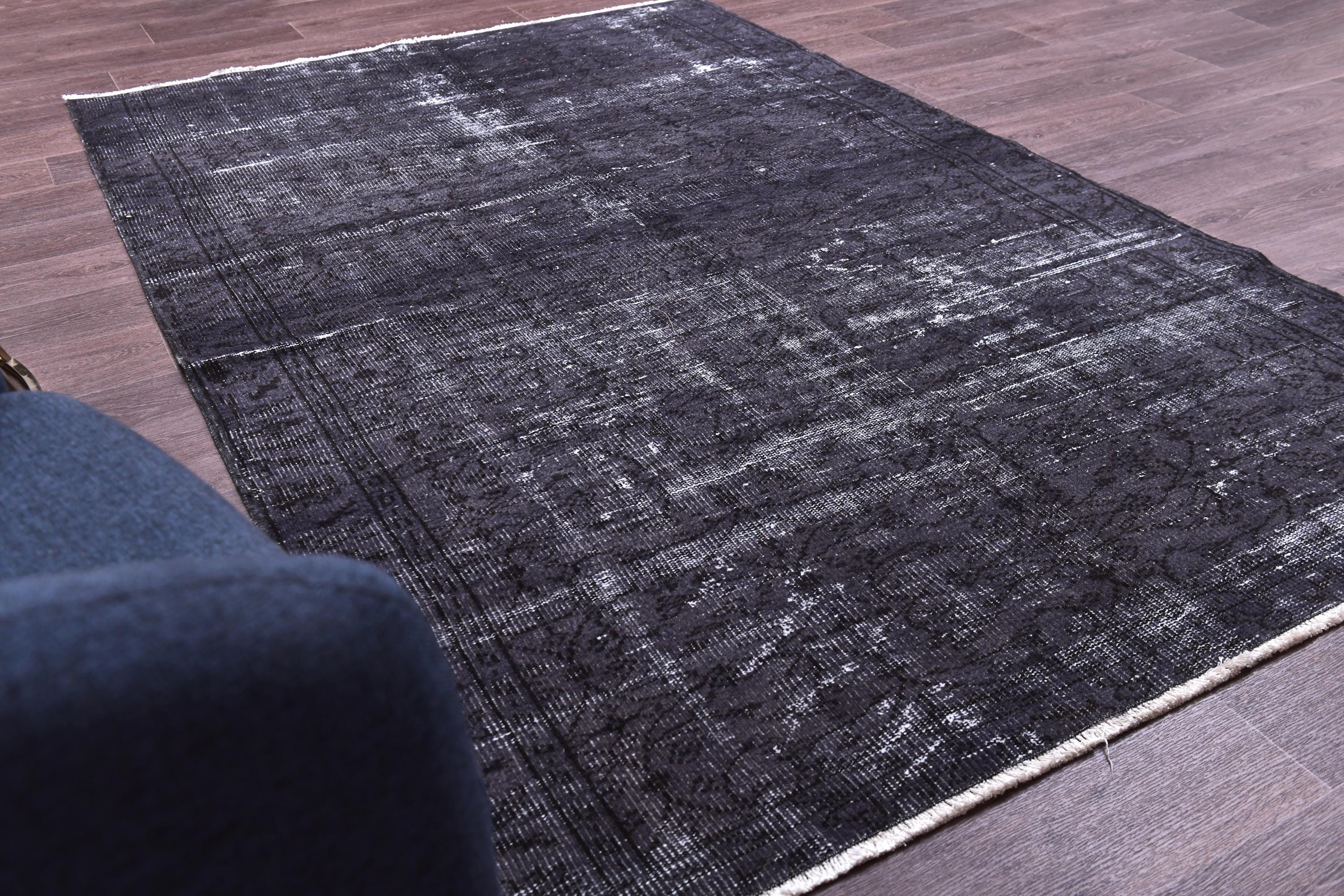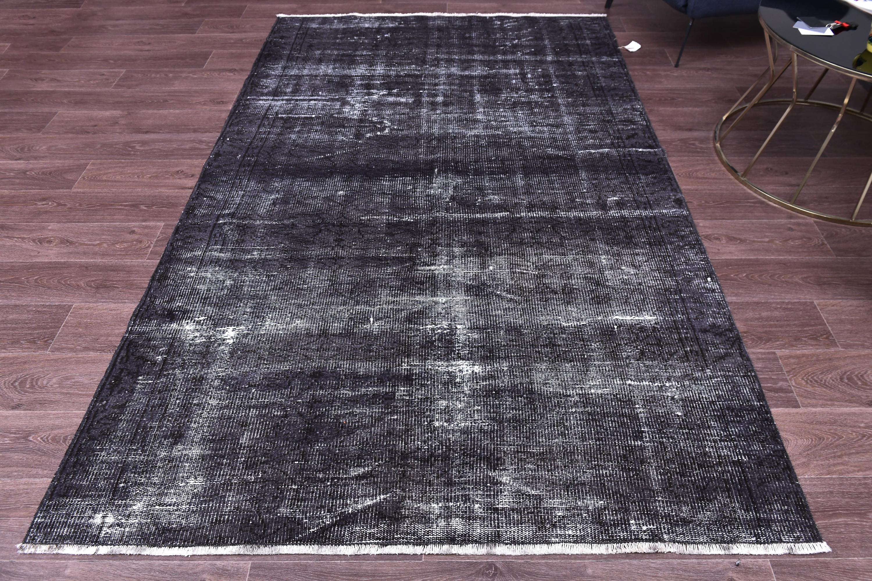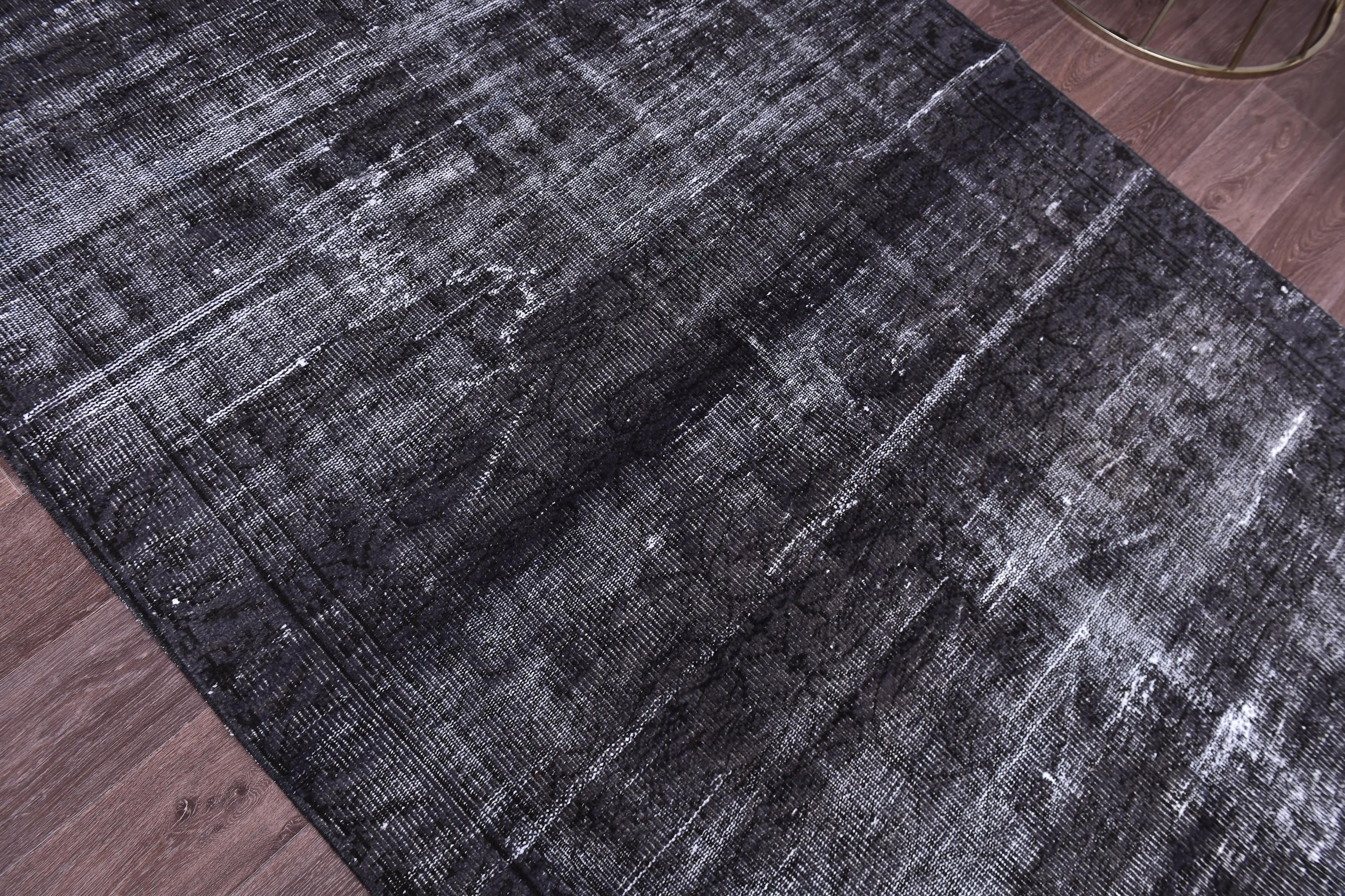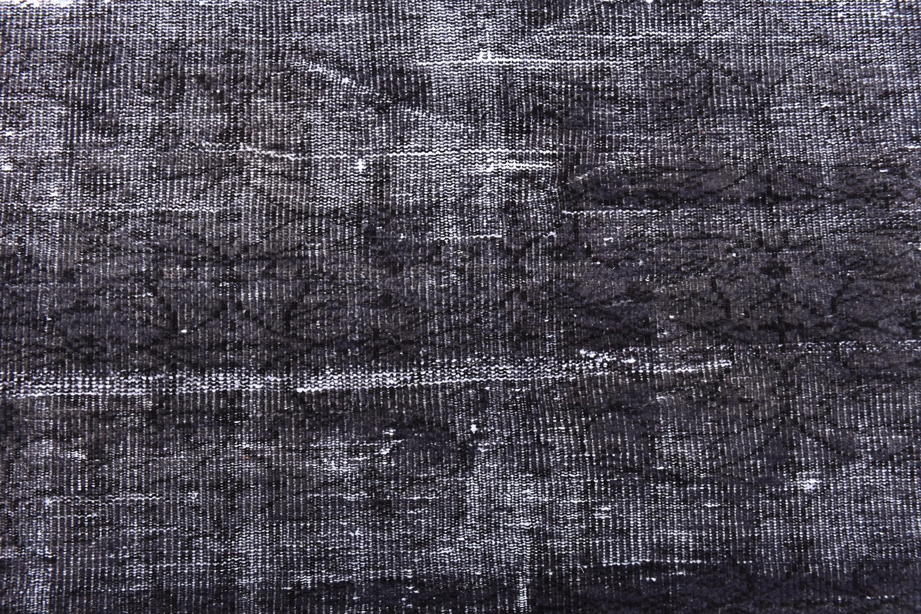 📜📌 A large handmade vintage Turkish overdyed area rug in deep black and charcoal tones with heavily distressed white and gray abrash texture across the surface, white knotted fringe edges, displayed on dark hardwood flooring.