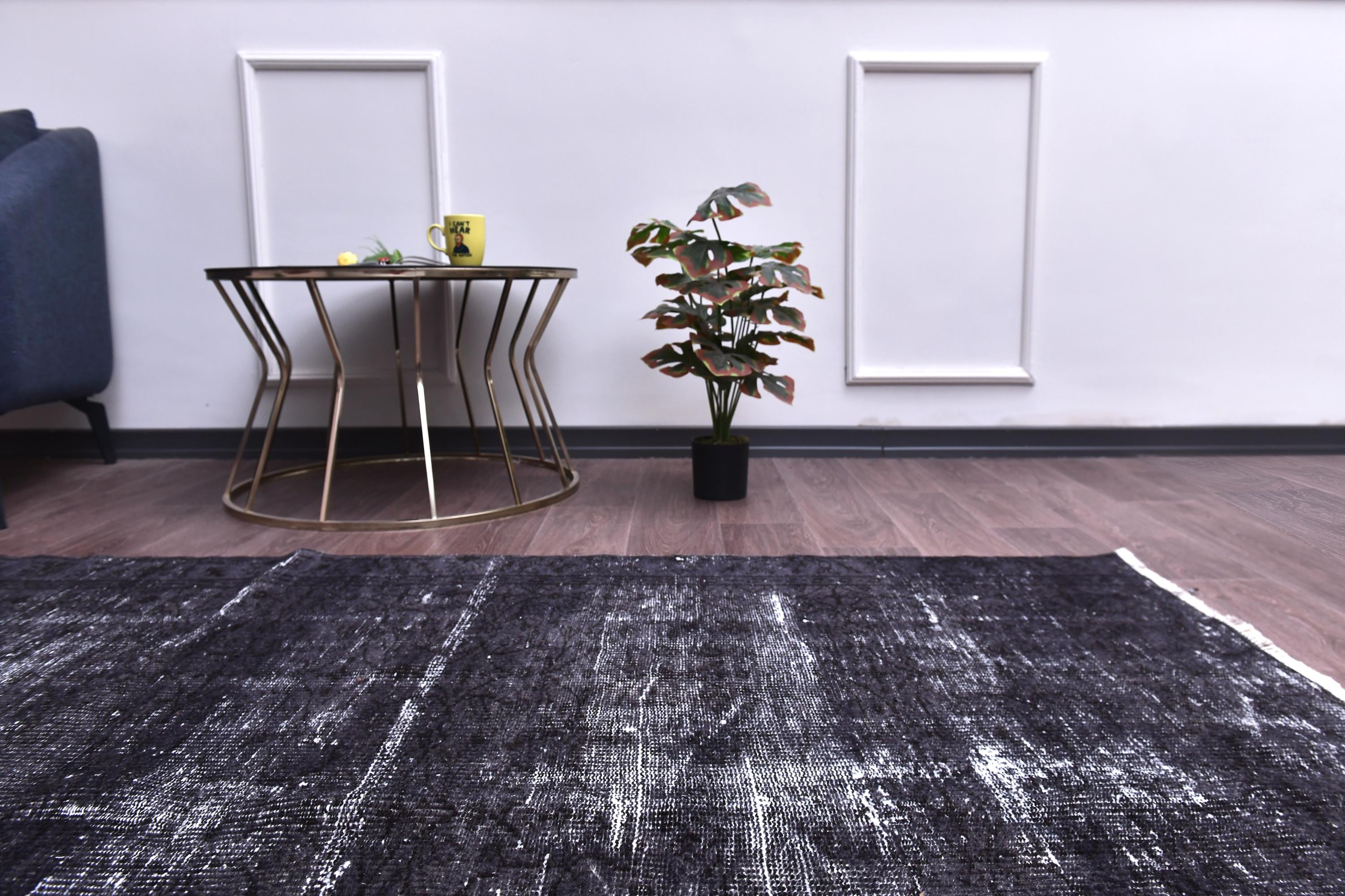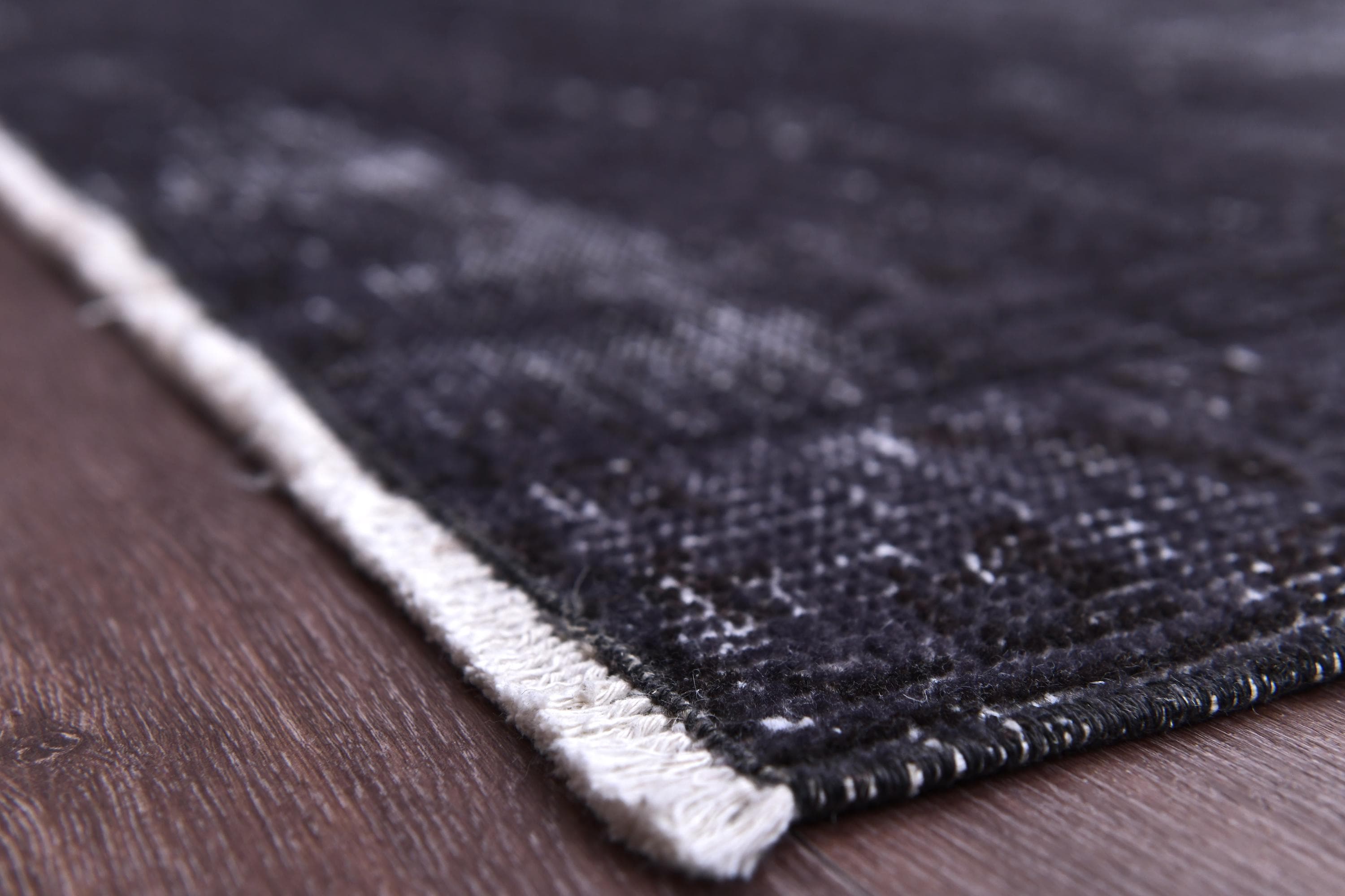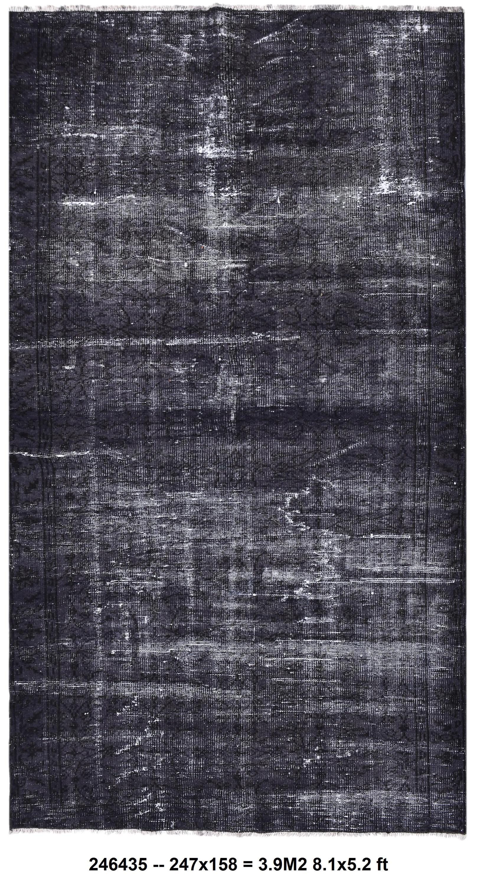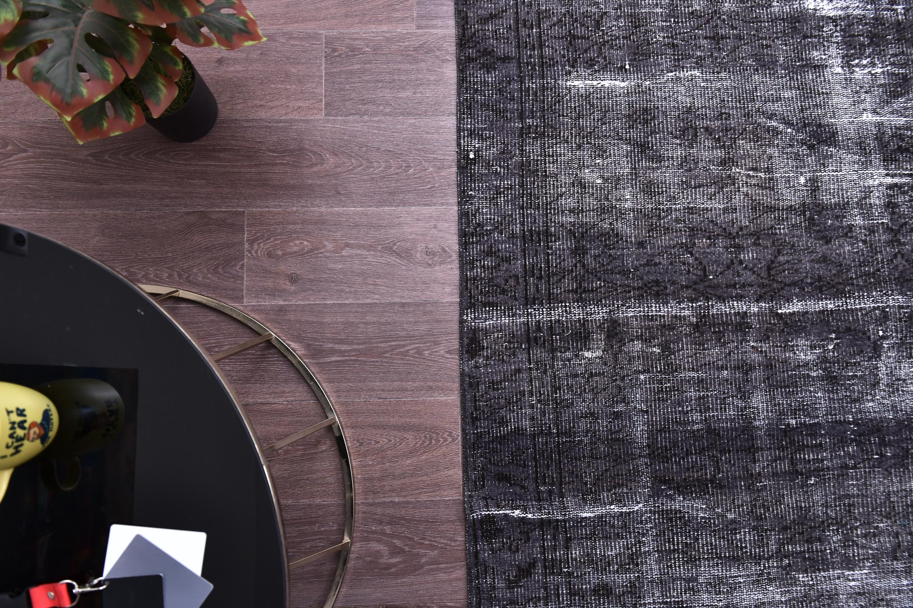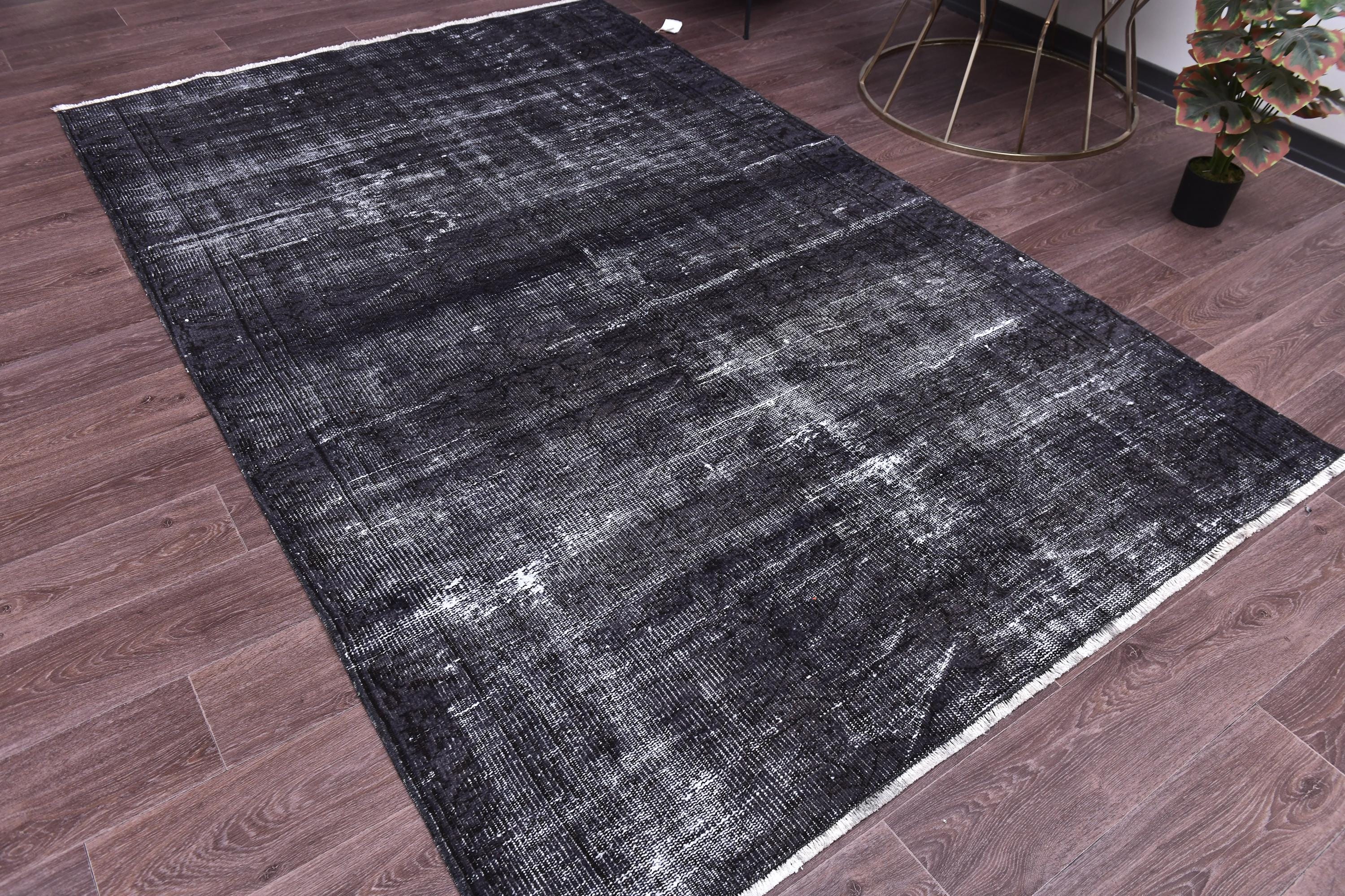 📜📌 A large handmade vintage Turkish overdyed area rug in deep black and charcoal tones with heavily distressed white and gray abrash texture across the surface, white knotted fringe edges, displayed on dark hardwood flooring.