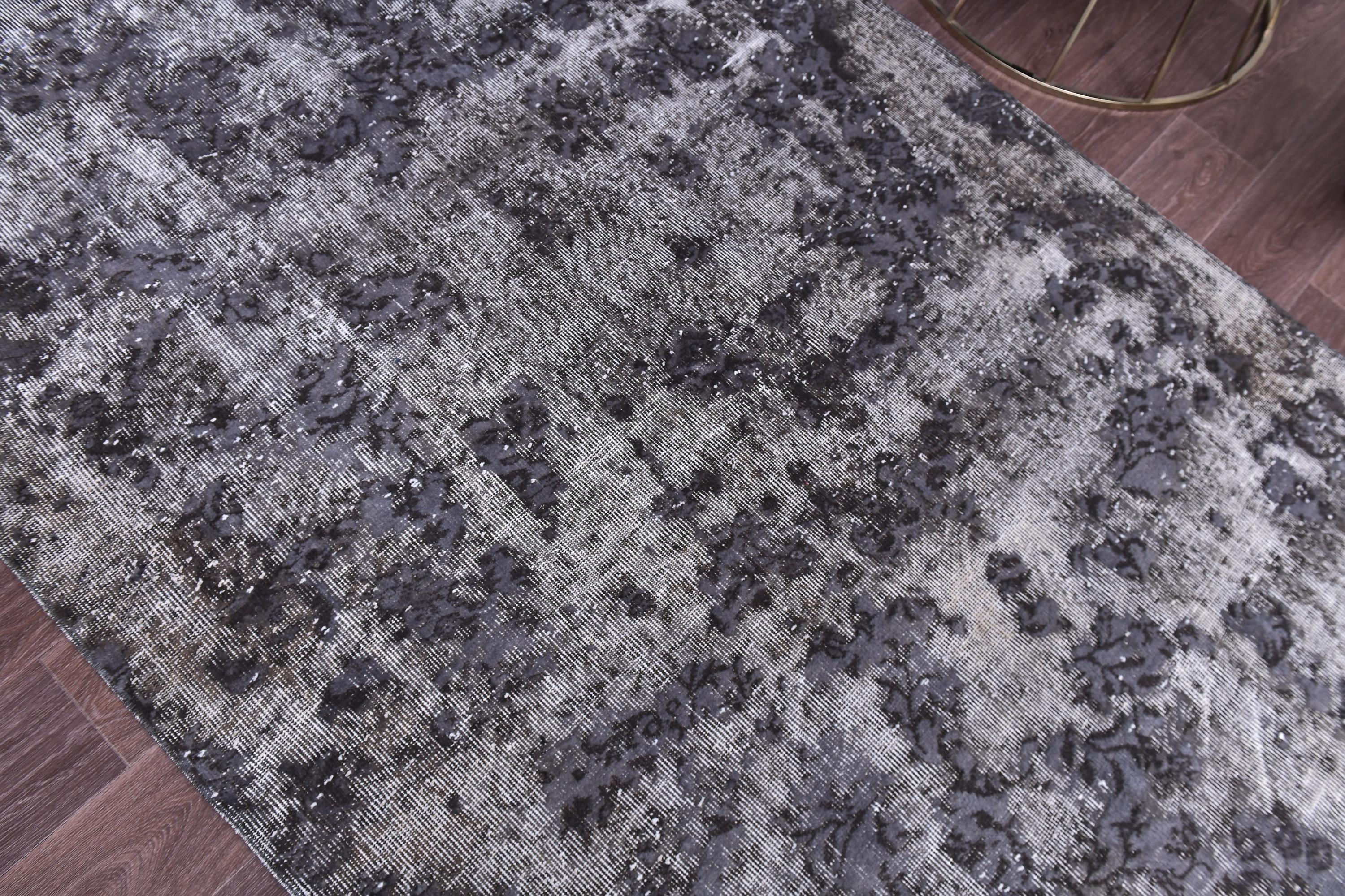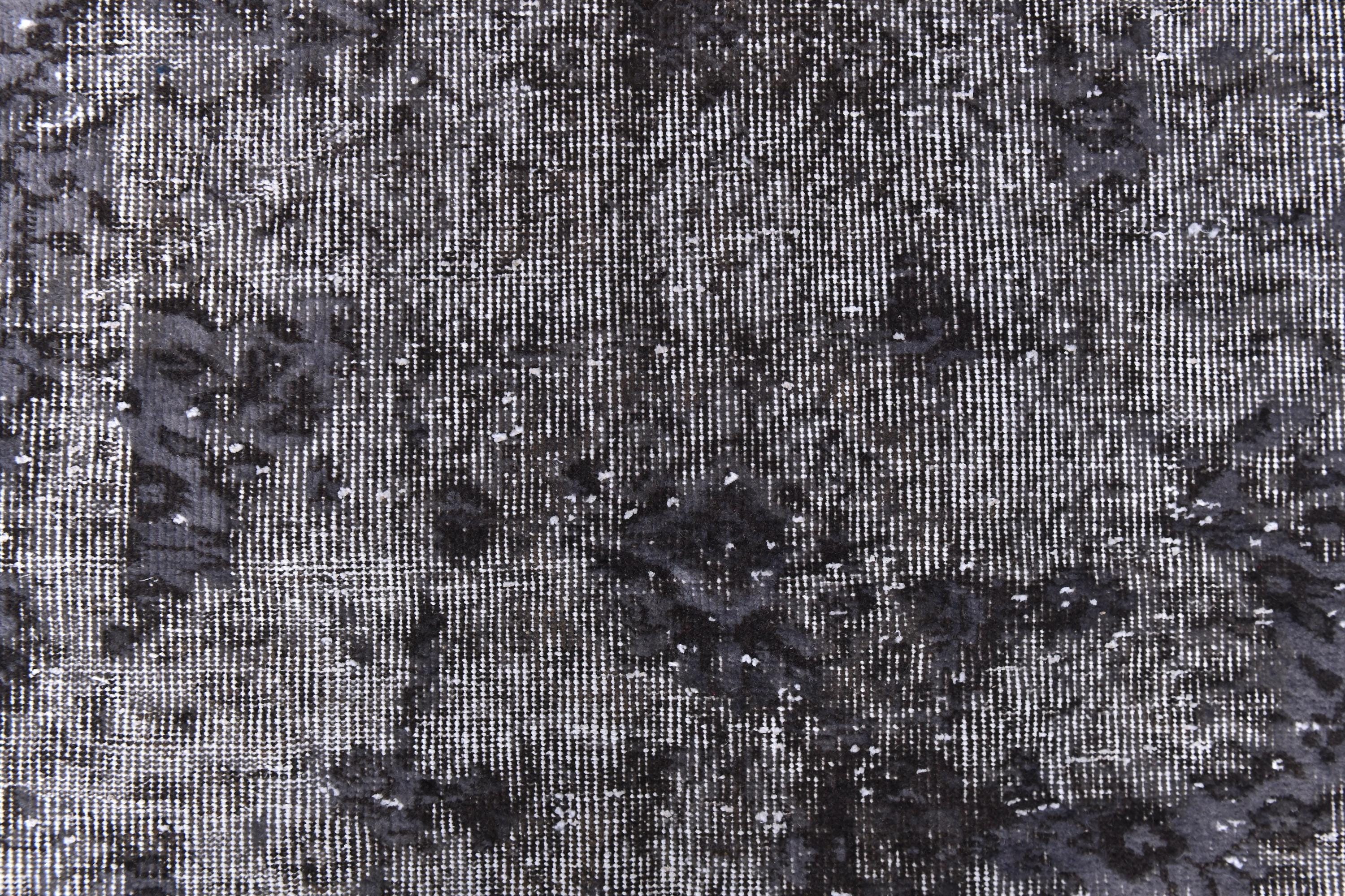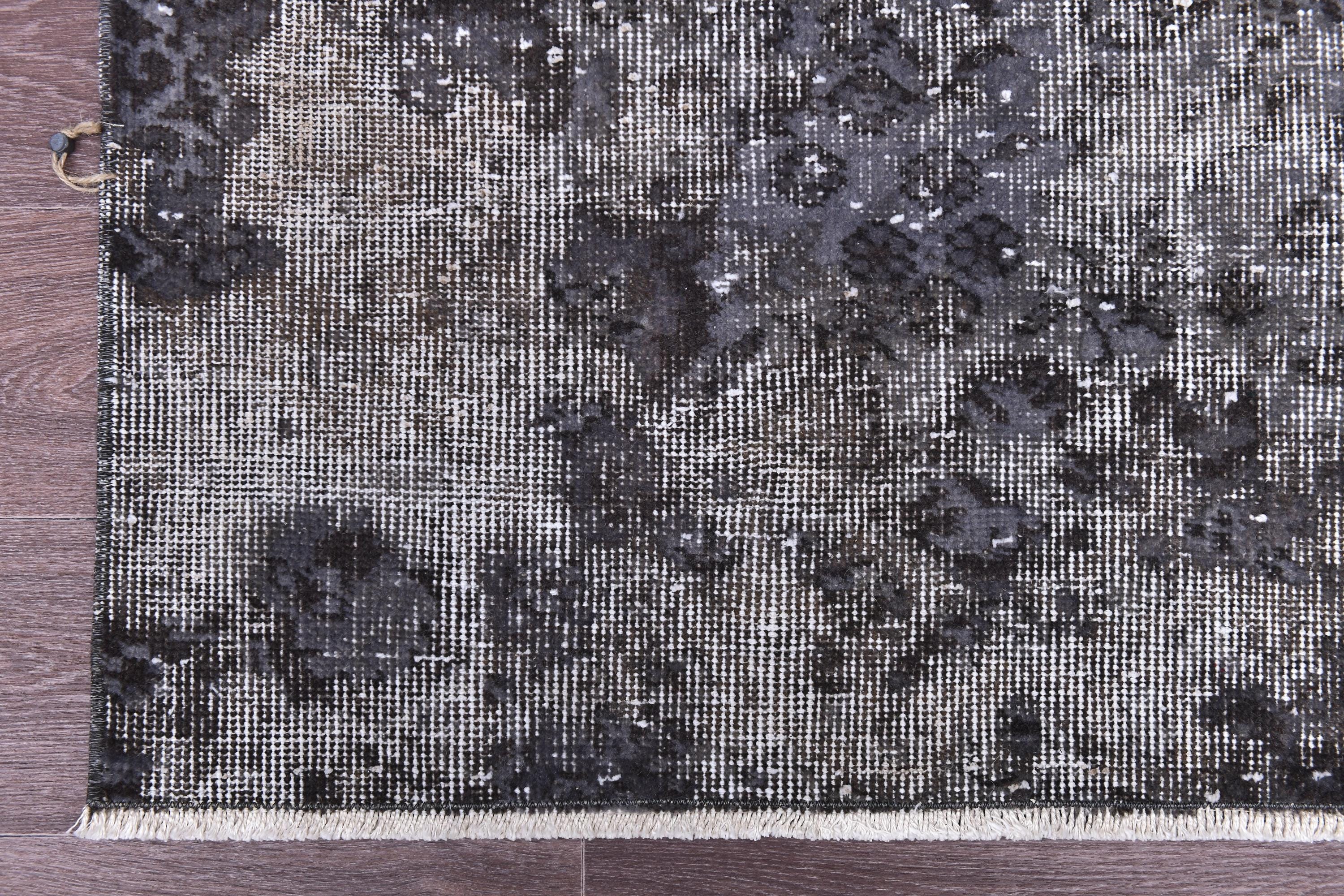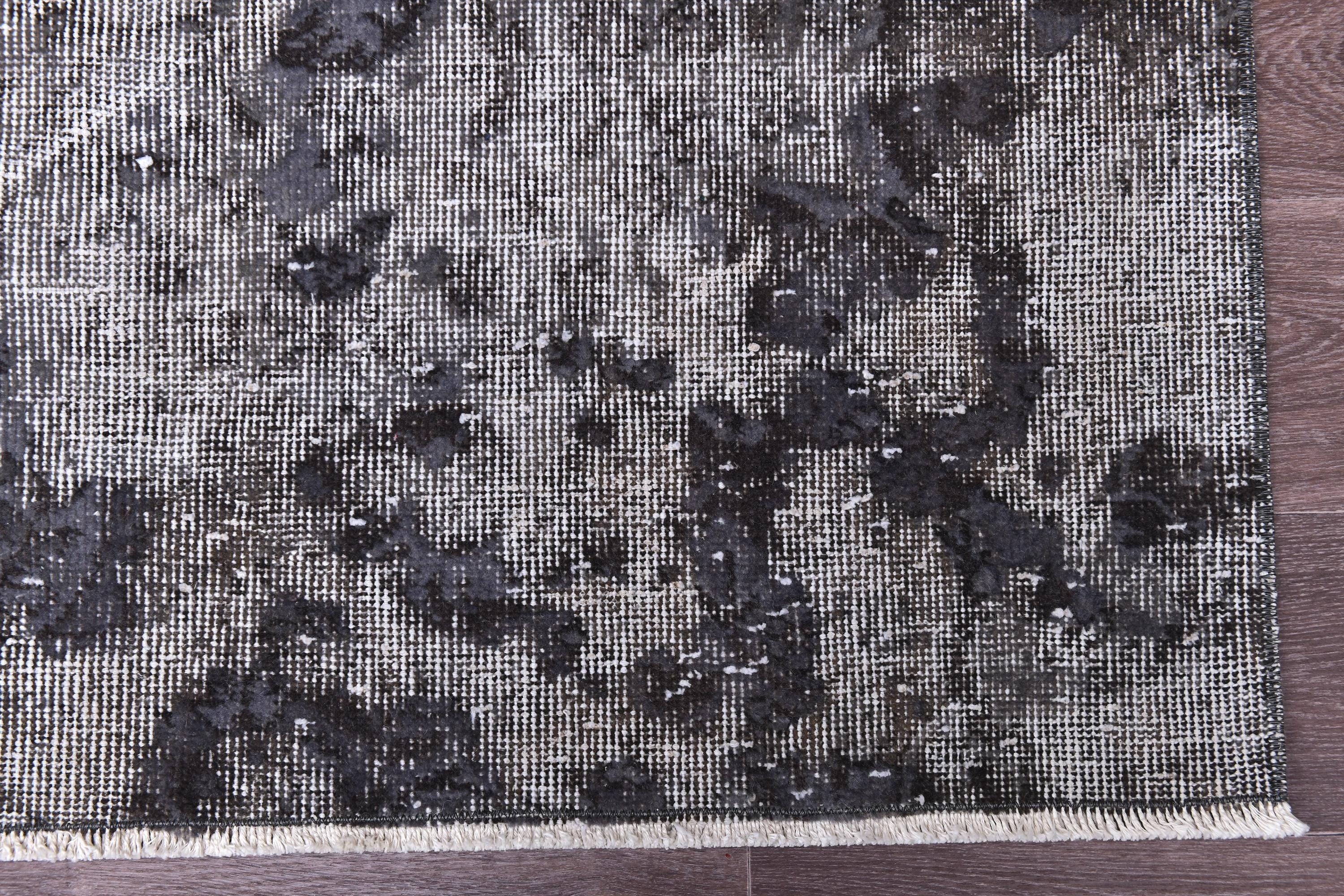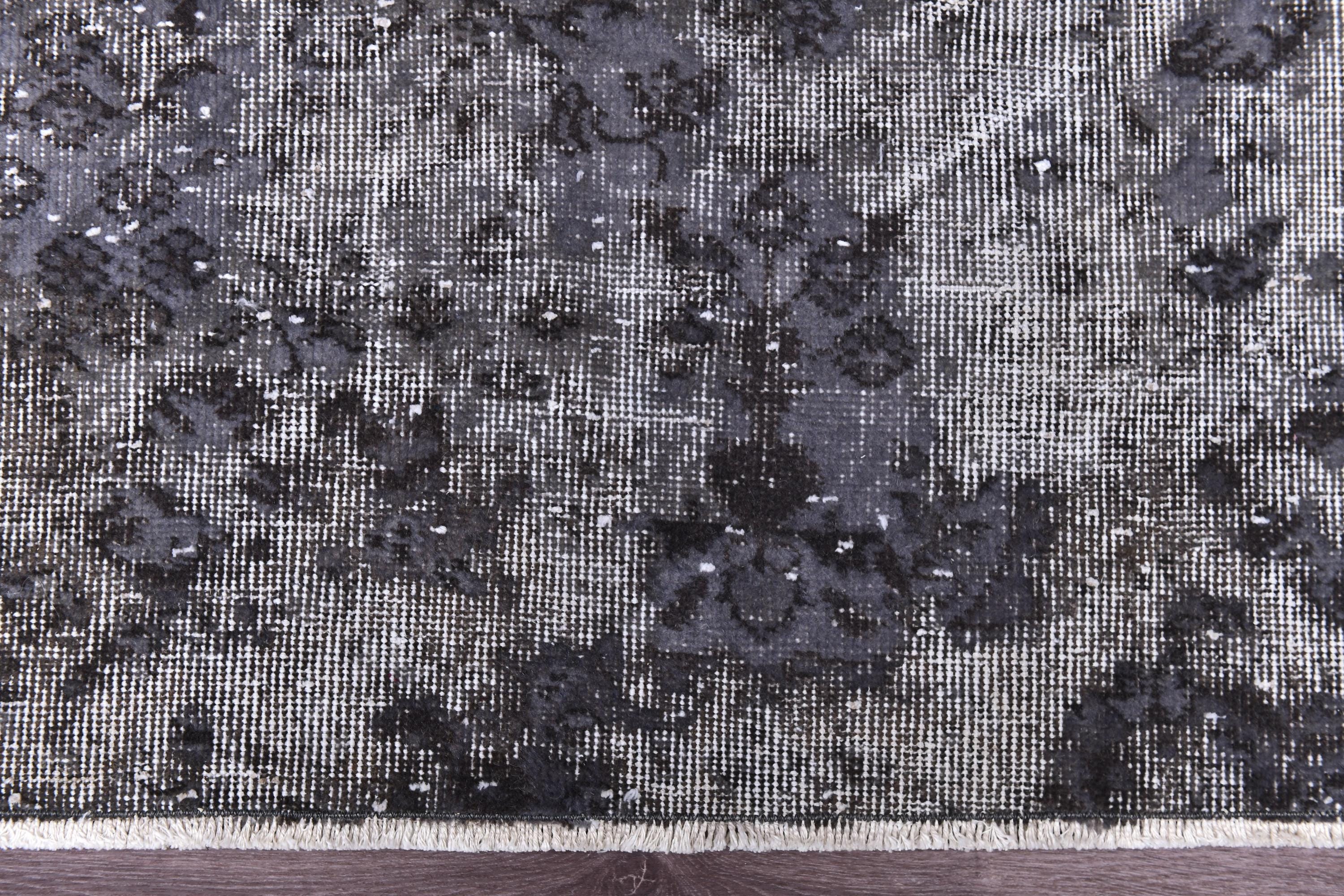 📜📌 handmade vintage Turkish overdyed area rug in purple charcoal gray and black tones featuring an all-over distressed floral botanical pattern with faded white abrash highlights and cream knotted fringe, on dark hardwood flooring.