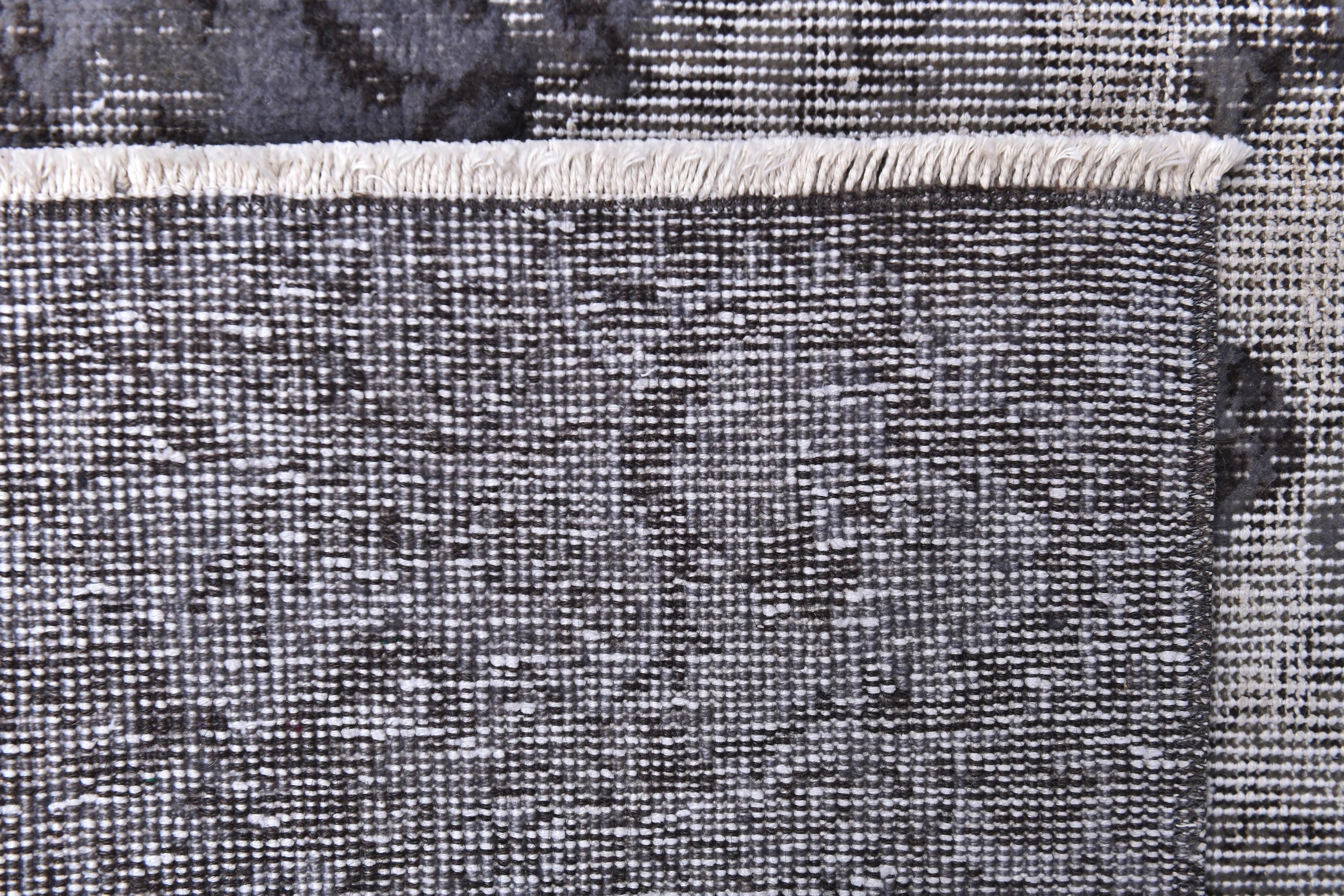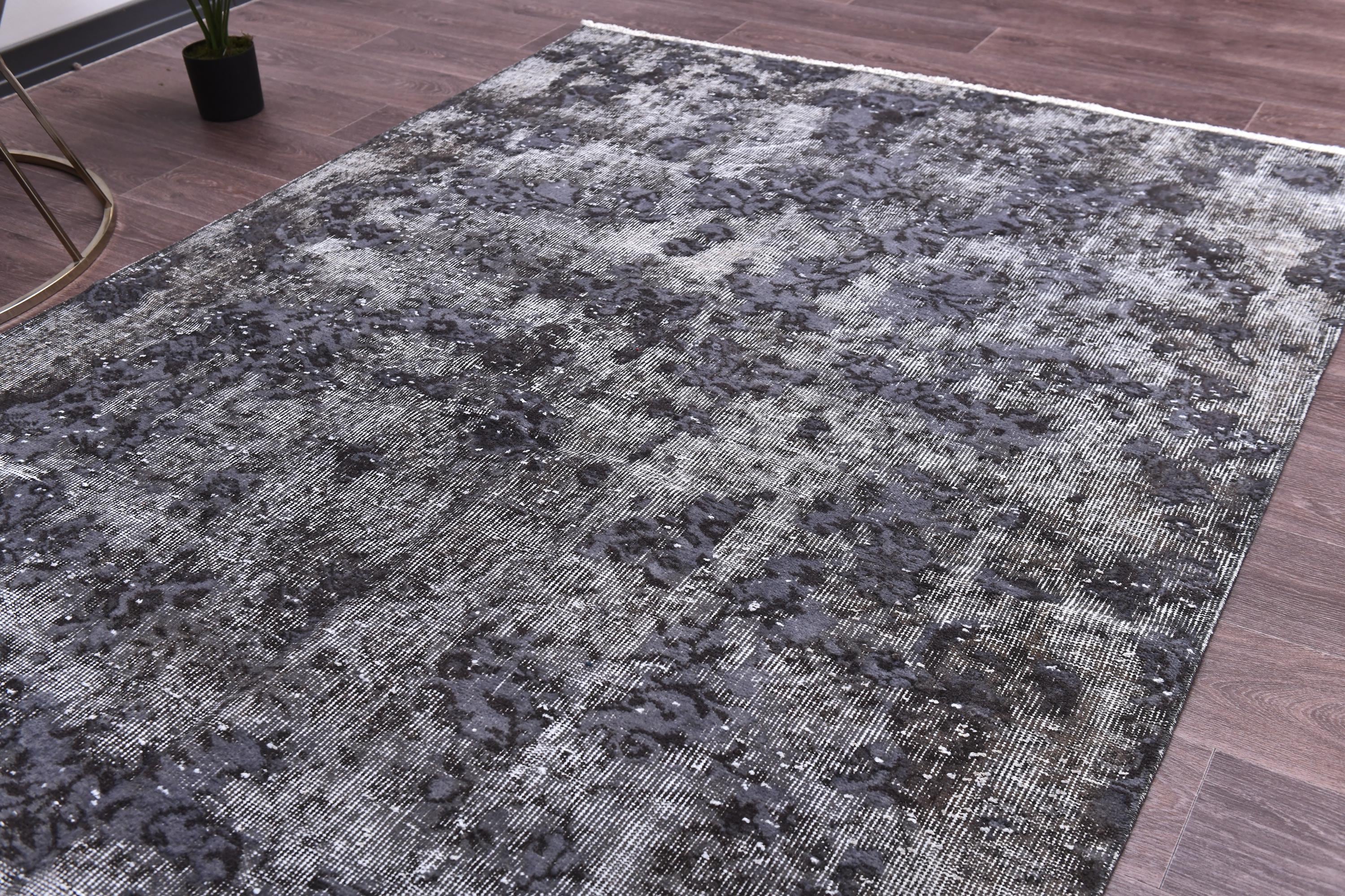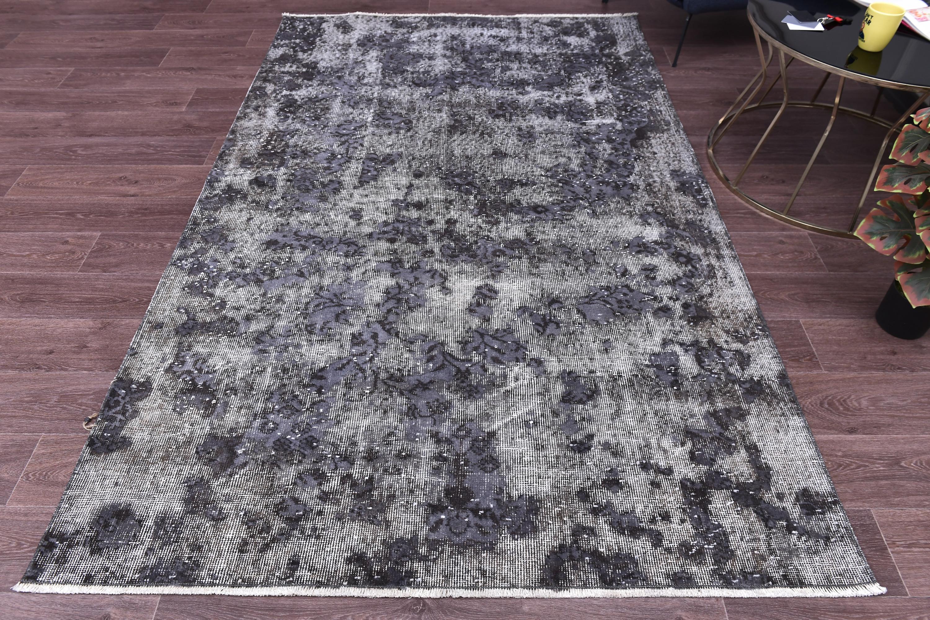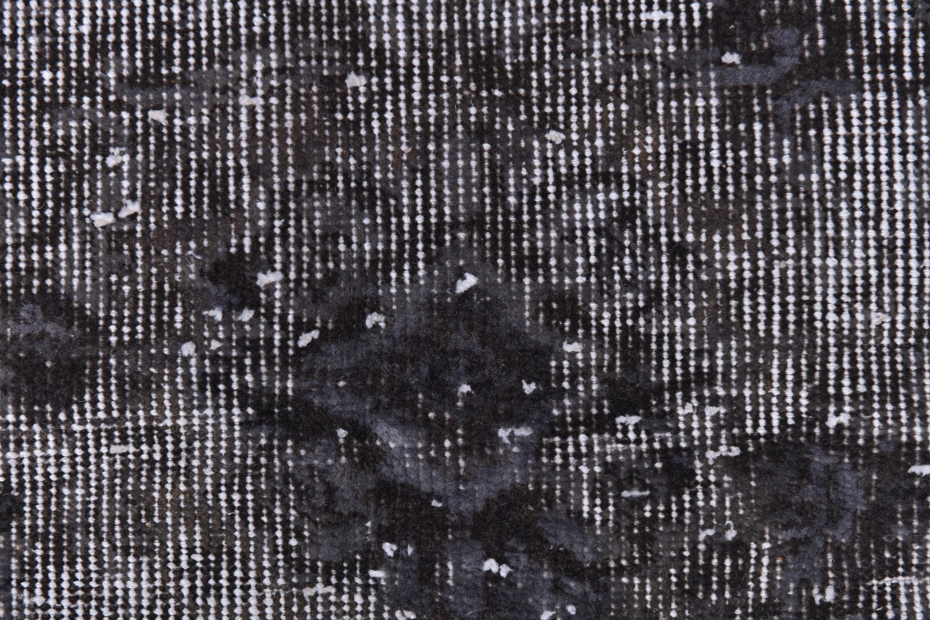 📜📌 handmade vintage Turkish overdyed area rug in purple charcoal gray and black tones featuring an all-over distressed floral botanical pattern with faded white abrash highlights and cream knotted fringe, on dark hardwood flooring.