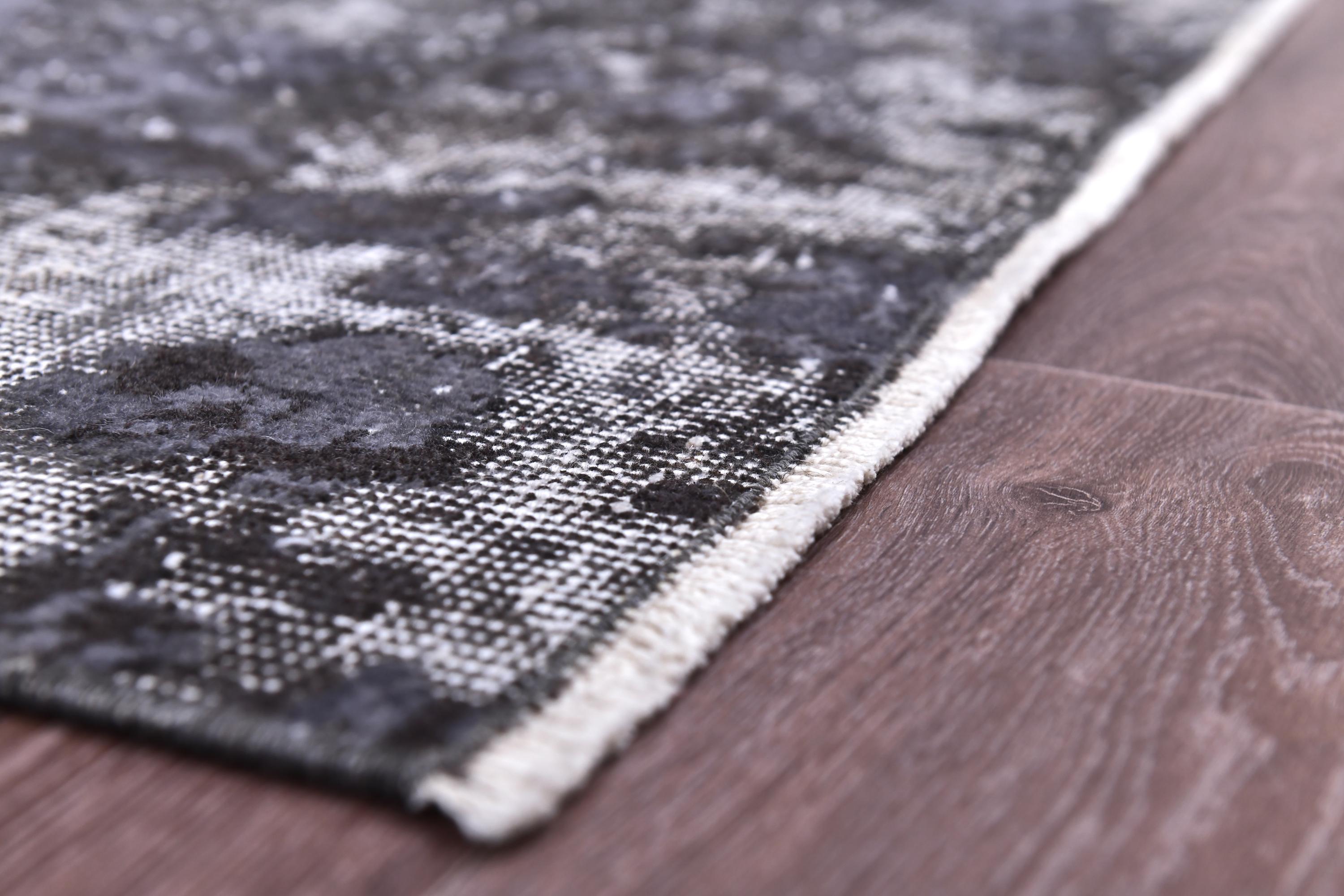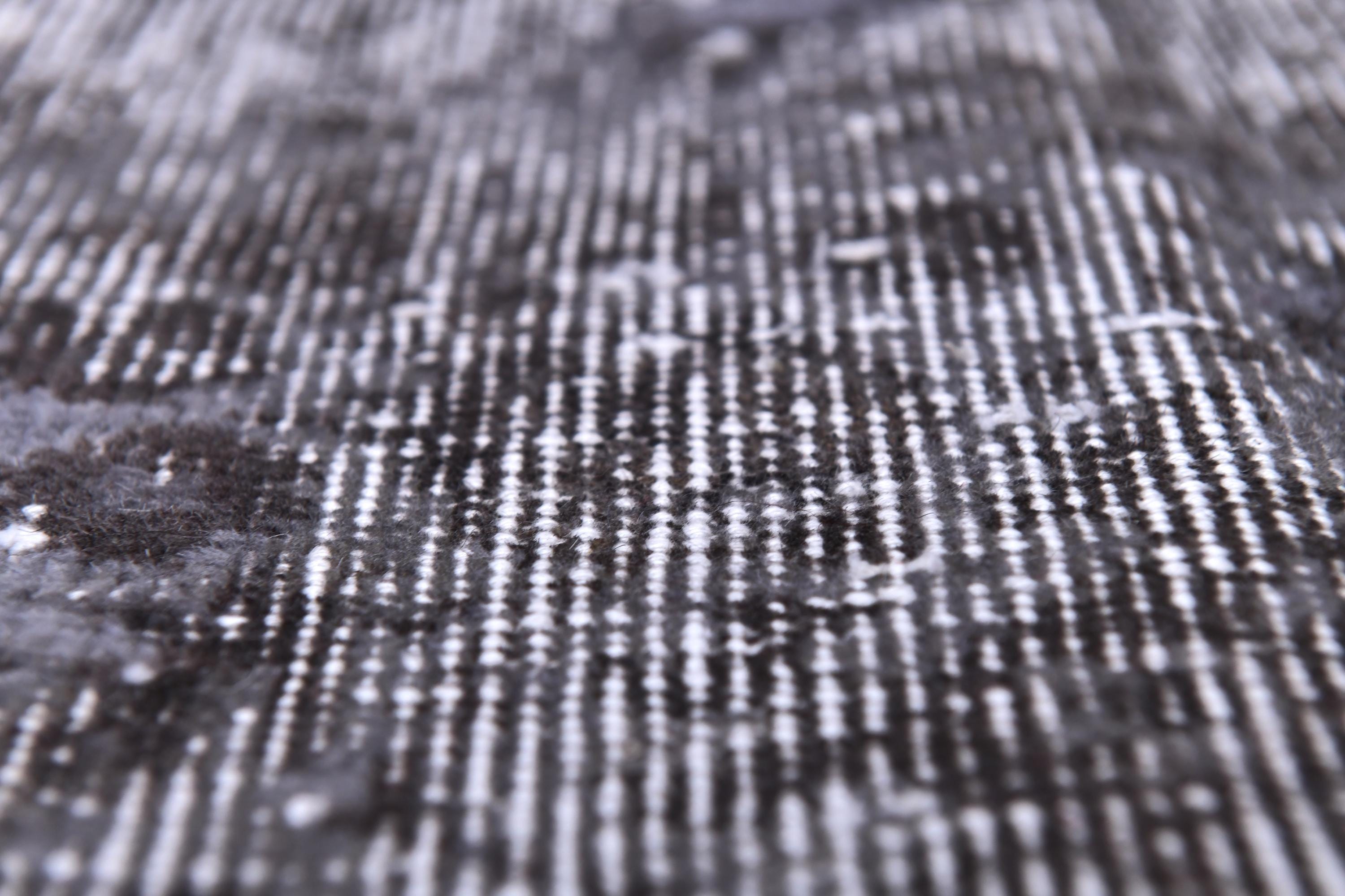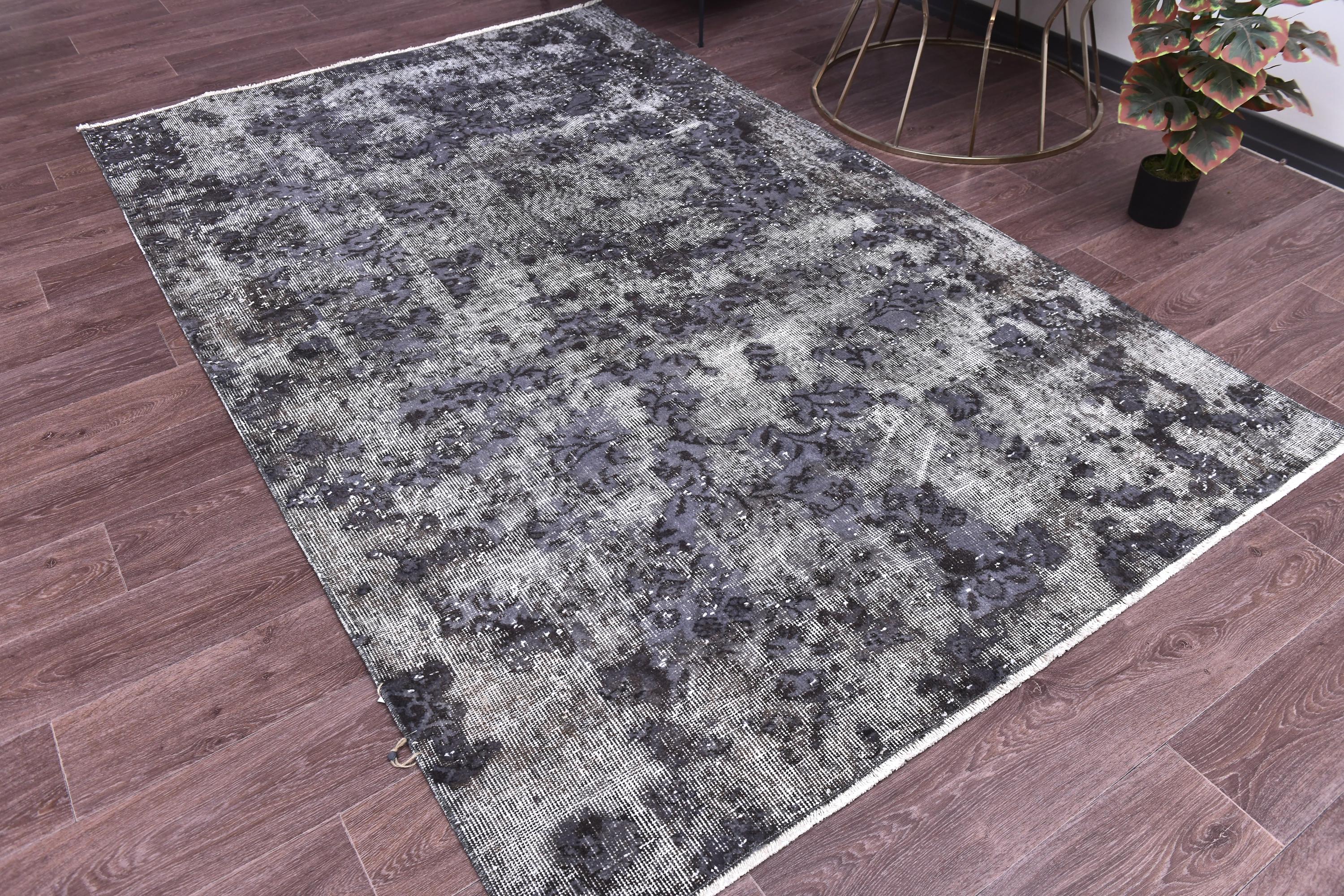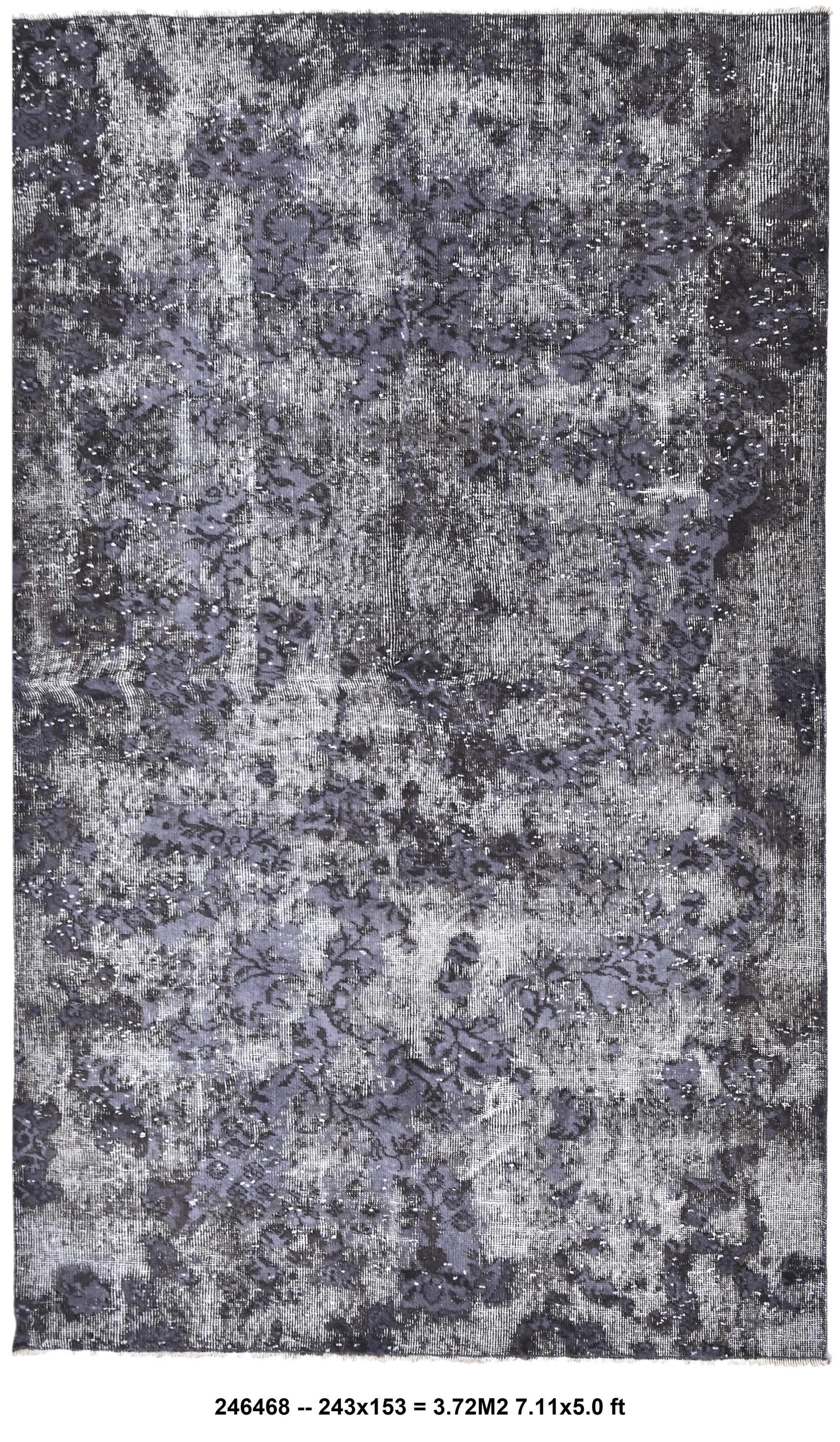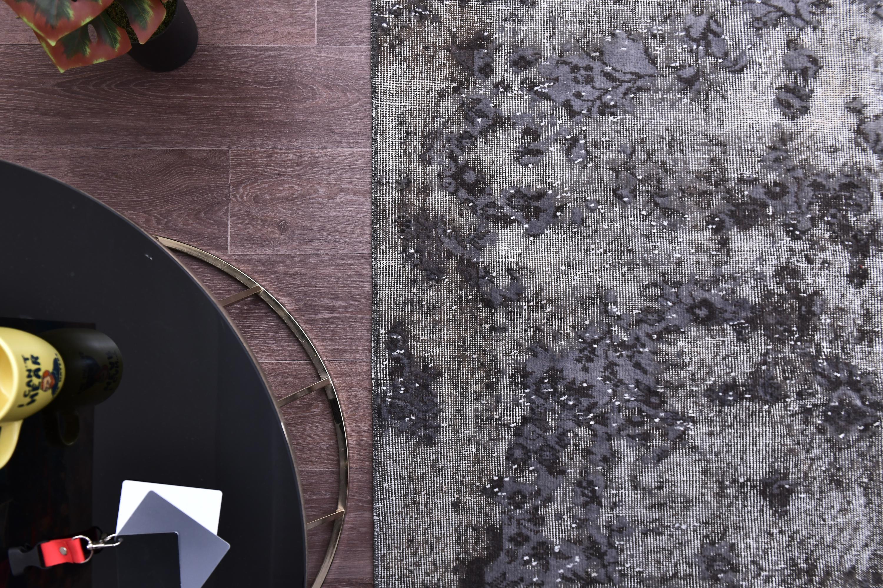 📜📌 handmade vintage Turkish overdyed area rug in purple charcoal gray and black tones featuring an all-over distressed floral botanical pattern with faded white abrash highlights and cream knotted fringe, on dark hardwood flooring.