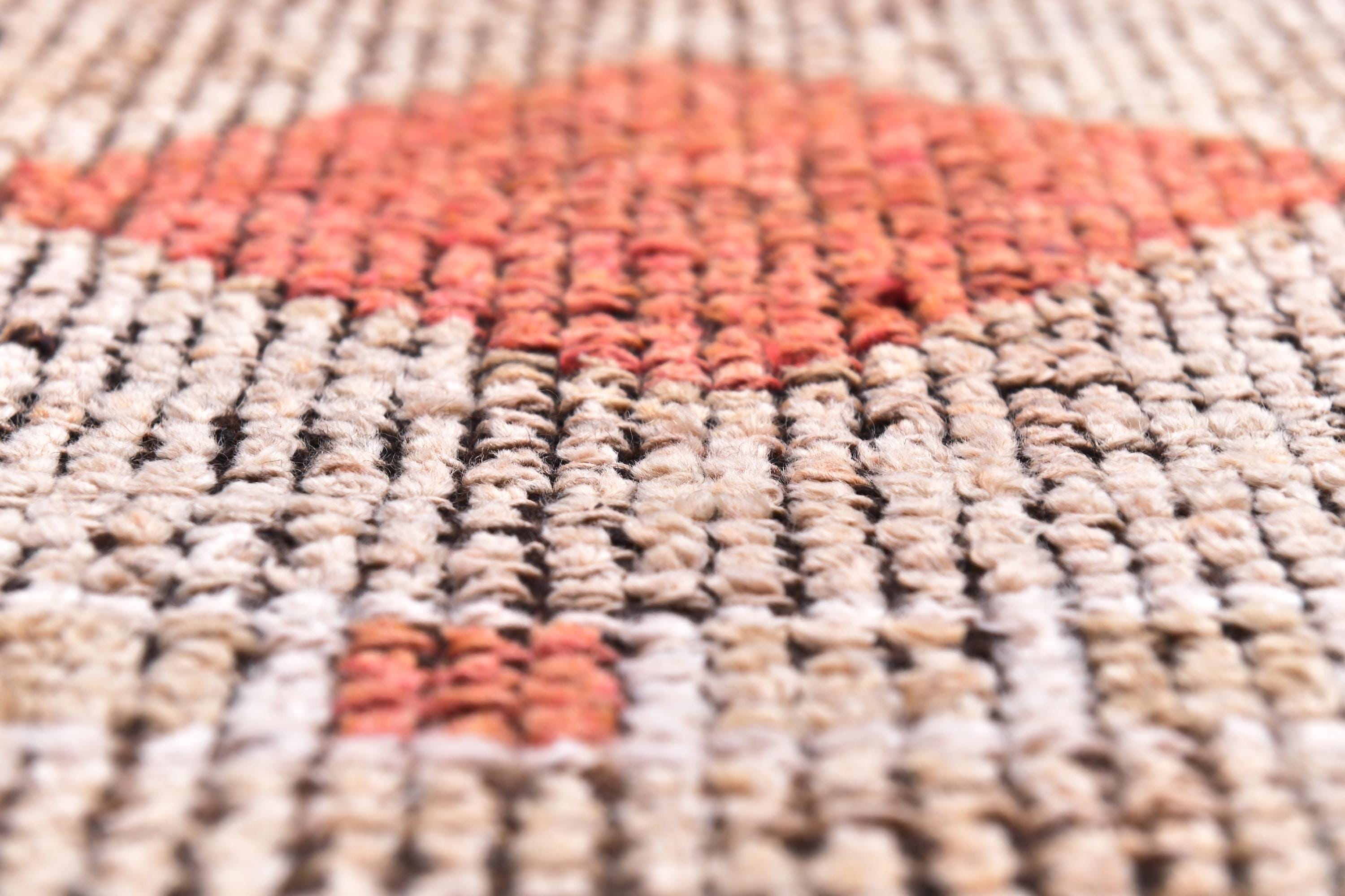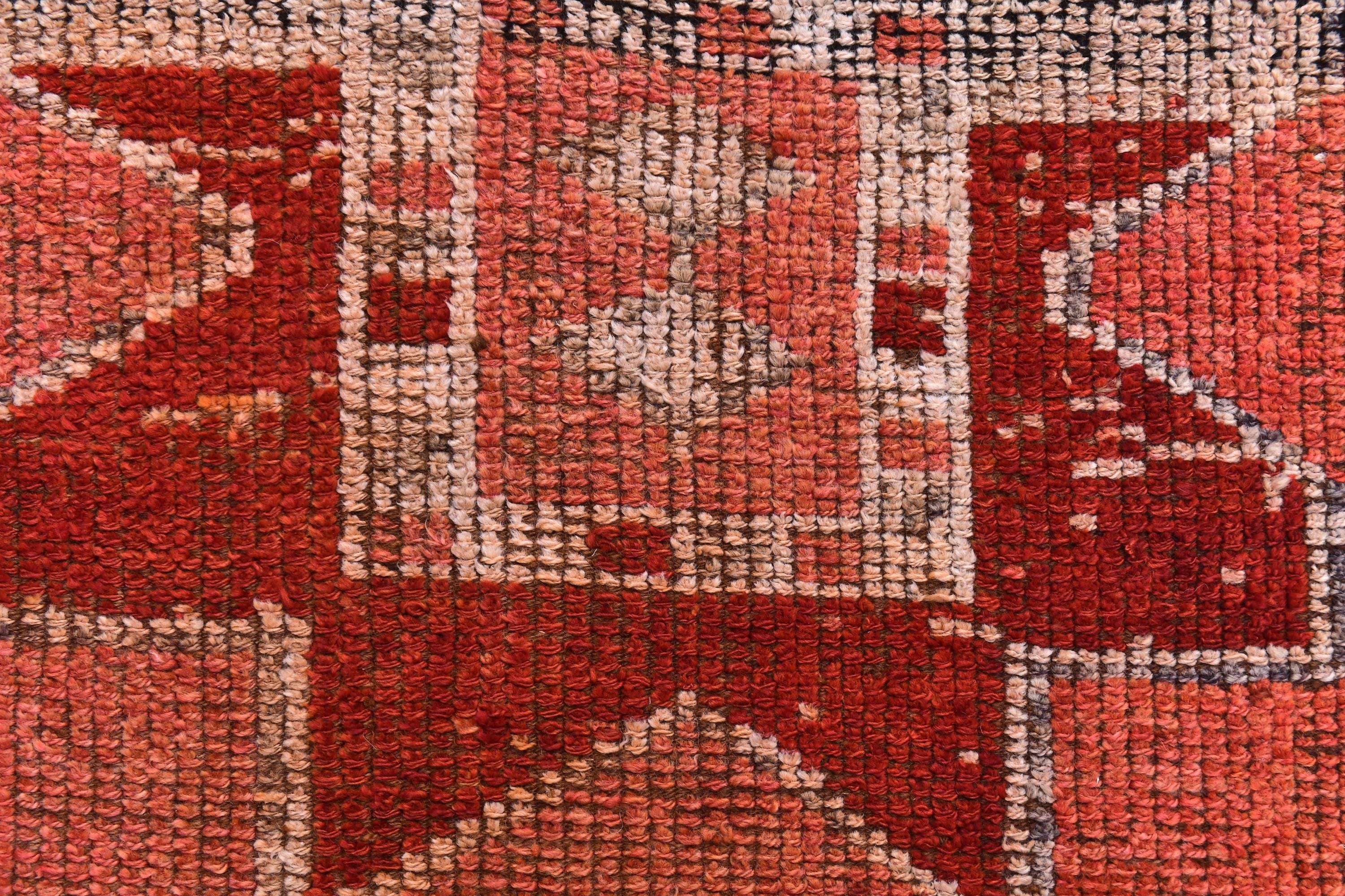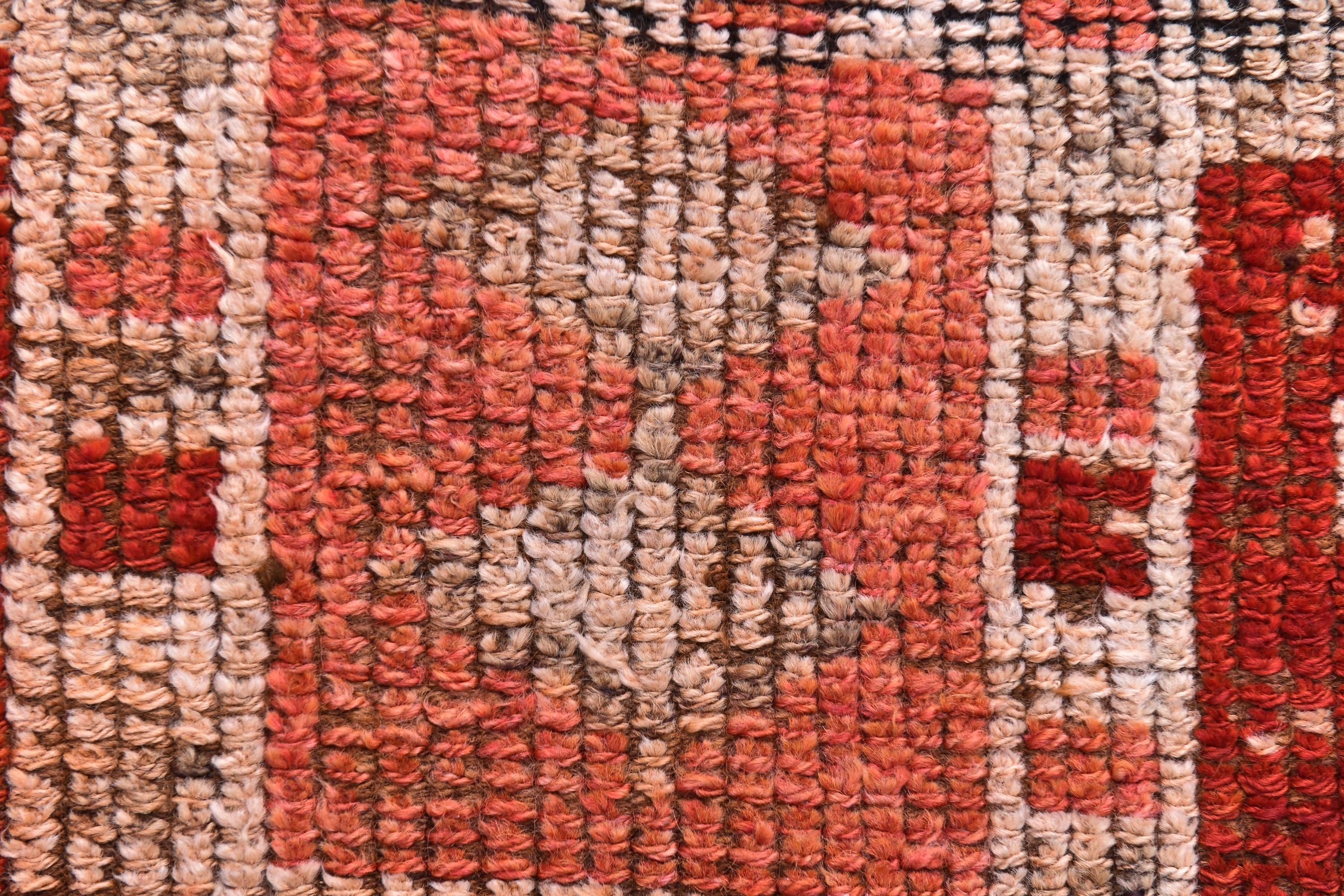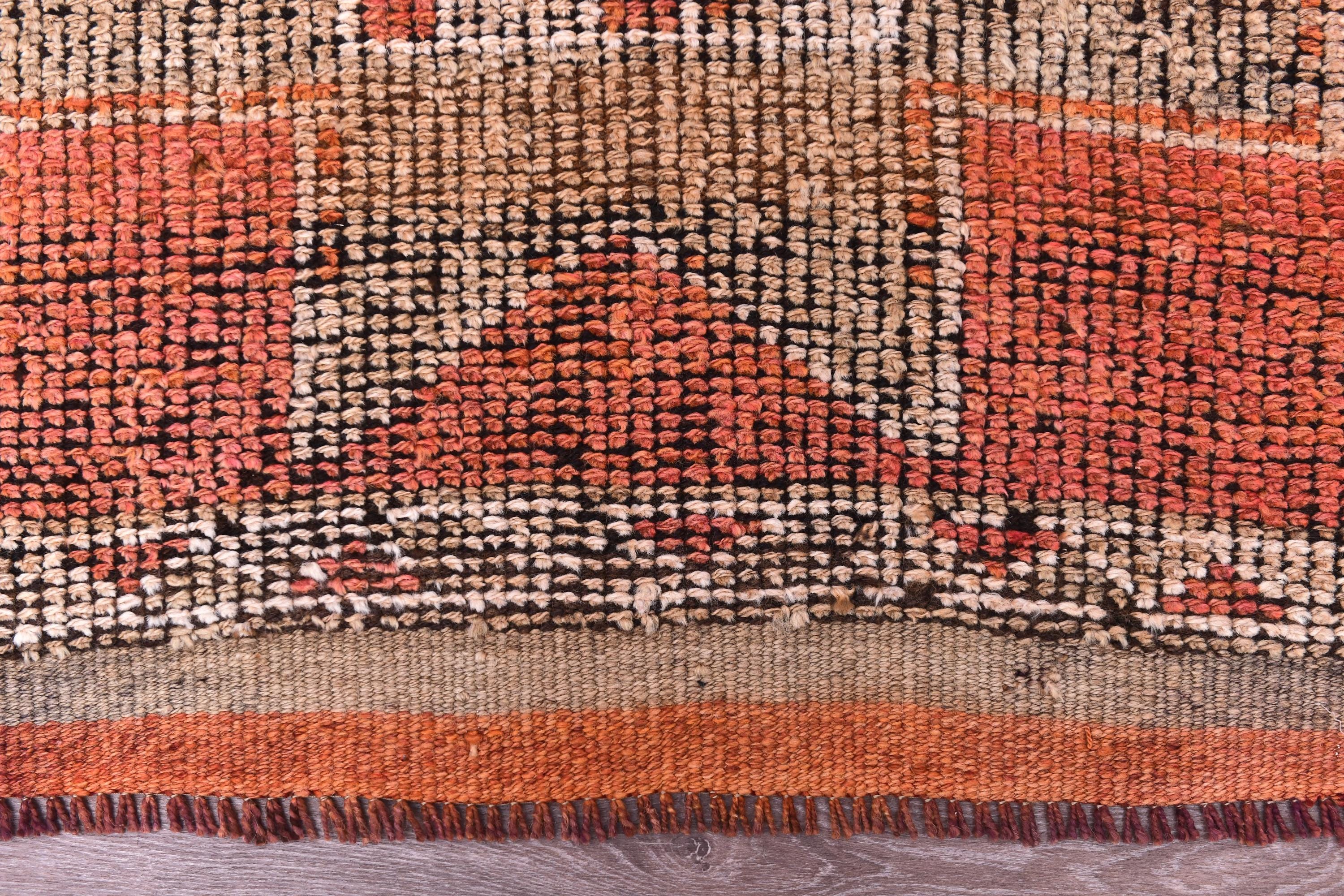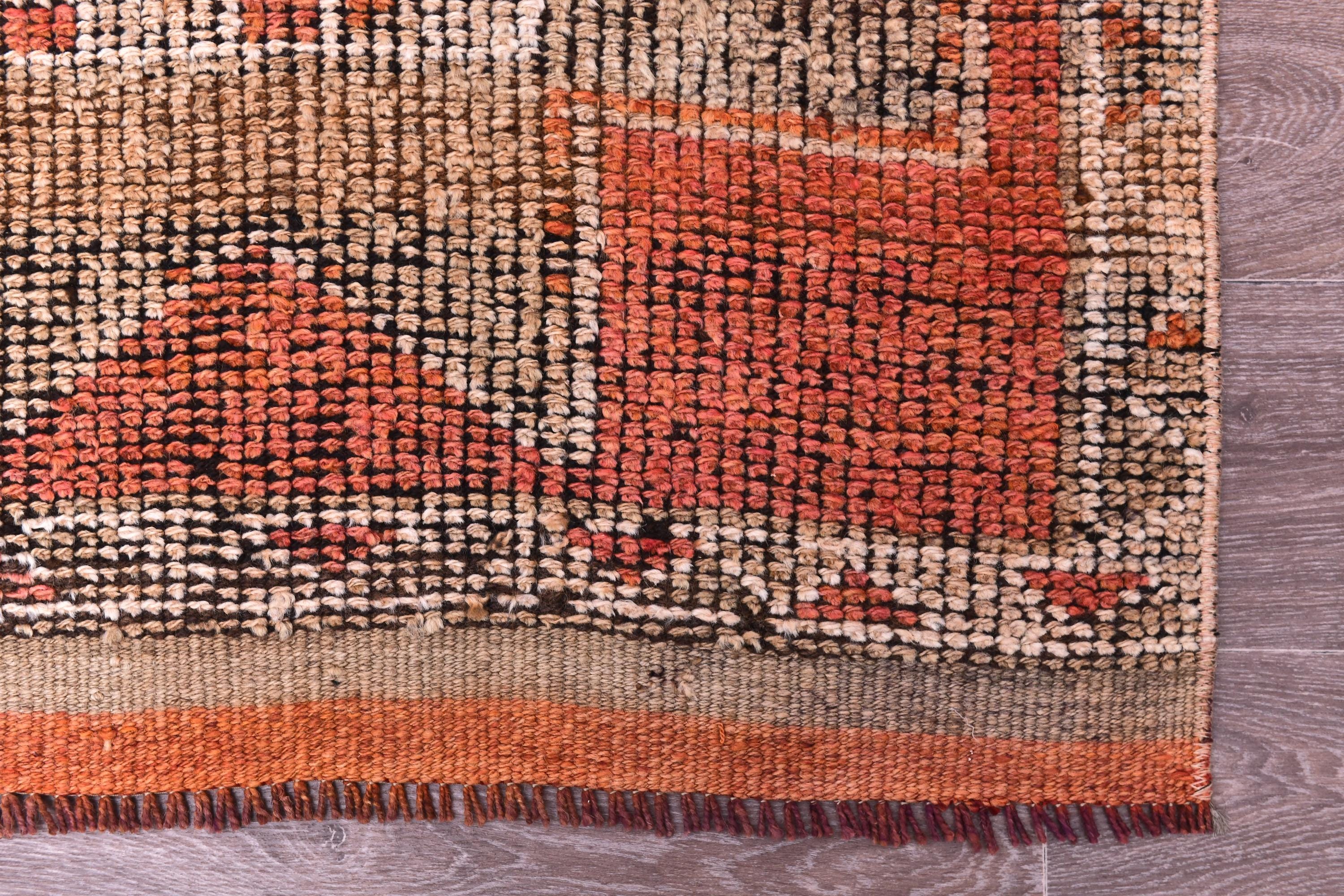📜📌 Vintage Herki runner rug featuring bold geometric medallion patterns in vibrant peach and brown cream colors. Hand-knotted wool construction with traditional Herki design elements including a central cream and coral medallion, surrounded by intricate floral motifs.