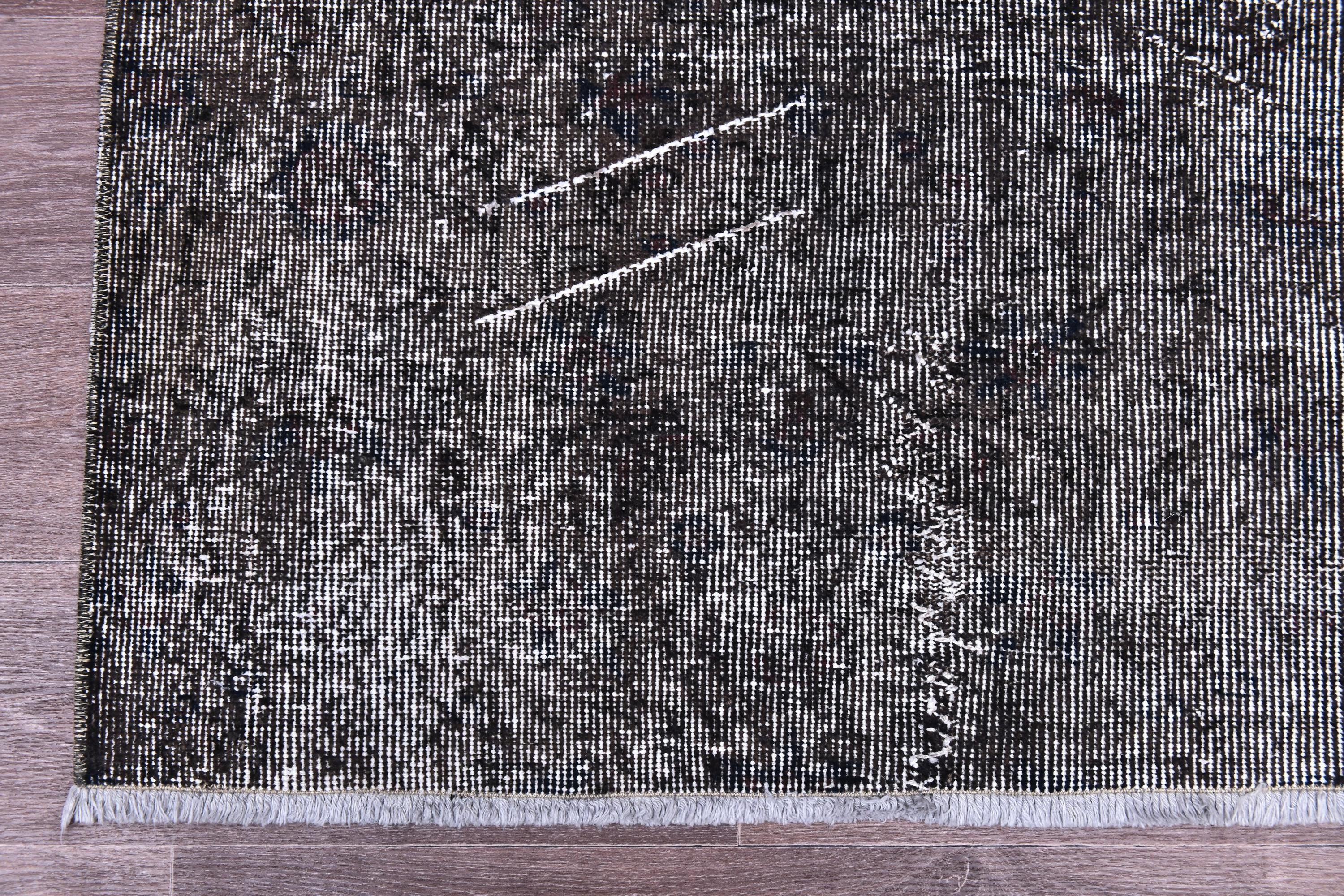 📜📌 A large handmade vintage Turkish overdyed area rug in deep brown and olive green tones with a heavily distressed, worn texture revealing cream and gray undertones beneath, photographed on dark wood flooring.