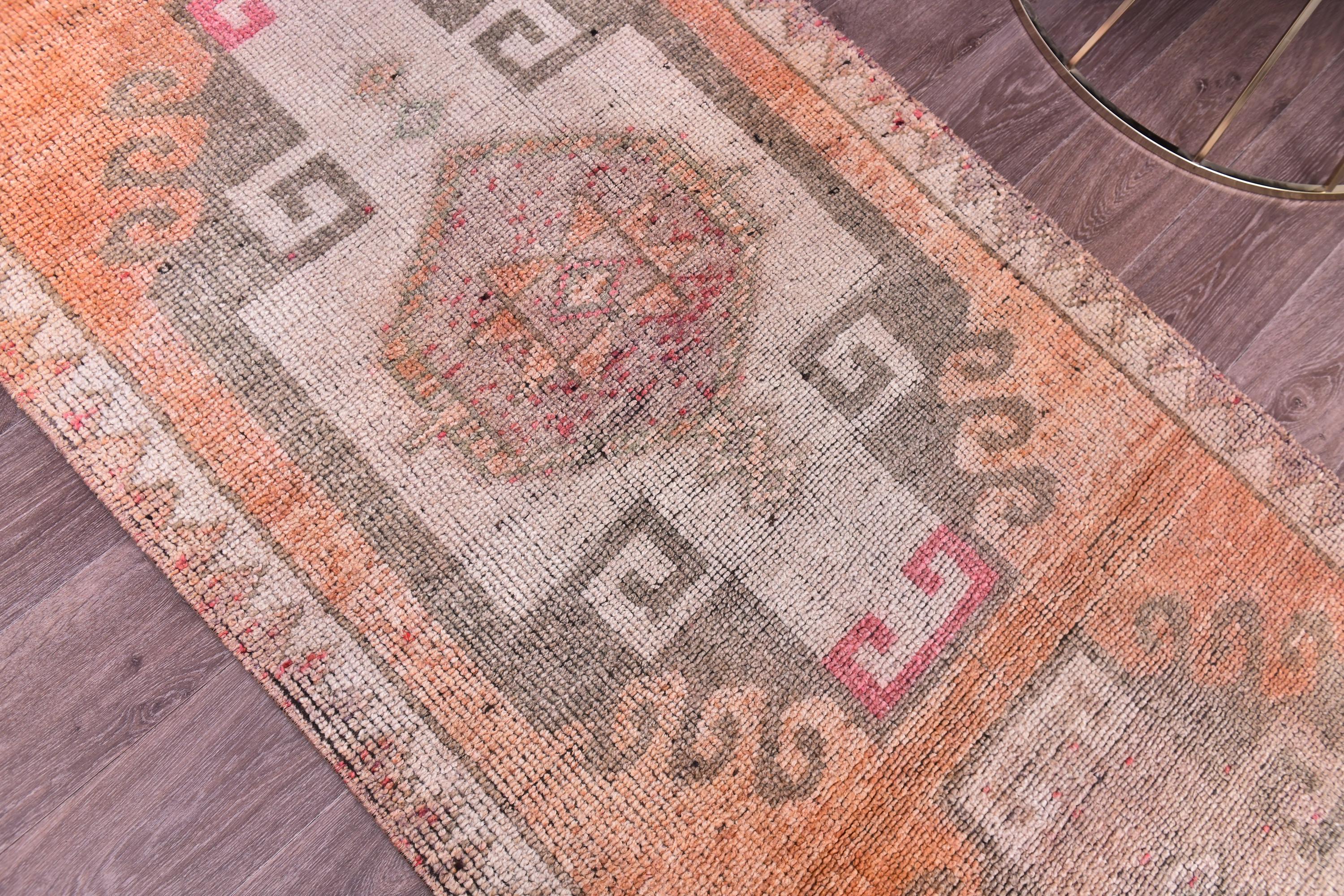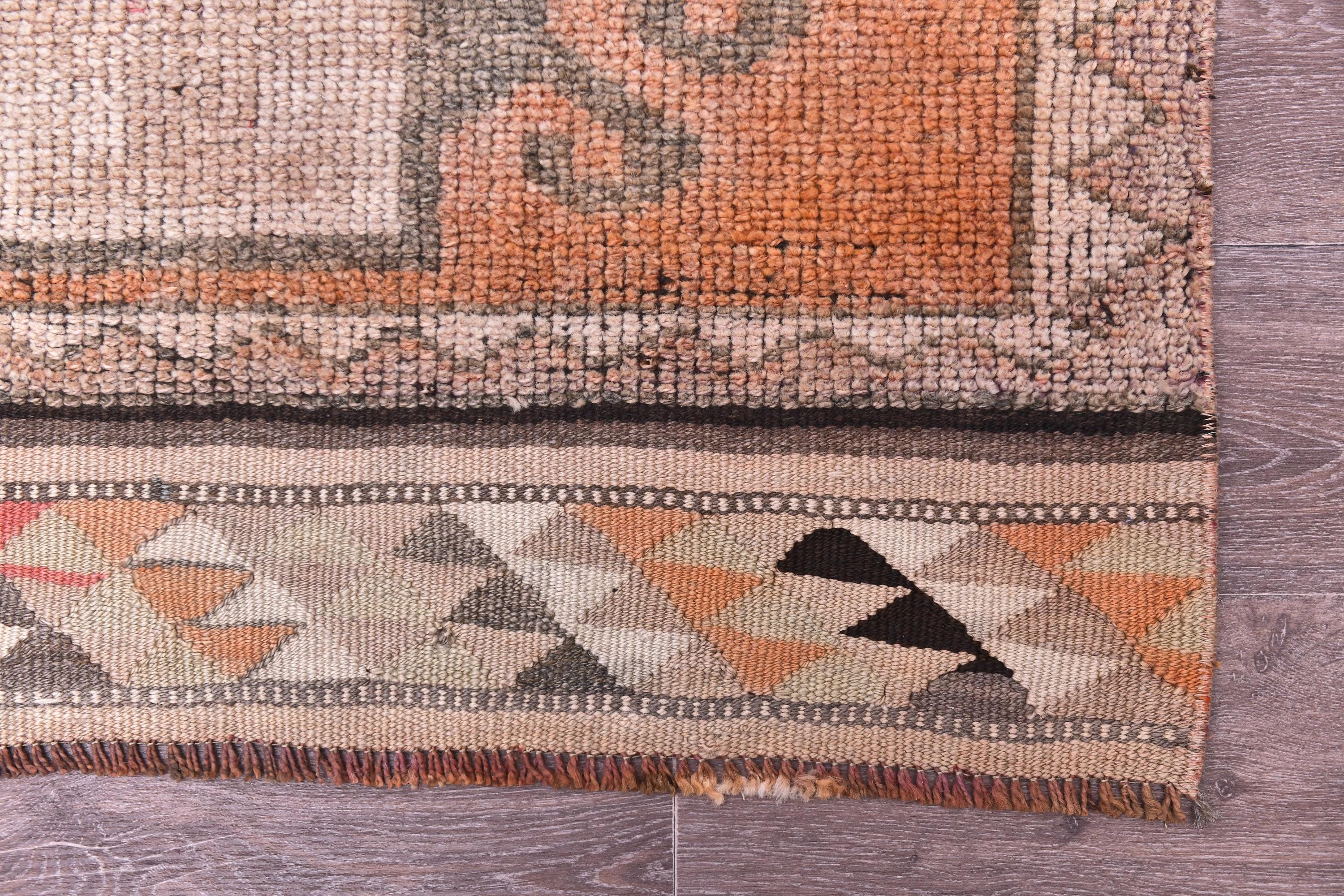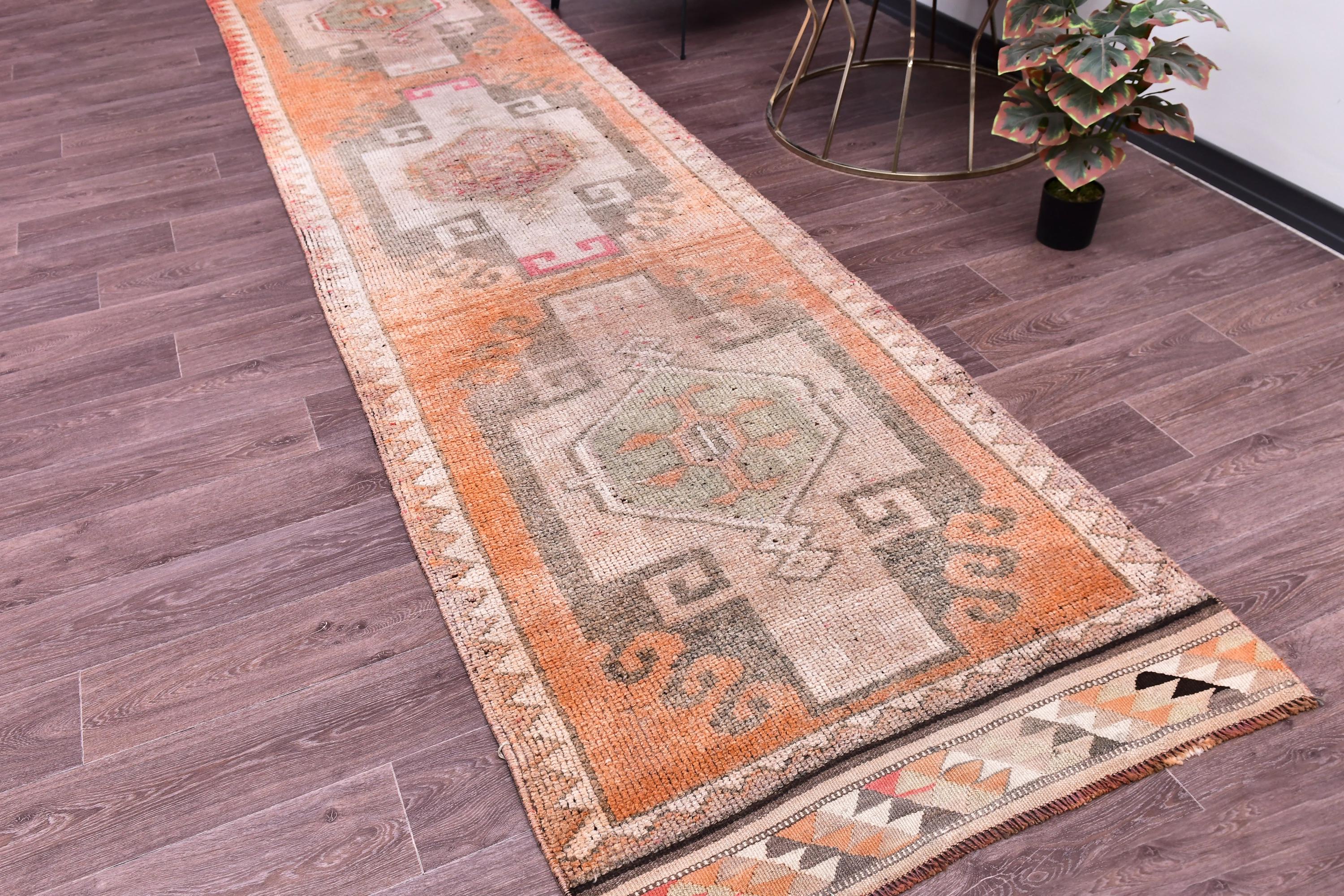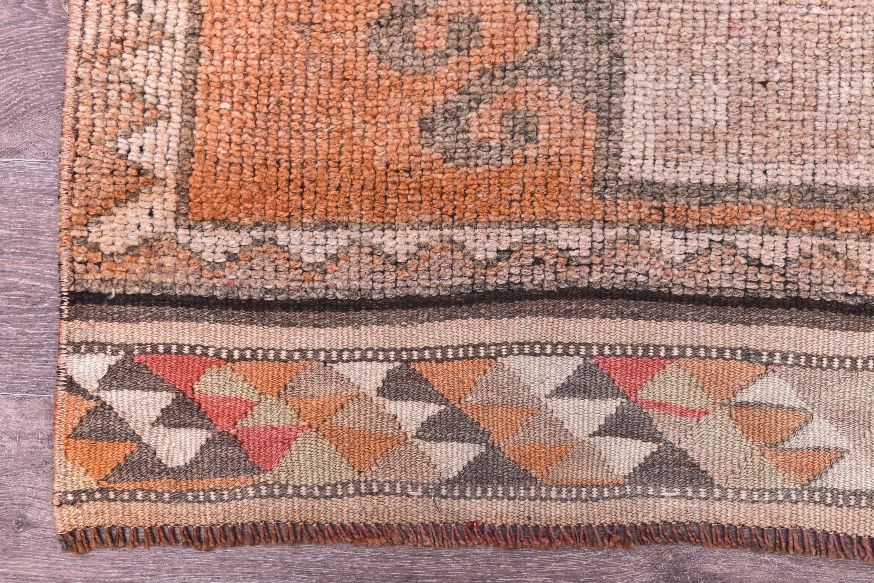 📜📌 Vintage Turkish runner rug featuring repeating floral medallion pattern in peach coral and charcoal brown colors with blue accents, hand-knotted narrow hallway carpet with traditional border design and distressed patina, perfect for entryway kitchen or corridor decor