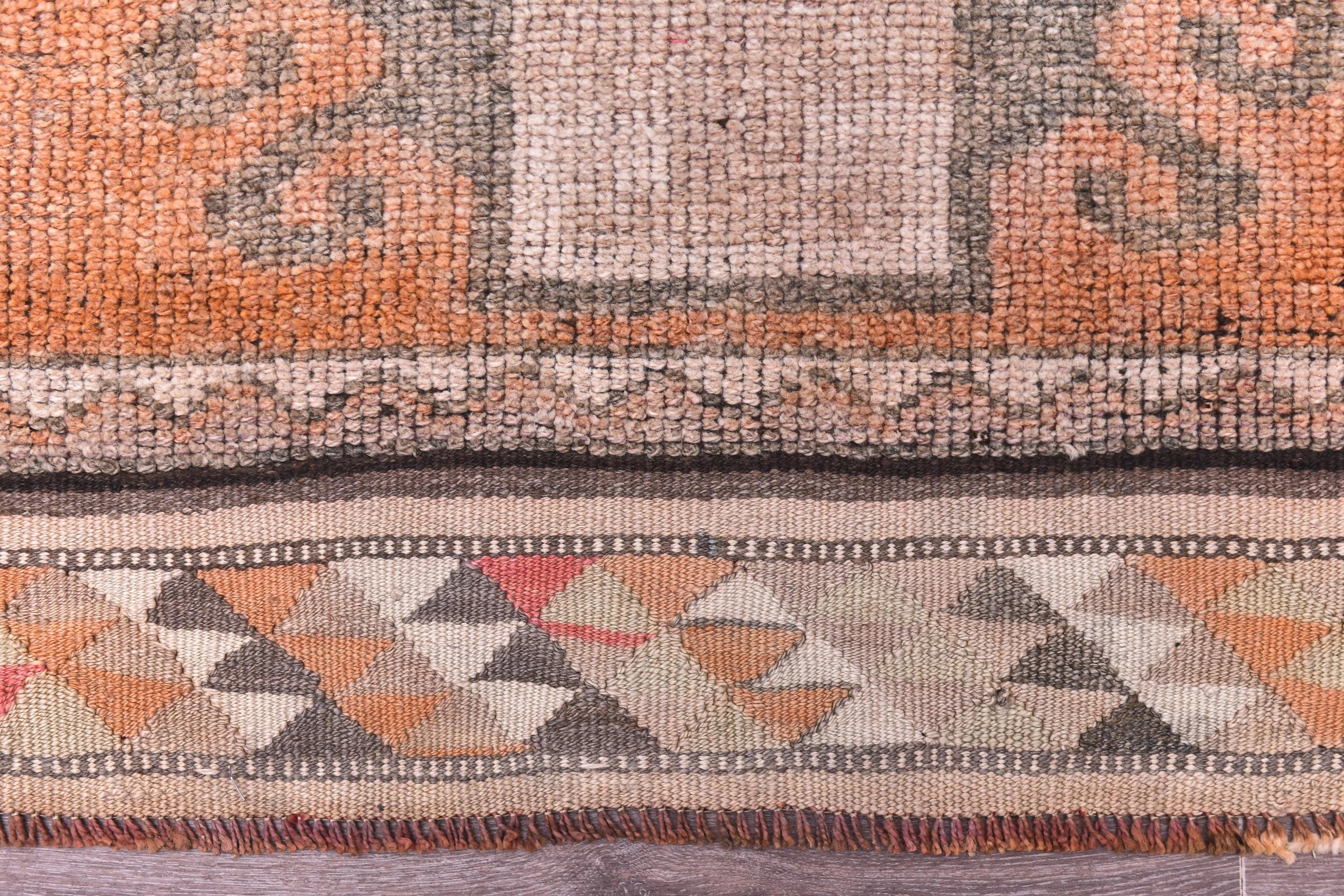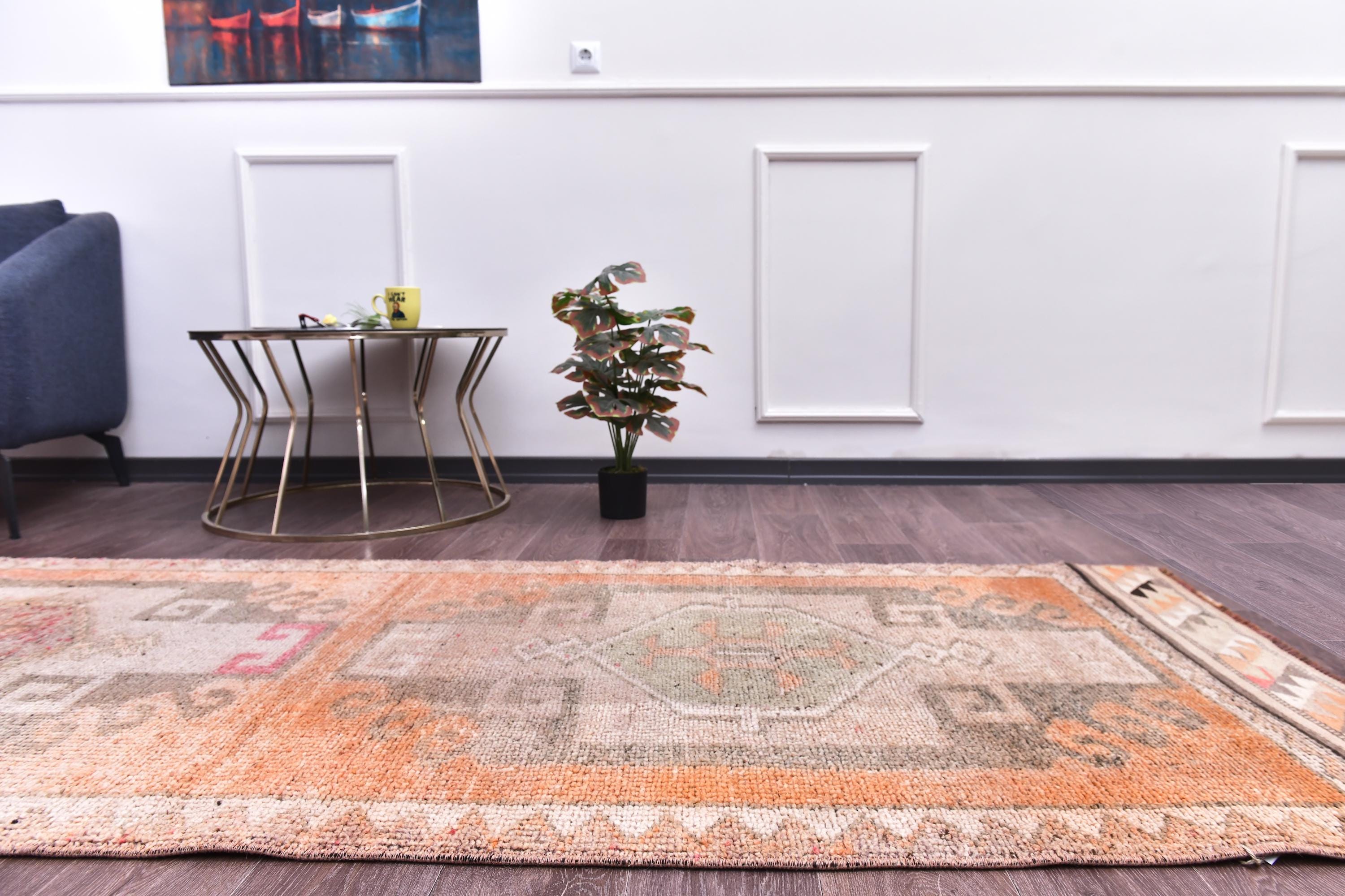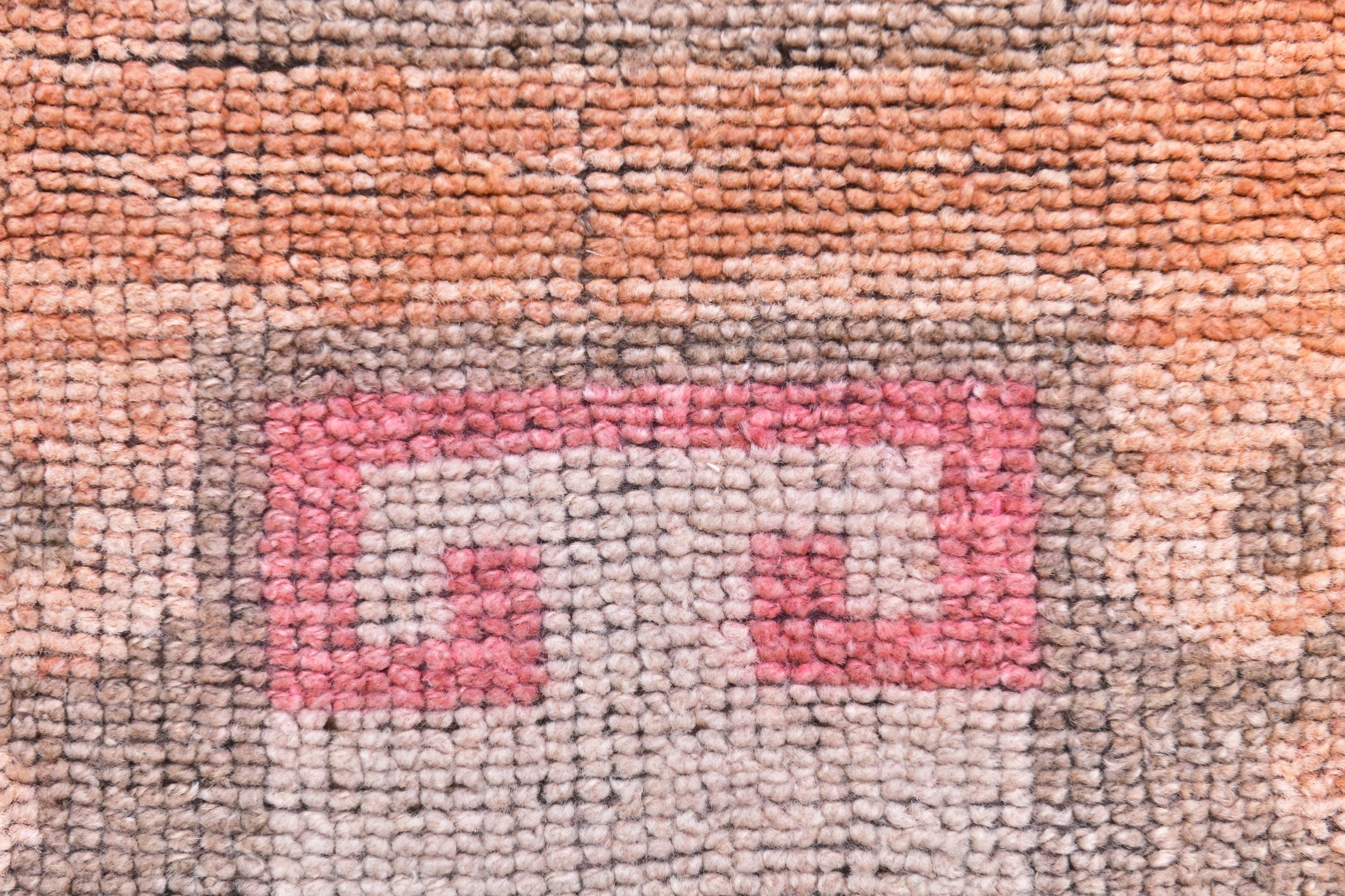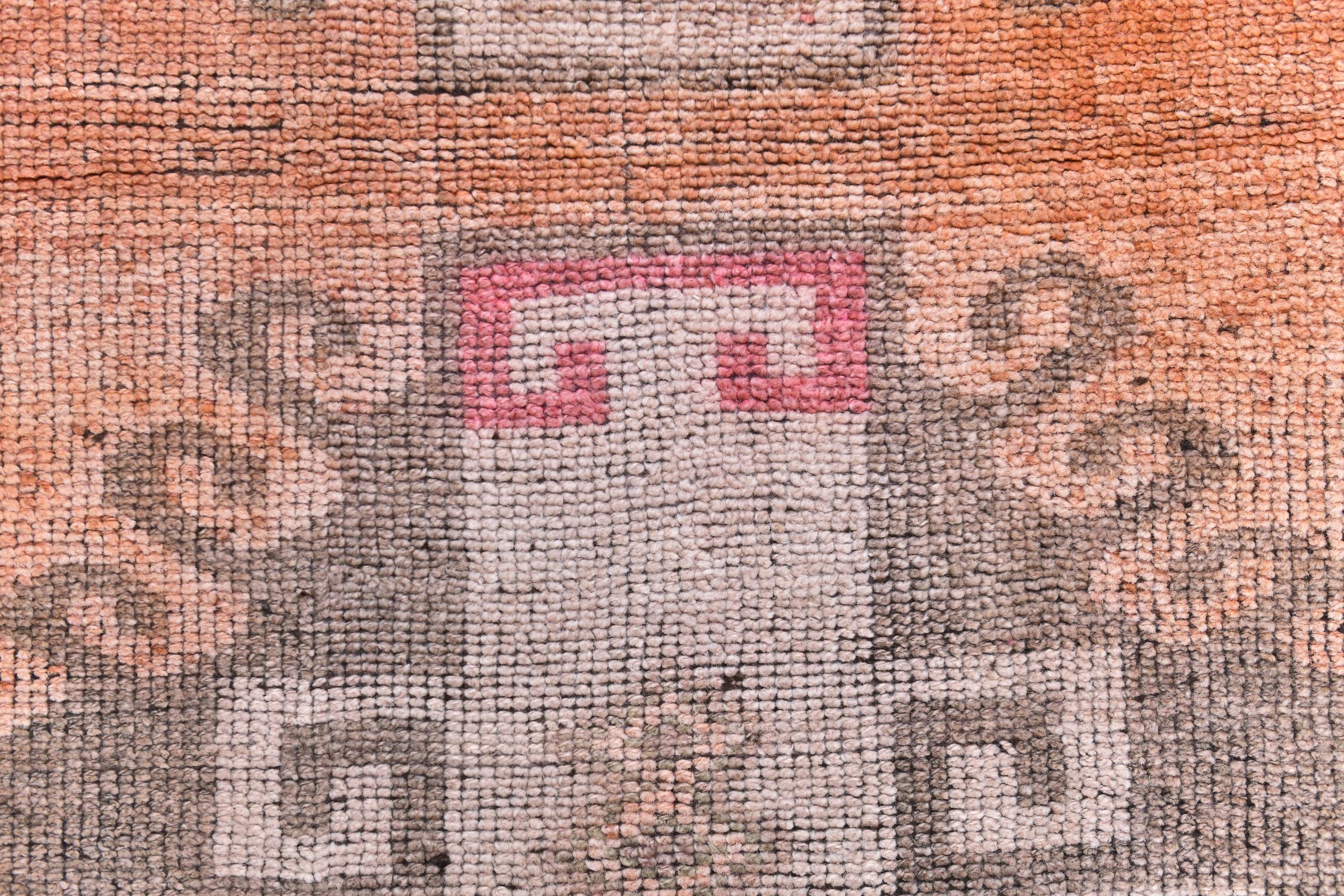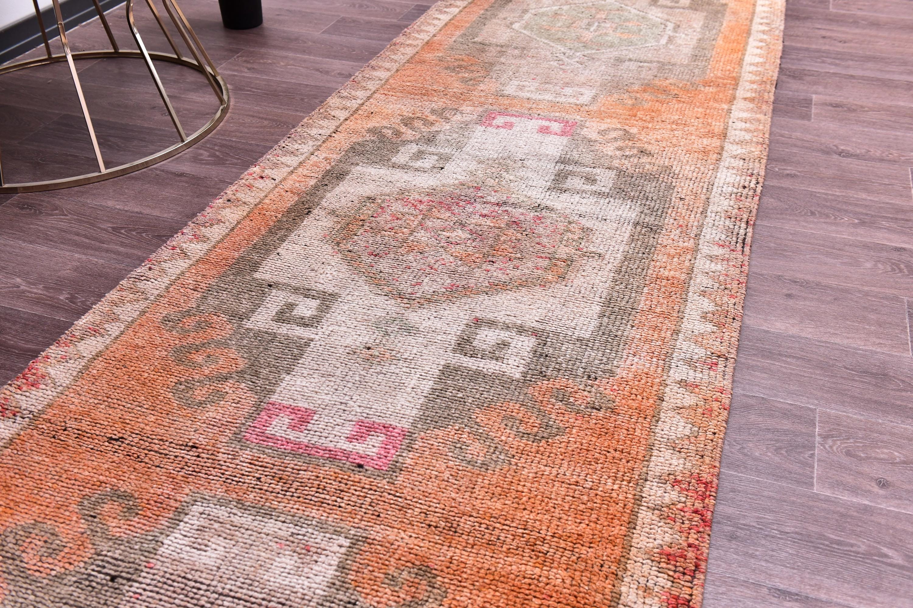 📜📌 Vintage Turkish runner rug featuring repeating floral medallion pattern in peach coral and charcoal brown colors with blue accents, hand-knotted narrow hallway carpet with traditional border design and distressed patina, perfect for entryway kitchen or corridor decor