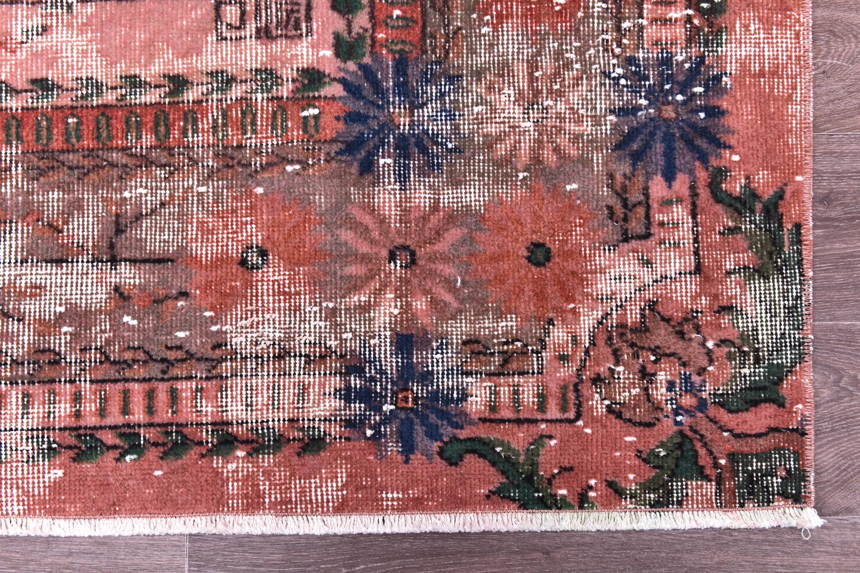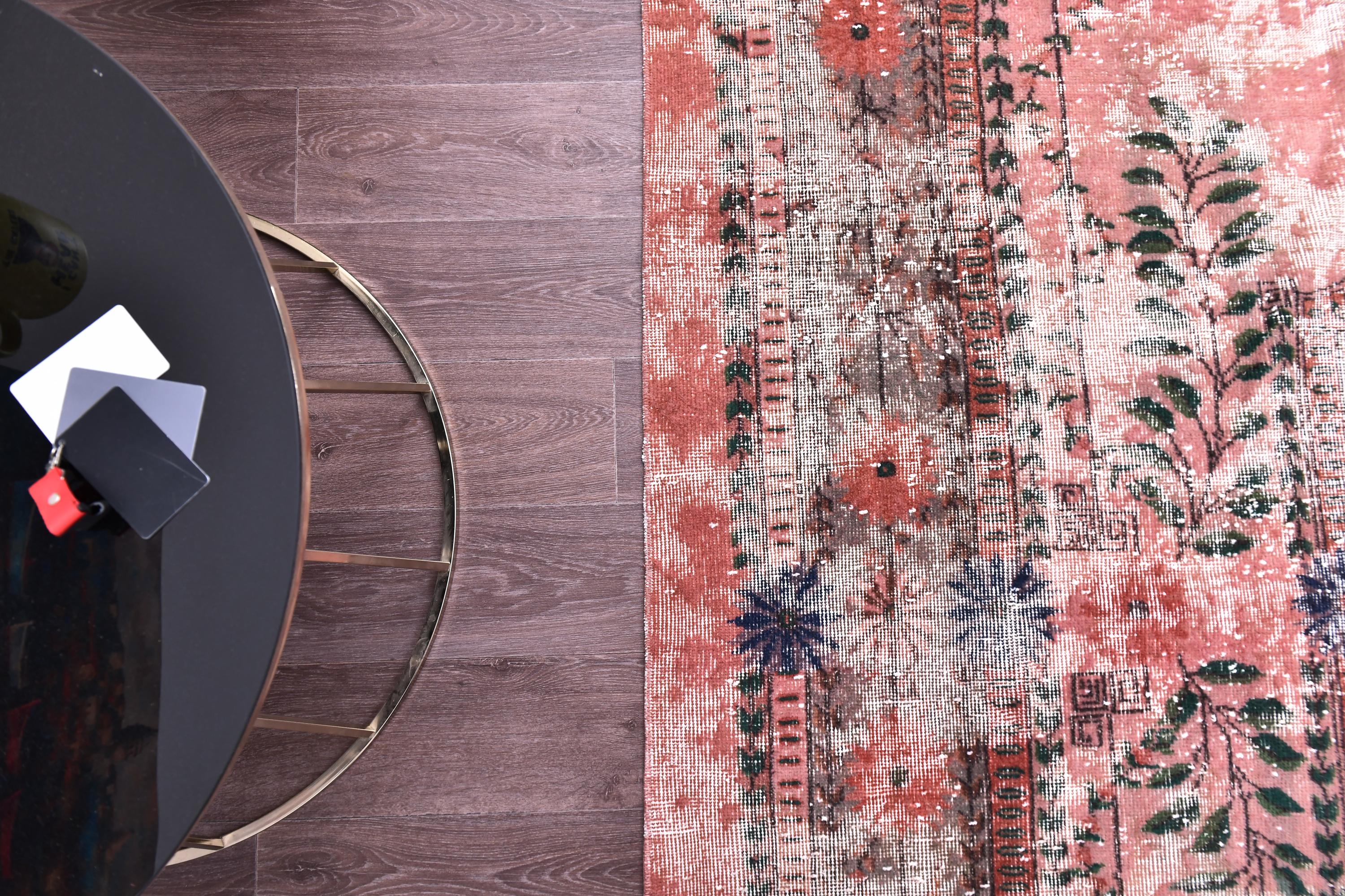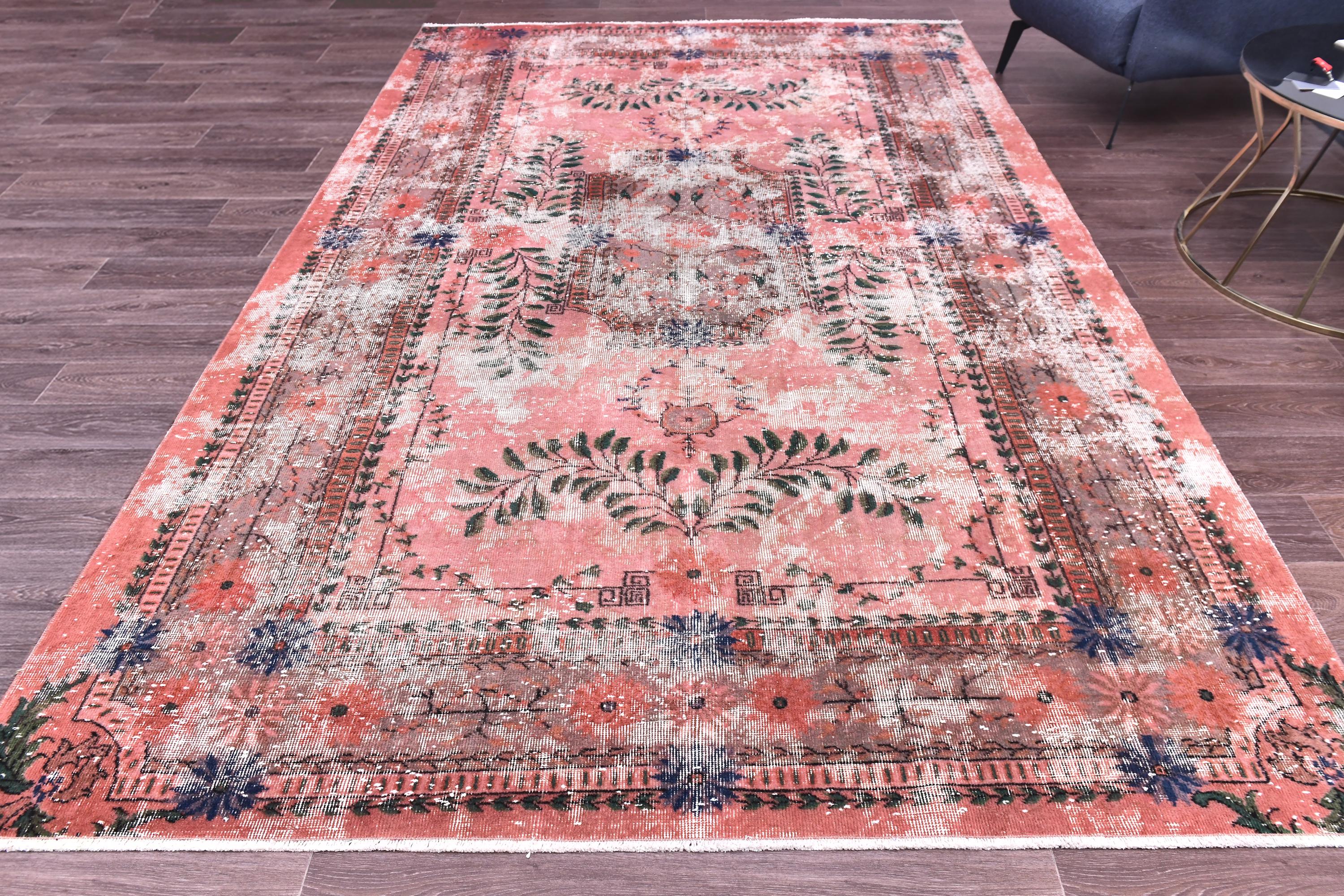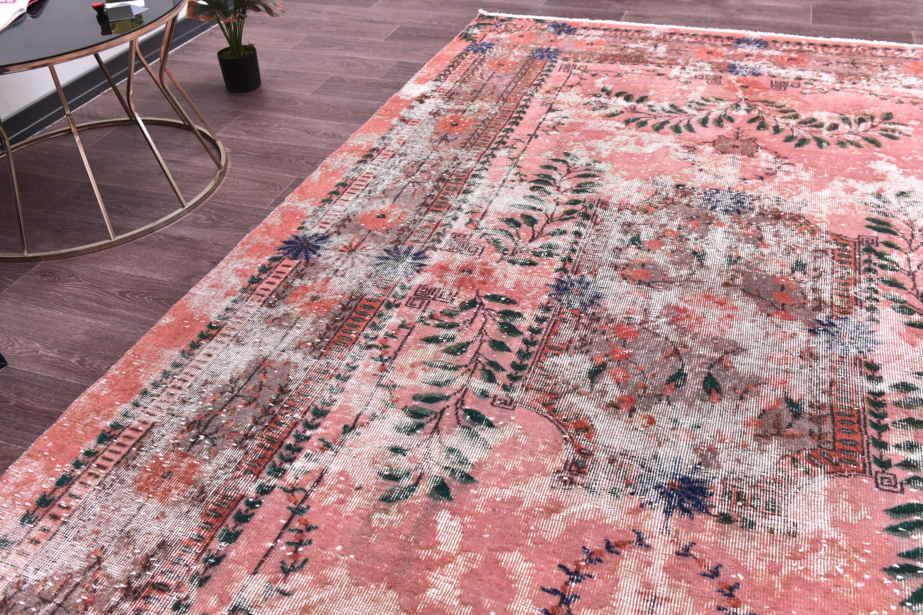 📜📌 A large vintage Turkish area rug in coral salmon pink with a distressed finish, featuring green botanical leaf motifs, navy blue floral accents, and a traditional medallion border, displayed on a dark wood floor.