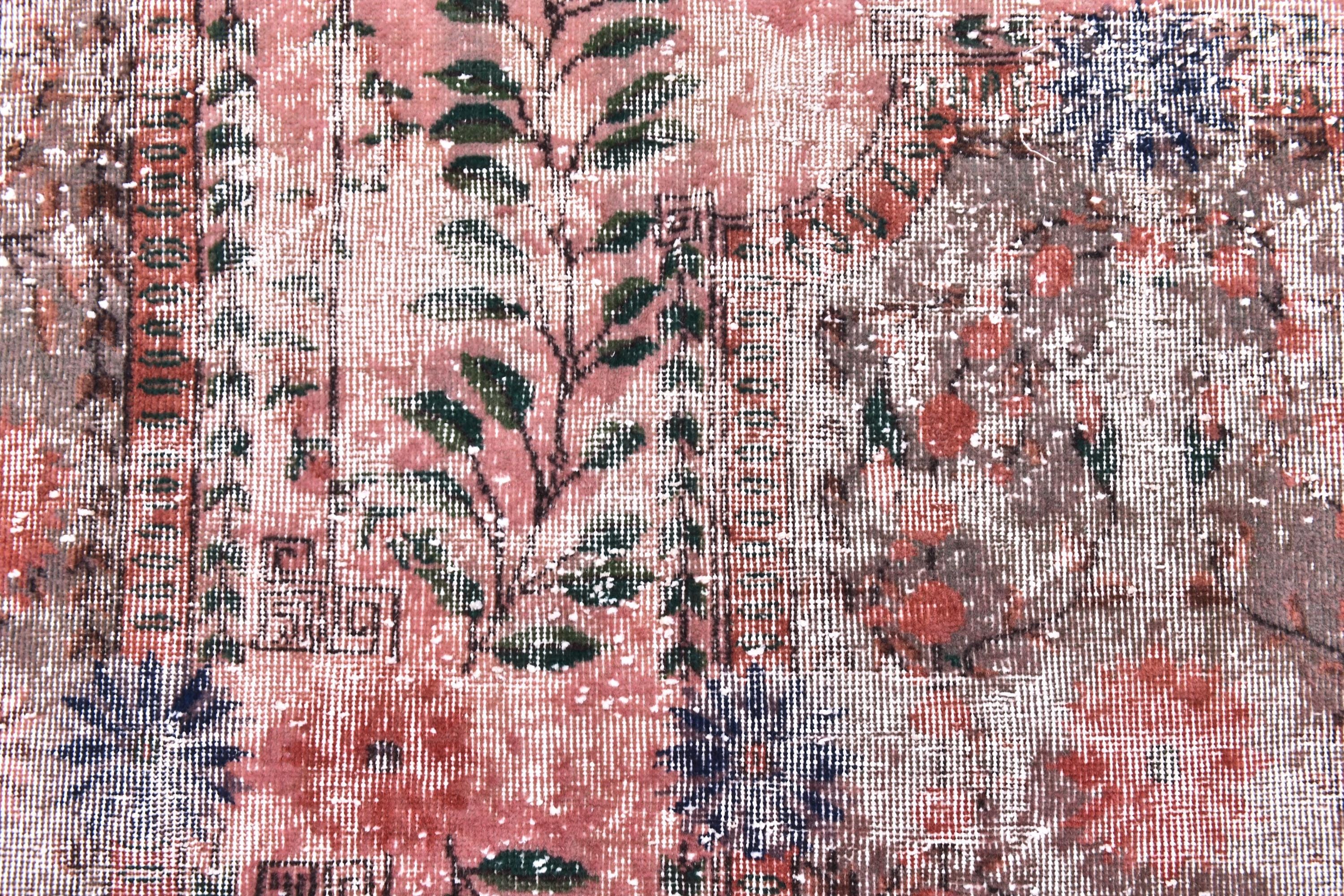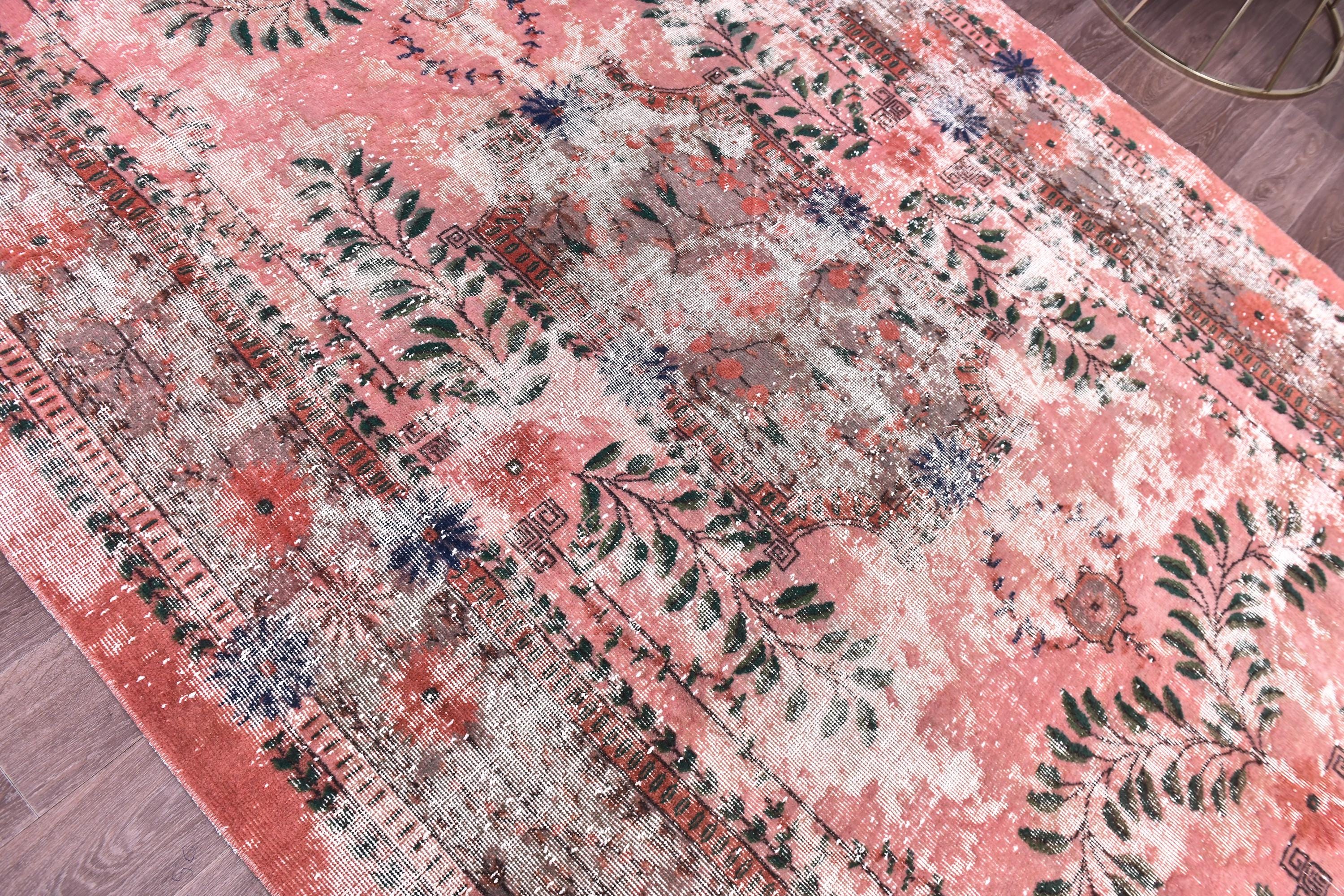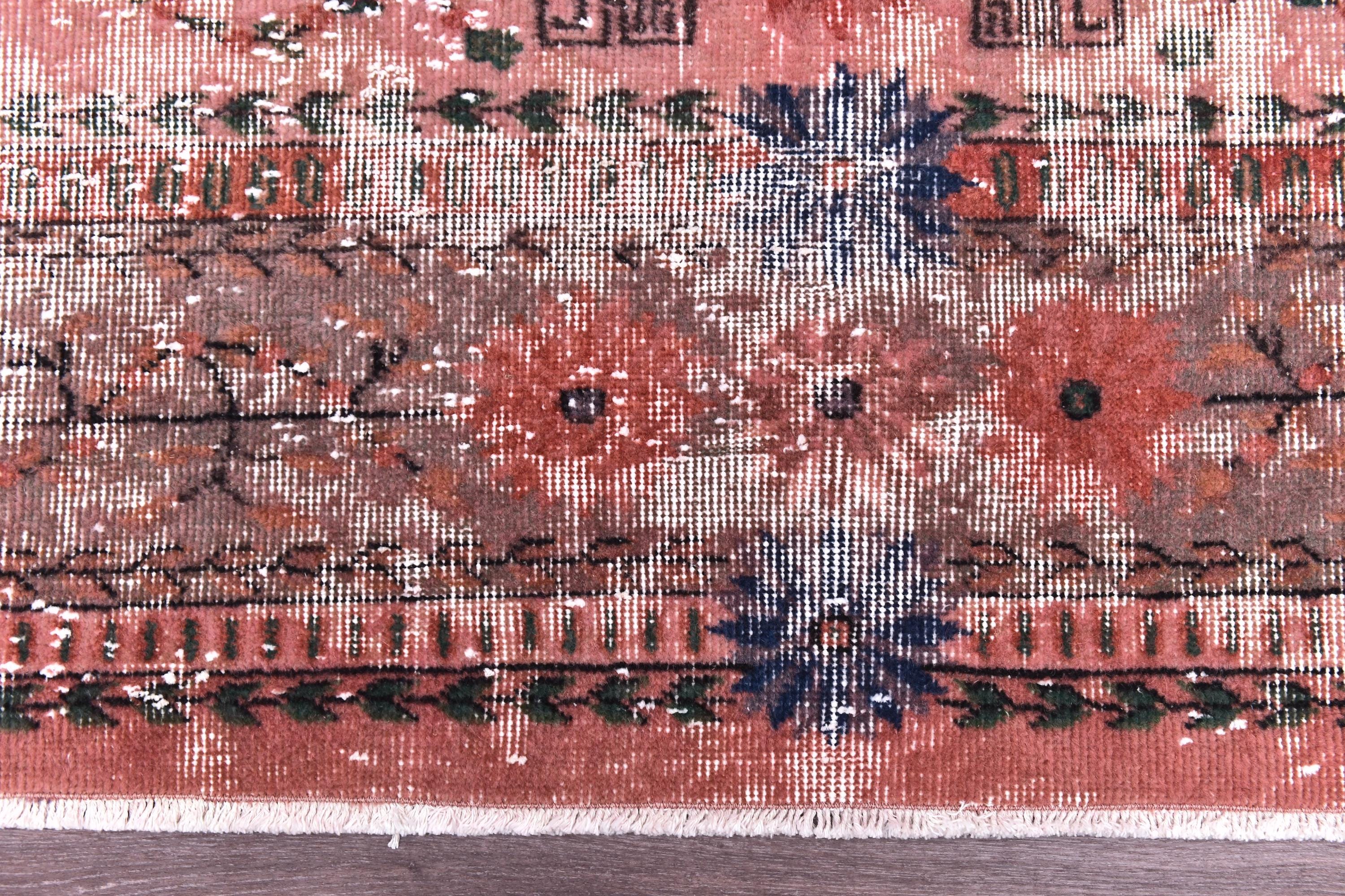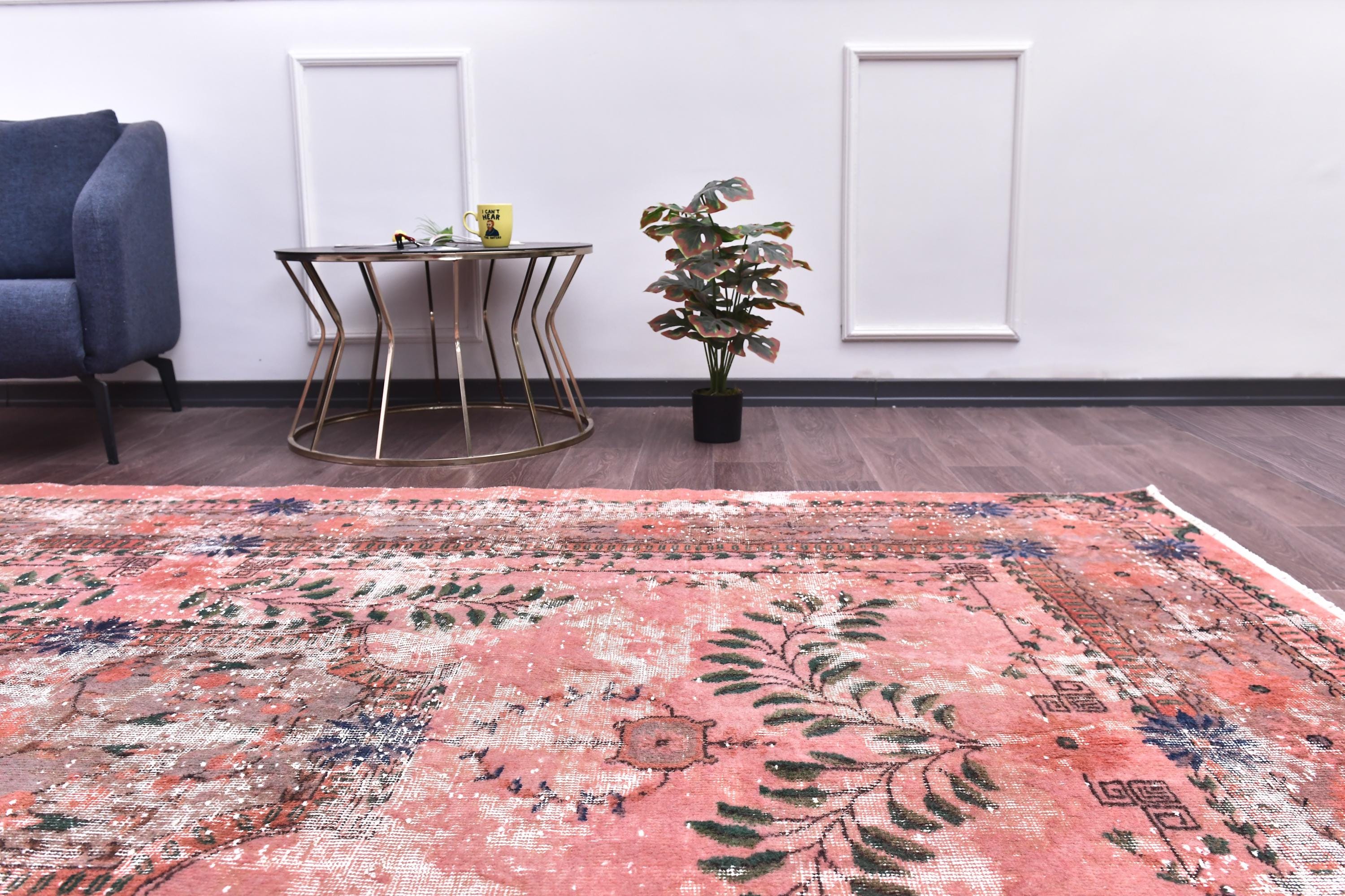 📜📌 A large vintage Turkish area rug in coral salmon pink with a distressed finish, featuring green botanical leaf motifs, navy blue floral accents, and a traditional medallion border, displayed on a dark wood floor.