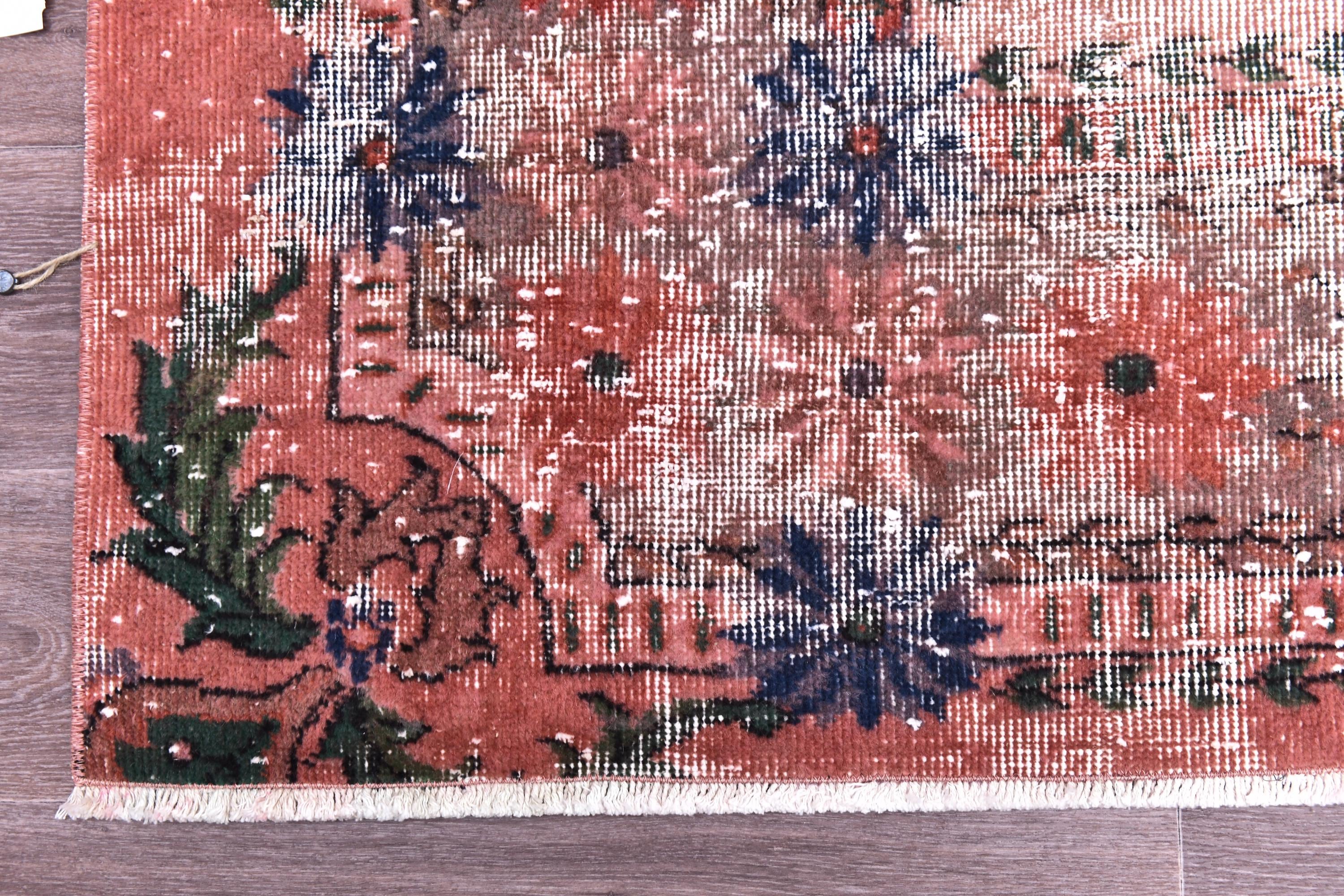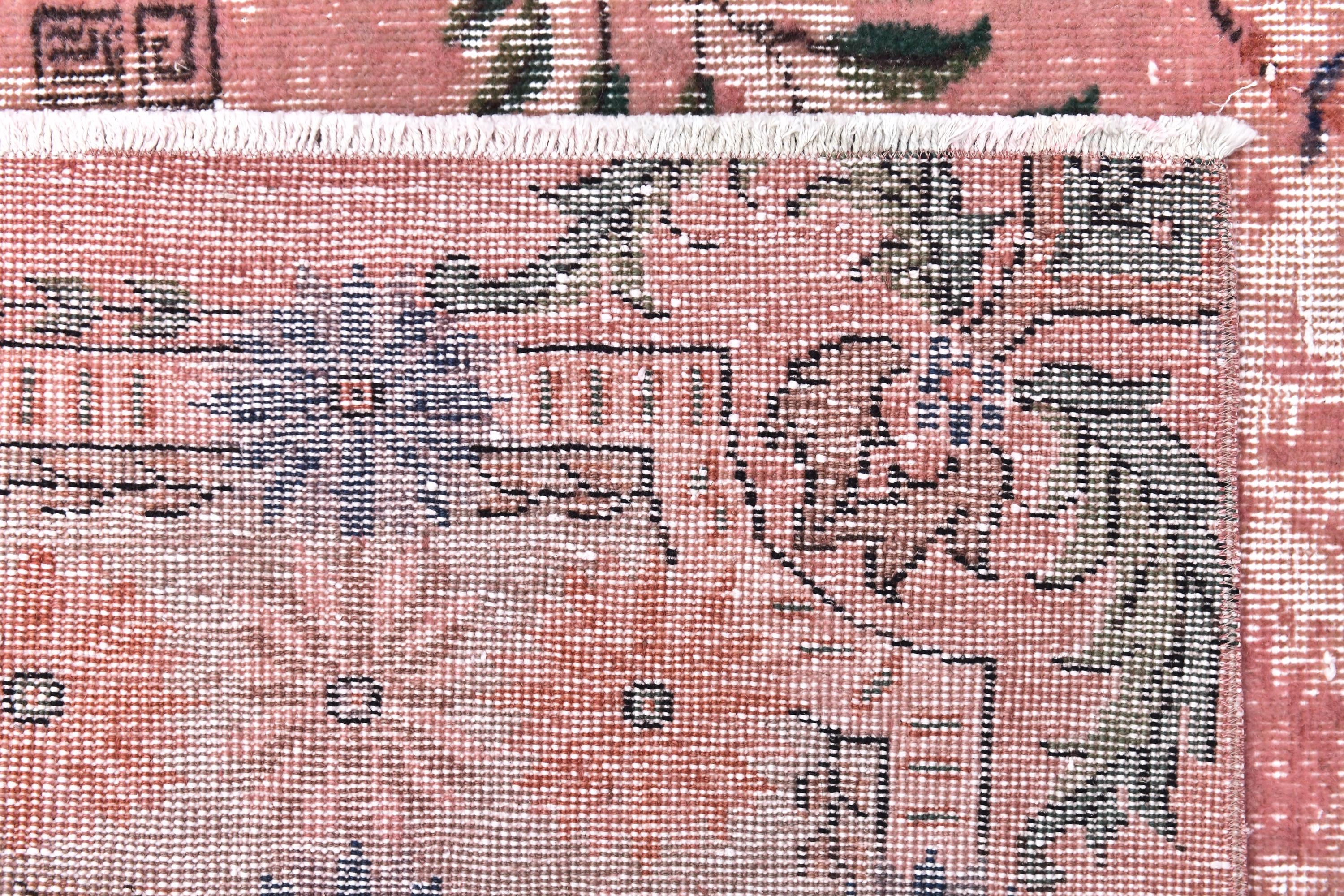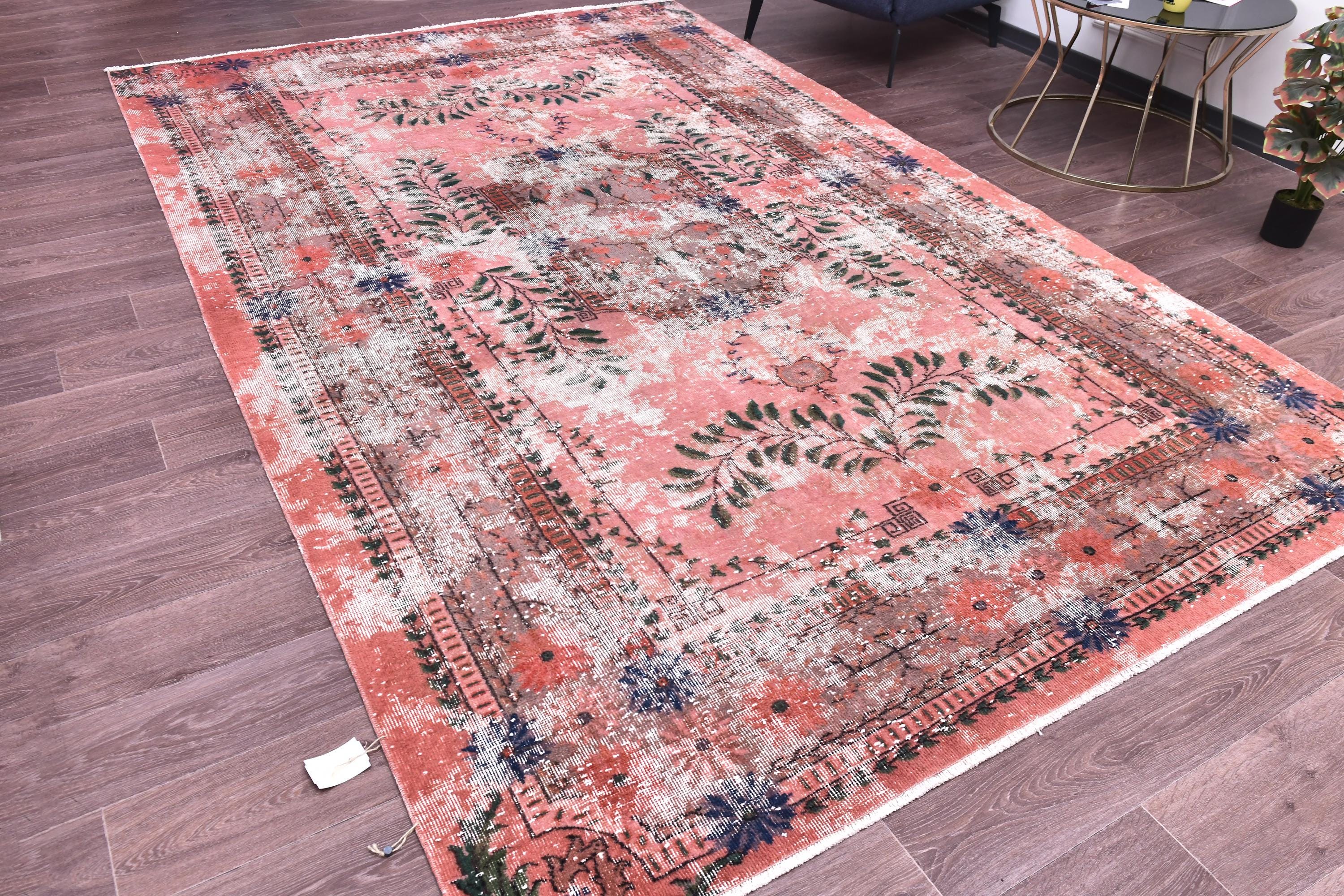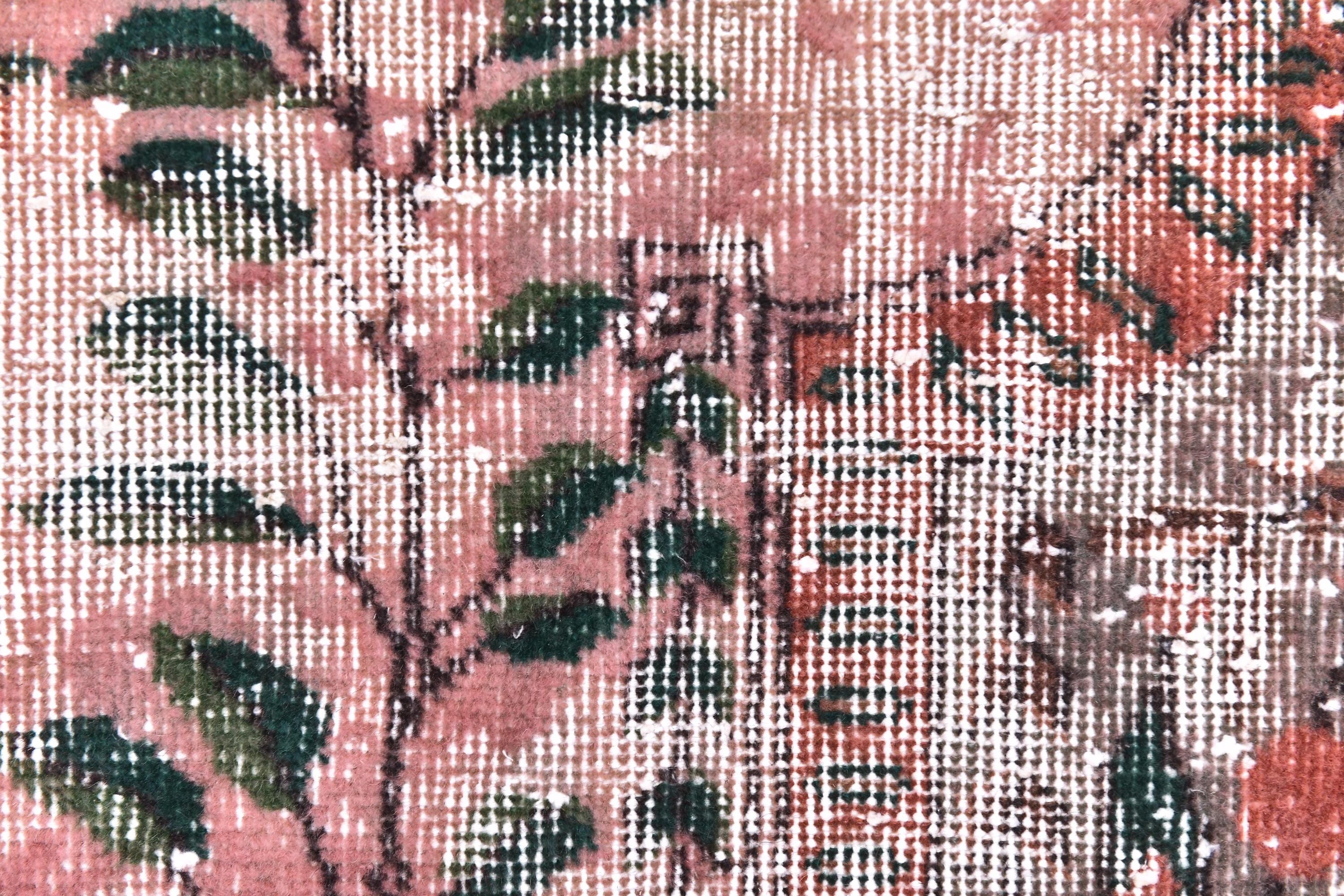 📜📌 A large vintage Turkish area rug in coral salmon pink with a distressed finish, featuring green botanical leaf motifs, navy blue floral accents, and a traditional medallion border, displayed on a dark wood floor.