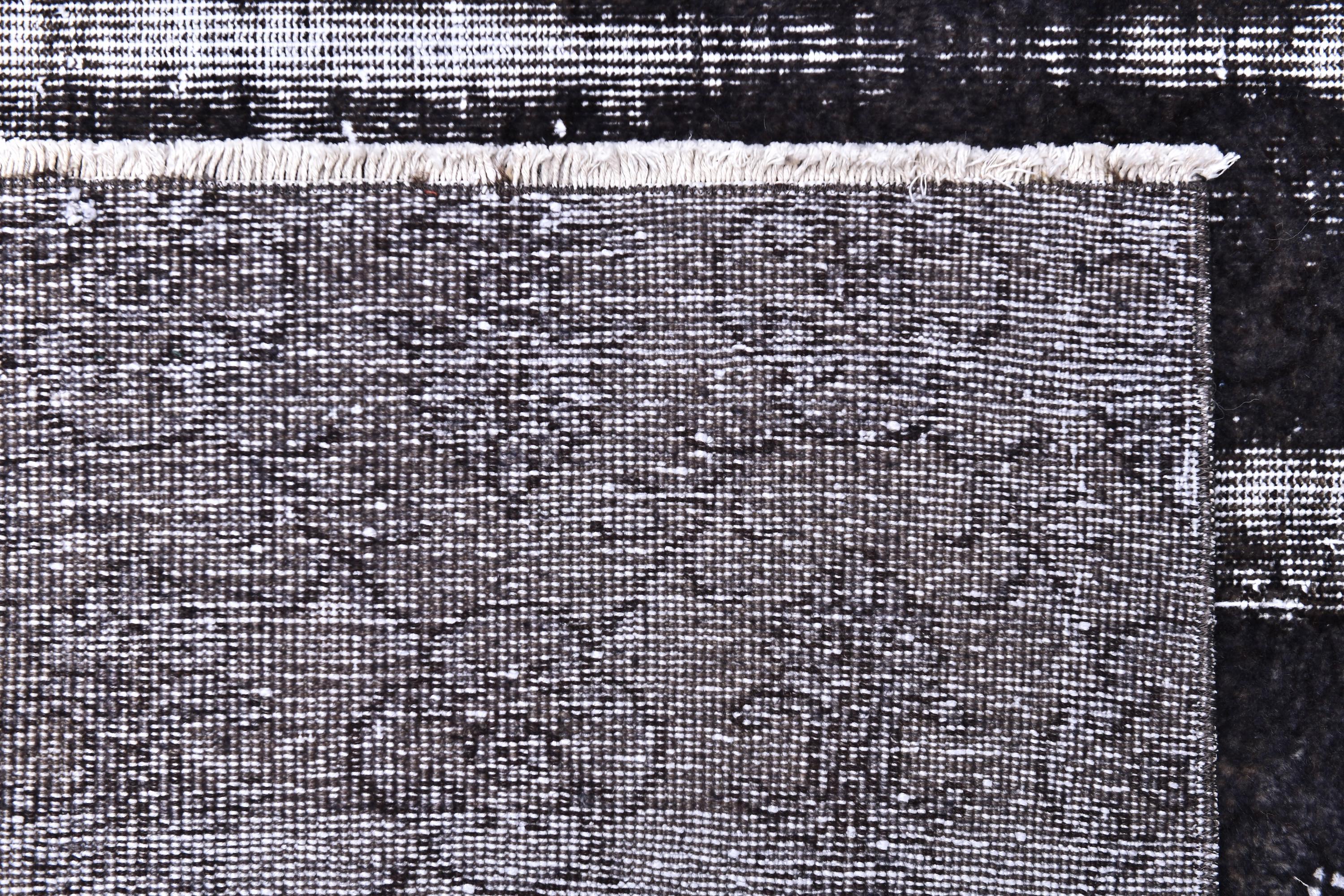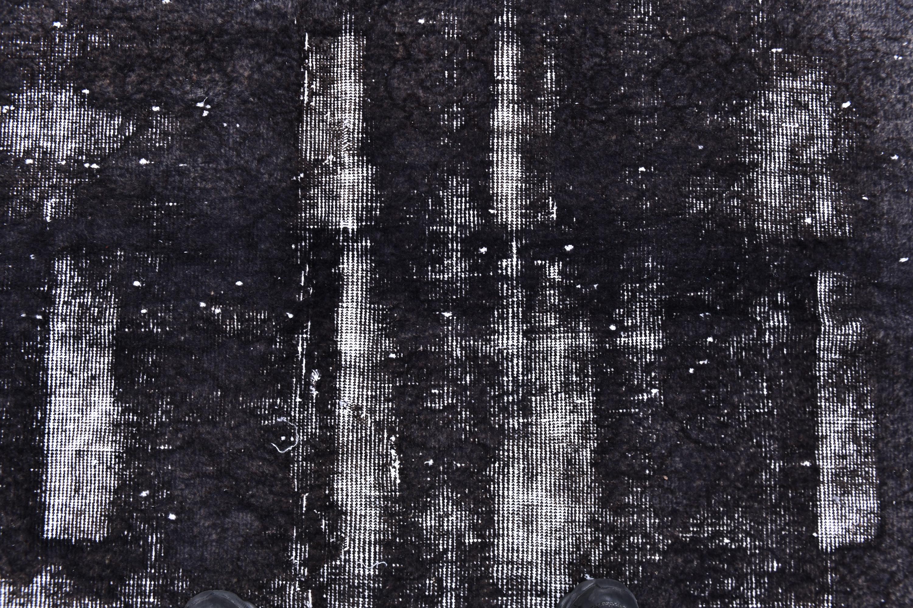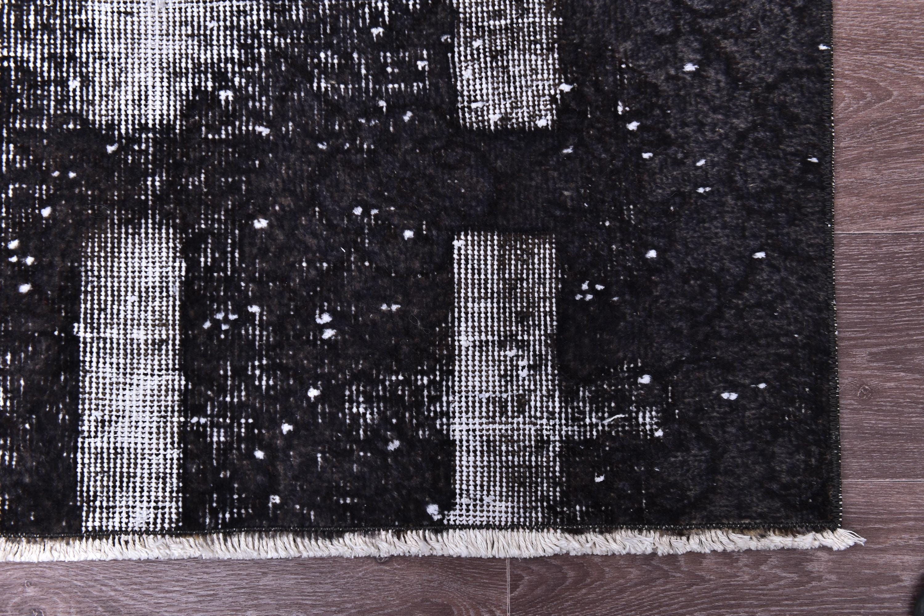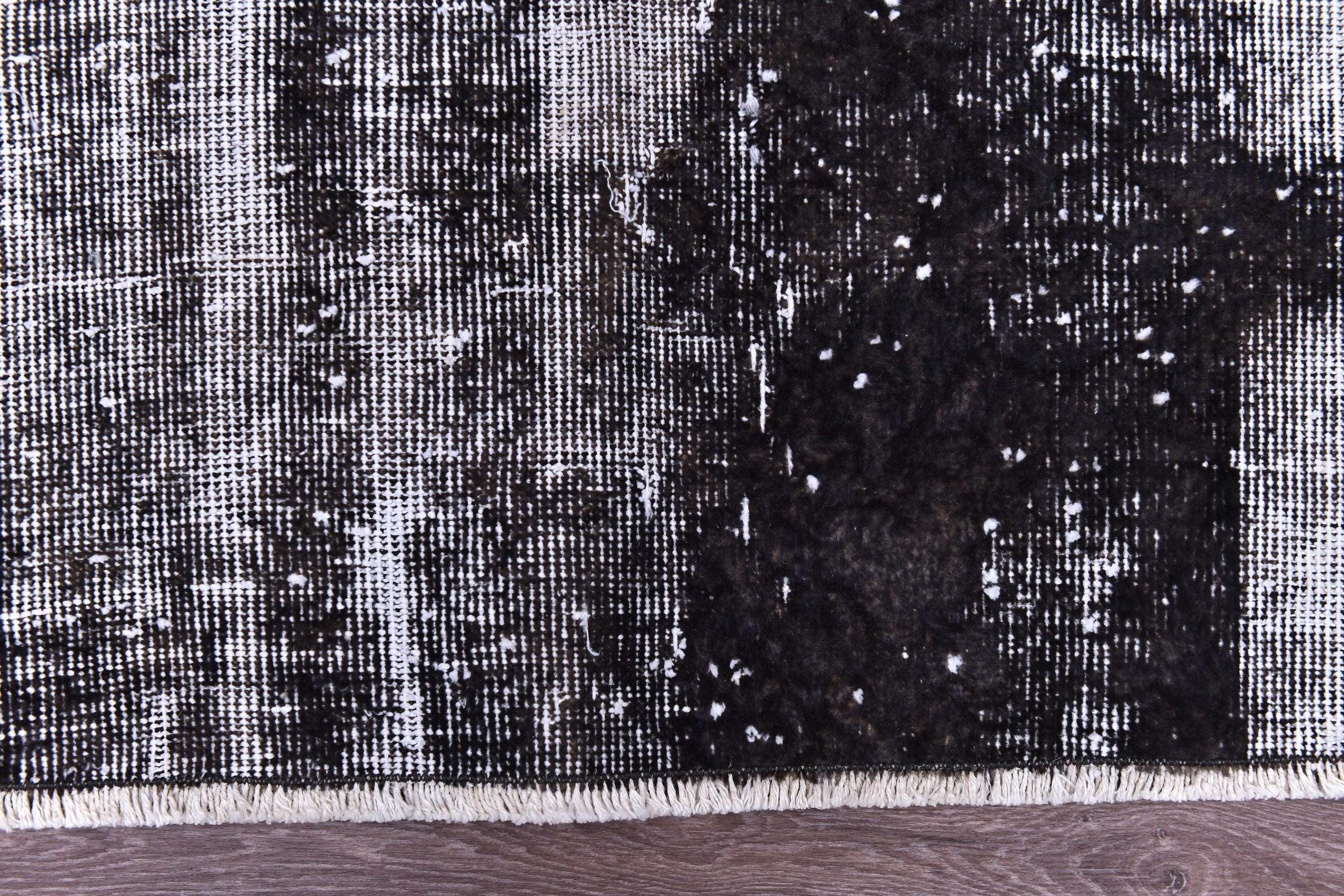 📜📌 A large handmade vintage Turkish overdyed area rug in Black and charcoal tones with heavily distressed white and gray abrash texture across the surface, white knotted fringe edges, displayed on dark hardwood flooring.