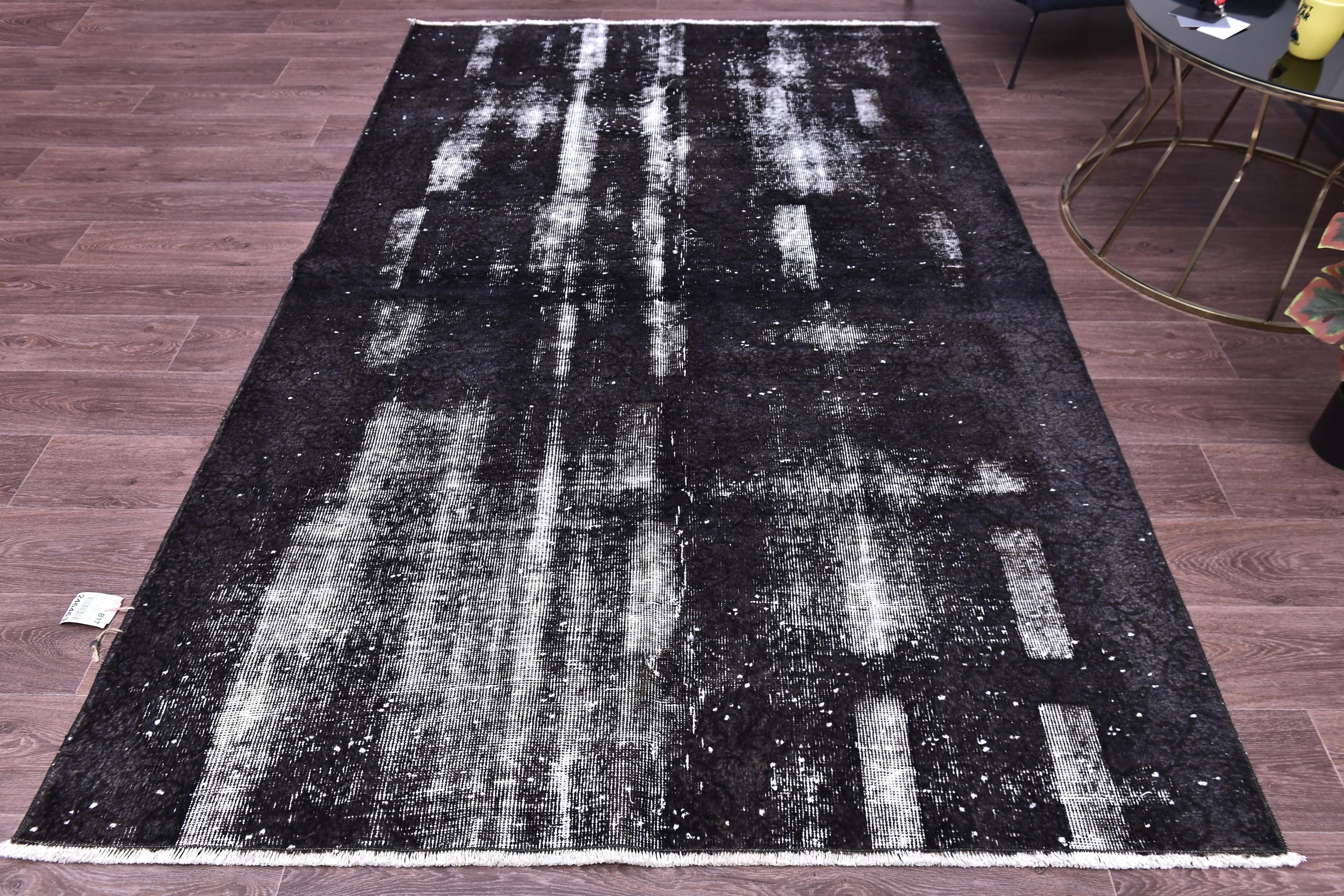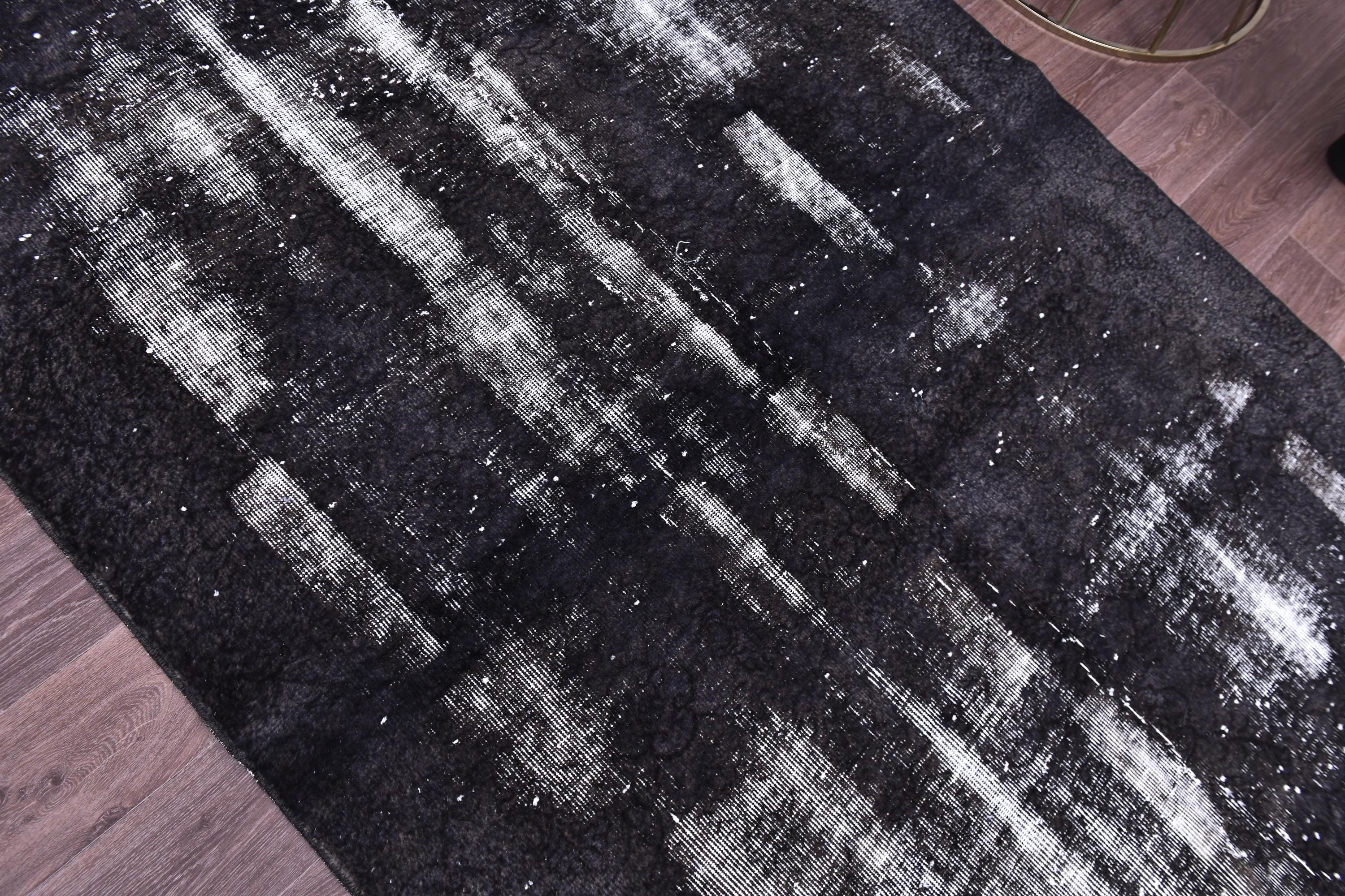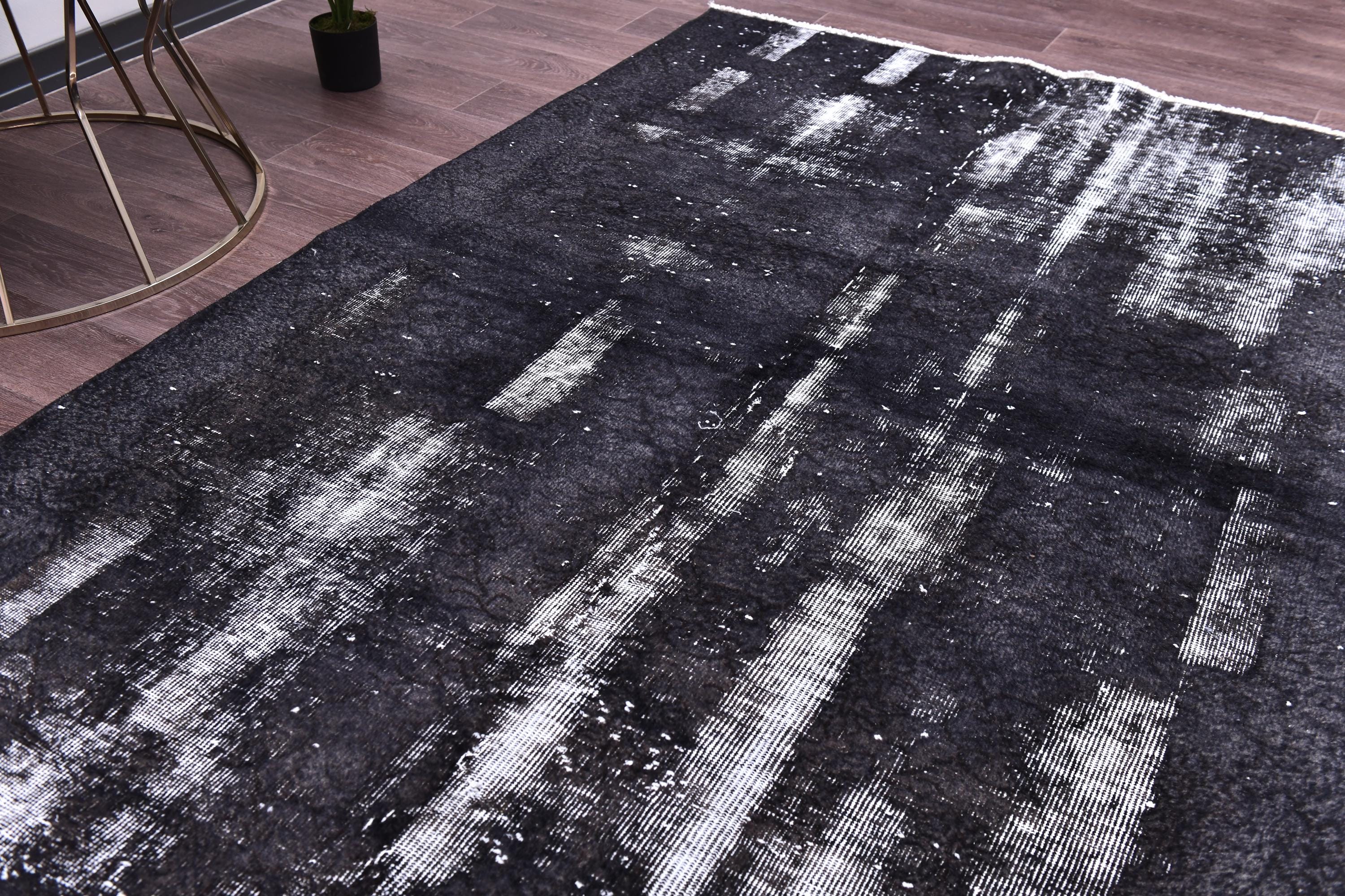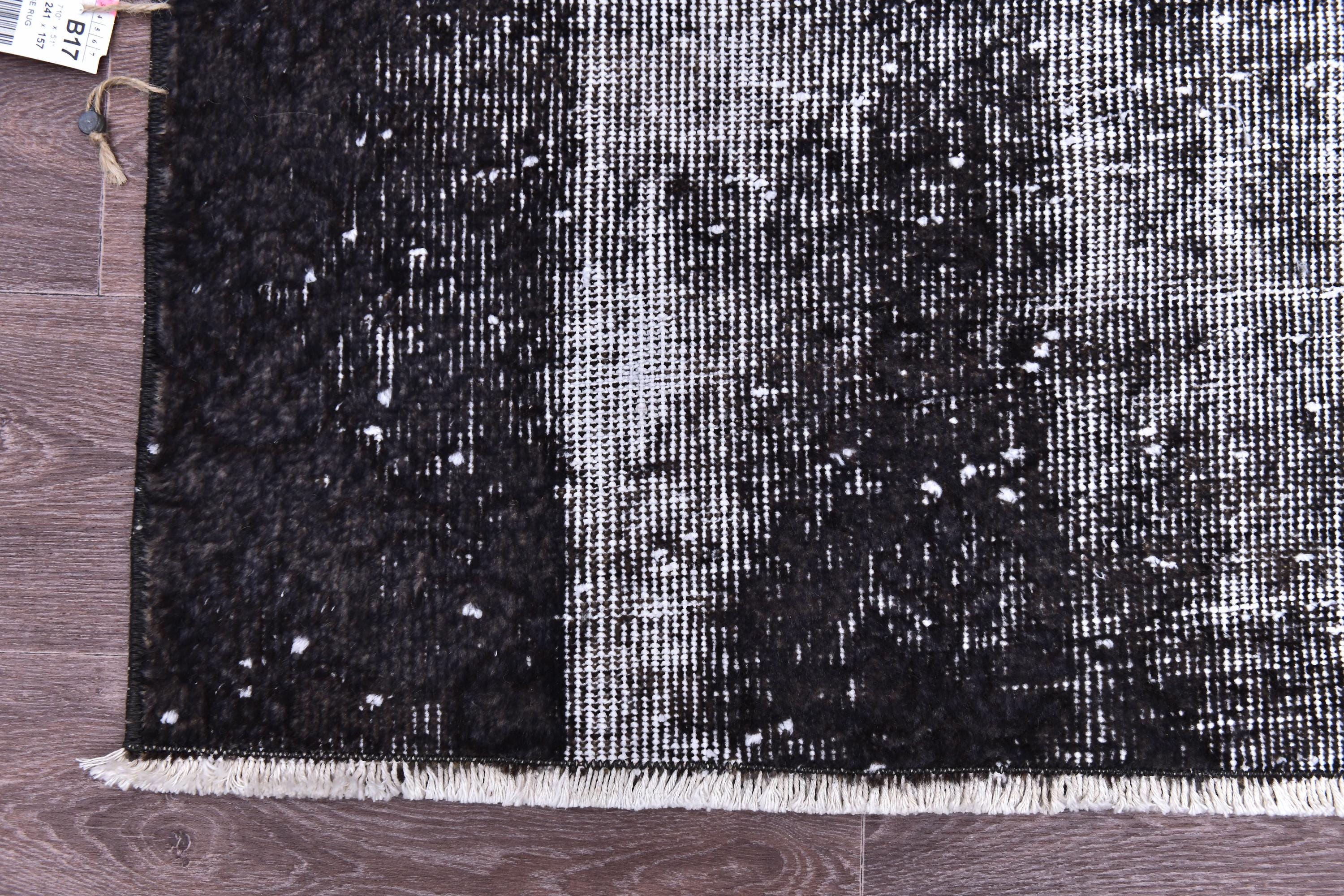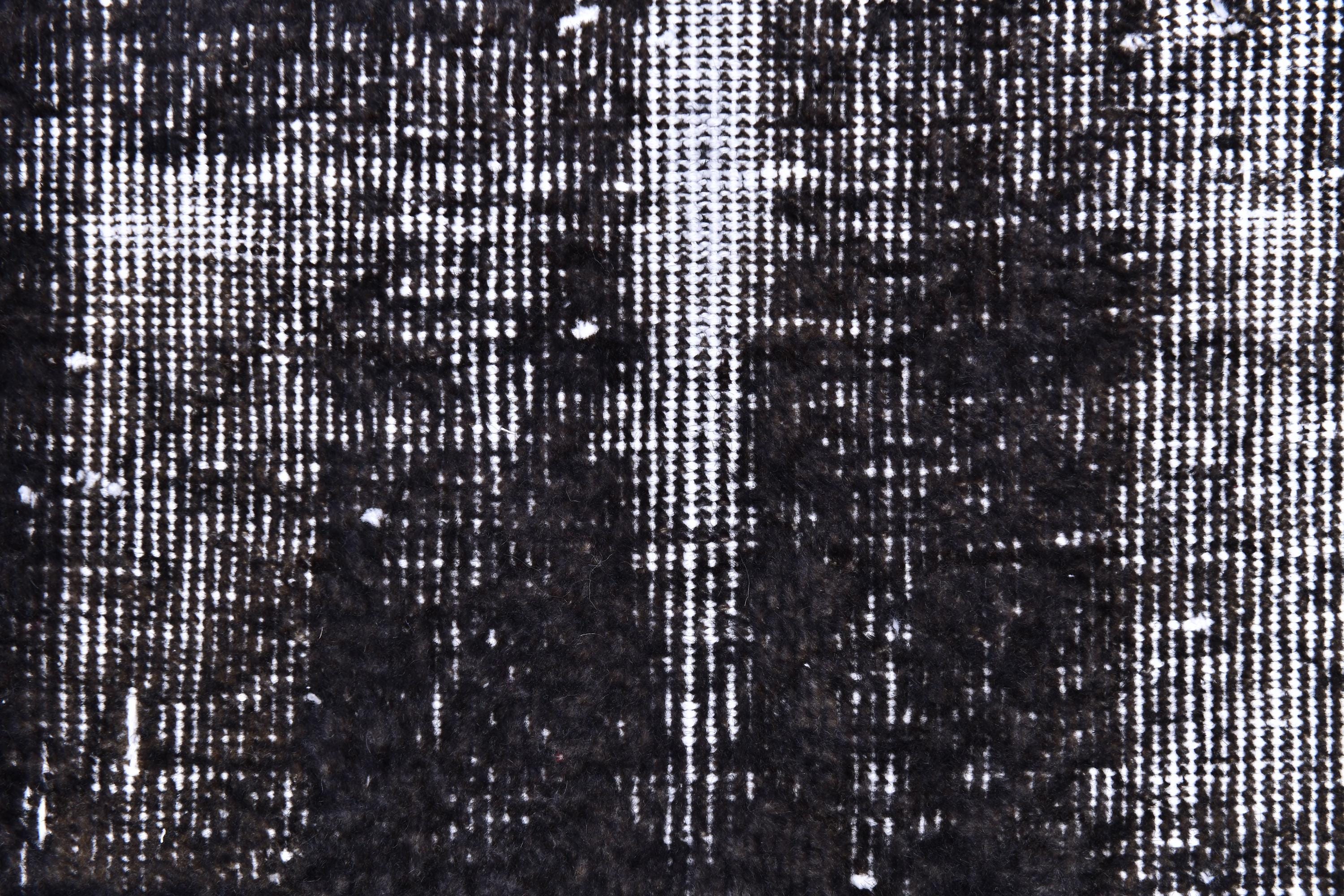 📜📌 A large handmade vintage Turkish overdyed area rug in Black and charcoal tones with heavily distressed white and gray abrash texture across the surface, white knotted fringe edges, displayed on dark hardwood flooring.