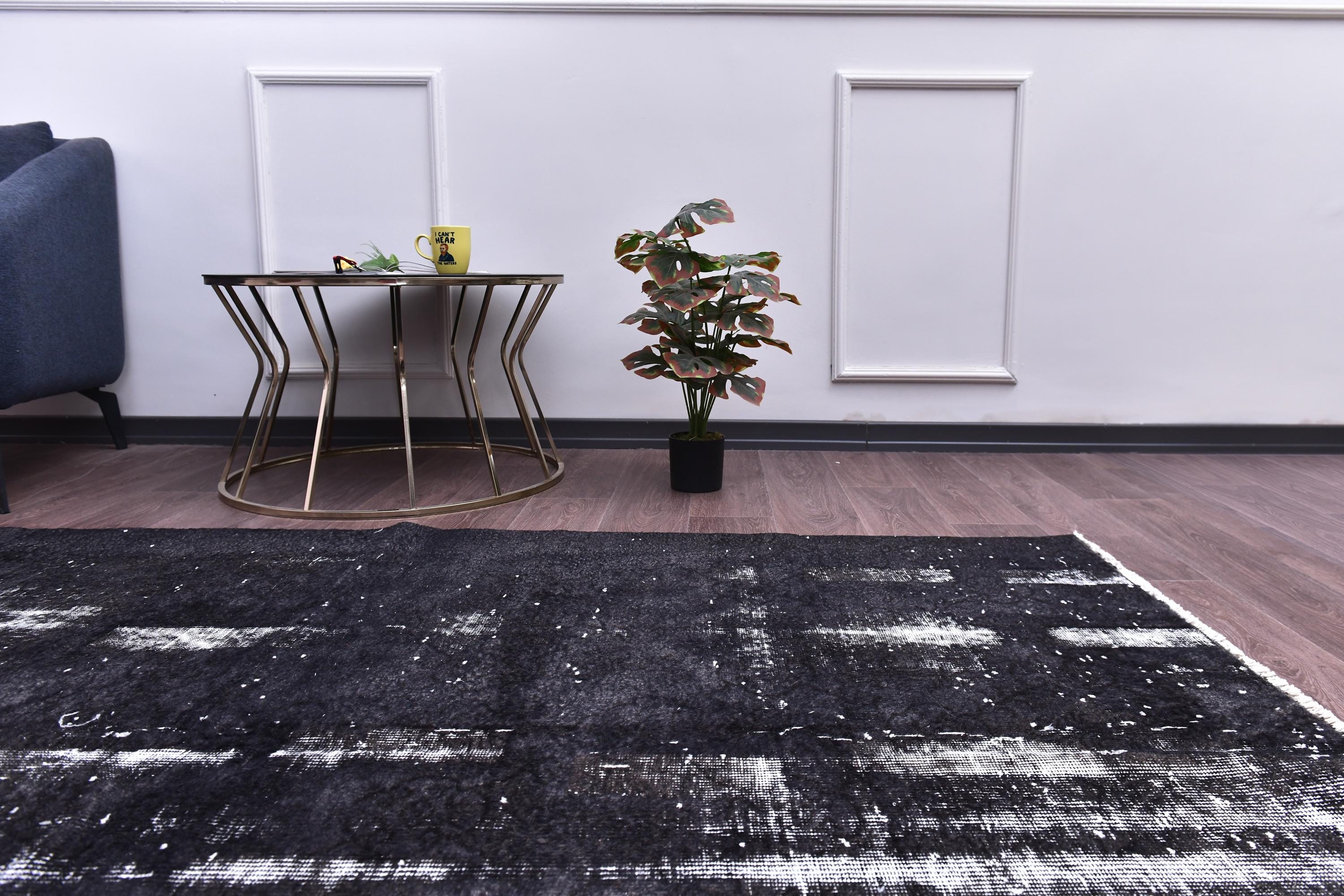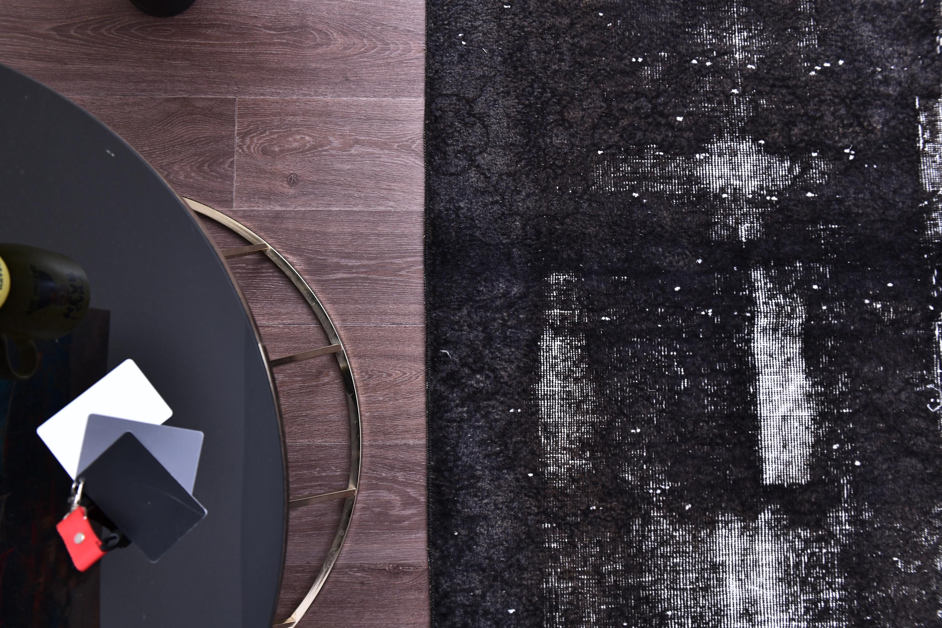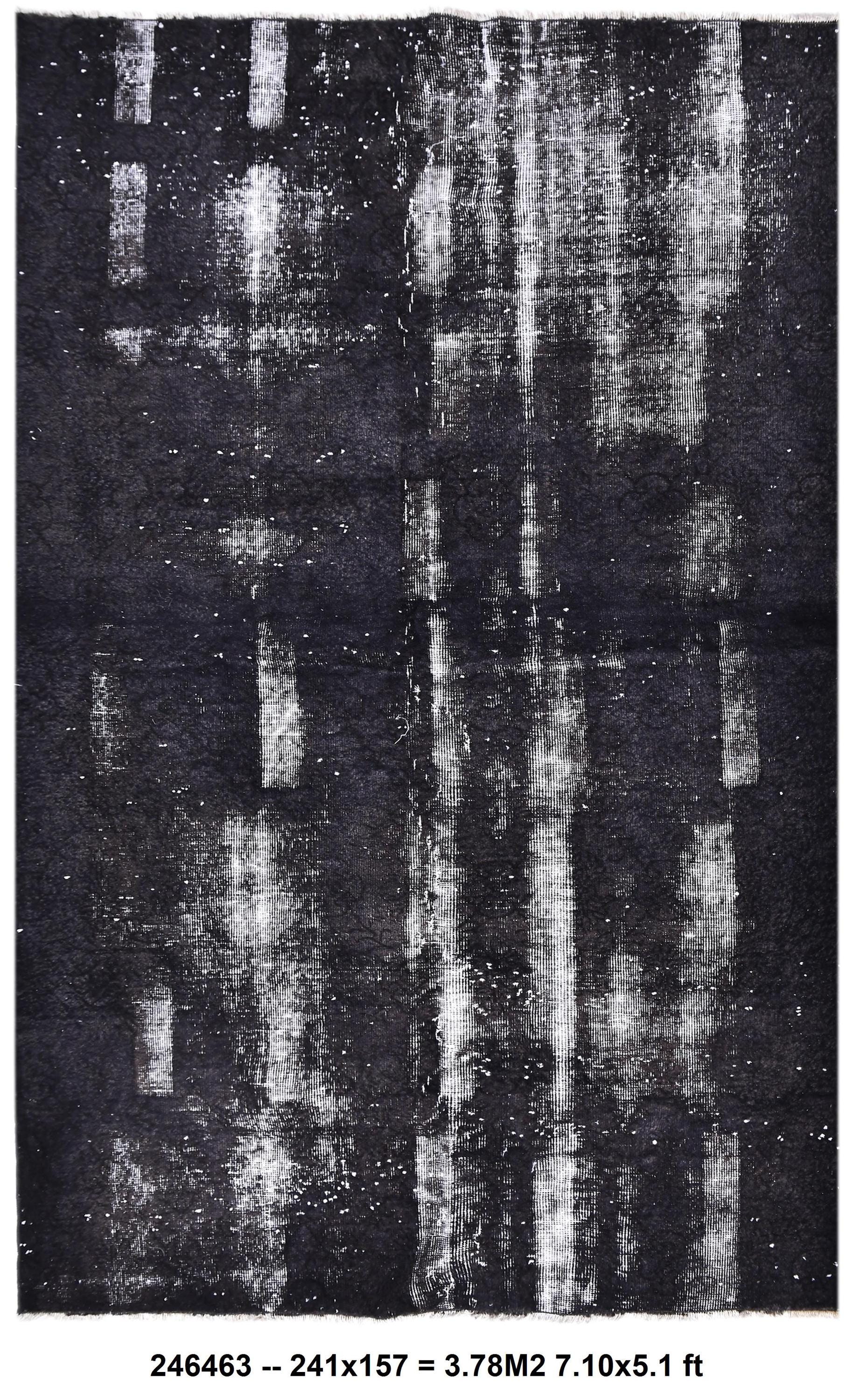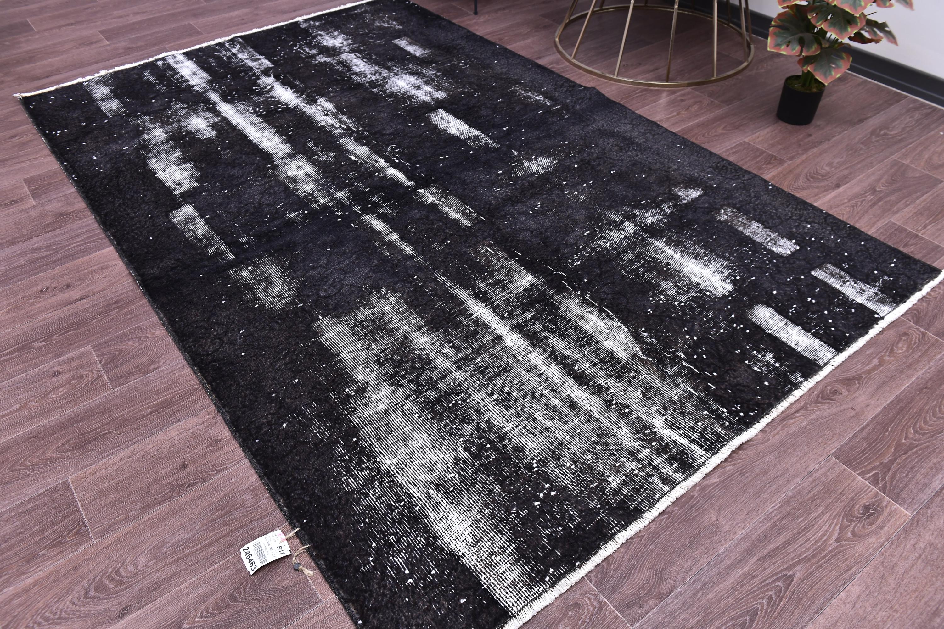 📜📌 A large handmade vintage Turkish overdyed area rug in Black and charcoal tones with heavily distressed white and gray abrash texture across the surface, white knotted fringe edges, displayed on dark hardwood flooring.