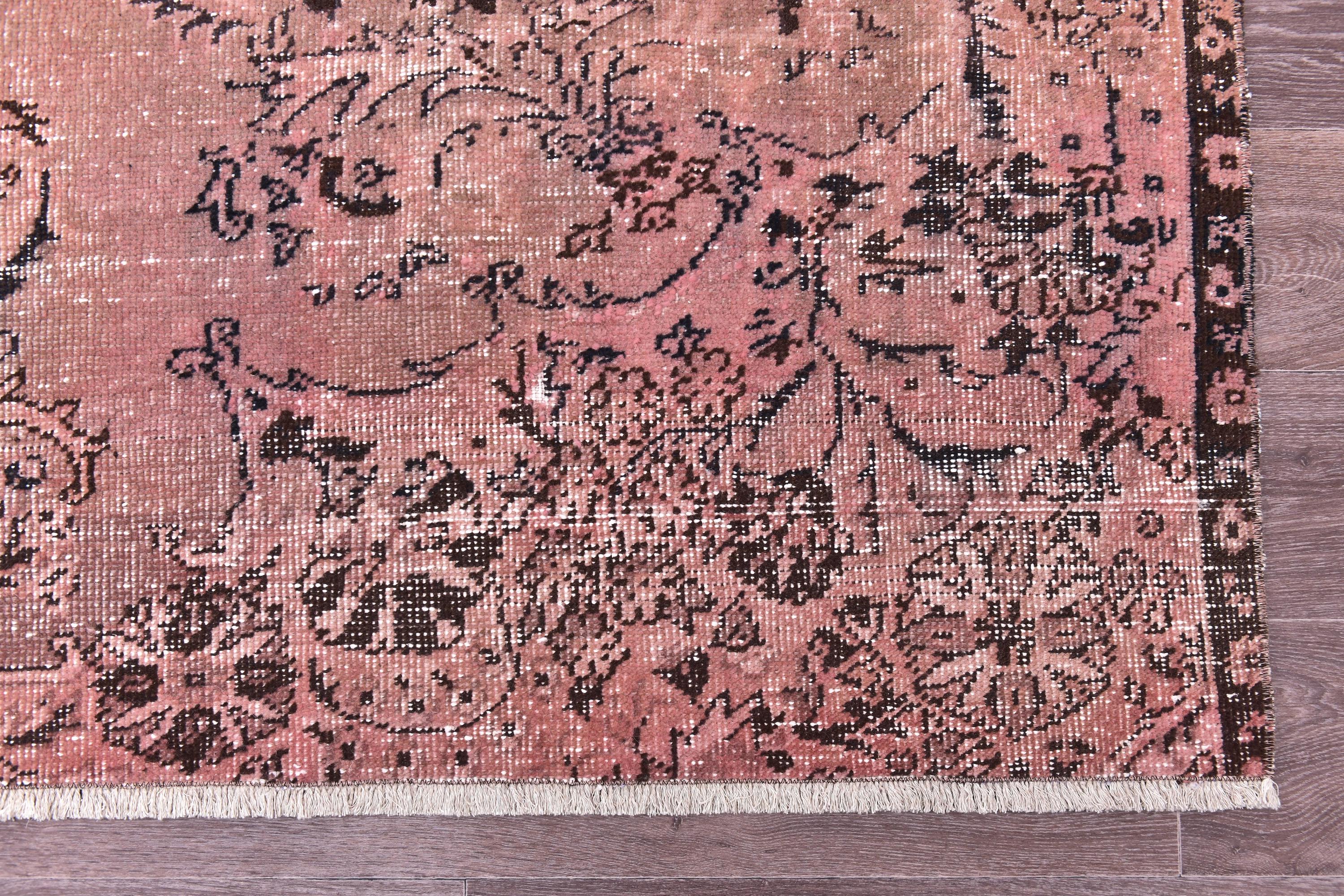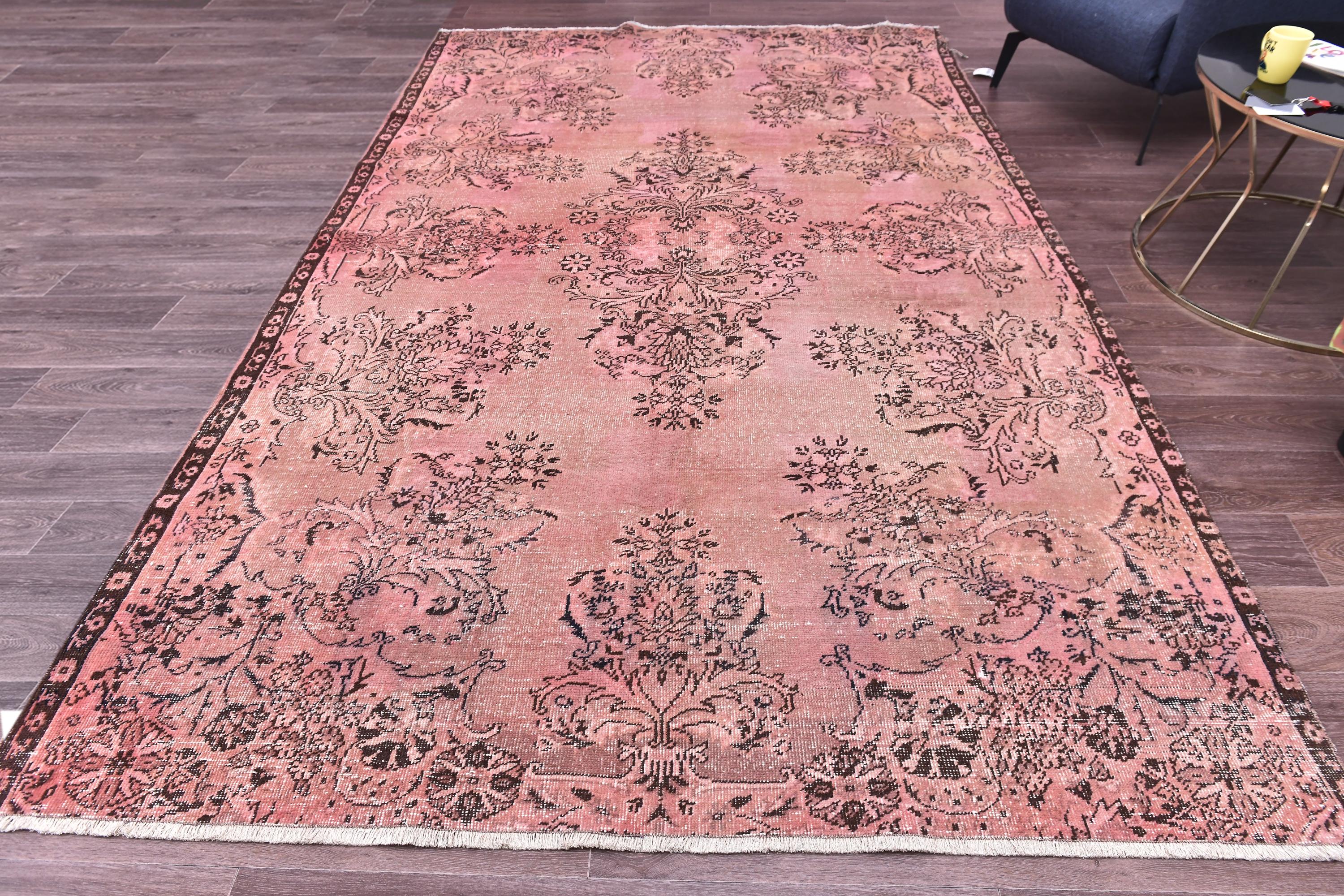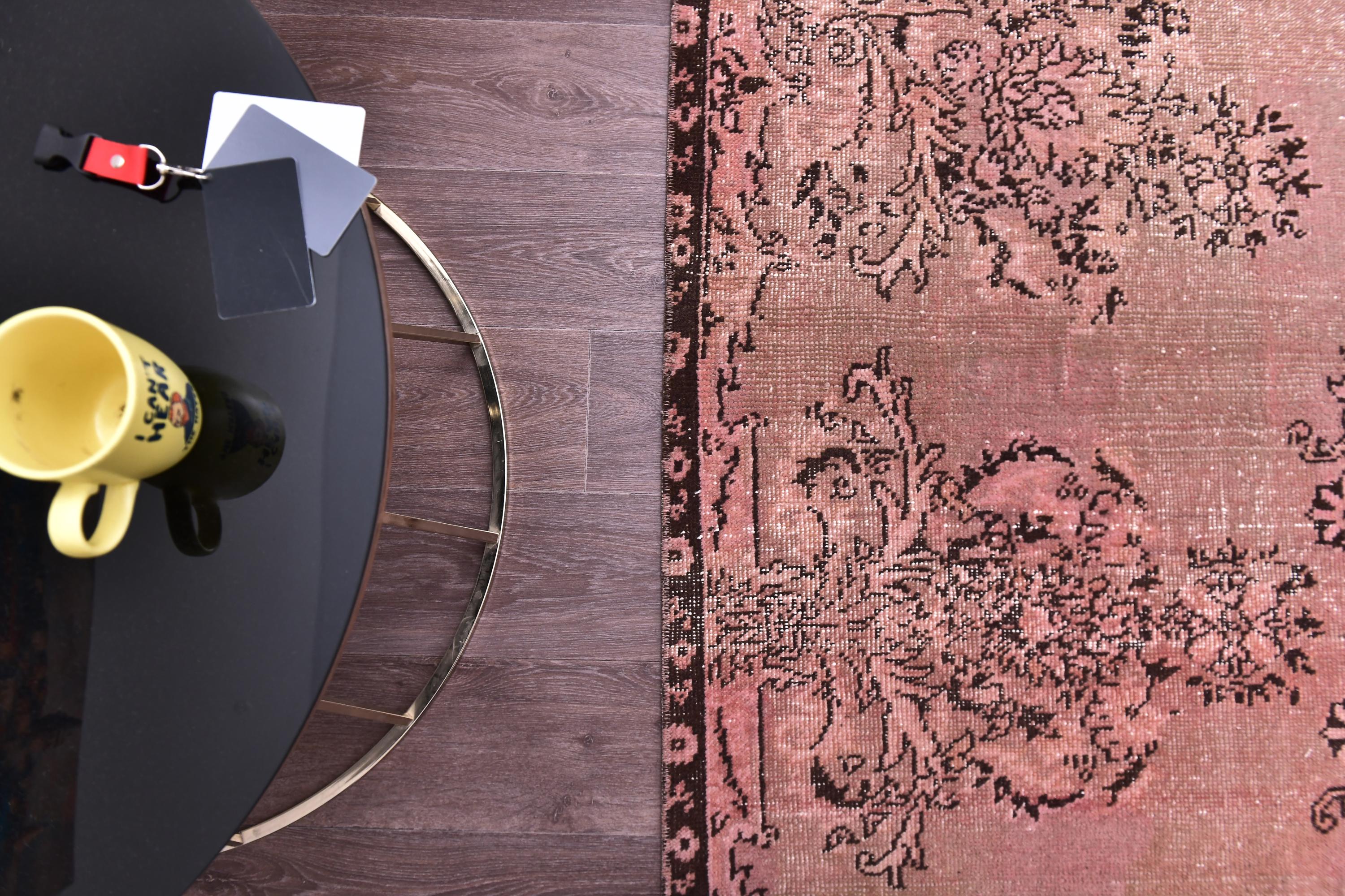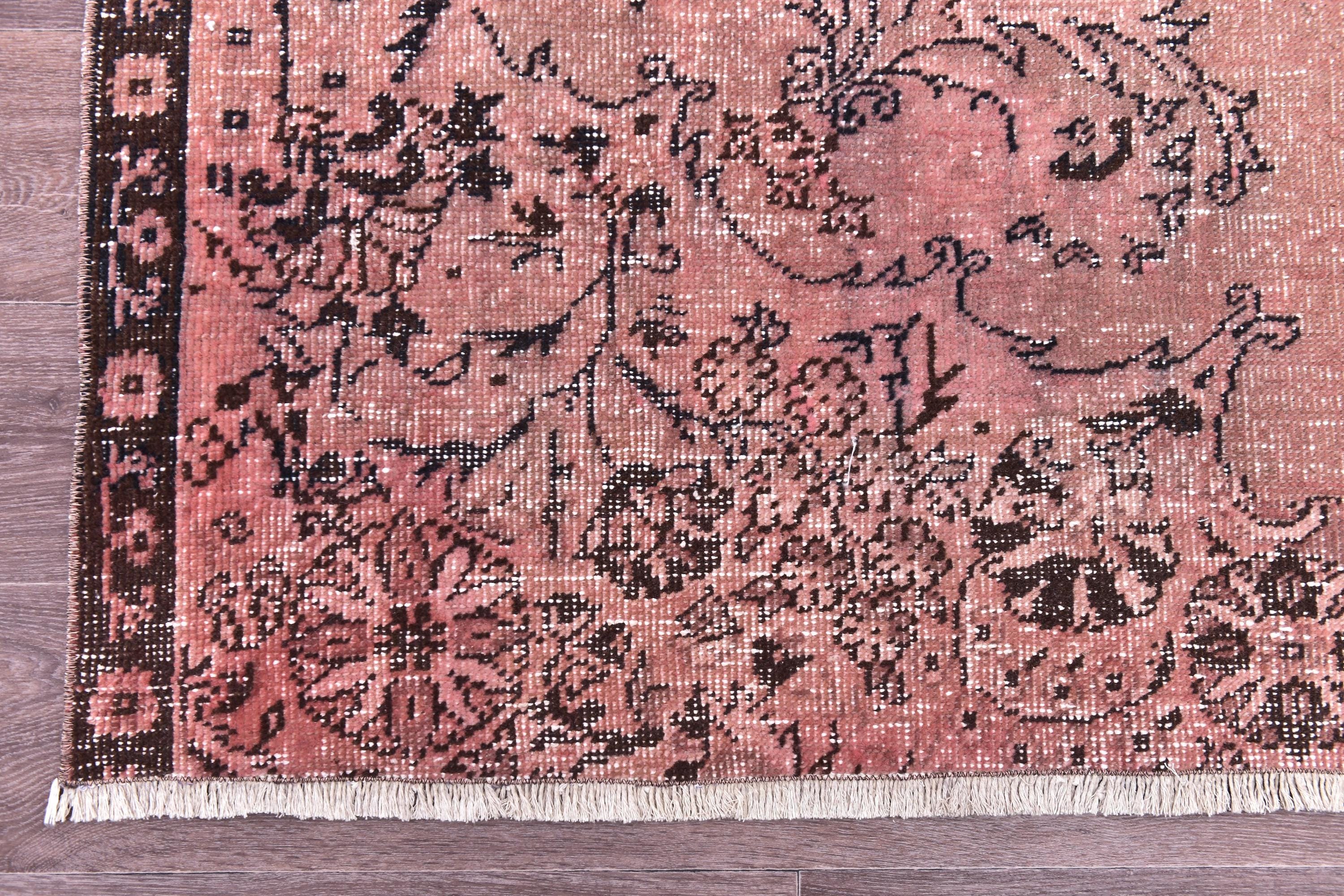 📜📌 Vintage Turkish overdyed area rug in rich salmon and brown colors featuring distressed traditional floral medallion patterns. Hand-knotted wool Oushak carpet with worn antique appearance, white fringe edges, displayed on dark wood floor next to modern gold furniture. Bohemian home decor.