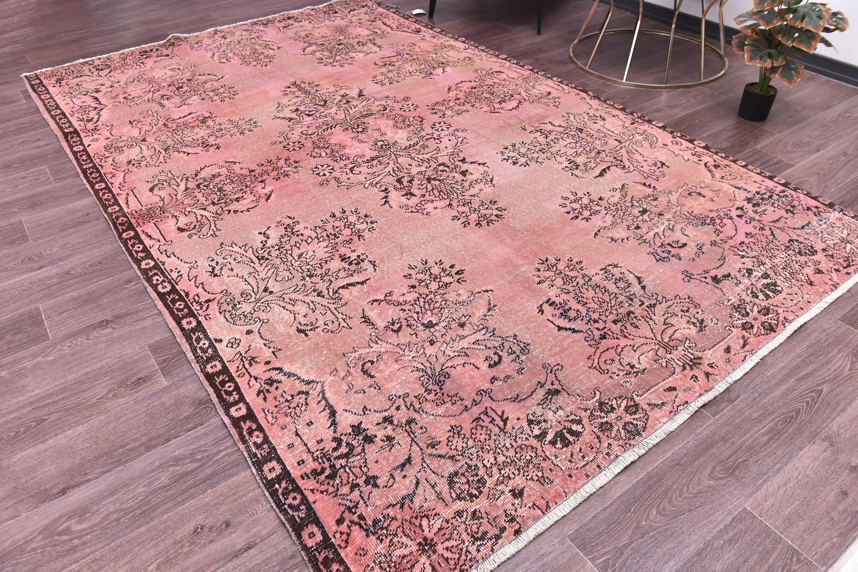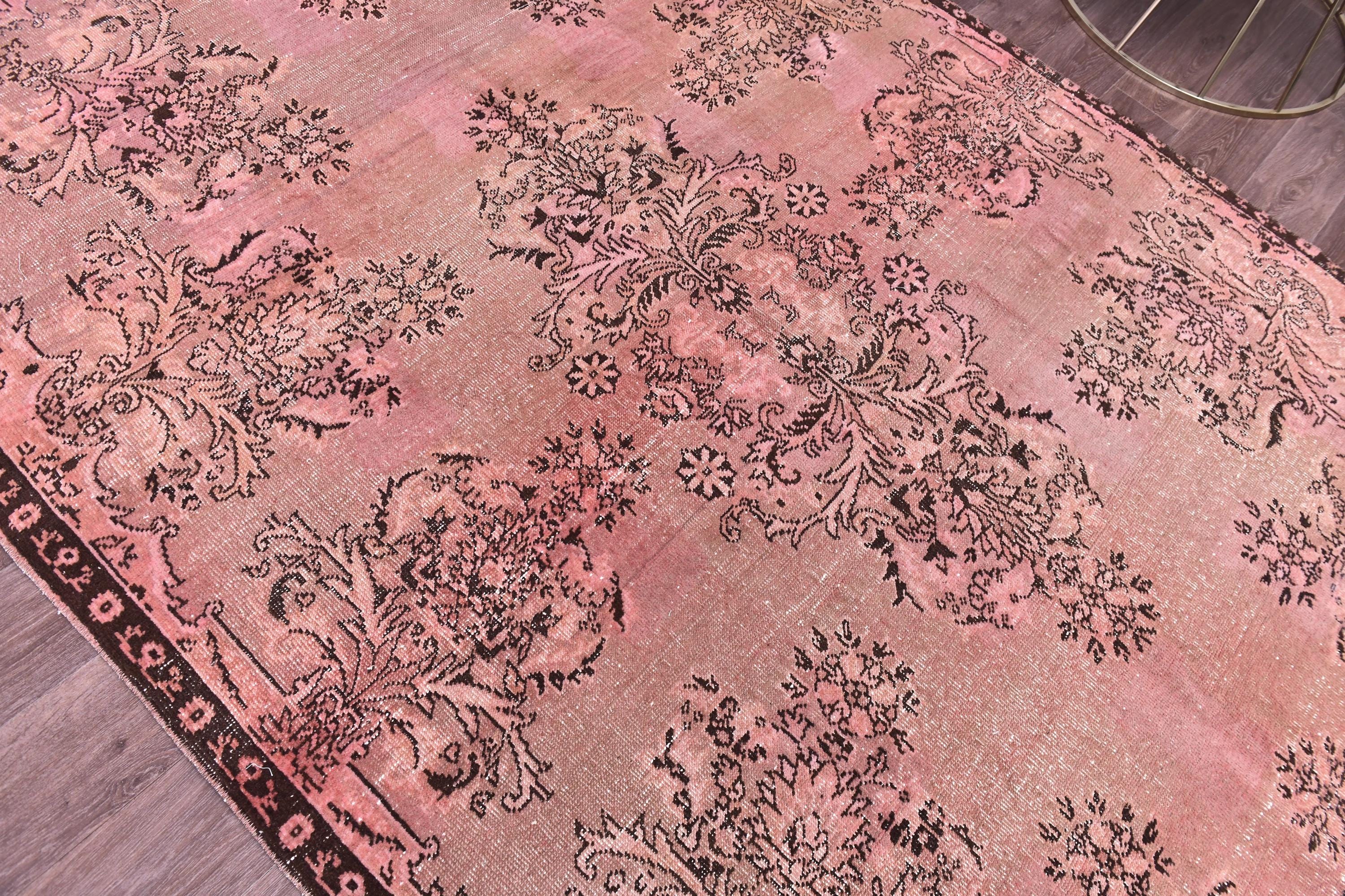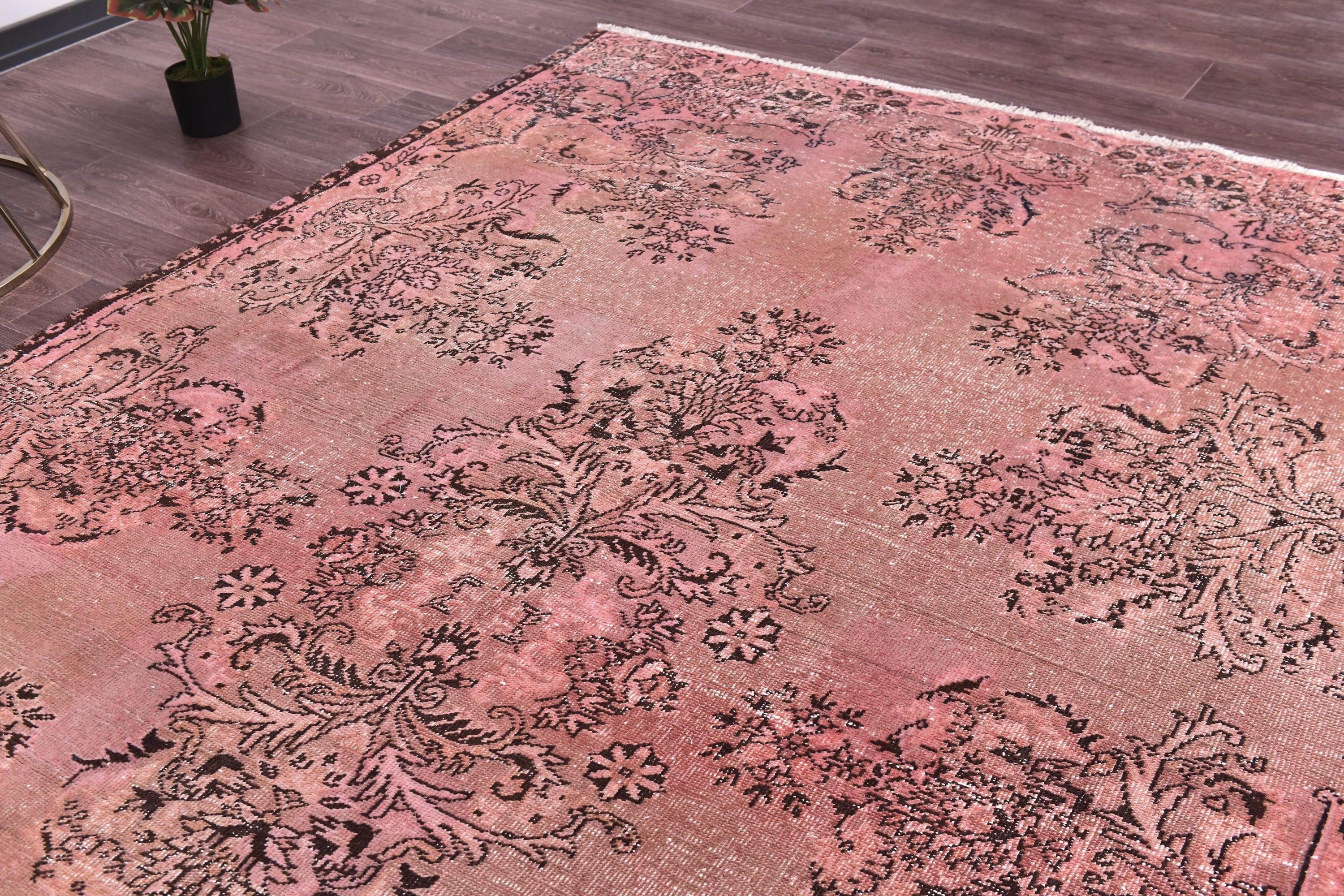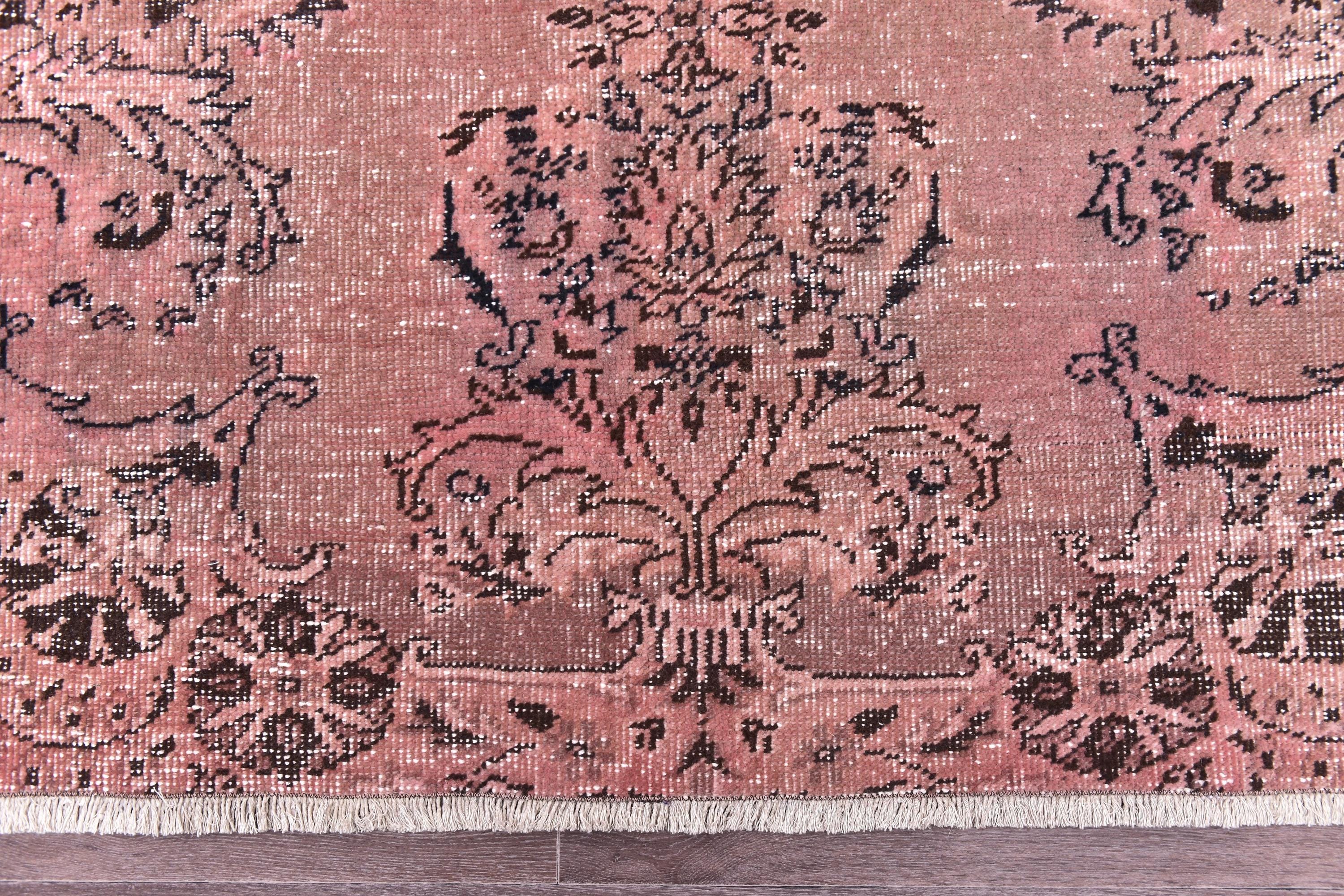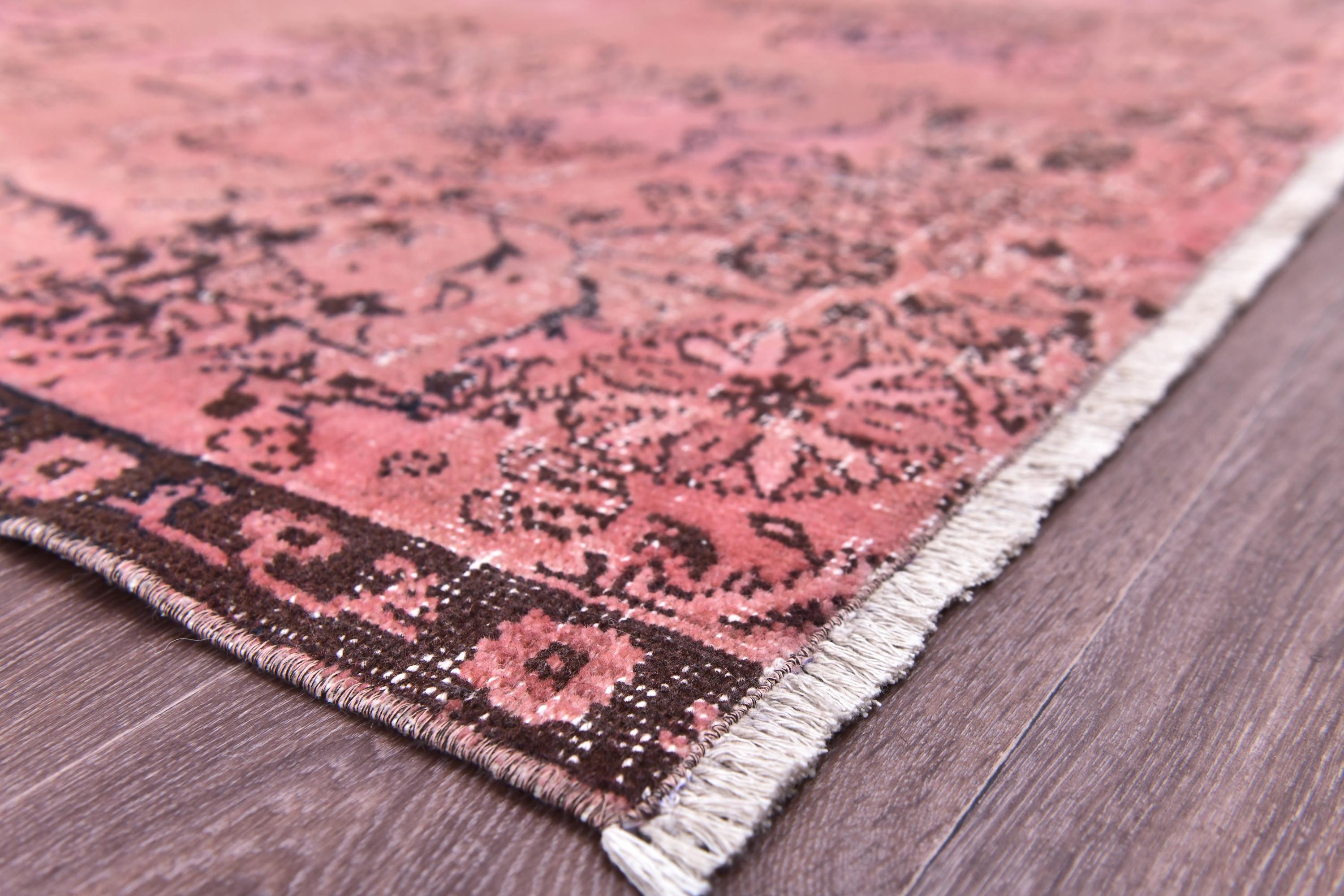 📜📌 Vintage Turkish overdyed area rug in rich salmon and brown colors featuring distressed traditional floral medallion patterns. Hand-knotted wool Oushak carpet with worn antique appearance, white fringe edges, displayed on dark wood floor next to modern gold furniture. Bohemian home decor.