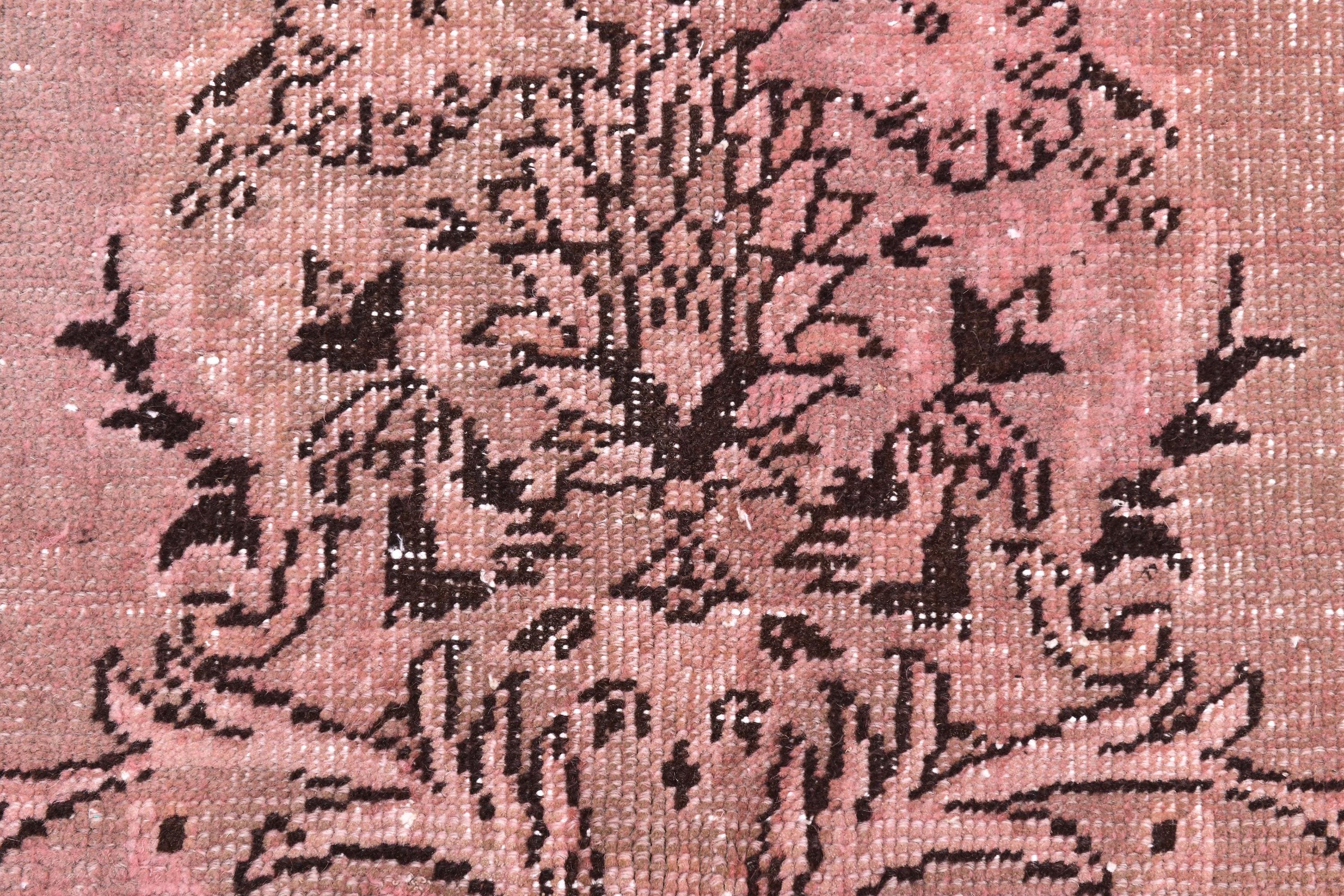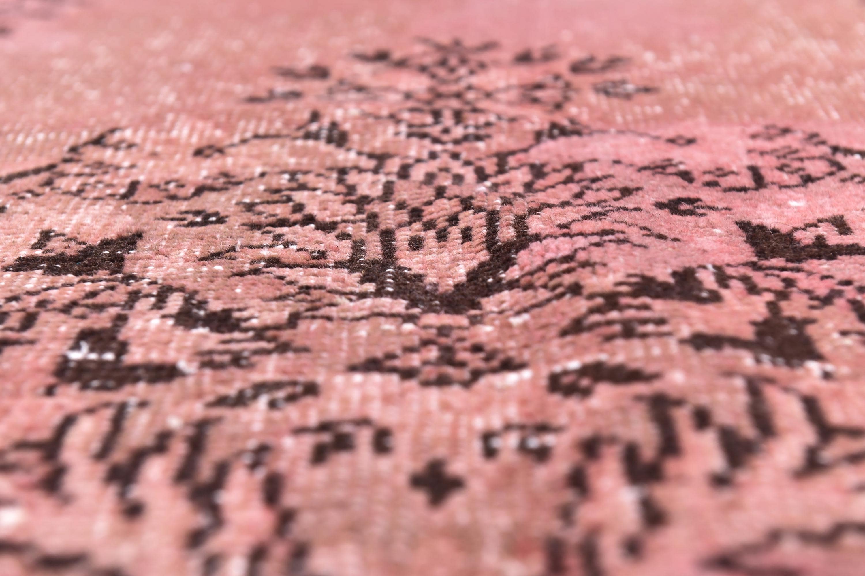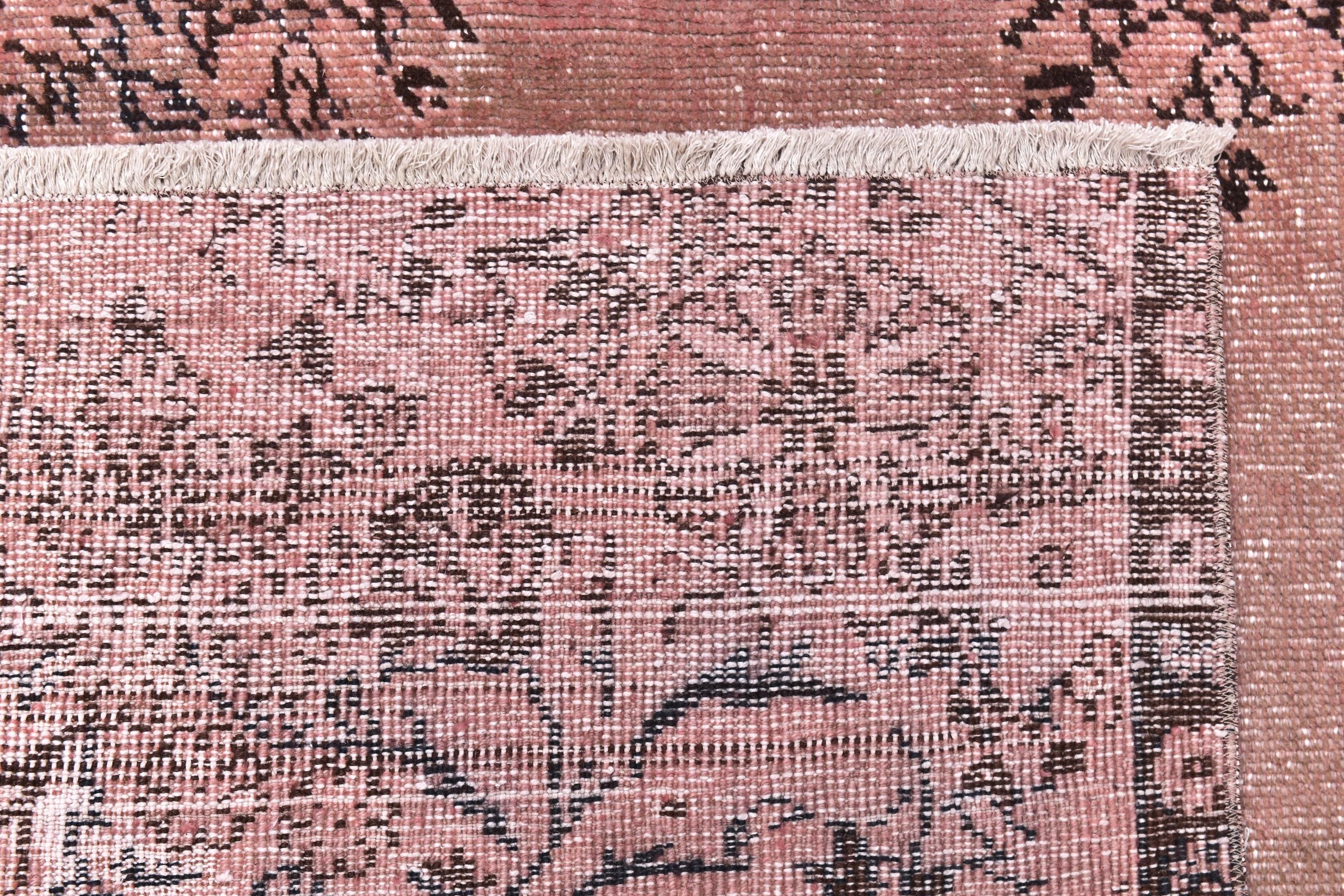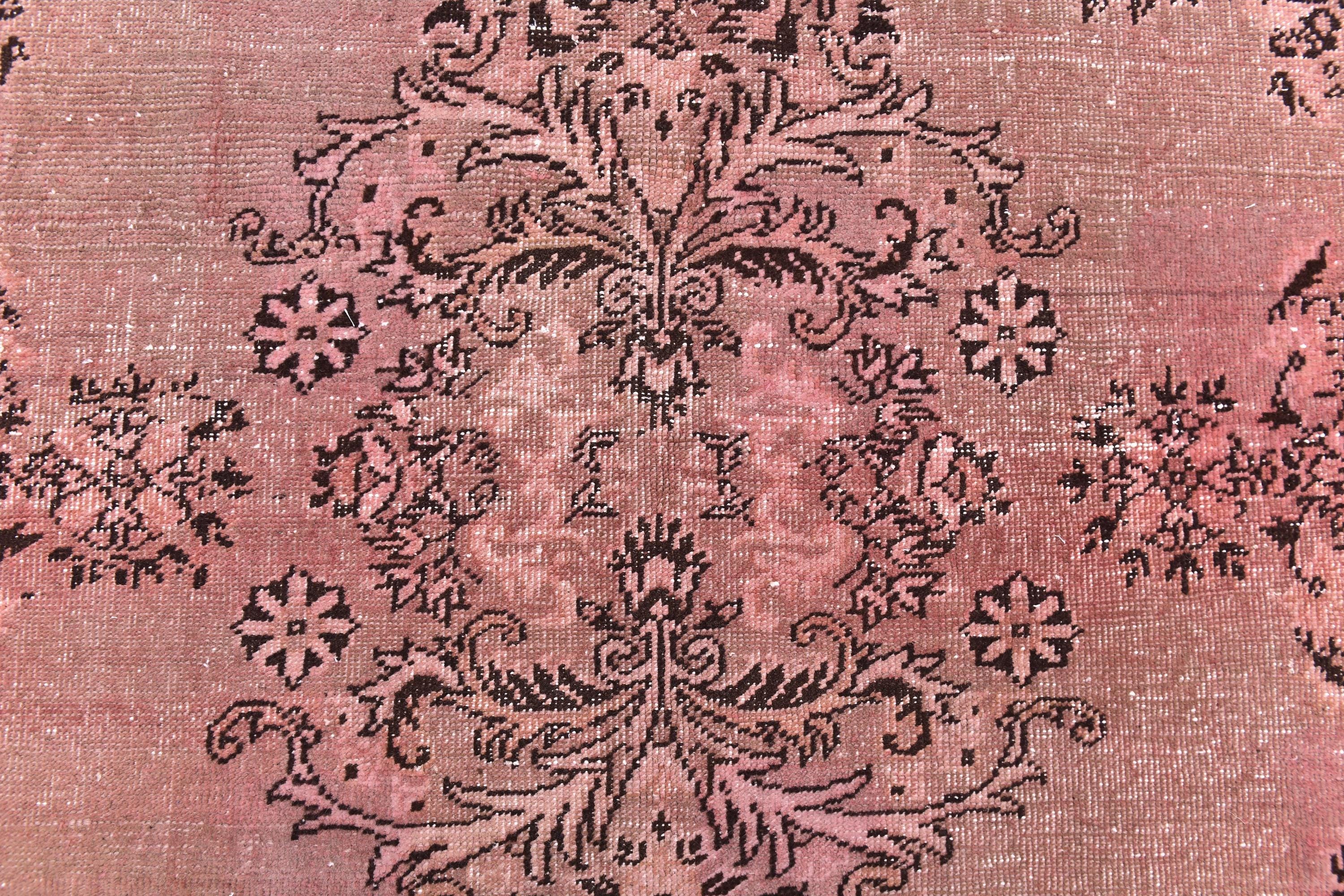 📜📌 Vintage Turkish overdyed area rug in rich salmon and brown colors featuring distressed traditional floral medallion patterns. Hand-knotted wool Oushak carpet with worn antique appearance, white fringe edges, displayed on dark wood floor next to modern gold furniture. Bohemian home decor.
