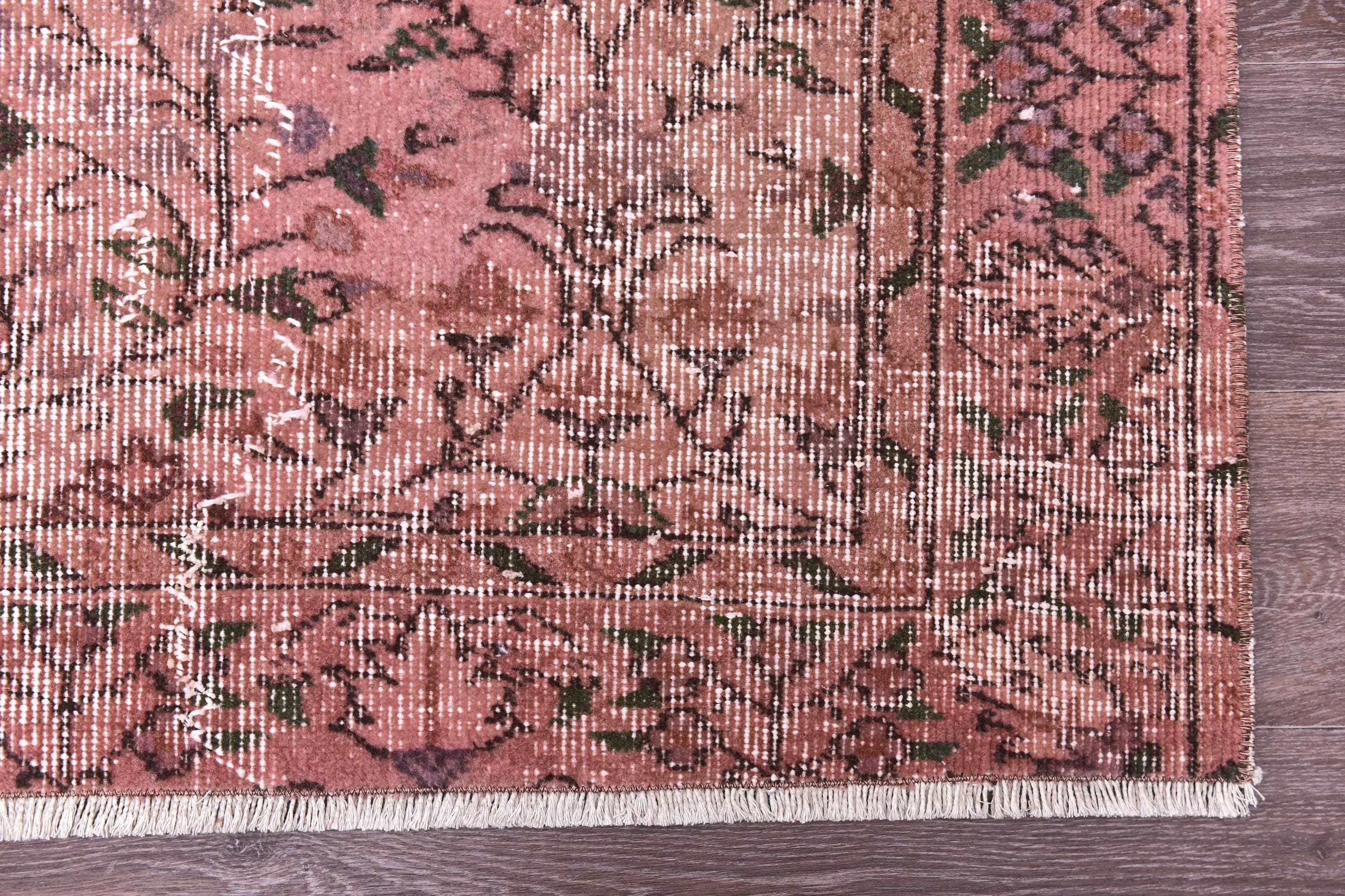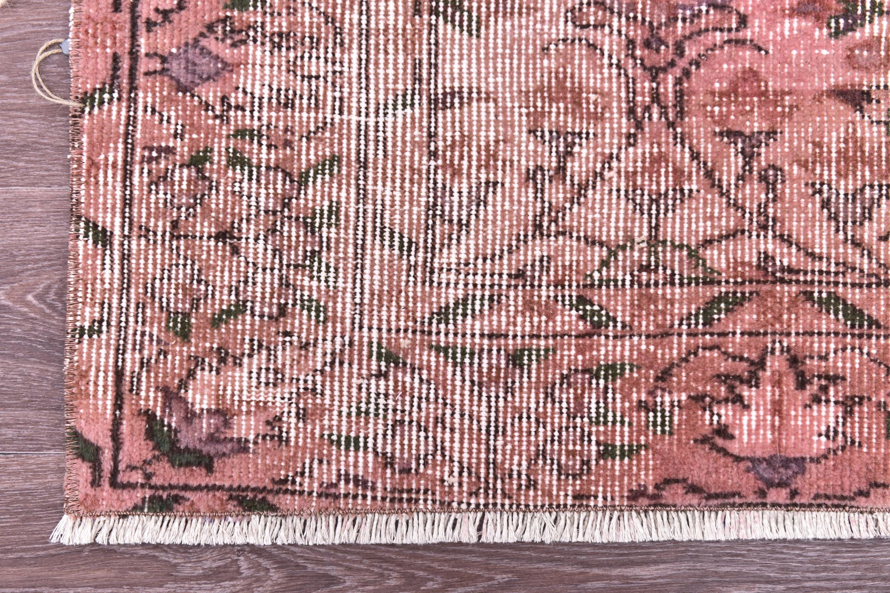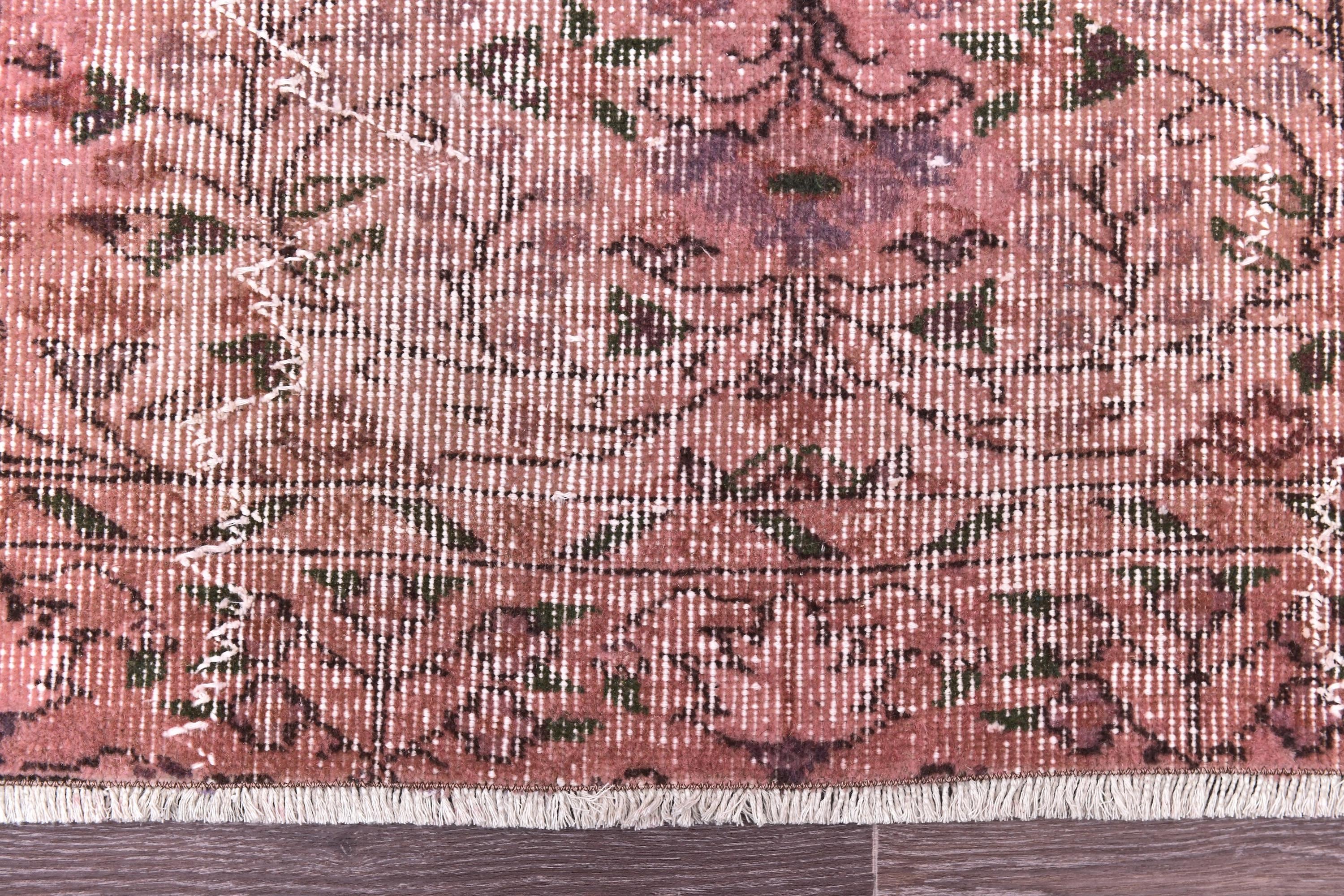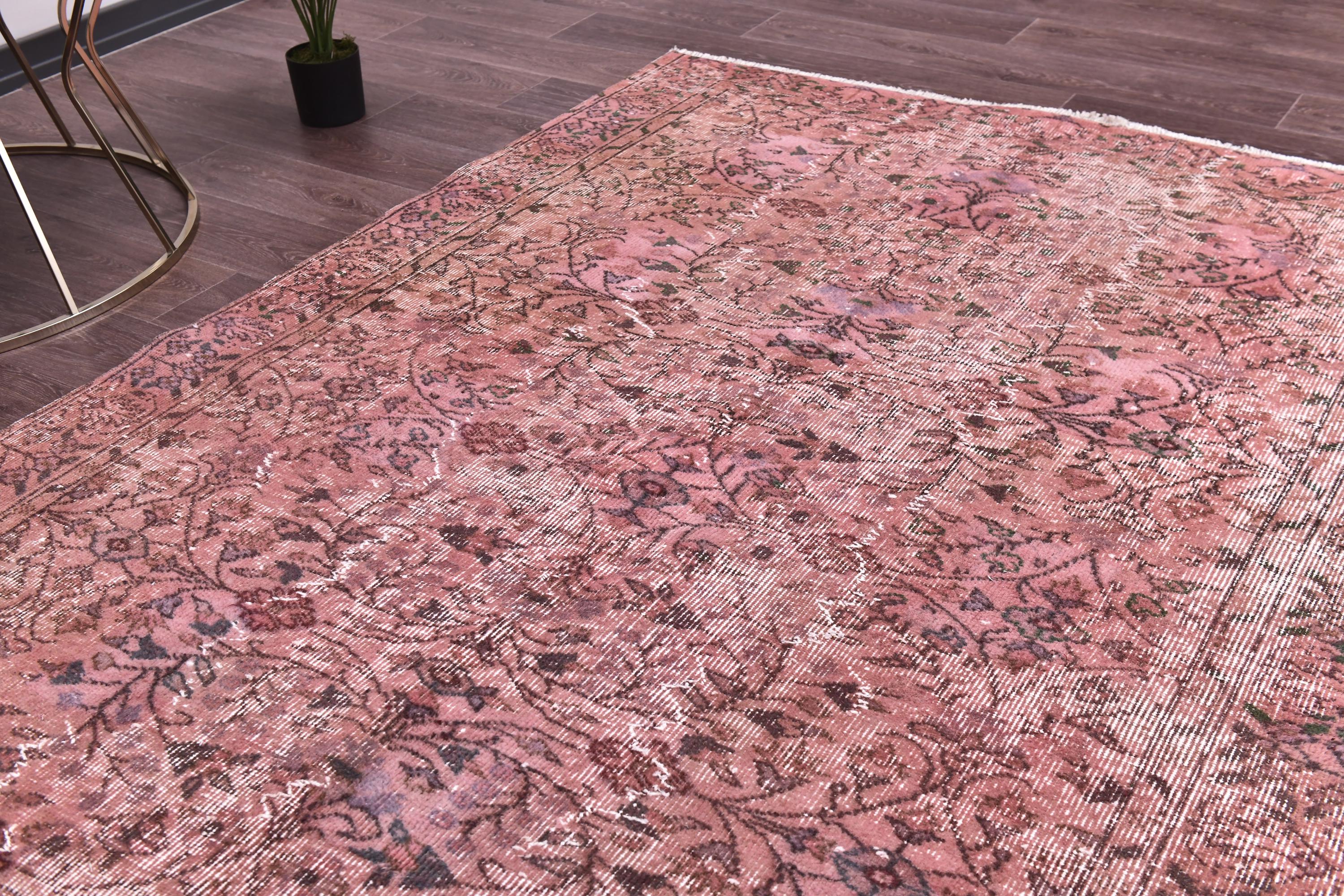 📜📌 Vintage Turkish overdyed area rug in rich salmon and brown colors featuring distressed traditional floral medallion patterns. Hand-knotted wool Oushak carpet with worn antique appearance, white fringe edges, displayed on dark wood floor next to modern gold furniture. Bohemian home decor.