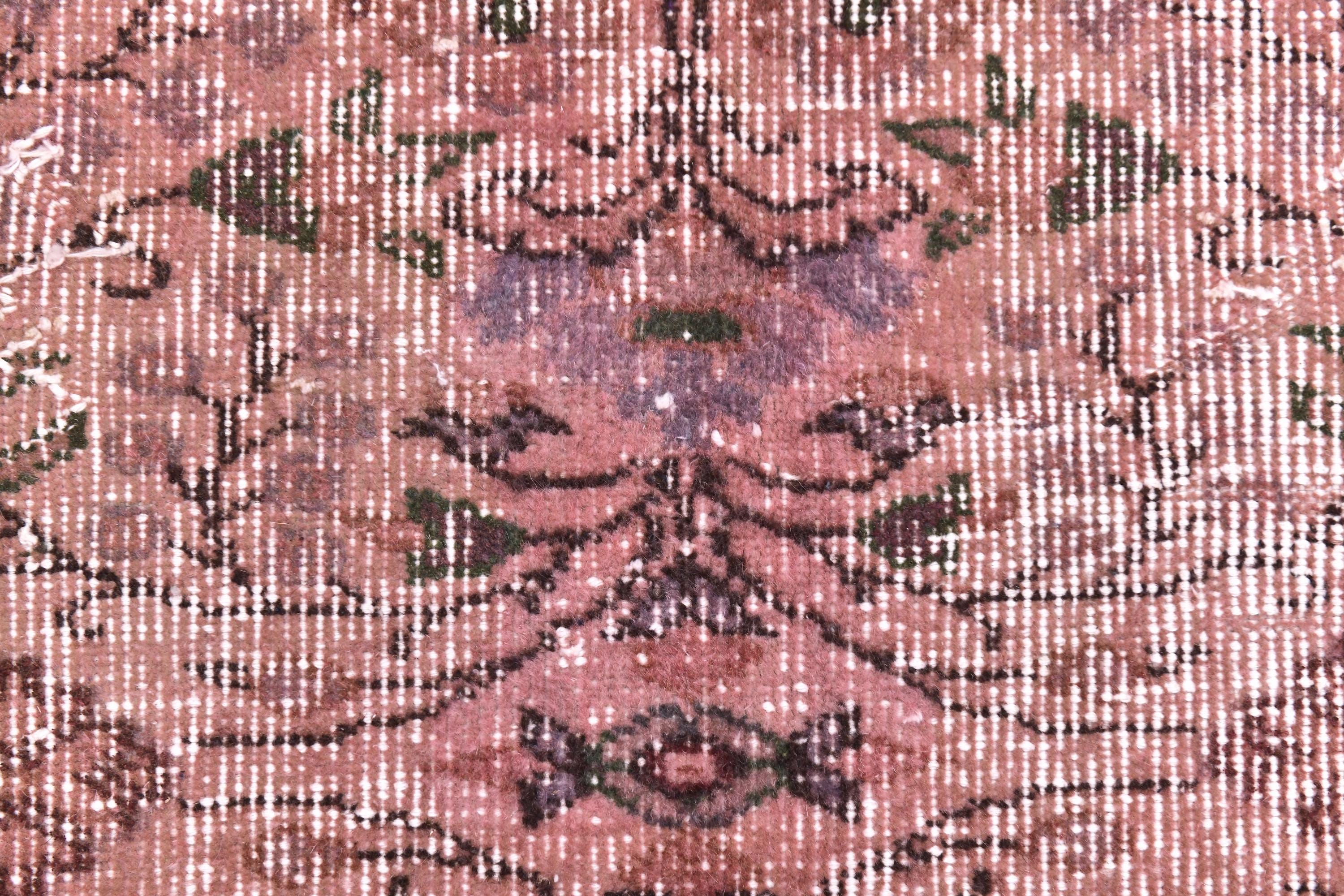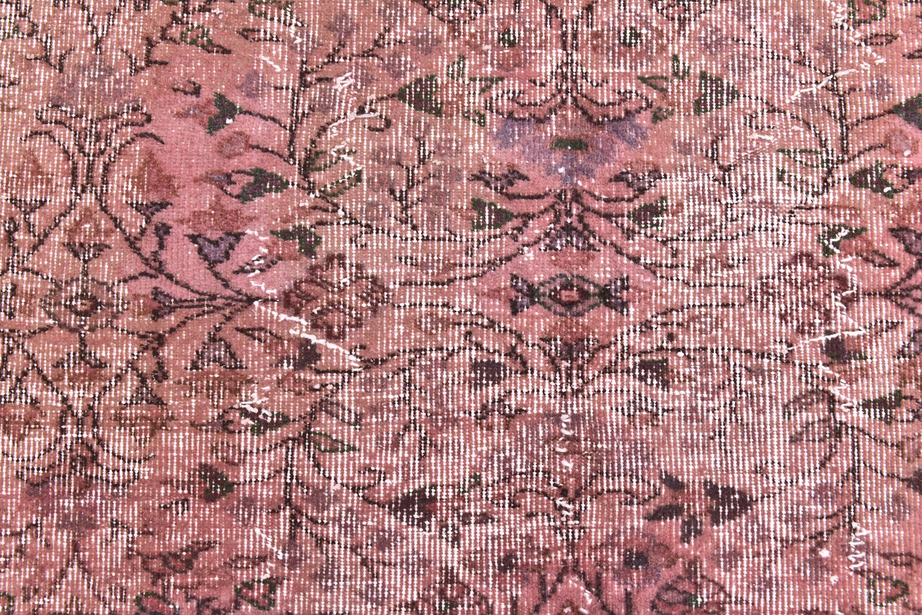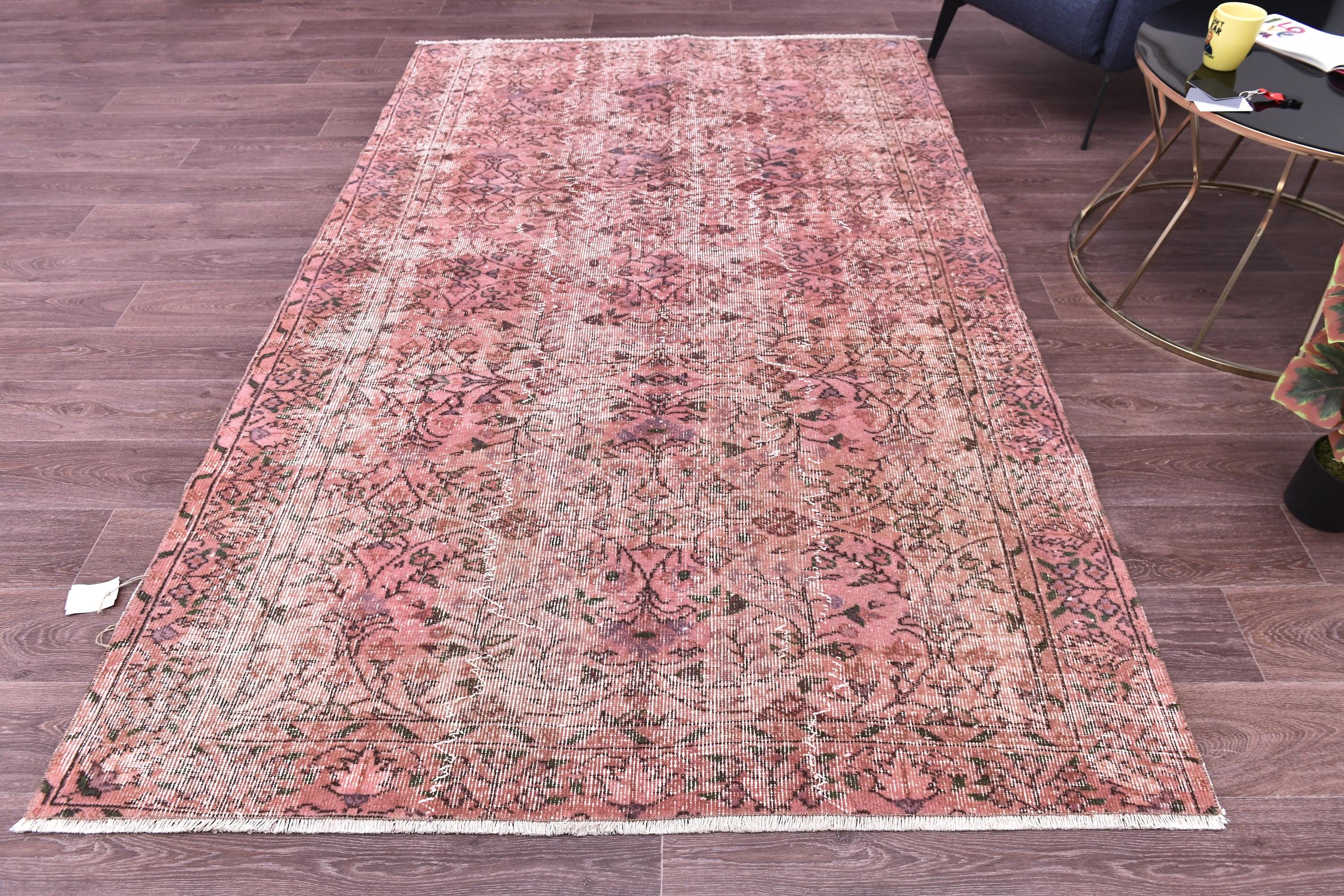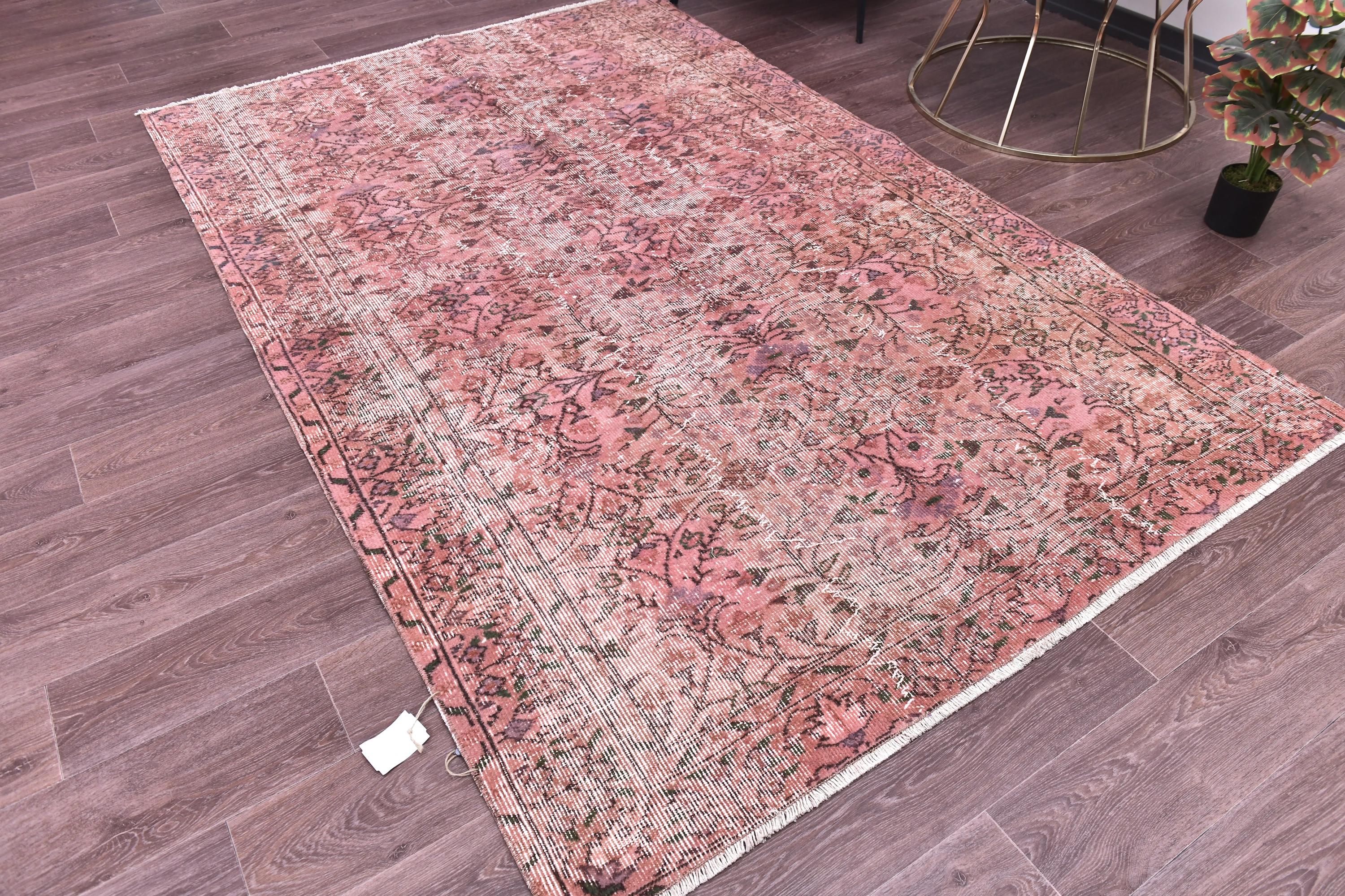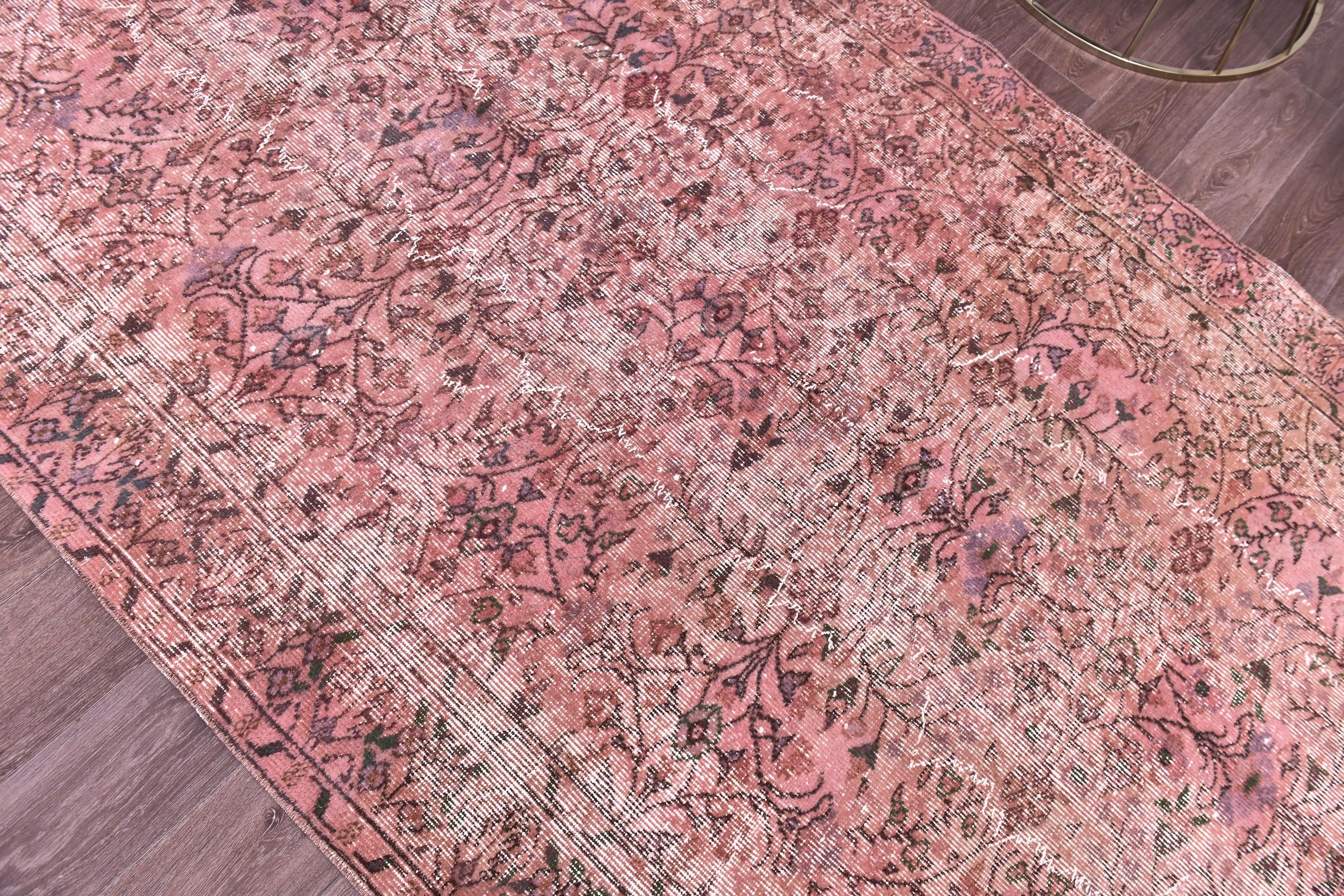 📜📌 Vintage Turkish overdyed area rug in rich salmon and brown colors featuring distressed traditional floral medallion patterns. Hand-knotted wool Oushak carpet with worn antique appearance, white fringe edges, displayed on dark wood floor next to modern gold furniture. Bohemian home decor.