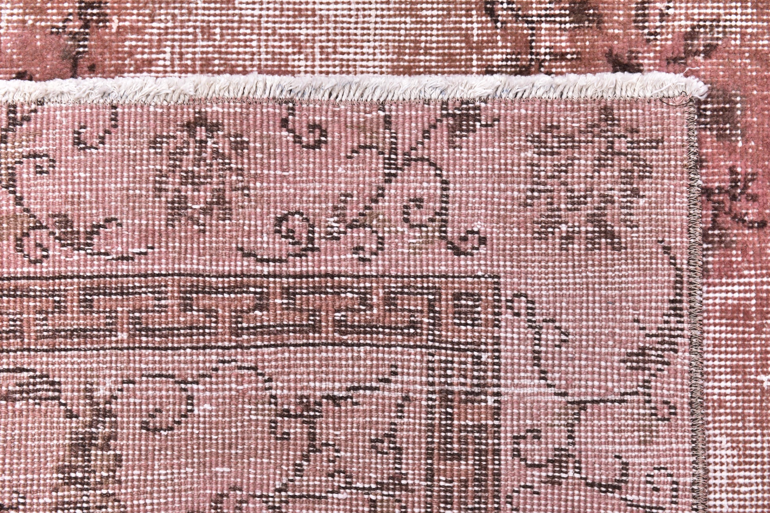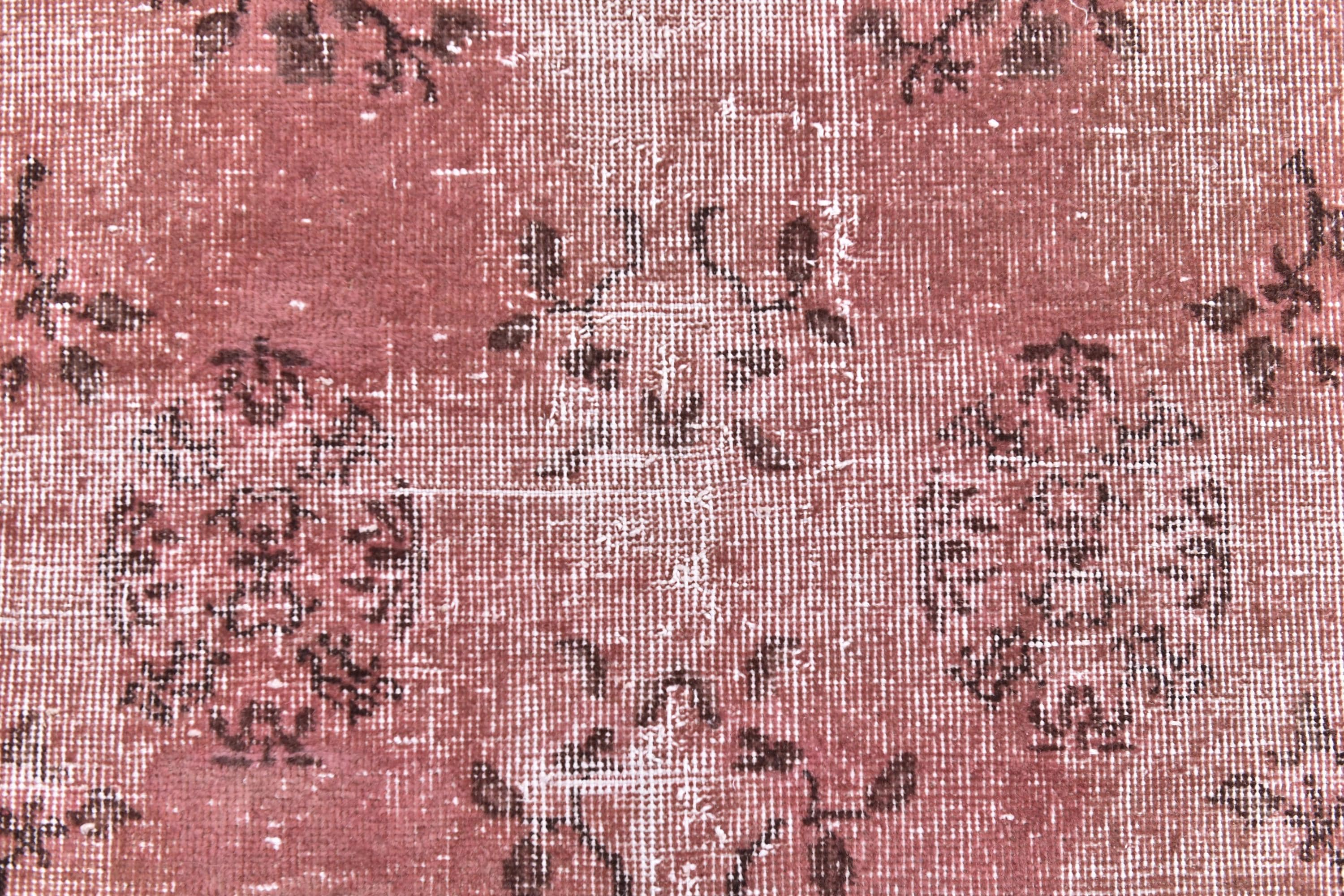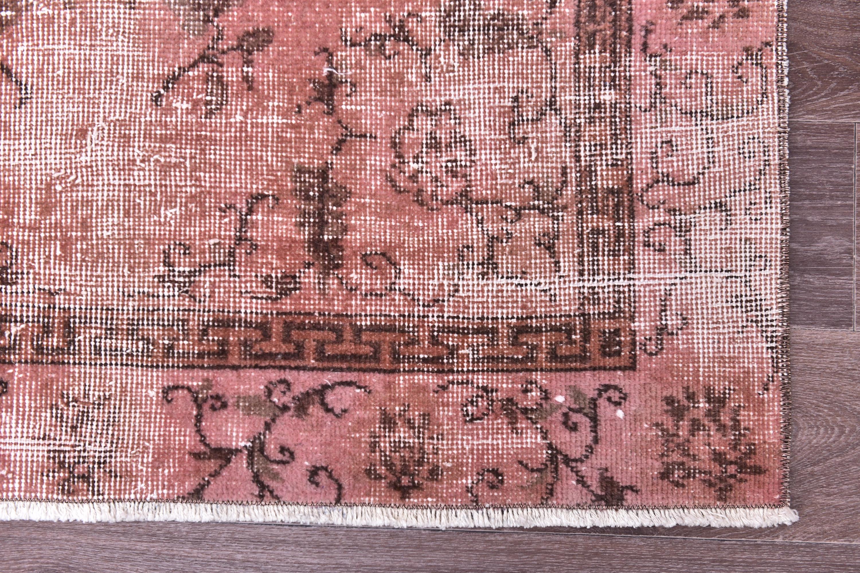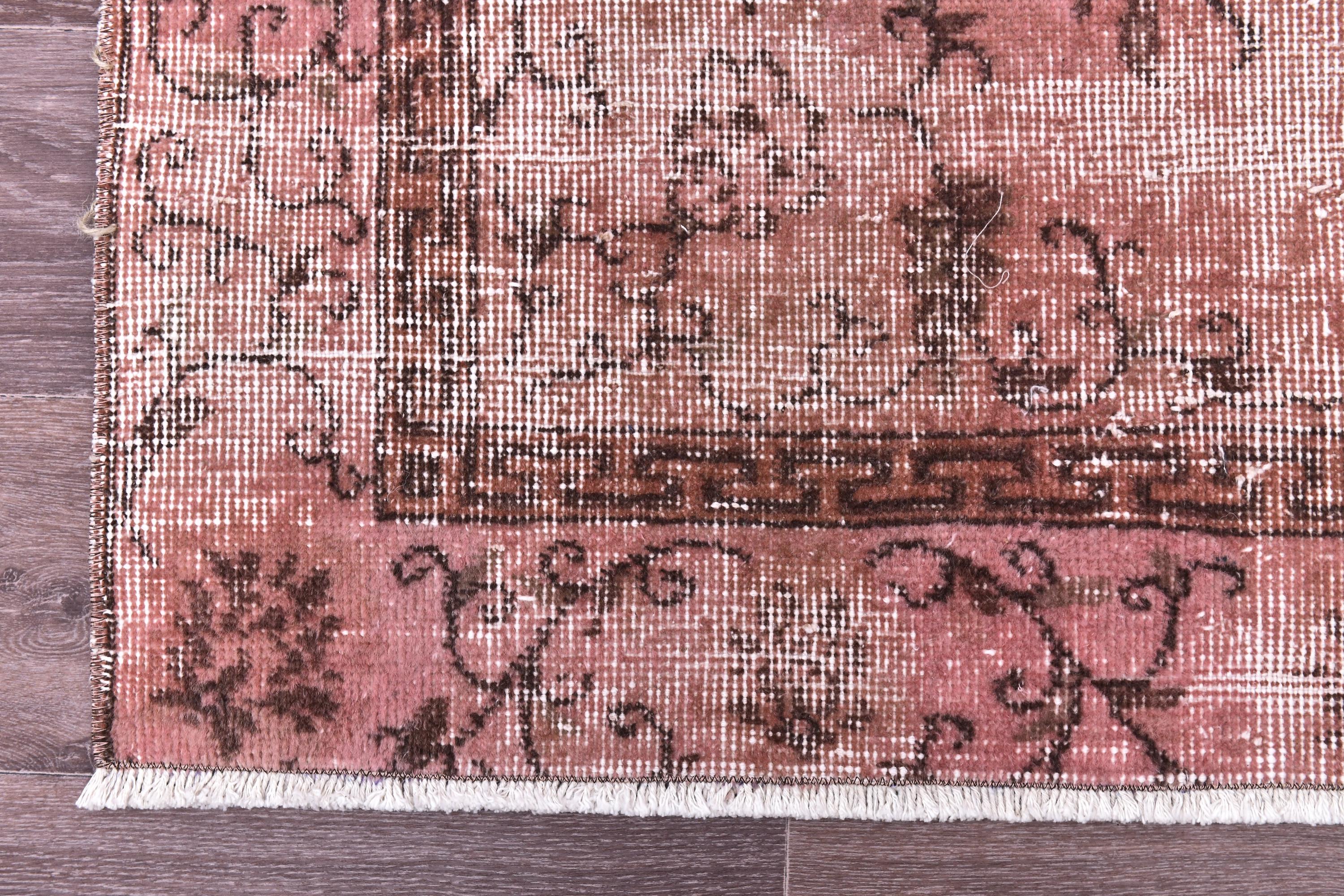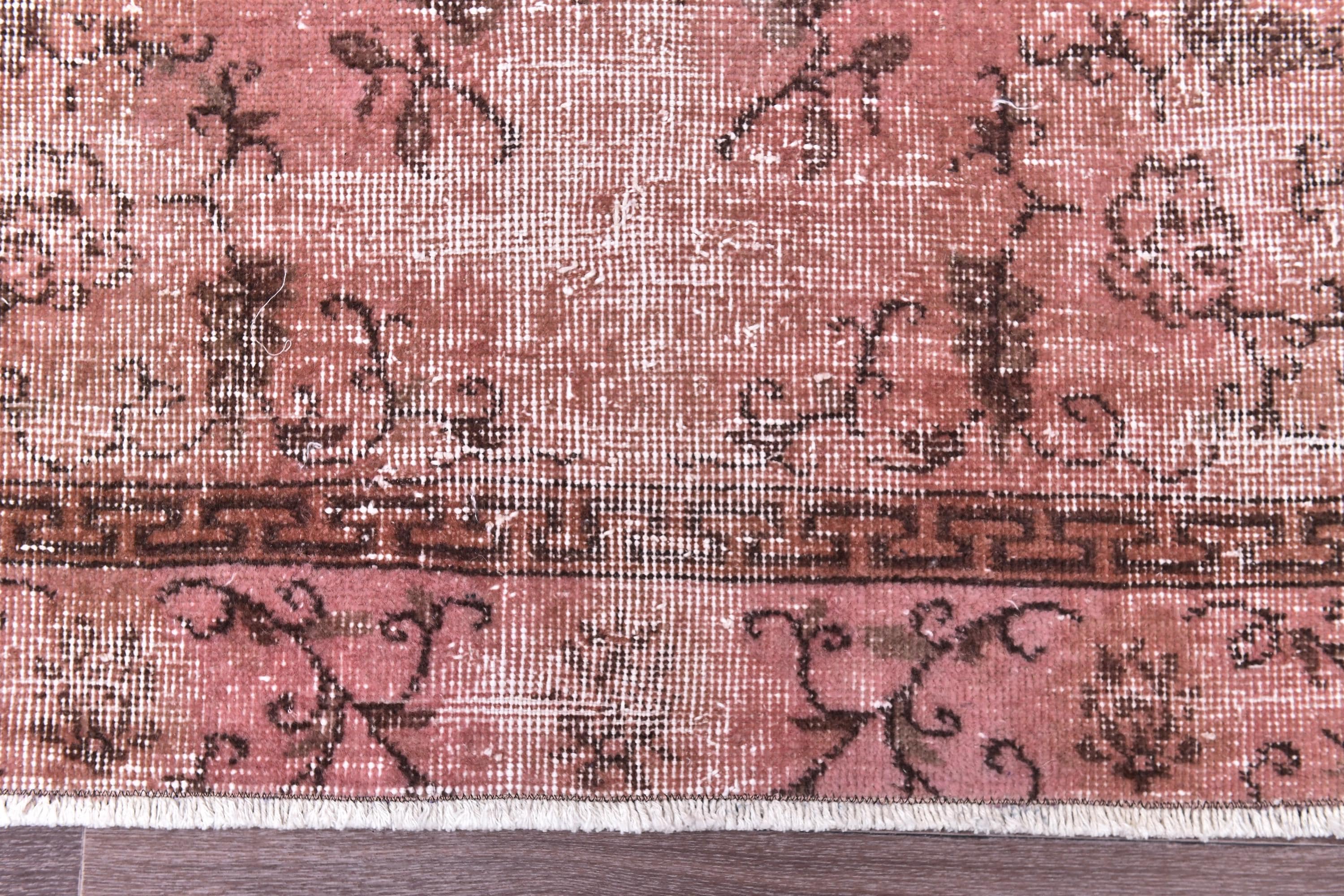 📜📌 A heavily distressed vintage Turkish area rug in deep dusty rose and faded red tones, featuring an all-over floral medallion pattern with dark espresso brown border filled with small floral motifs, photographed at an angle on hardwood floor showing natural wear and pile loss.