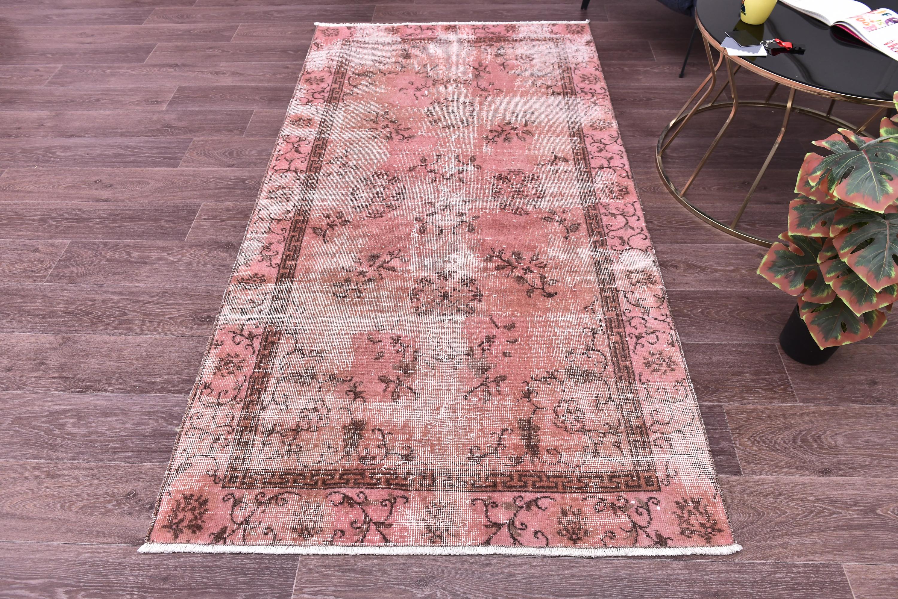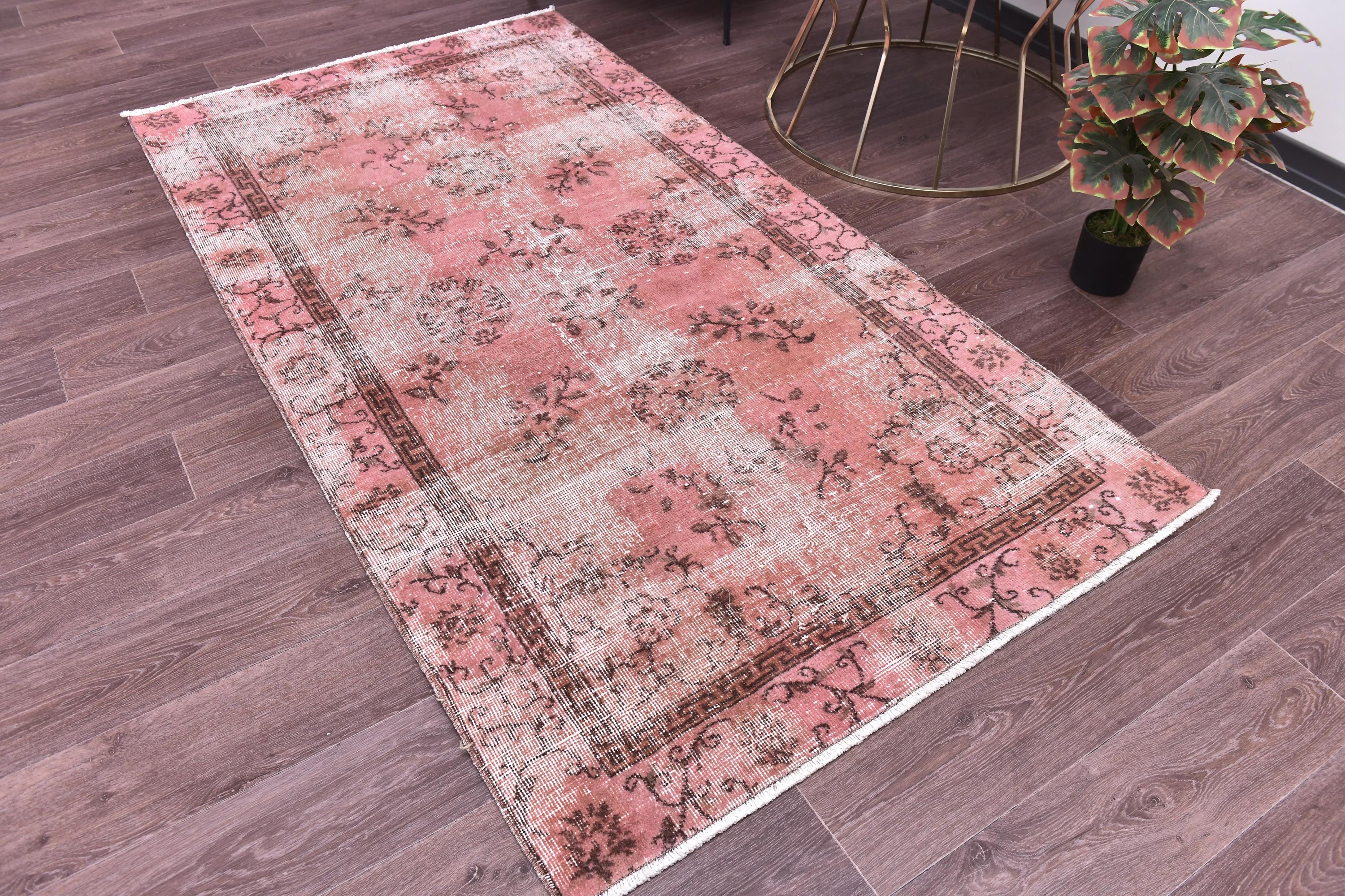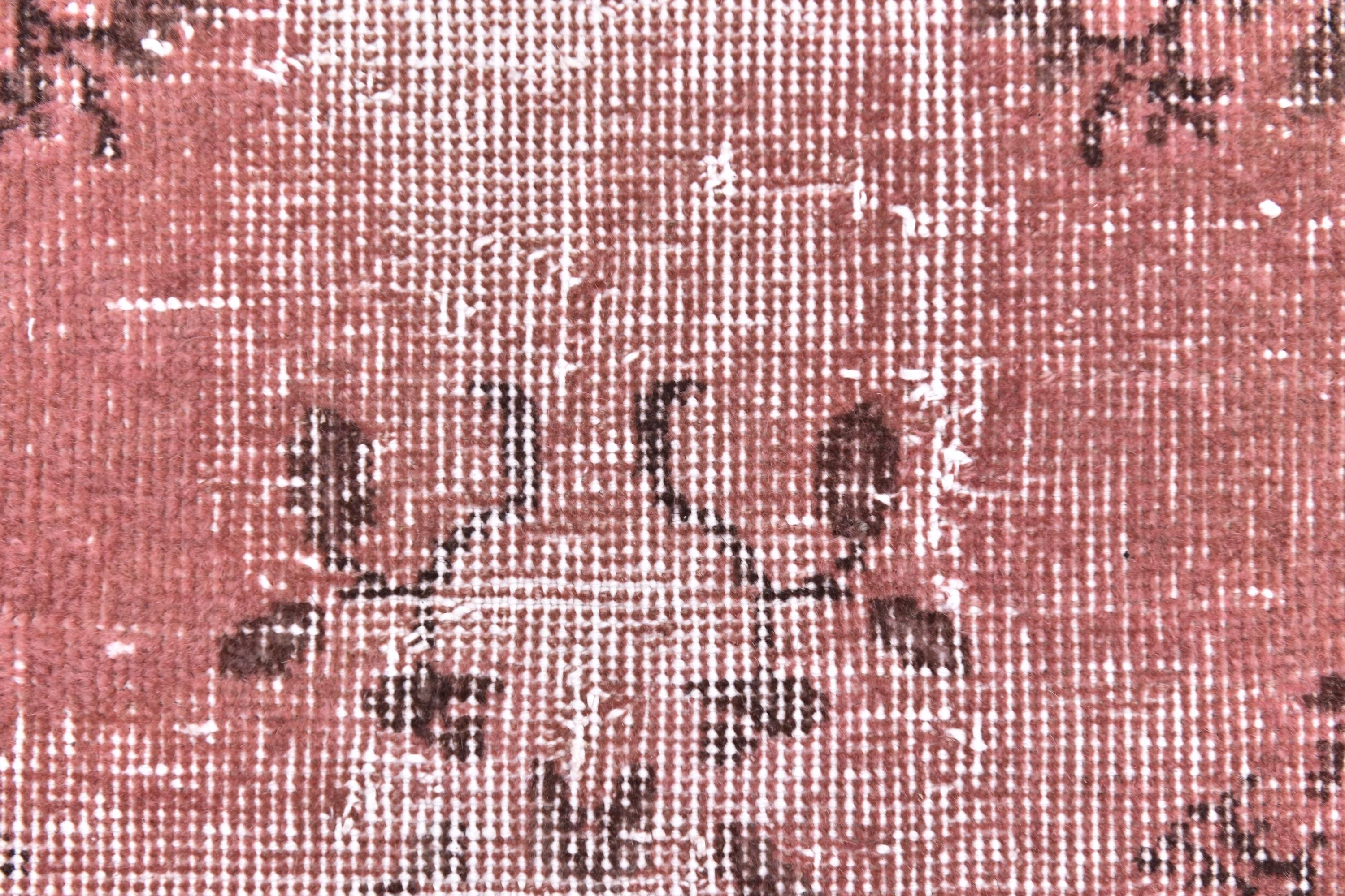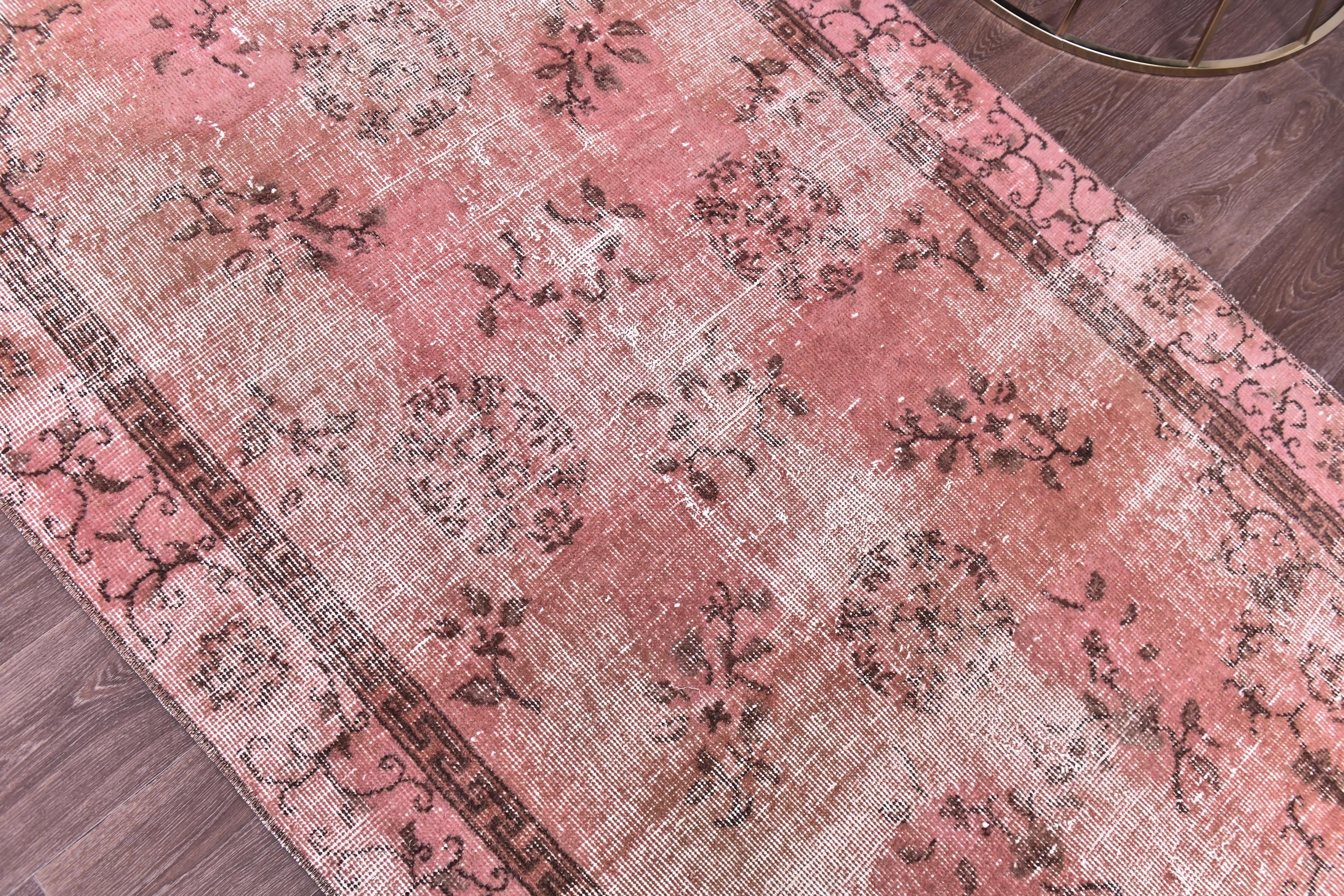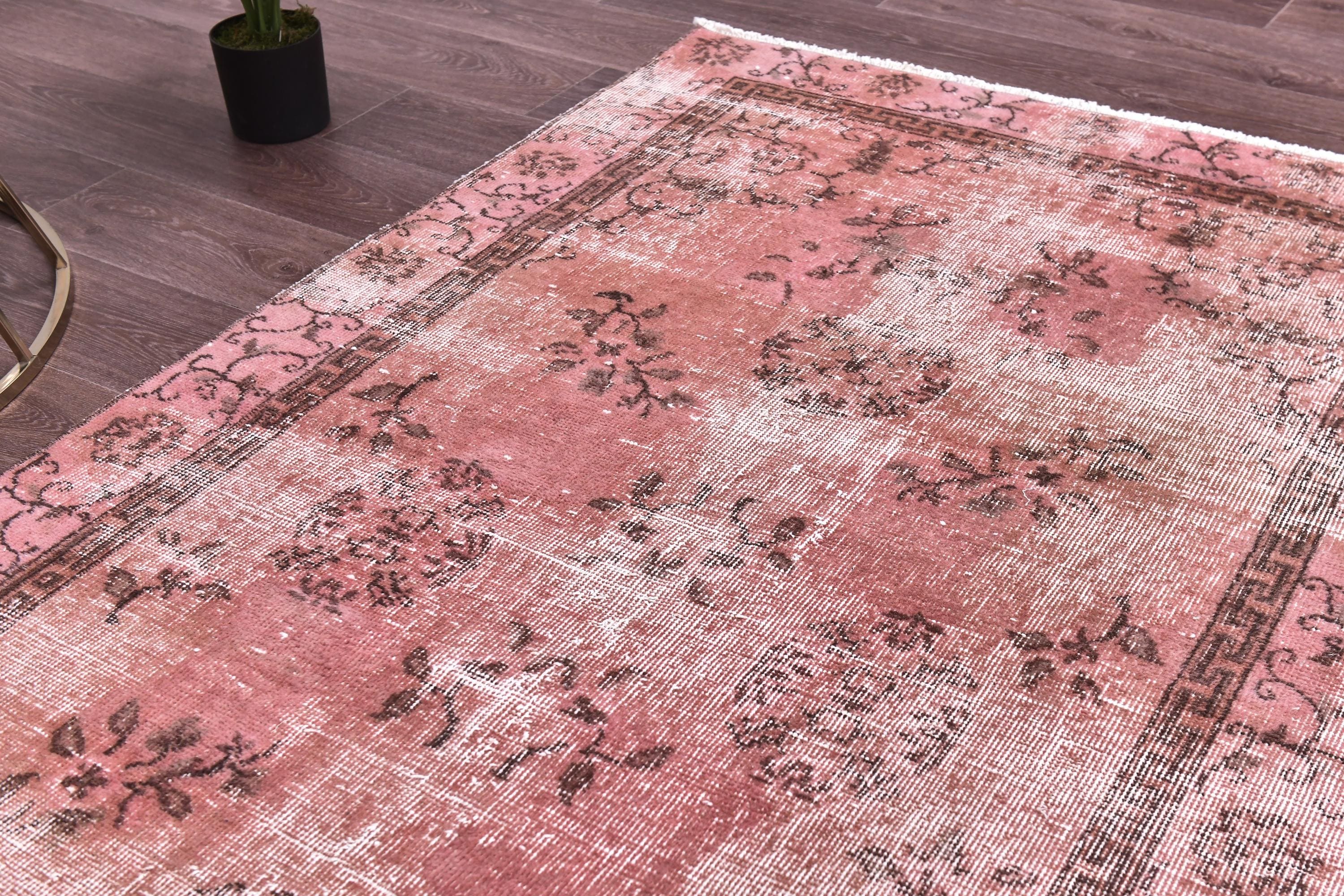 📜📌 A heavily distressed vintage Turkish area rug in deep dusty rose and faded red tones, featuring an all-over floral medallion pattern with dark espresso brown border filled with small floral motifs, photographed at an angle on hardwood floor showing natural wear and pile loss.
