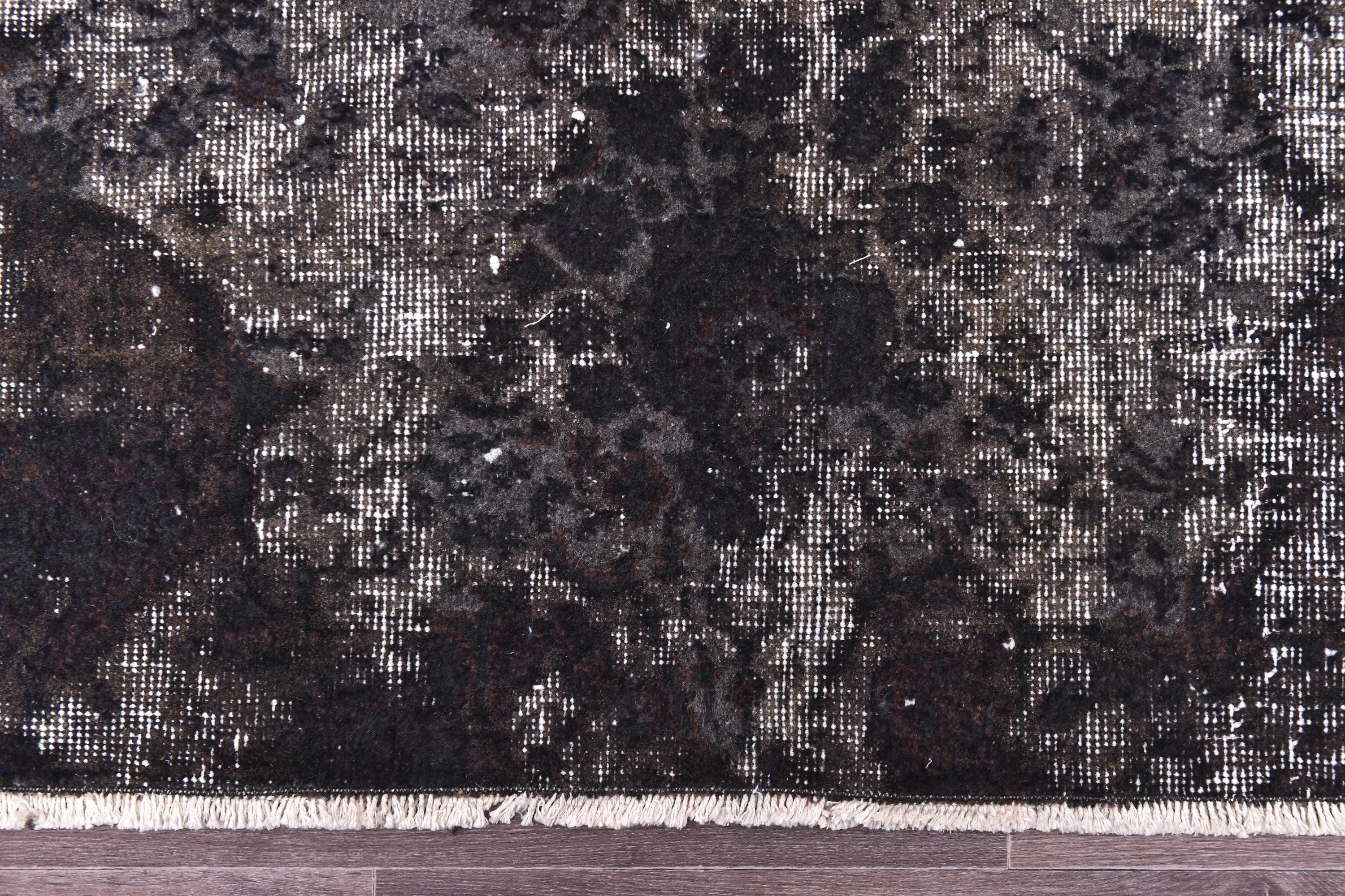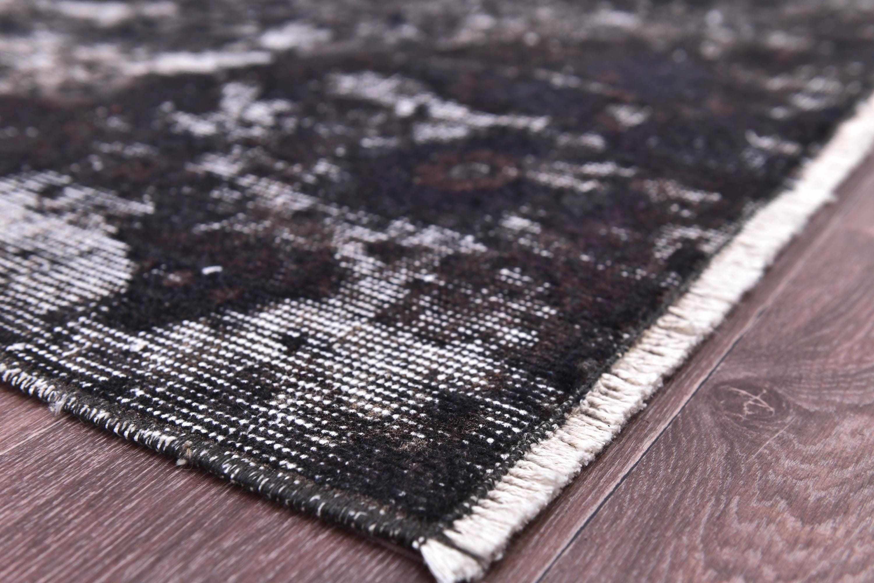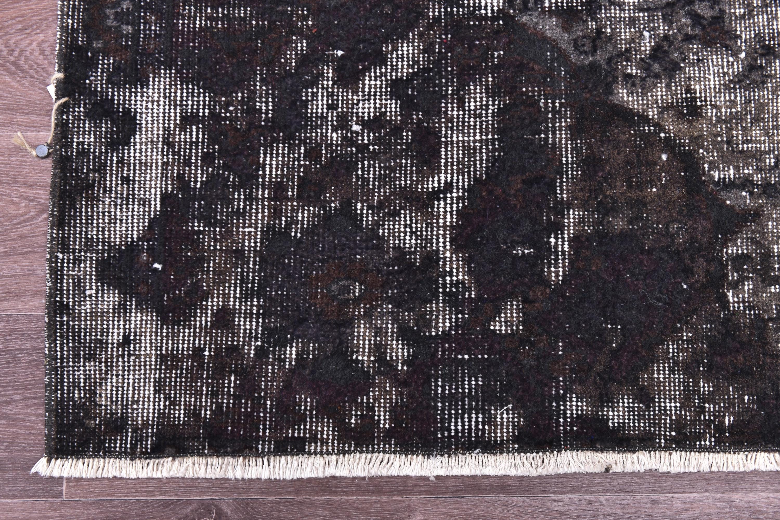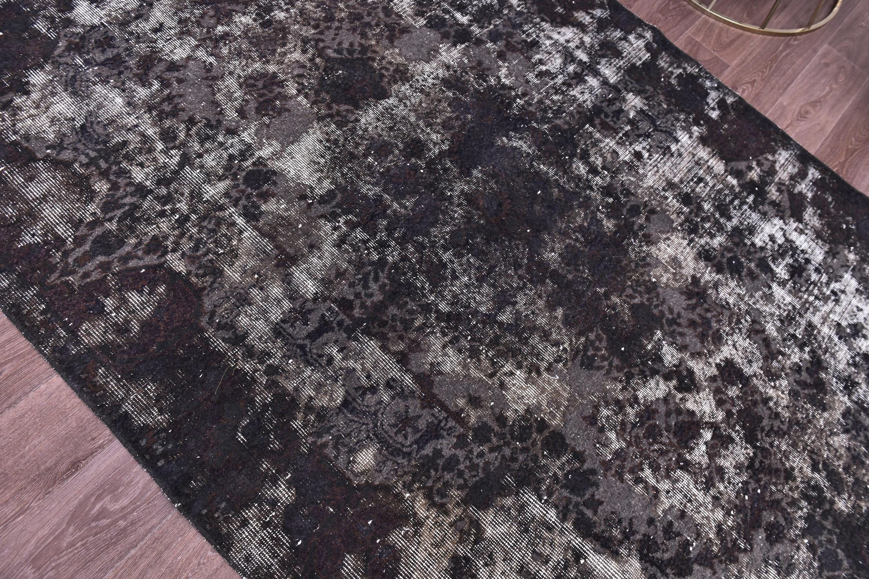 📜📌 Handmade vintage Turkish overdyed wool rug in dark charcoal gray and black tones with distressed abstract pattern, photographed at an angle on wooden floor
