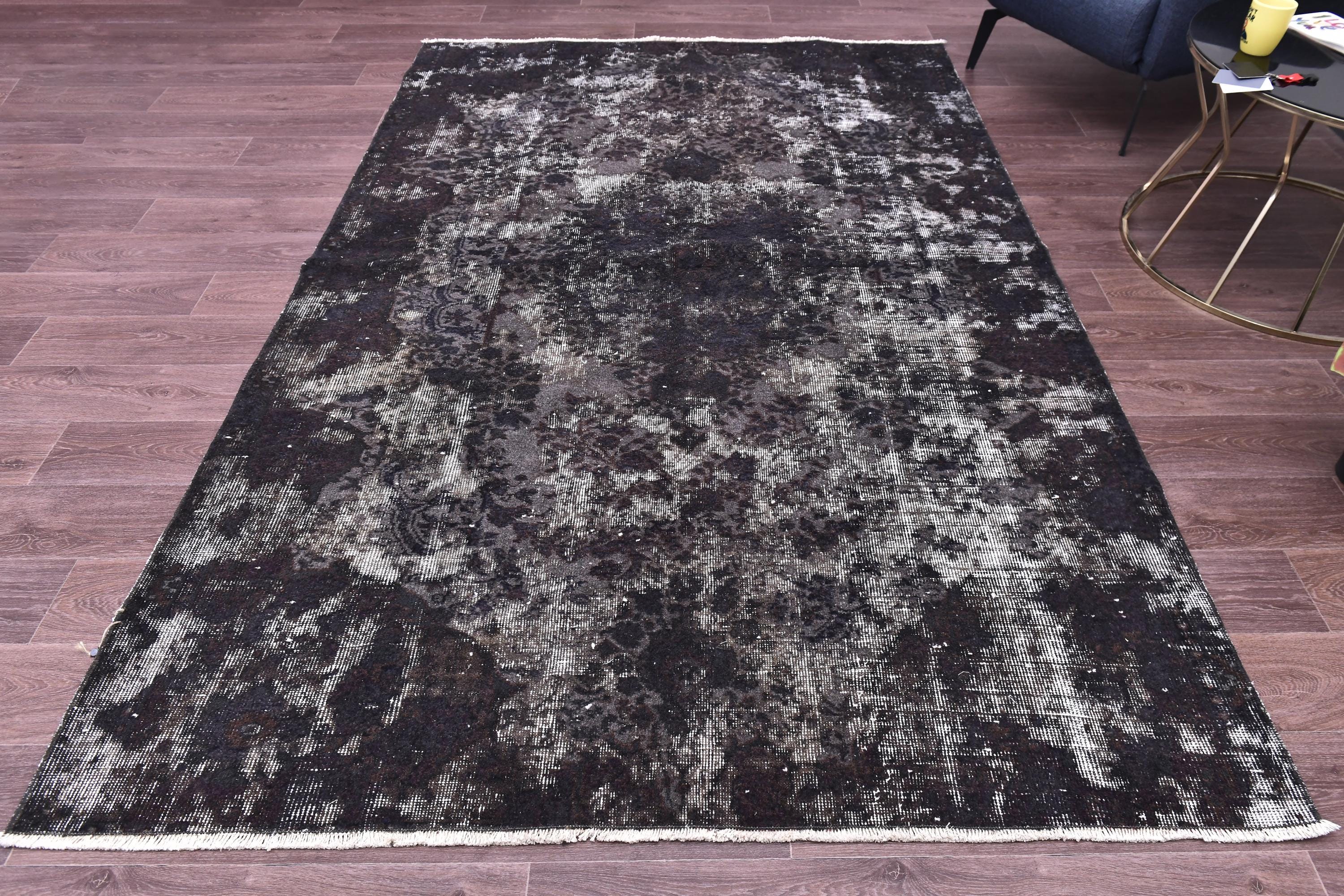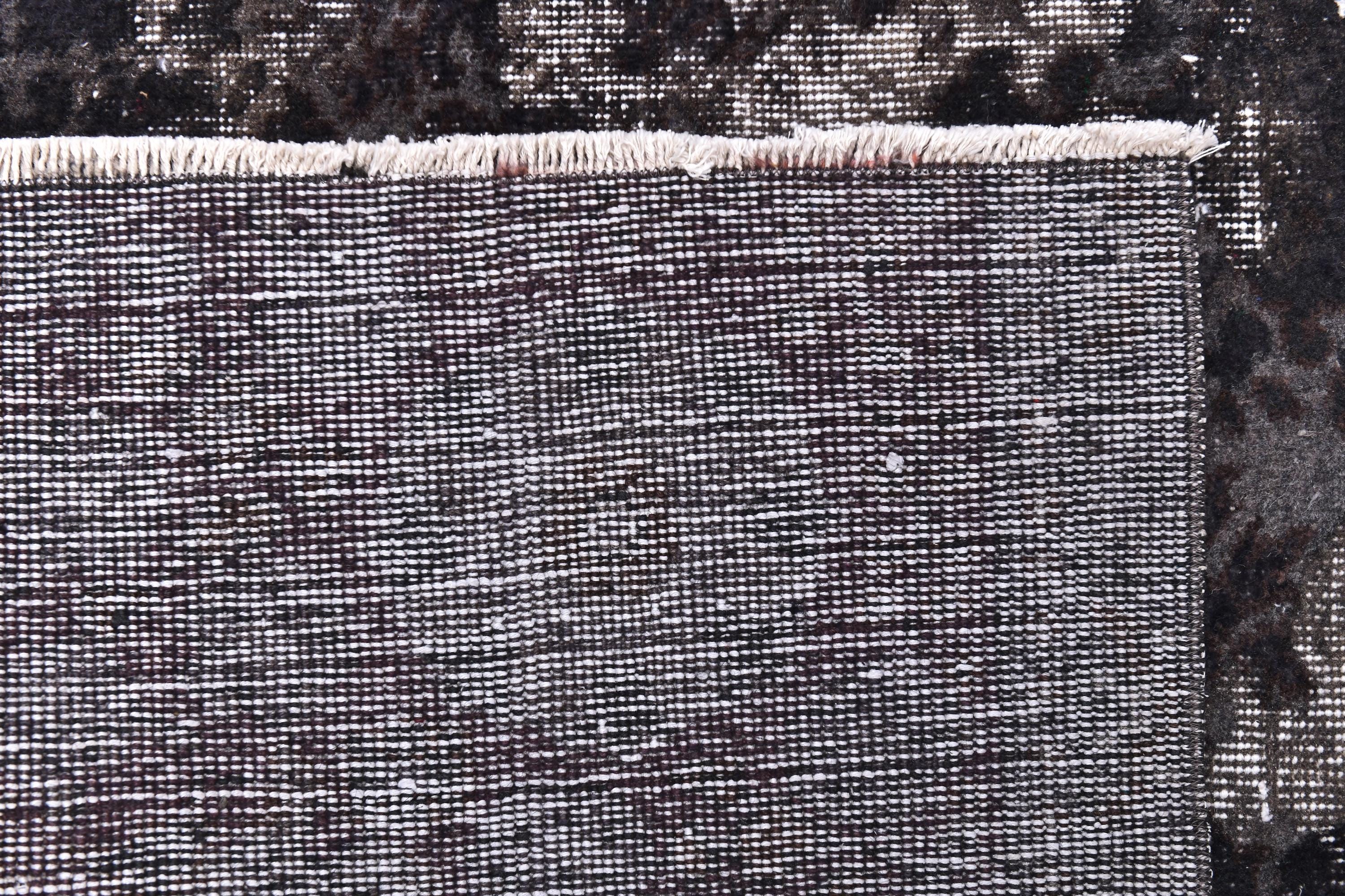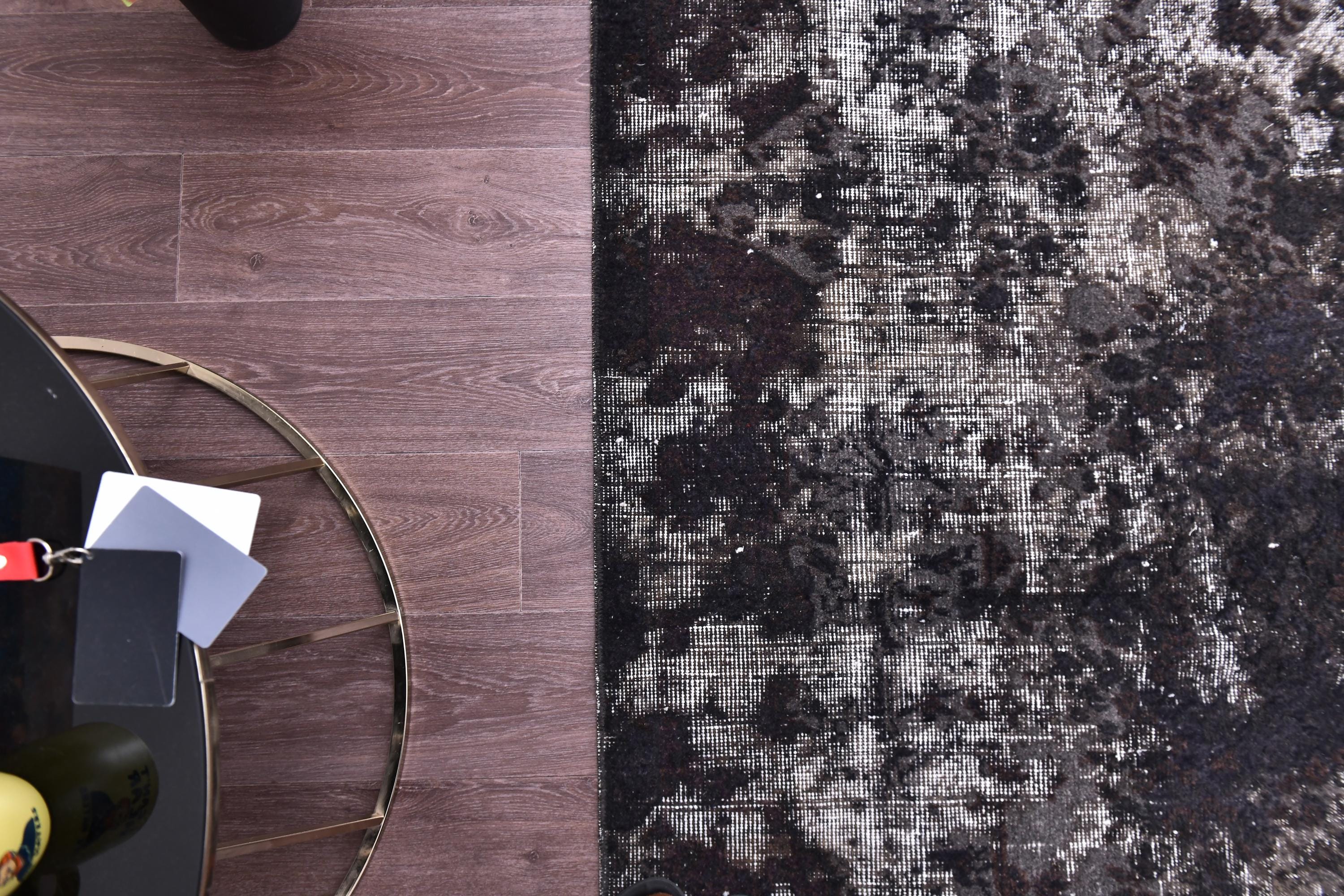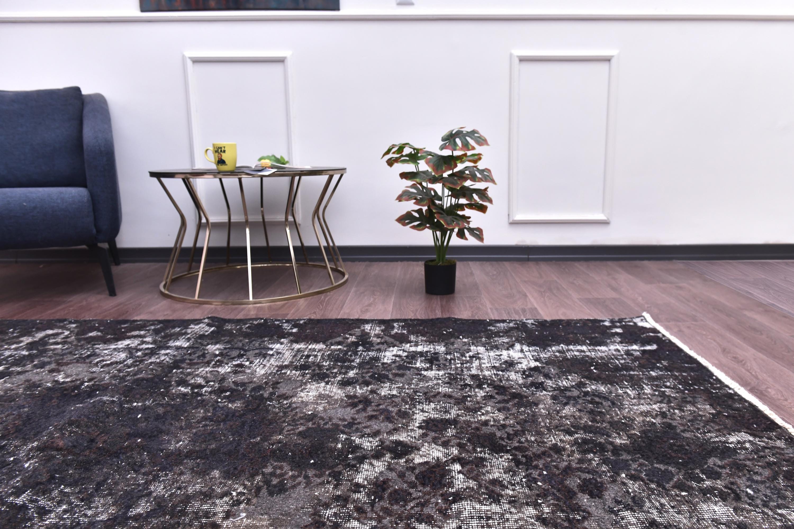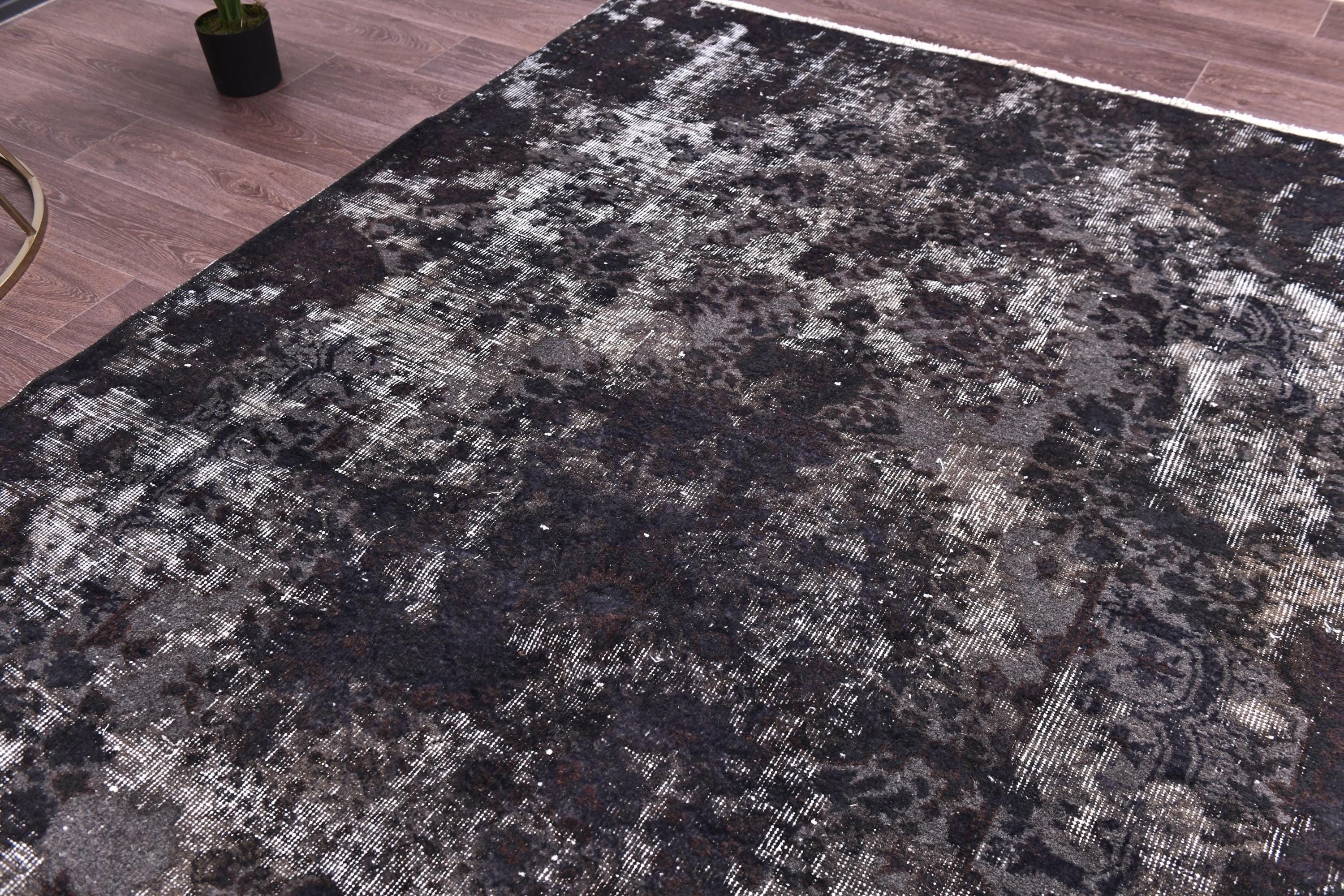 📜📌 Handmade vintage Turkish overdyed wool rug in dark charcoal gray and black tones with distressed abstract pattern, photographed at an angle on wooden floor