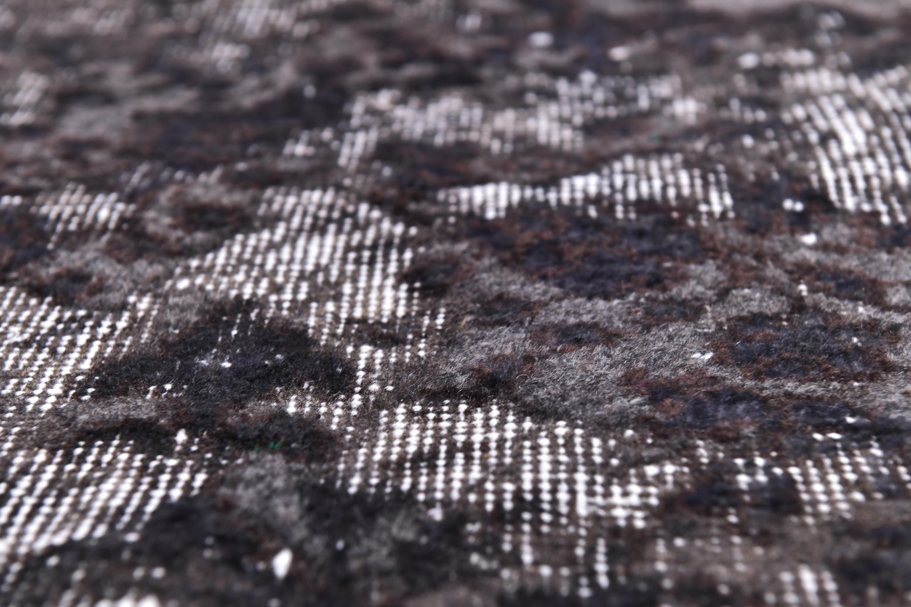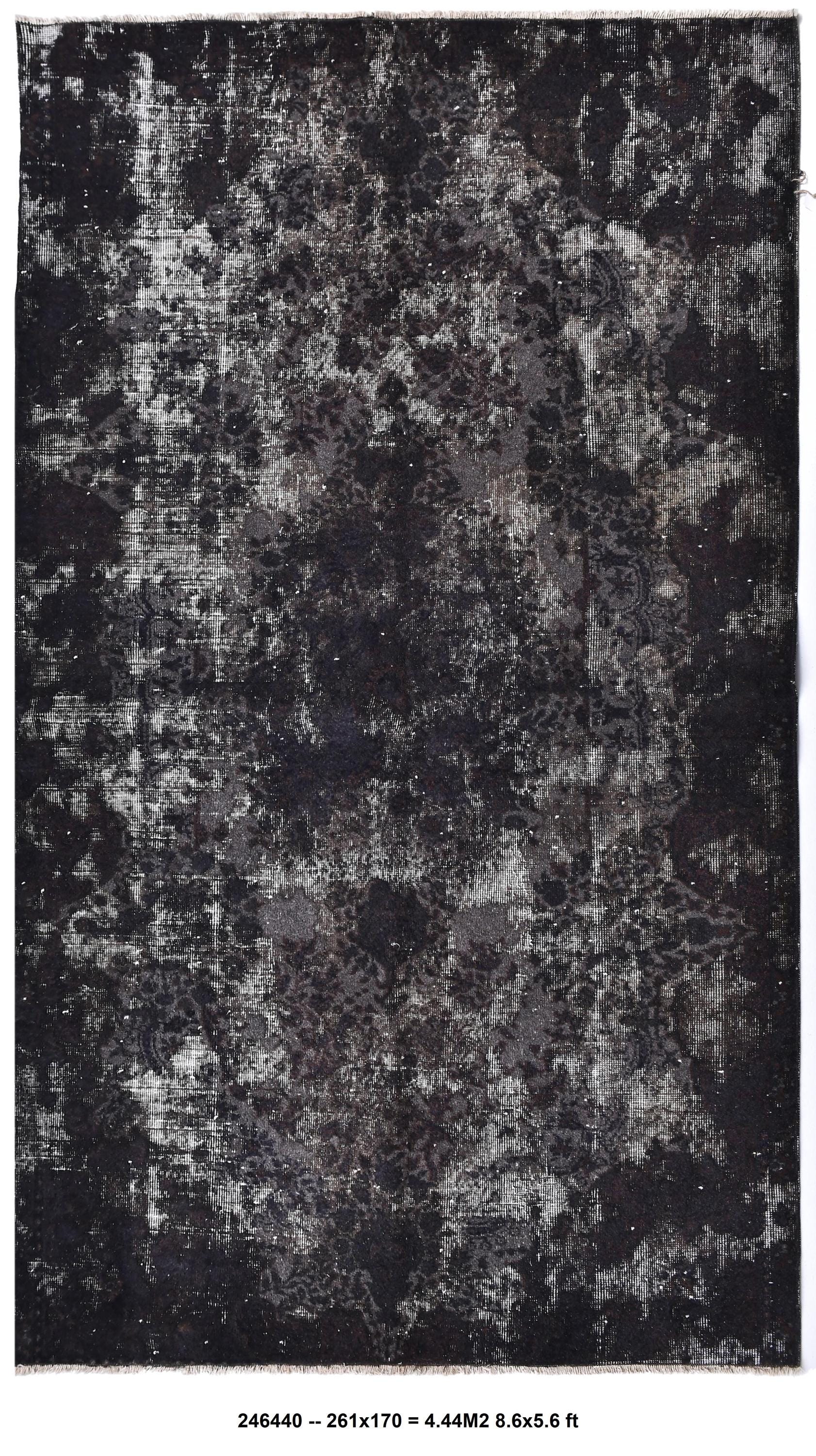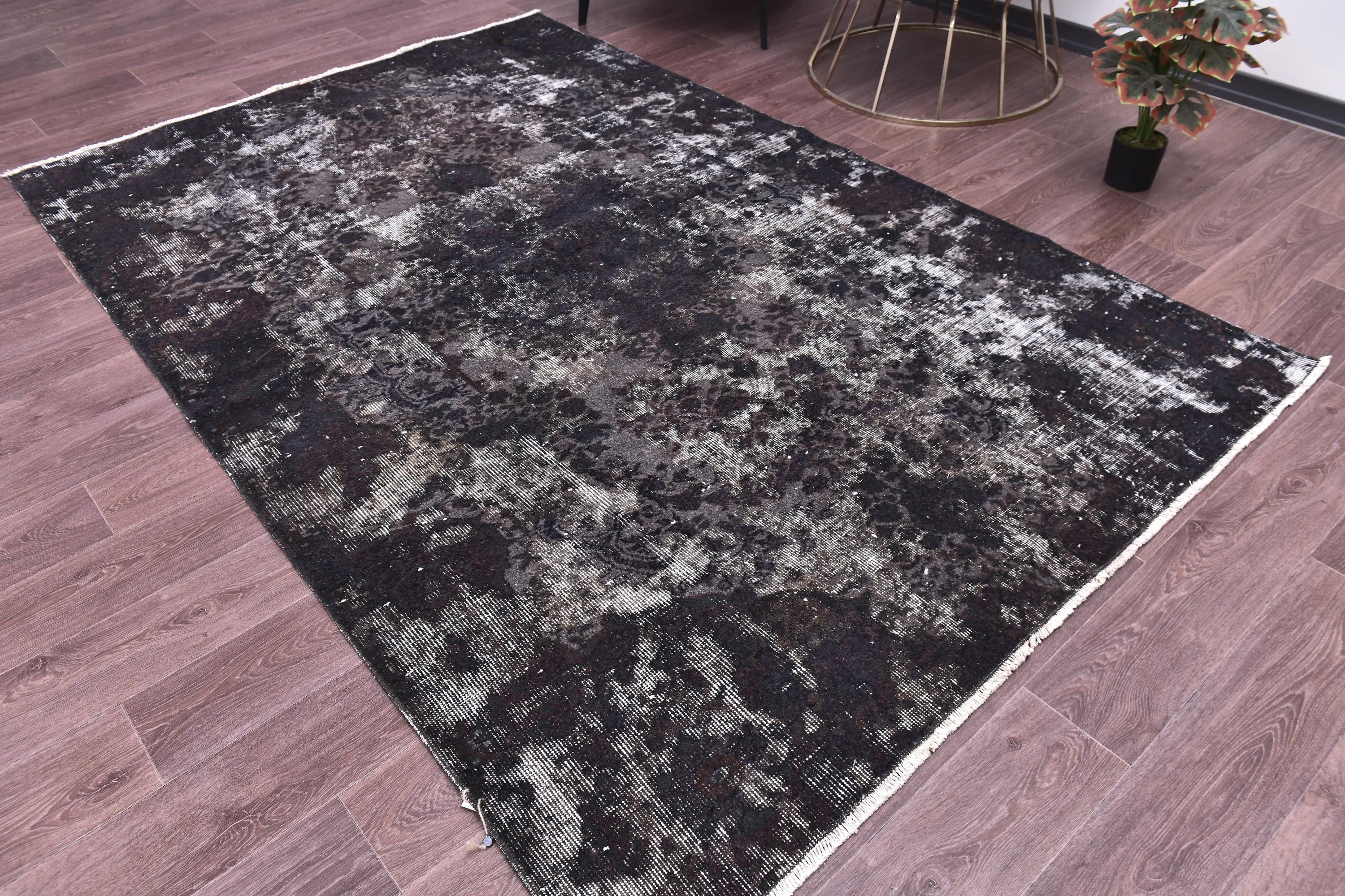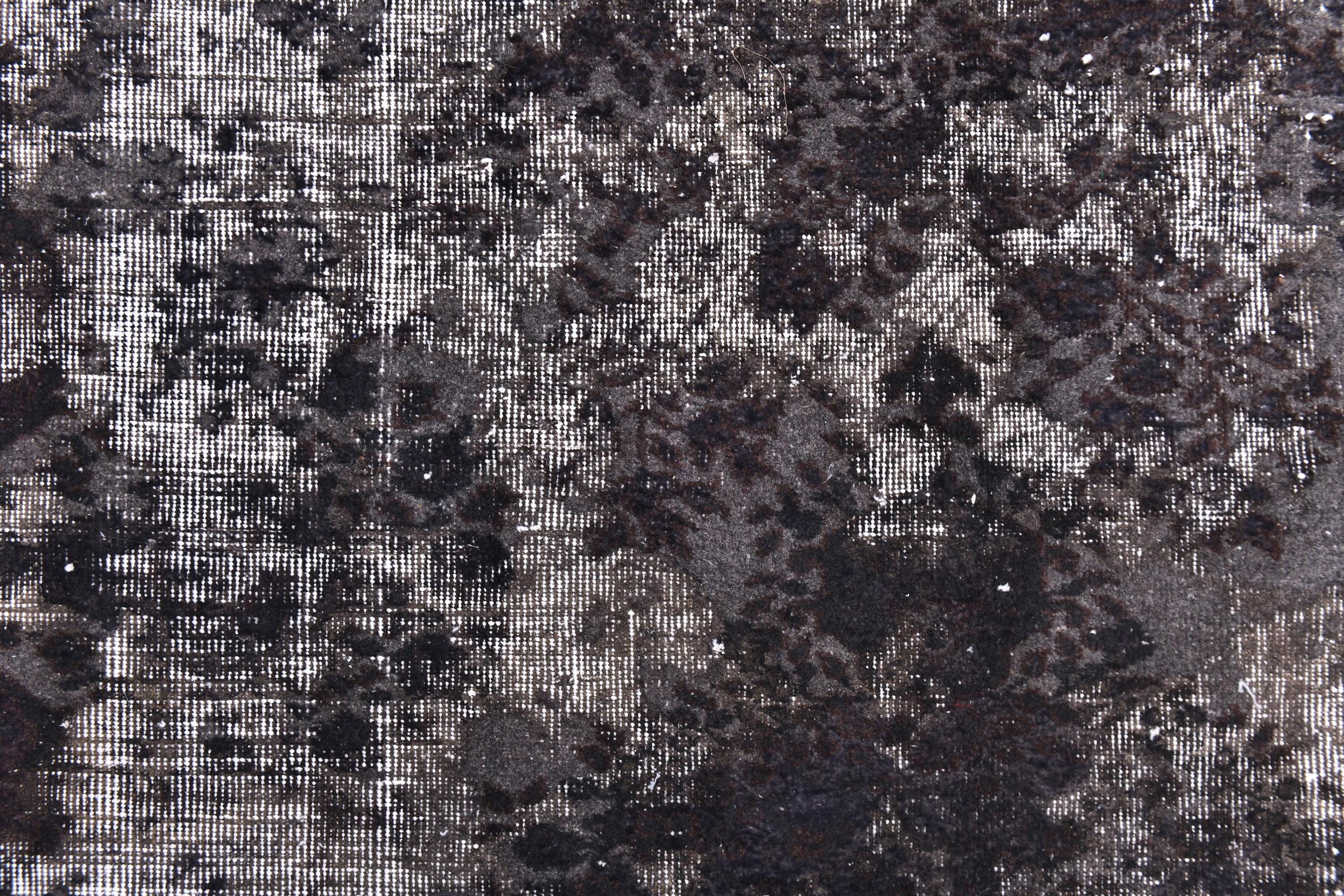 📜📌 Handmade vintage Turkish overdyed wool rug in dark charcoal gray and black tones with distressed abstract pattern, photographed at an angle on wooden floor
