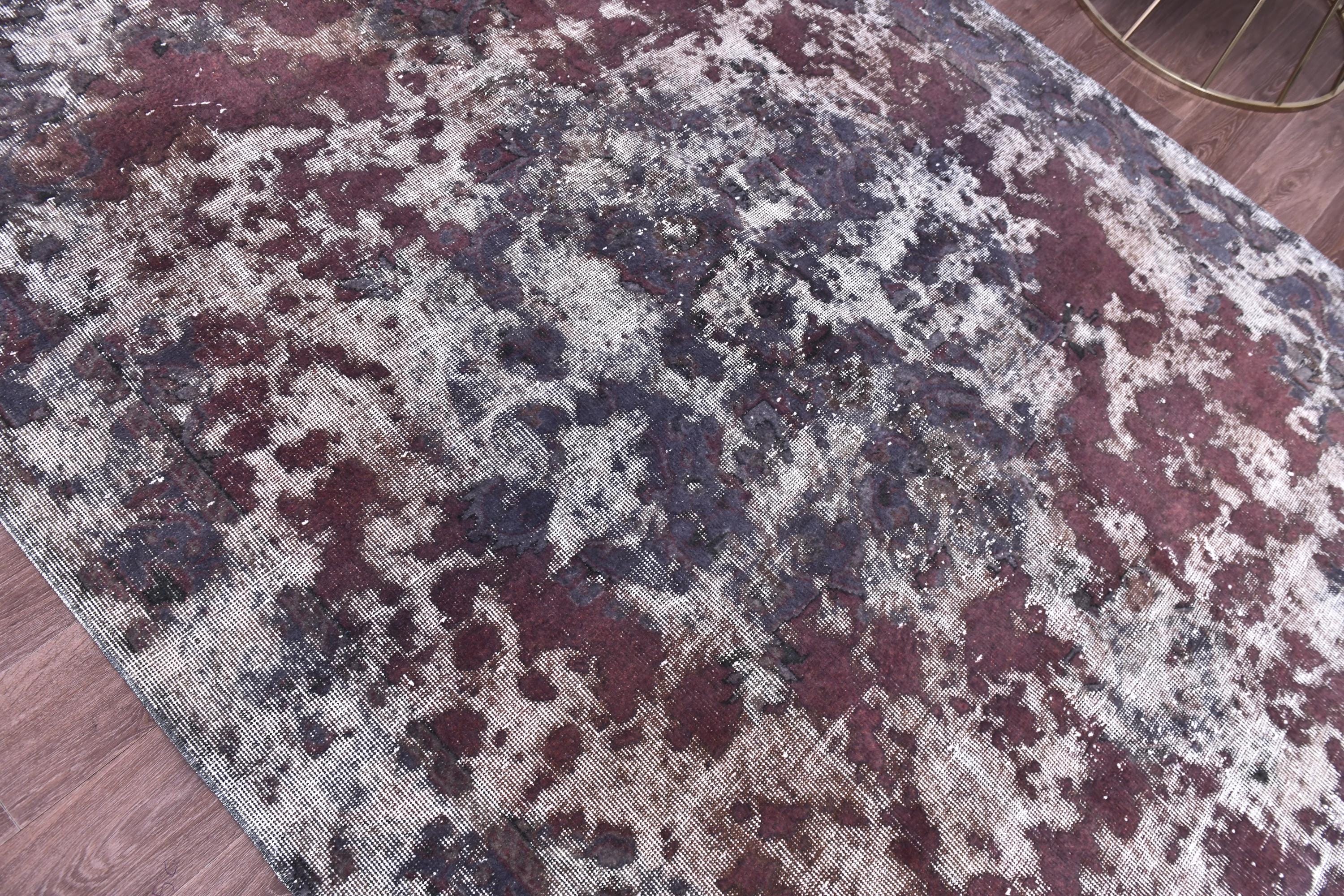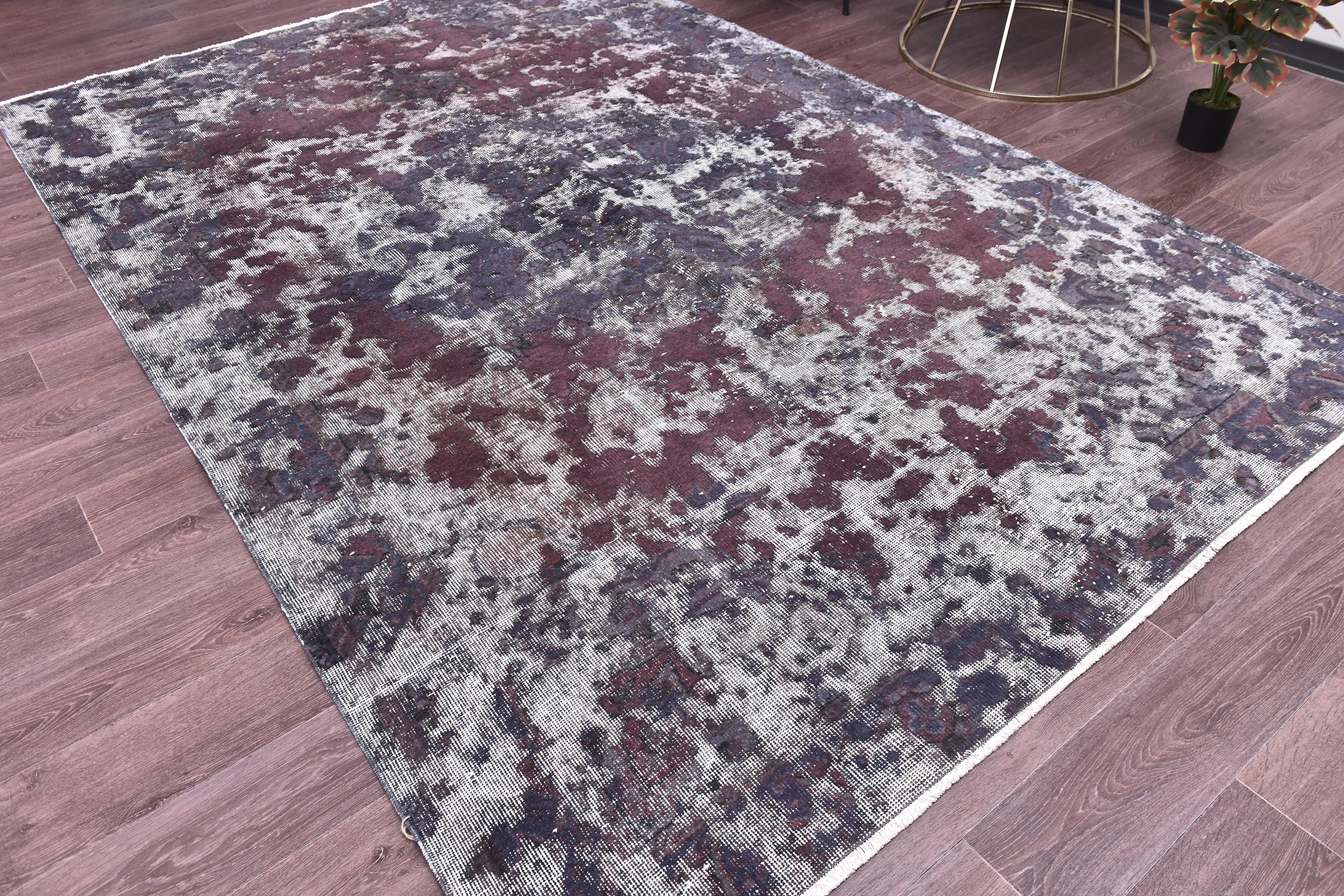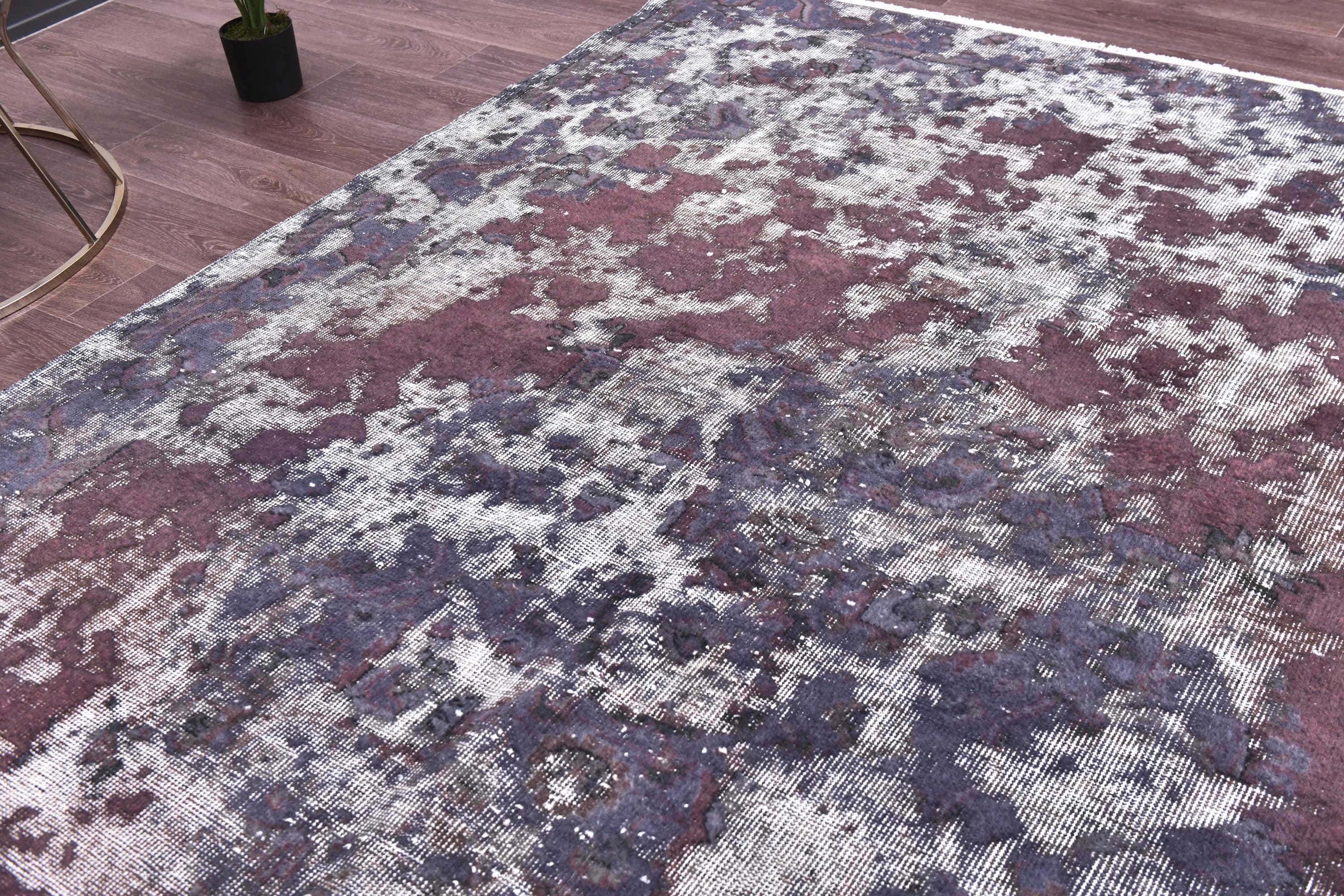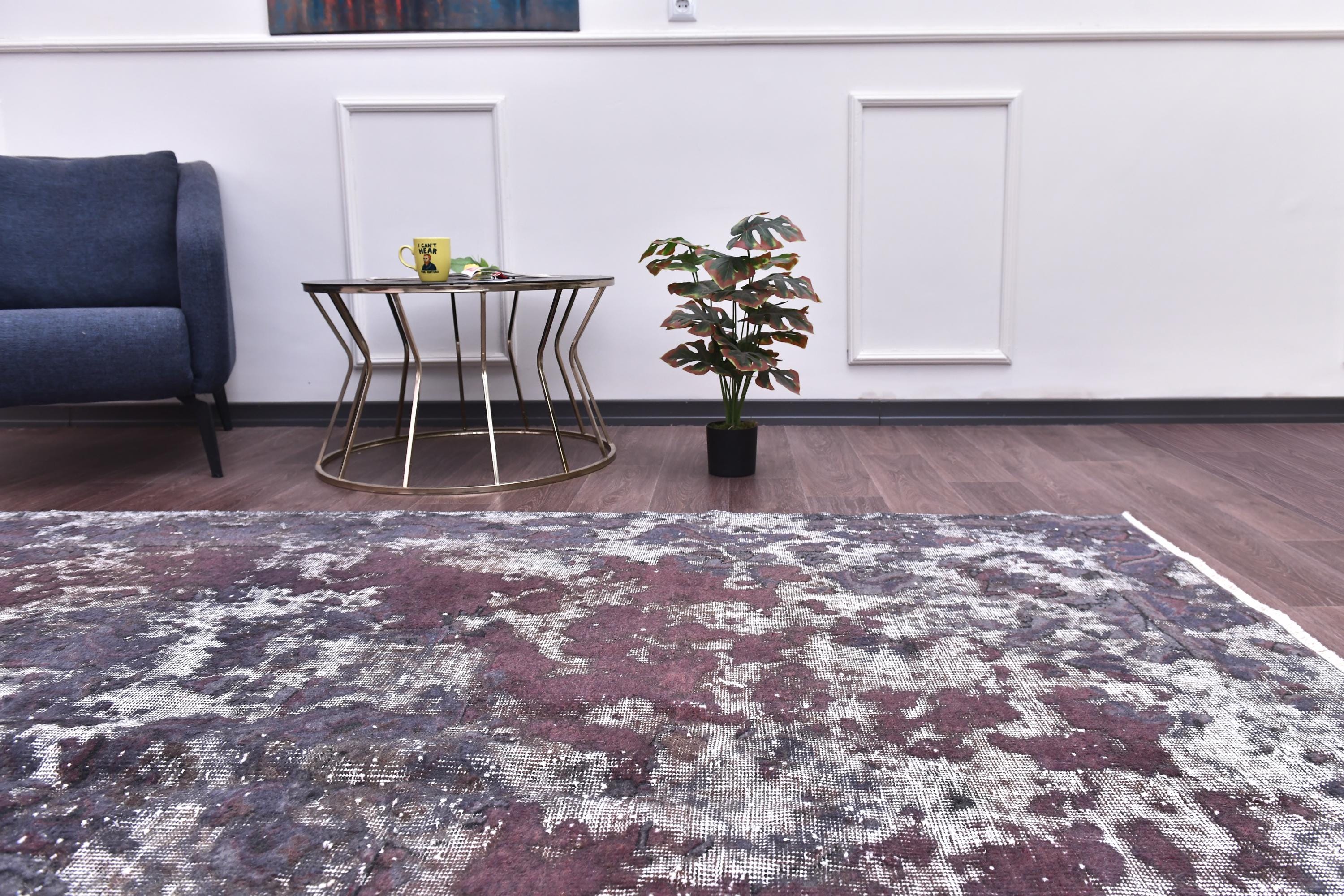 📜📌 Vintage Turkish overdyed area rug in rich purple and gray colors featuring distressed traditional floral medallion patterns. Hand-knotted wool contemporary carpet with worn antique appearance, white fringe edges, displayed on dark wood floor next to modern gold furniture. Bohemian home decor.
