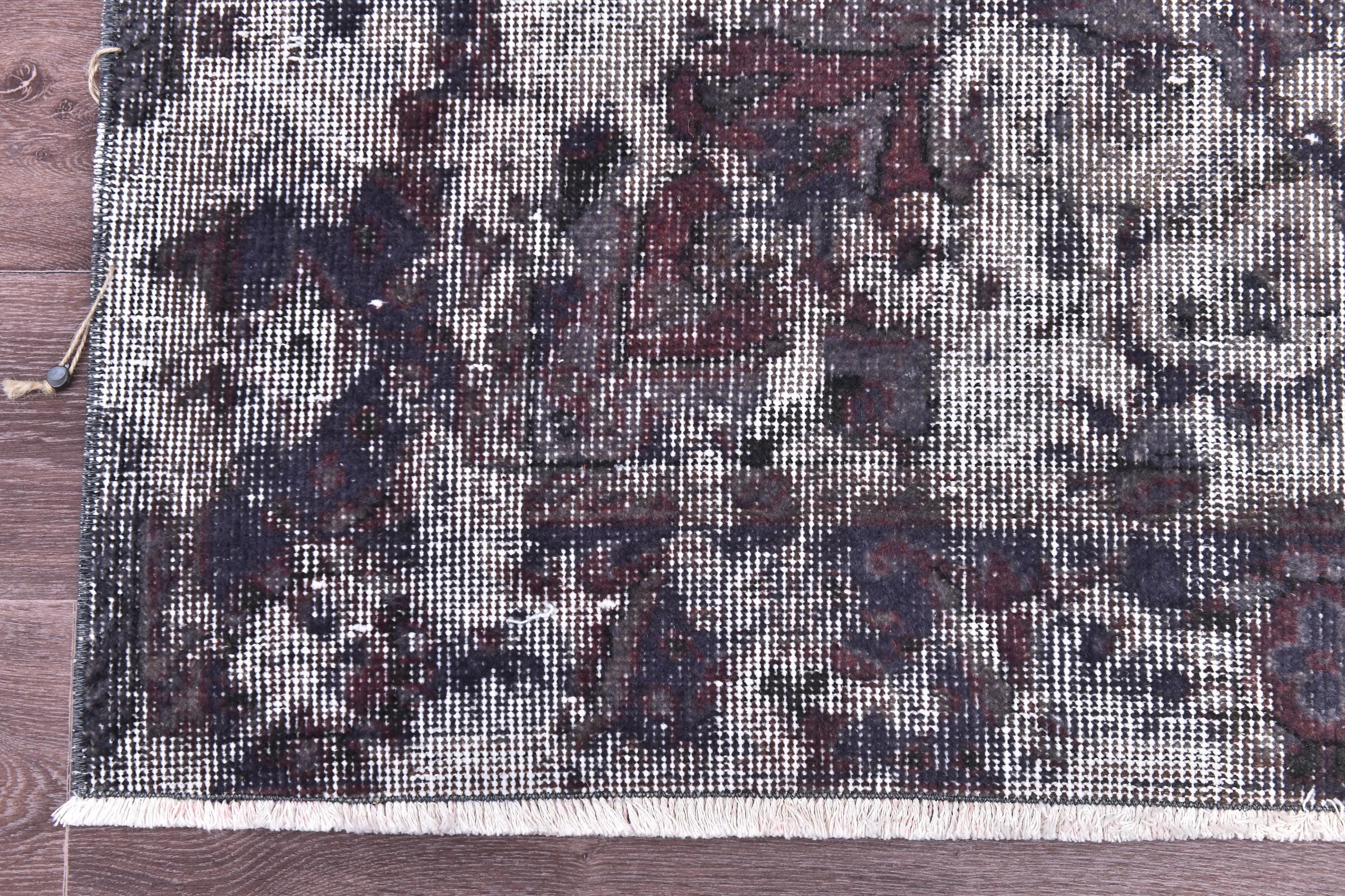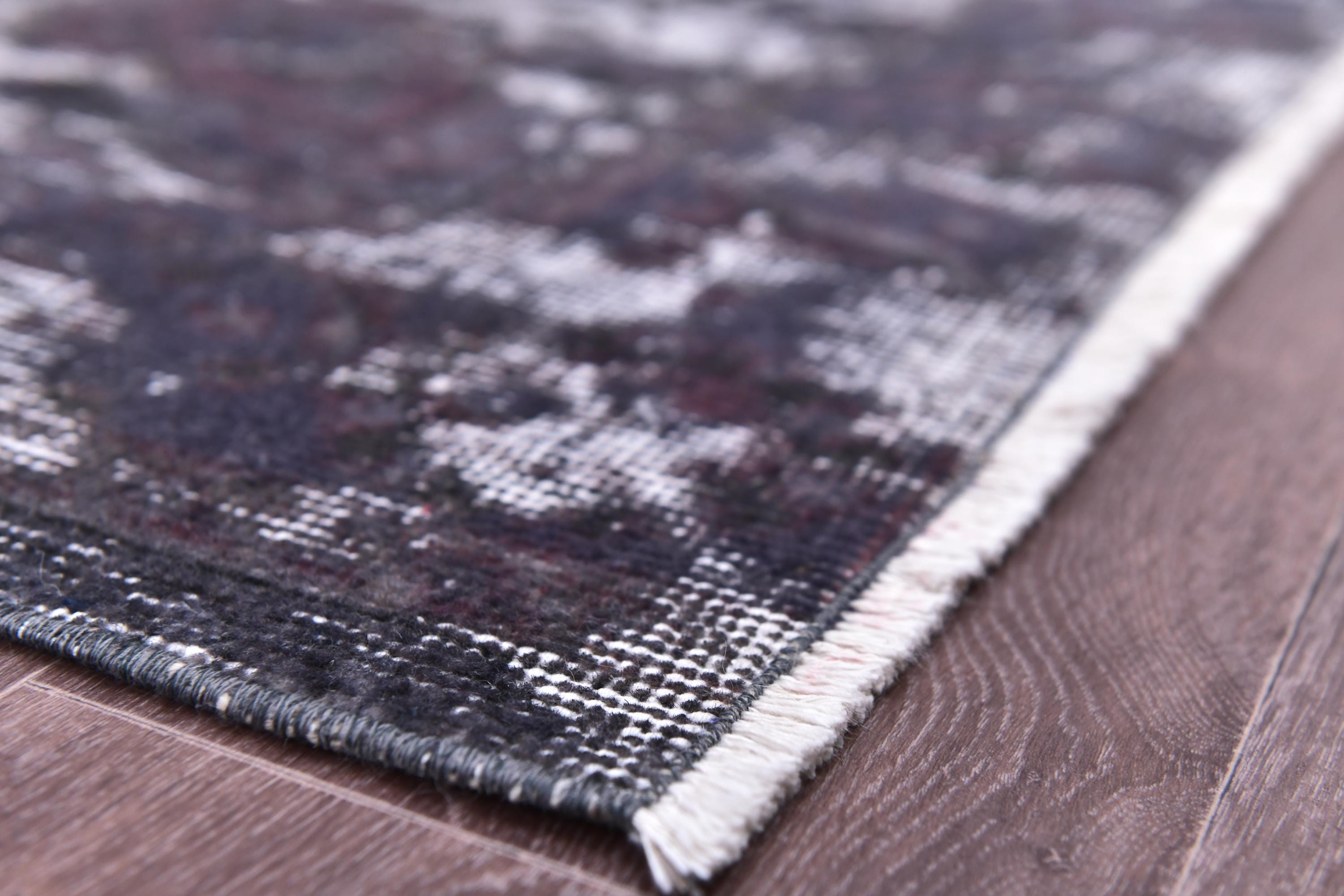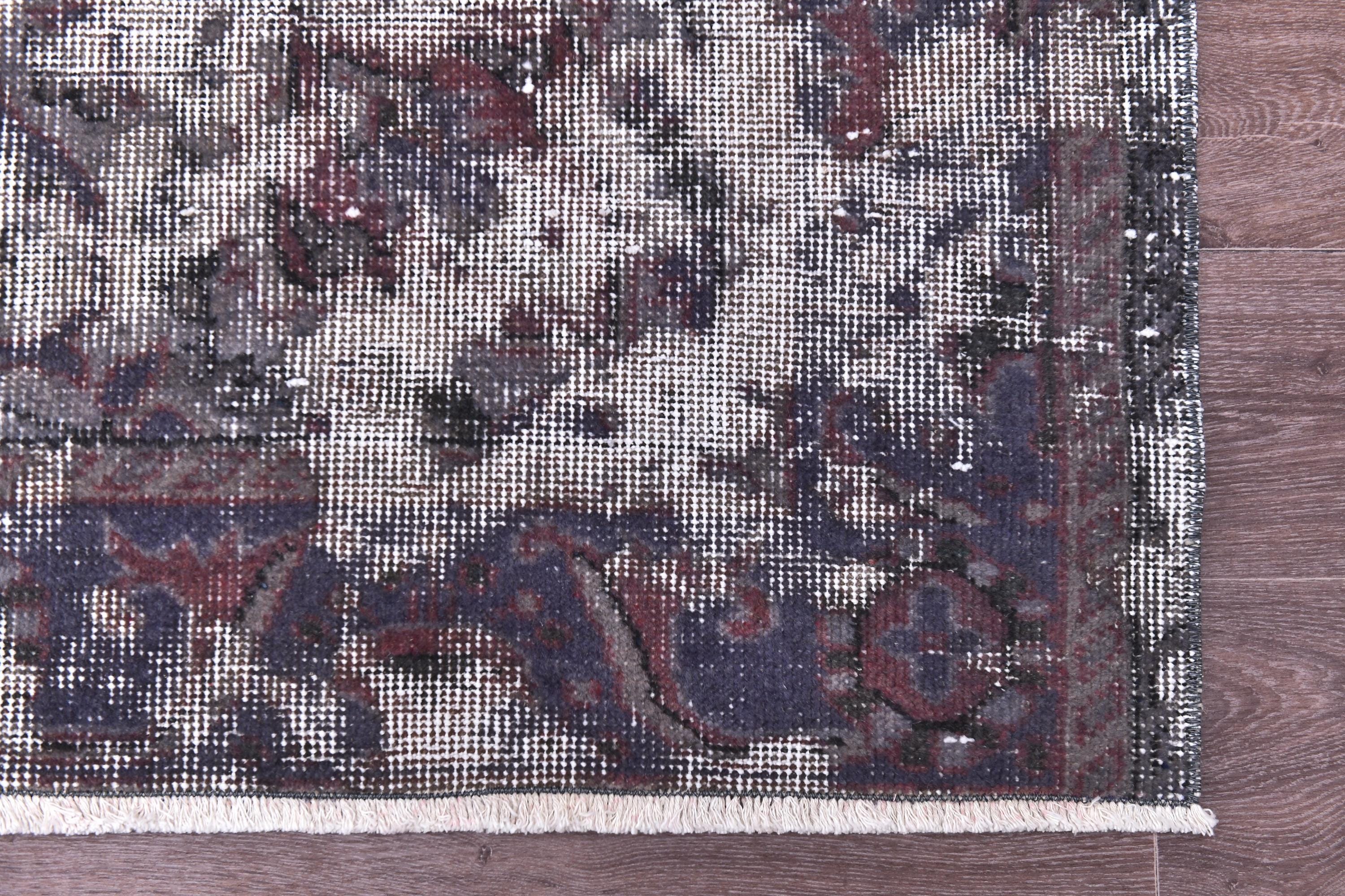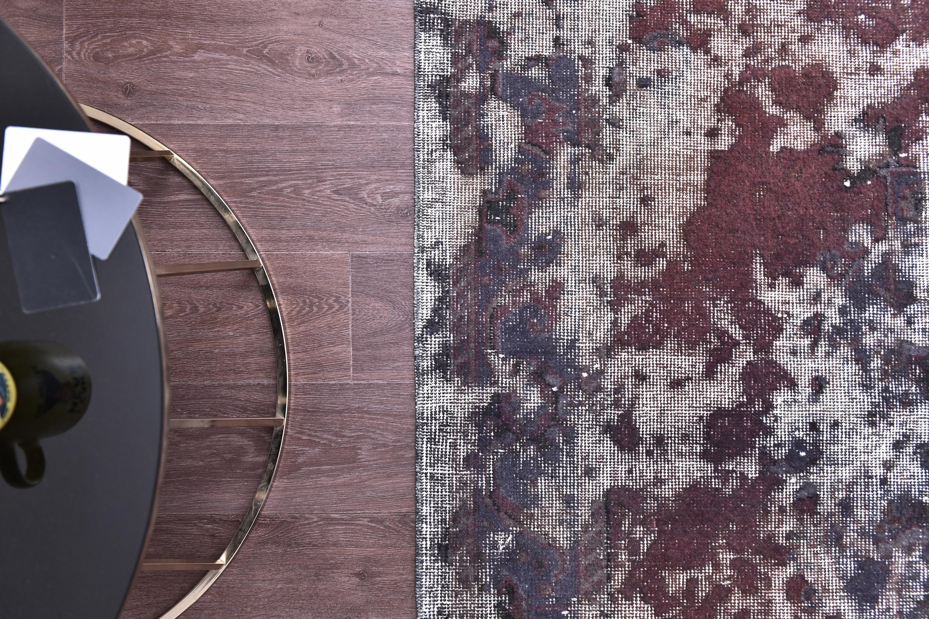 📜📌 Vintage Turkish overdyed area rug in rich purple and gray colors featuring distressed traditional floral medallion patterns. Hand-knotted wool contemporary carpet with worn antique appearance, white fringe edges, displayed on dark wood floor next to modern gold furniture. Bohemian home decor.