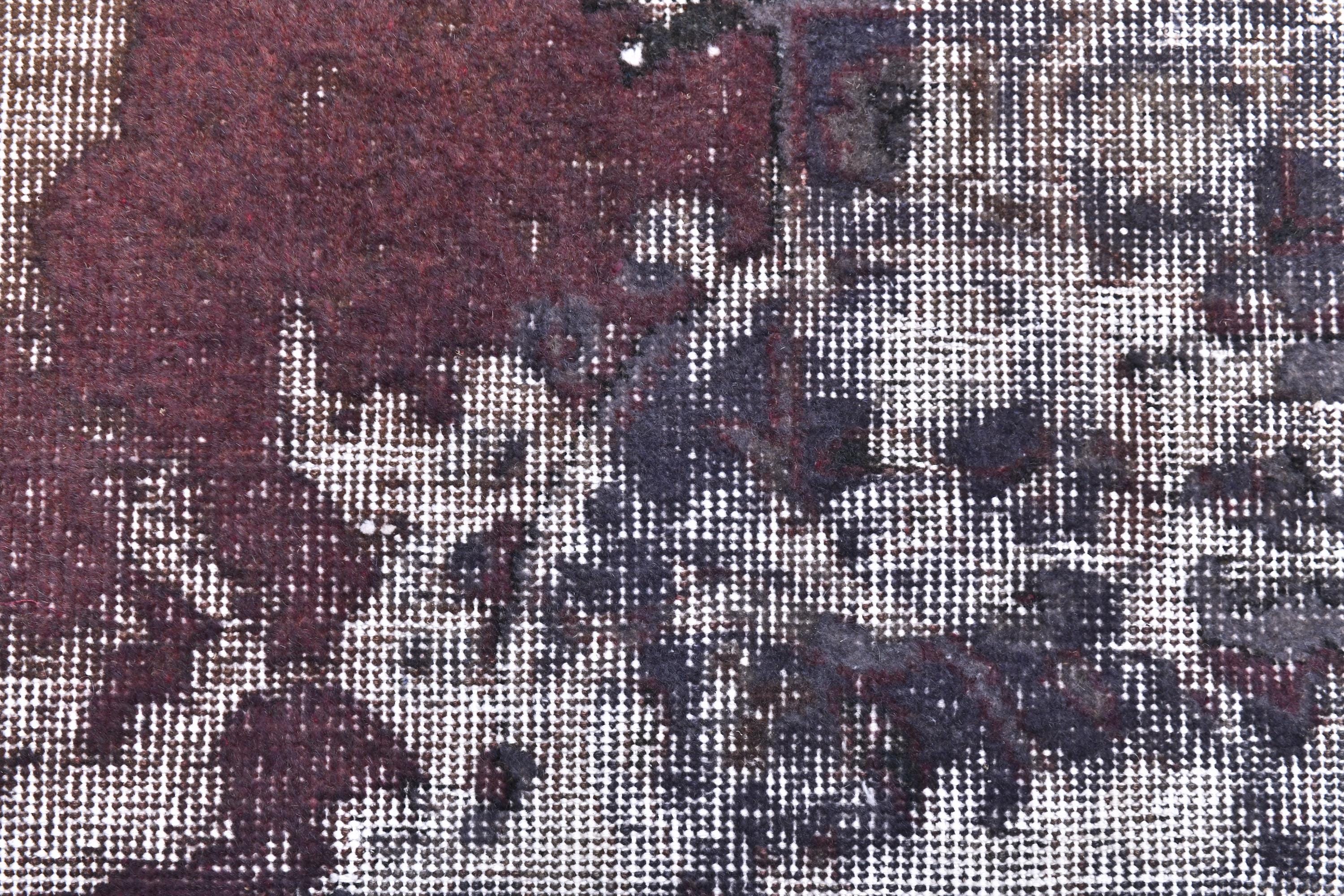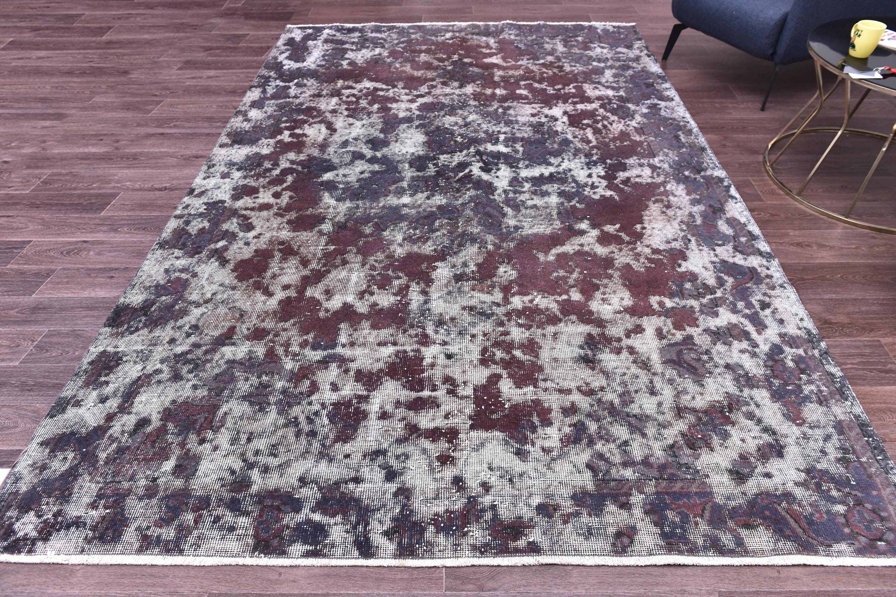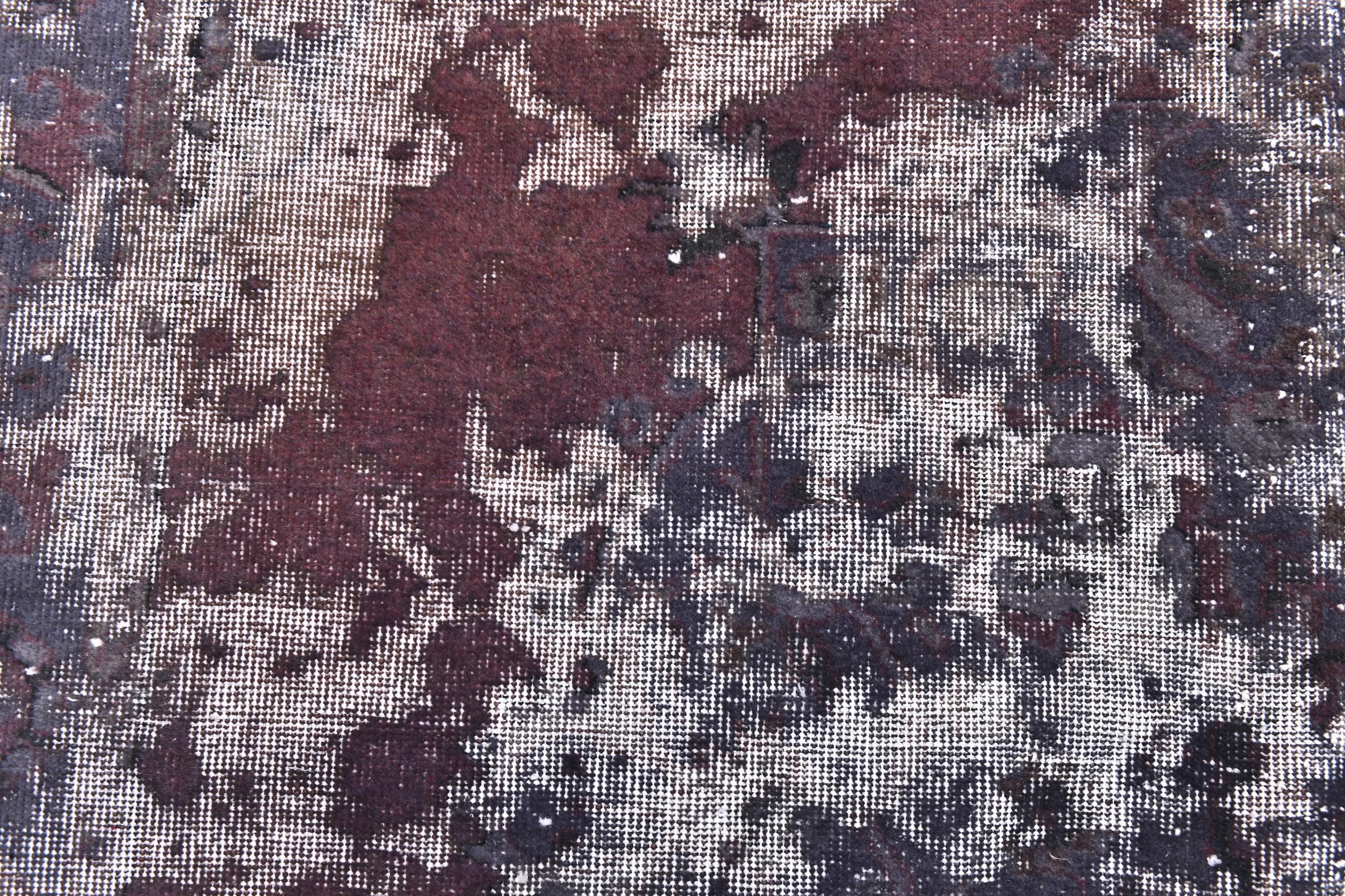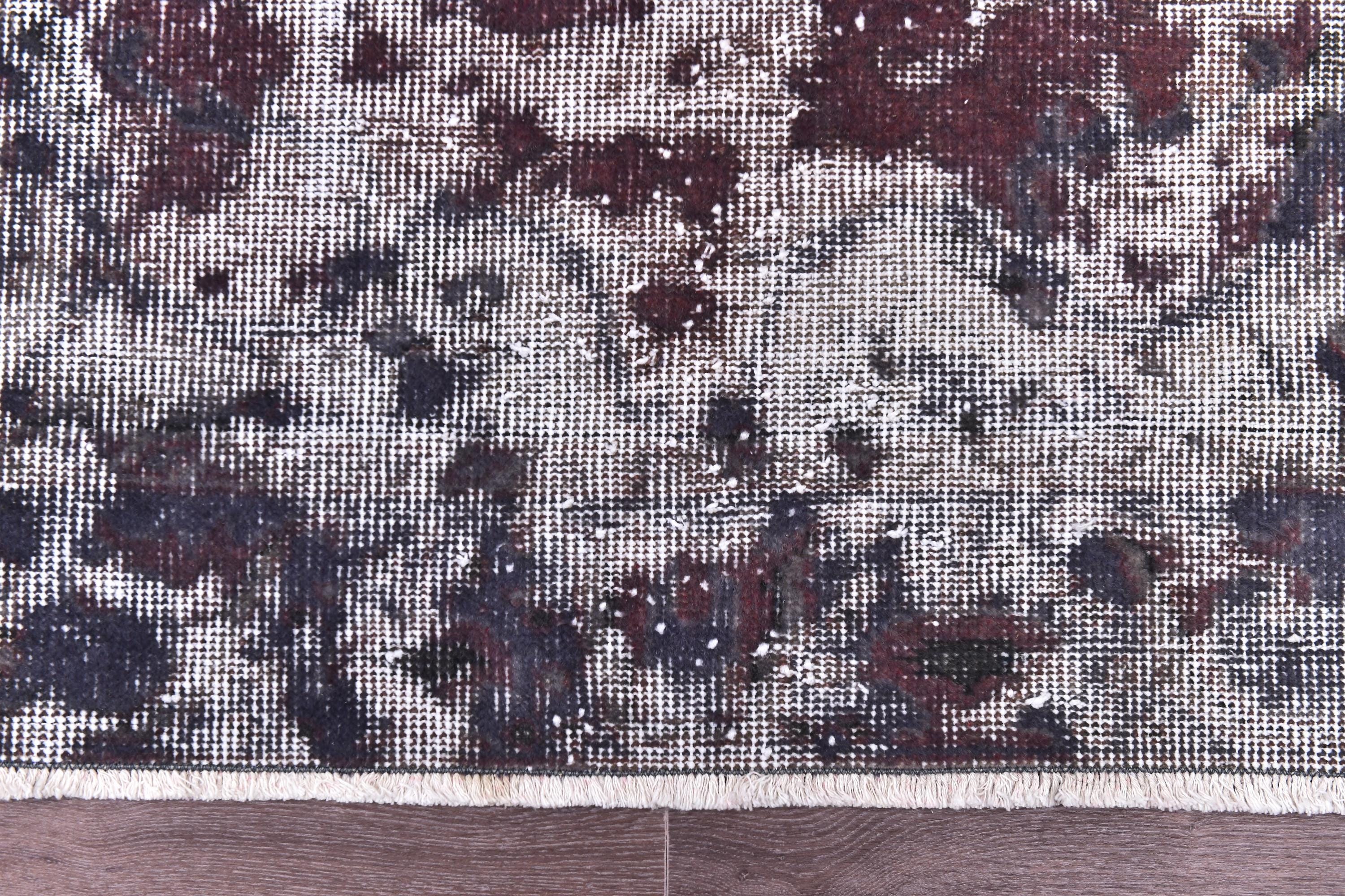 📜📌 Vintage Turkish overdyed area rug in rich purple and gray colors featuring distressed traditional floral medallion patterns. Hand-knotted wool contemporary carpet with worn antique appearance, white fringe edges, displayed on dark wood floor next to modern gold furniture. Bohemian home decor.