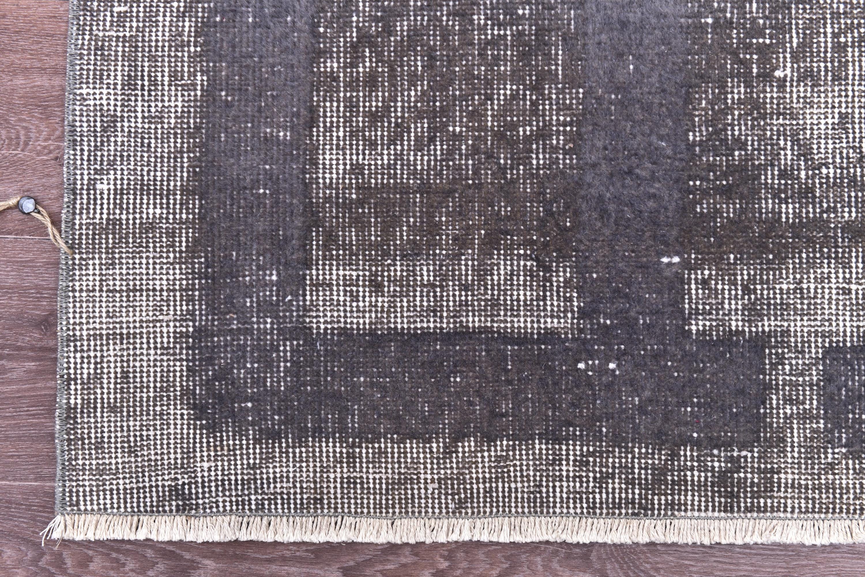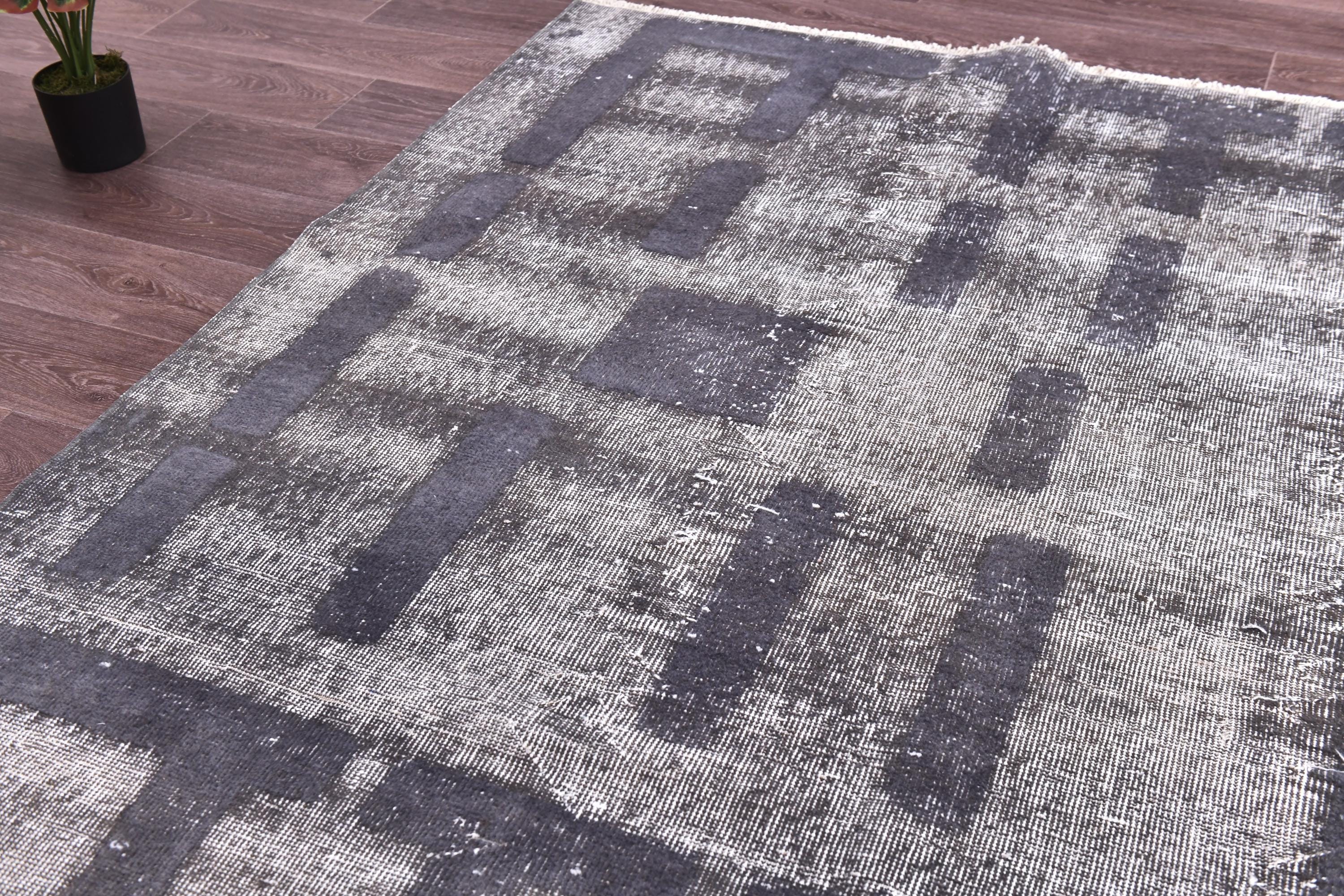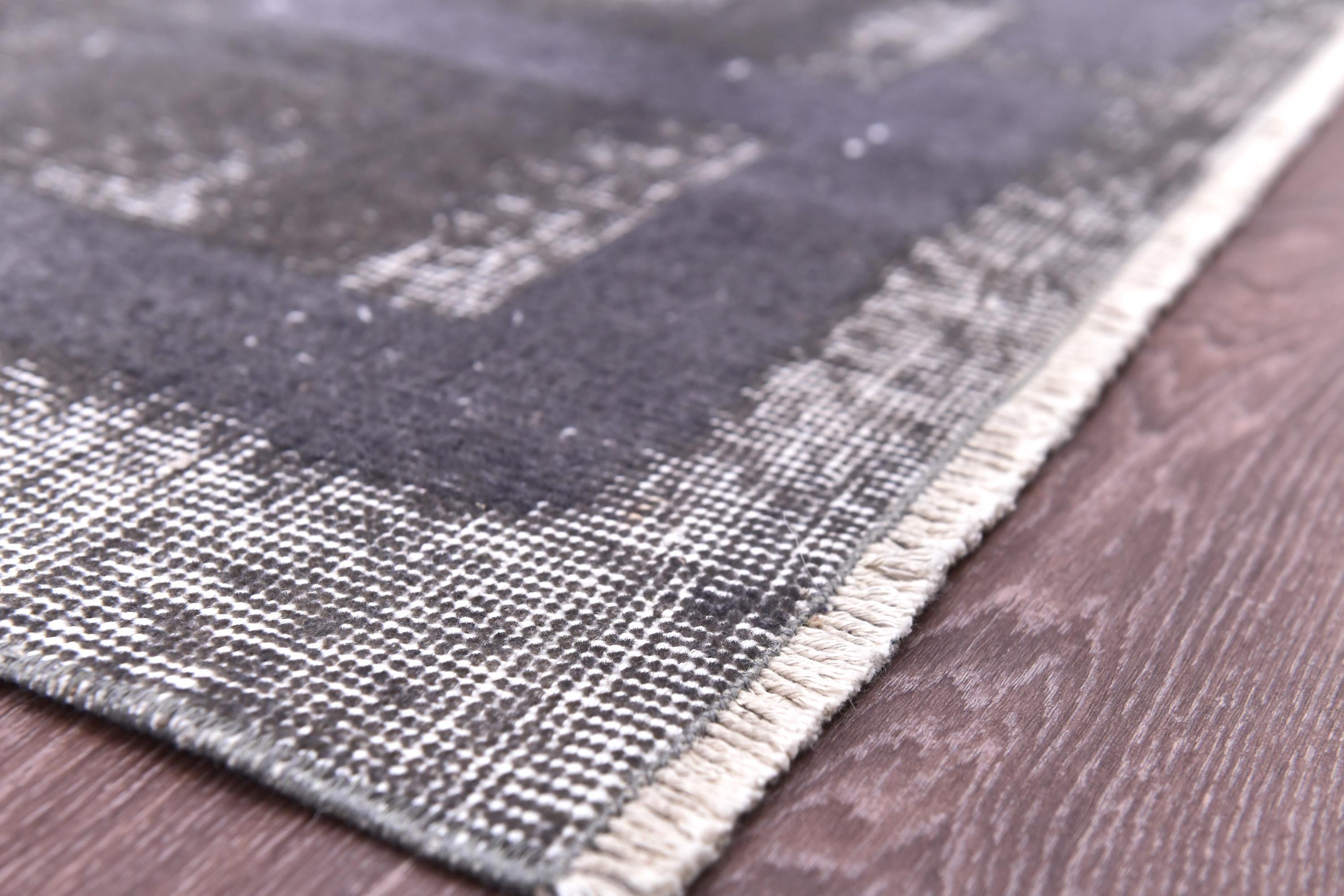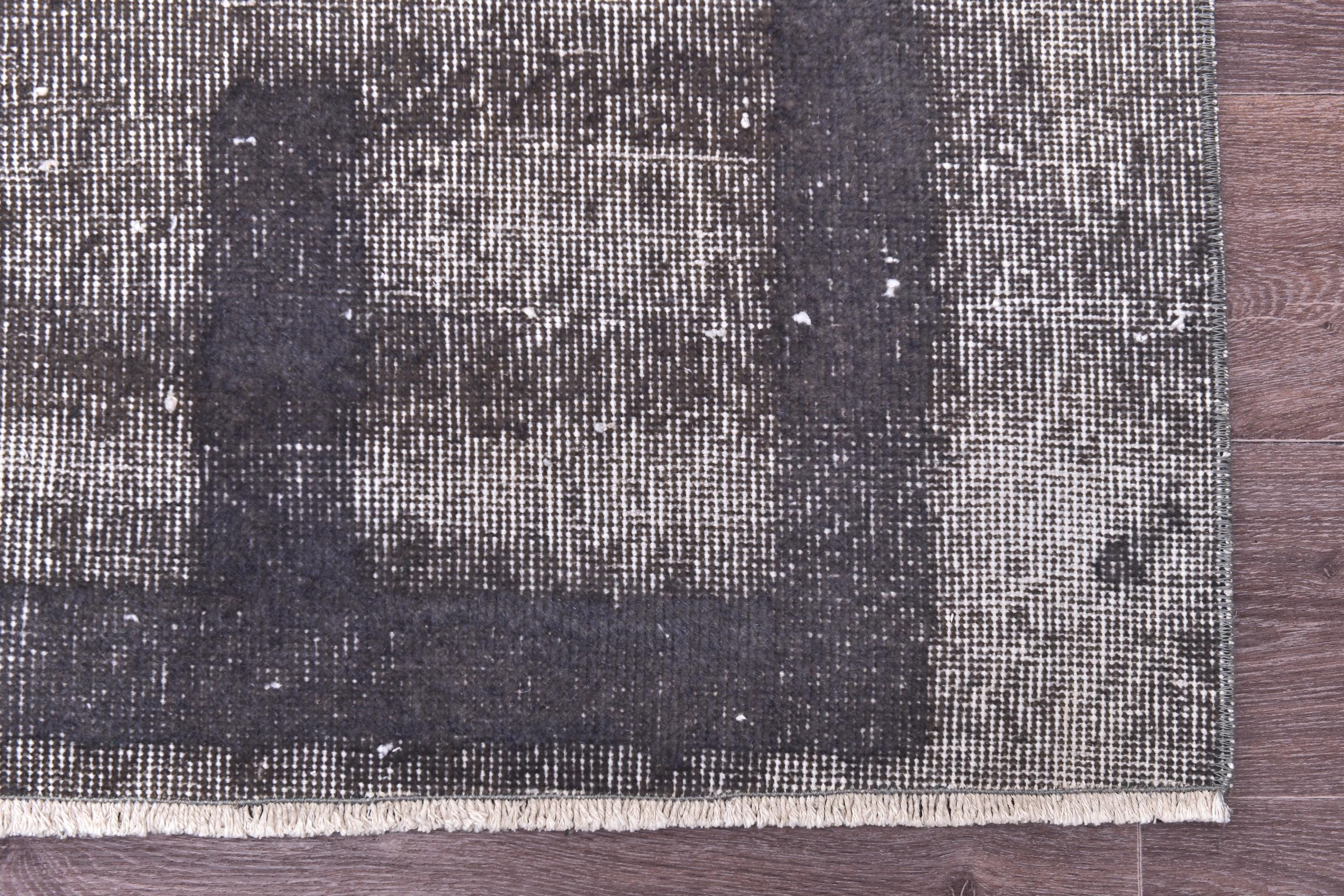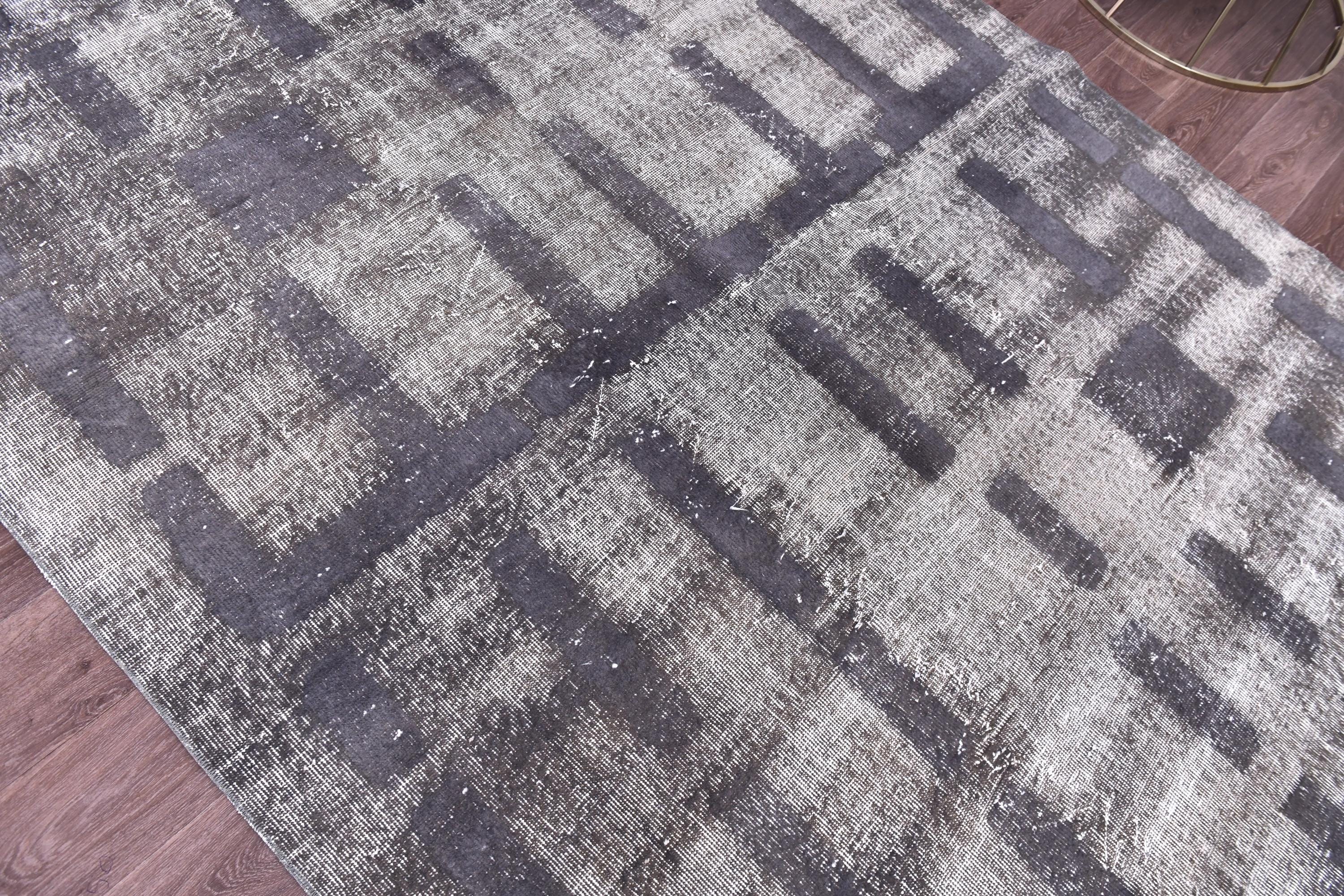 📜📌 Vintage overdyed Turkish area rug in charcoal gray and cream tones, featuring an abstract geometric block pattern with a distressed, worn look, photographed at an angle on wood floors